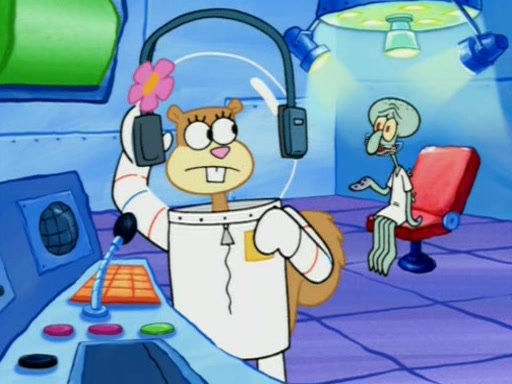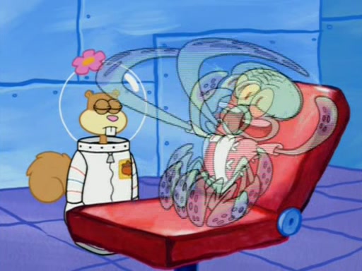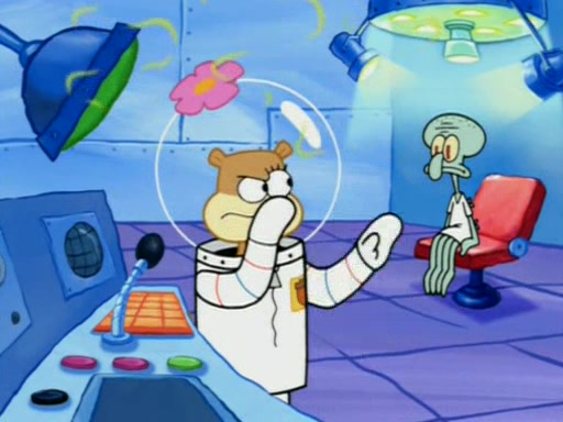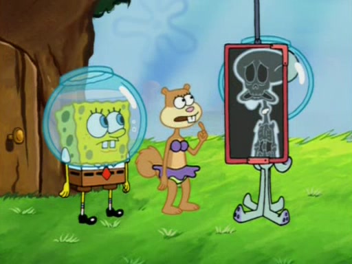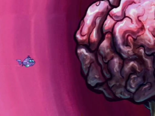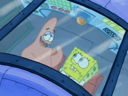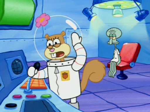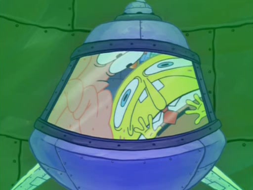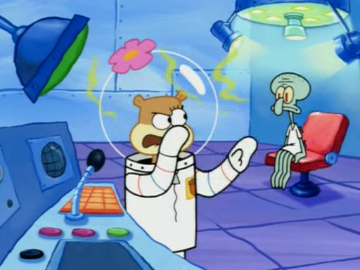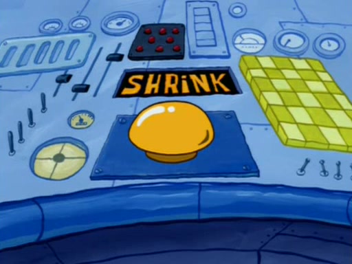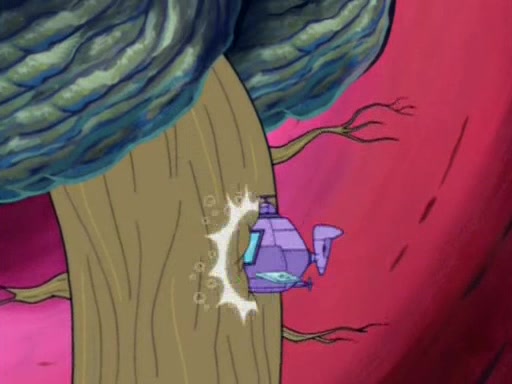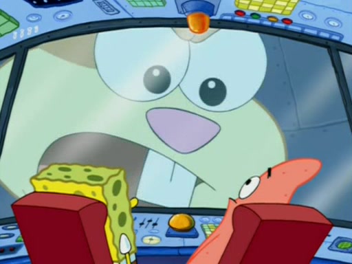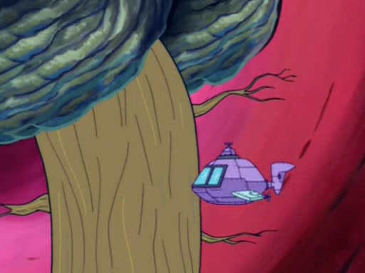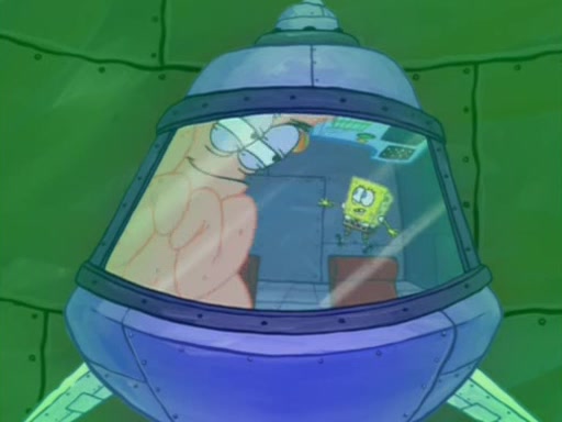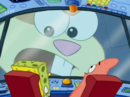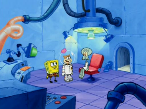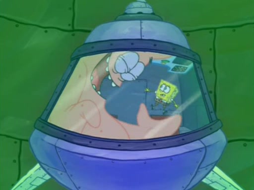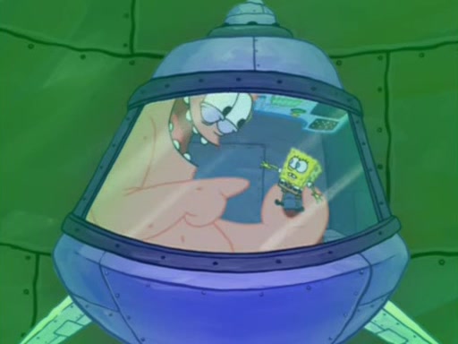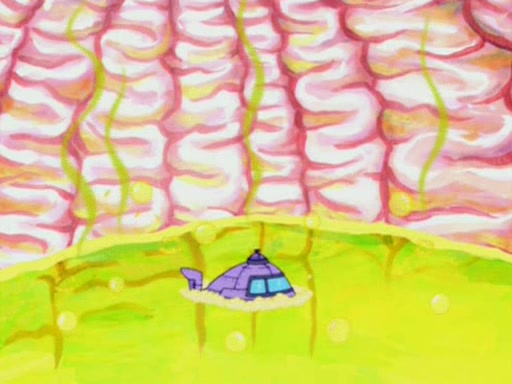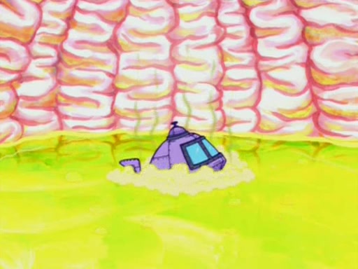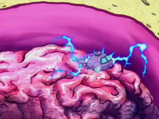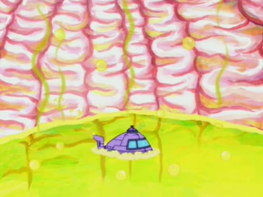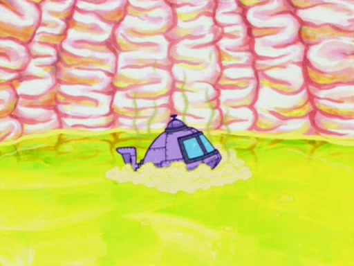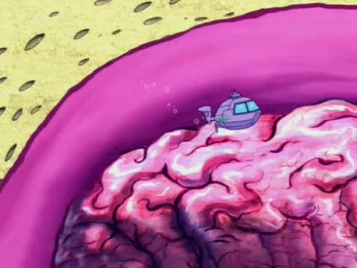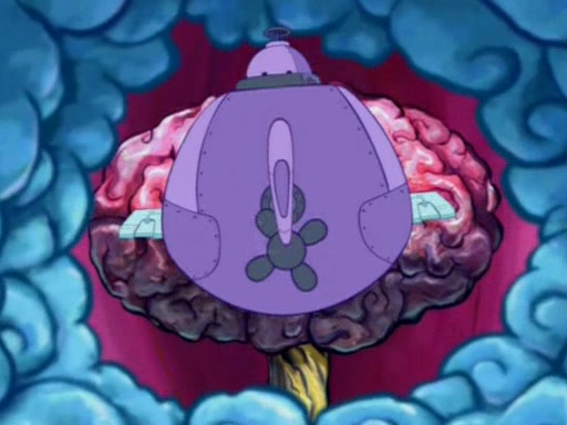 When Sandy goes to get some acorns and nuts from the Treedome she tells SpongeBob to guard the submarine. Patrick walks by and manipulates SpongeBob to guard the submarine from the inside. They go in there and guard it when Patrick presses the shrink button, shrinking the submarine. Sandy comes back and notices them. She then has to guide them to Squidward's brain. There, SpongeBob and Patrick start to hit parts of the brain, causing Squidward to lose self-control.