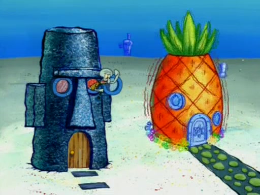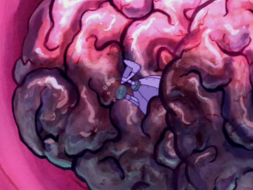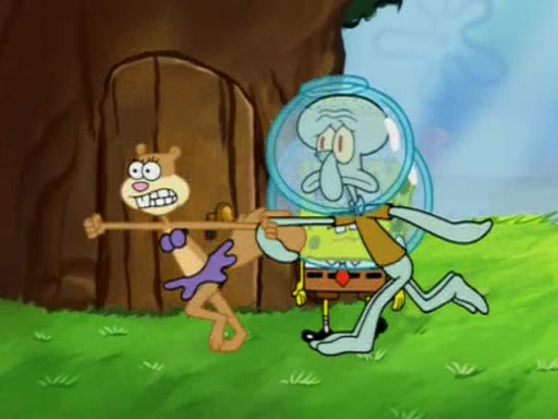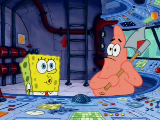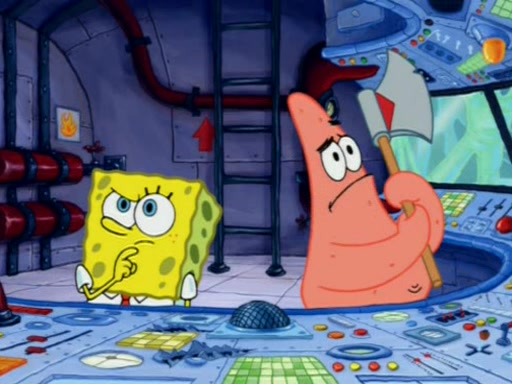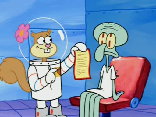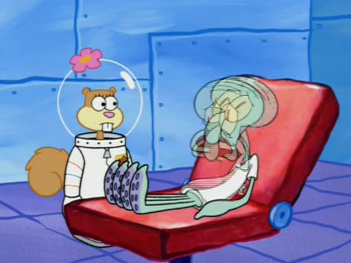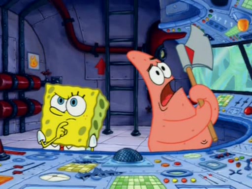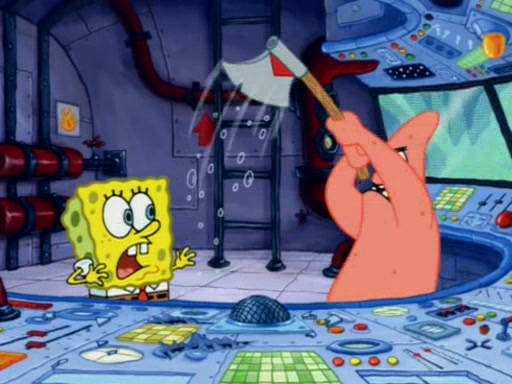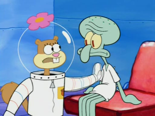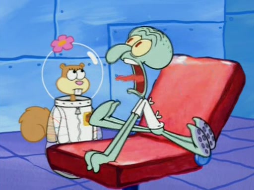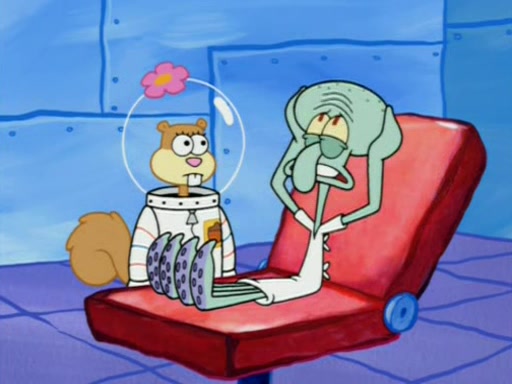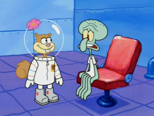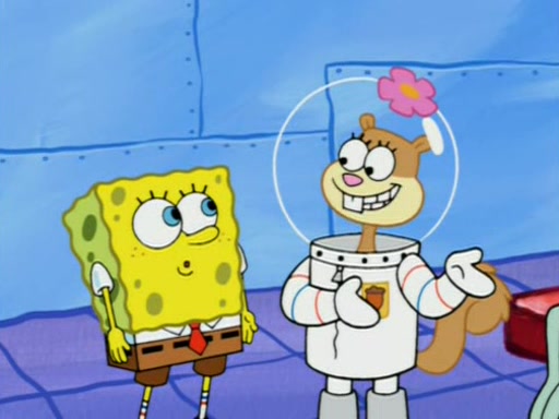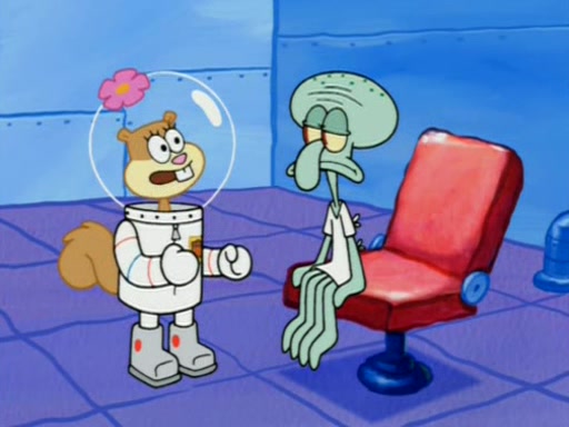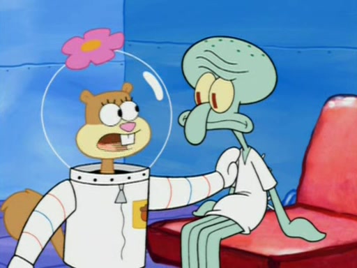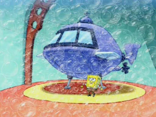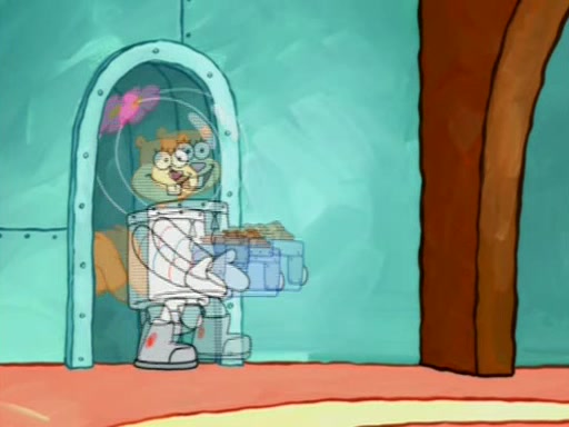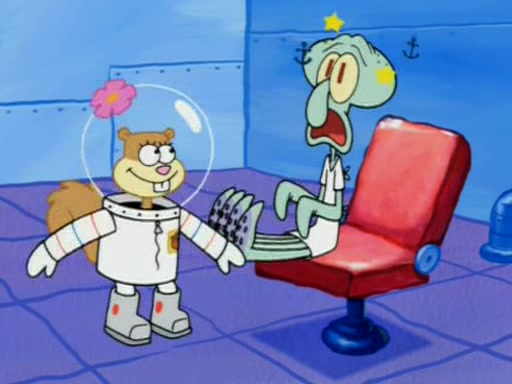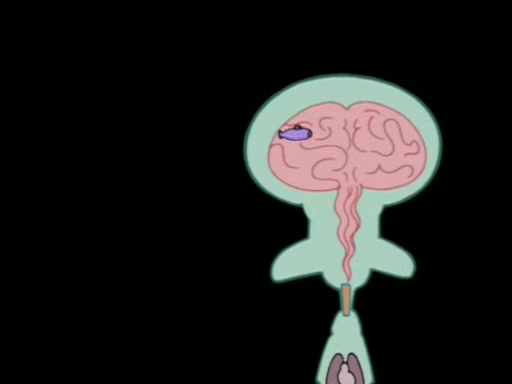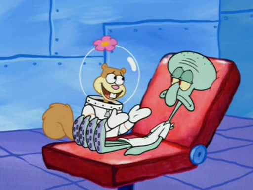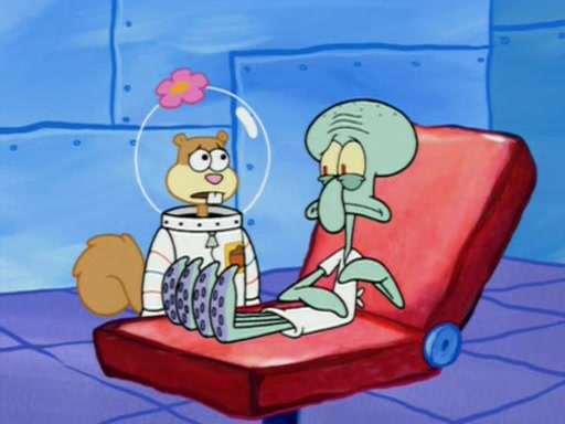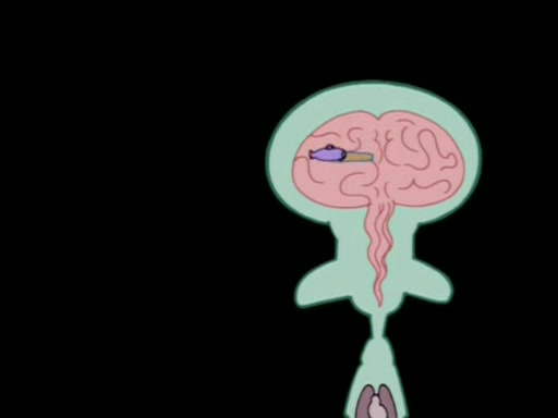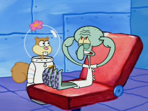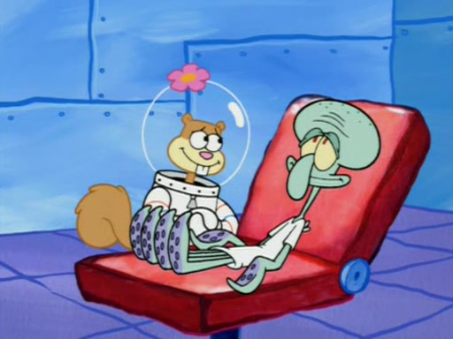 When Sandy goes to get some acorns and nuts from the Treedome she tells SpongeBob to guard the submarine. Patrick walks by and manipulates SpongeBob to guard the submarine from the inside. They go in there and guard it when Patrick presses the shrink button, shrinking the submarine. Sandy comes back and notices them. She then has to guide them to Squidward's brain. There, SpongeBob and Patrick start to hit parts of the brain, causing Squidward to lose self-control.