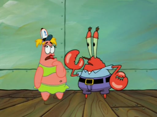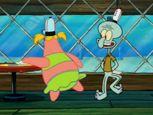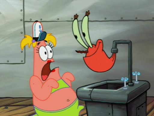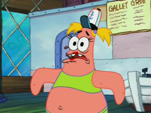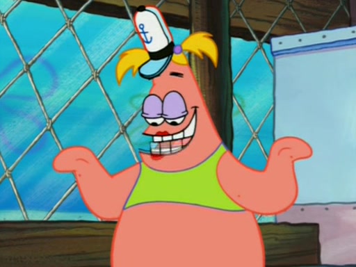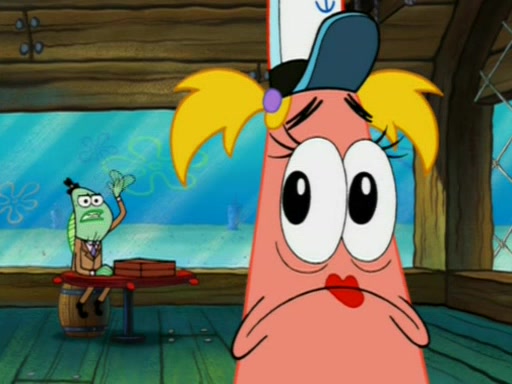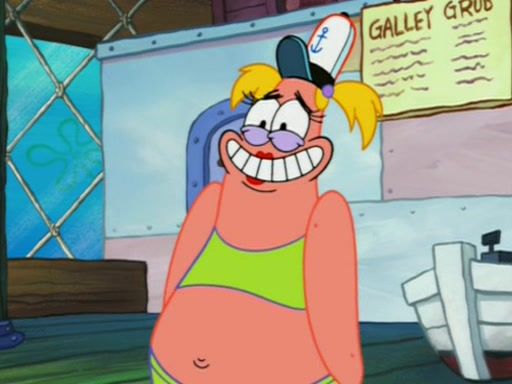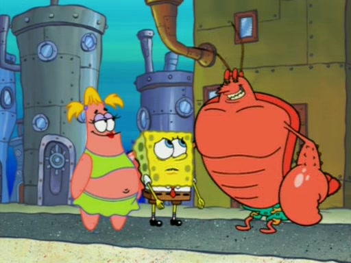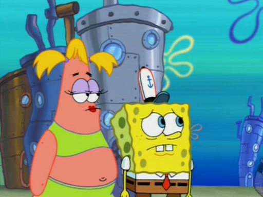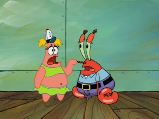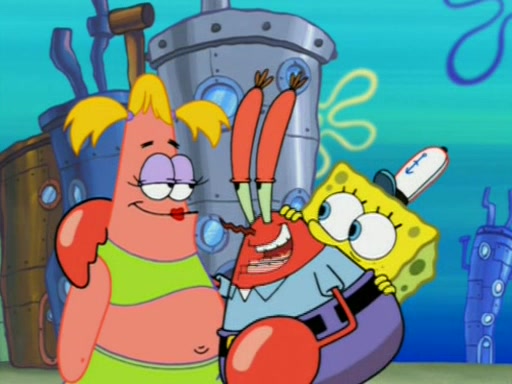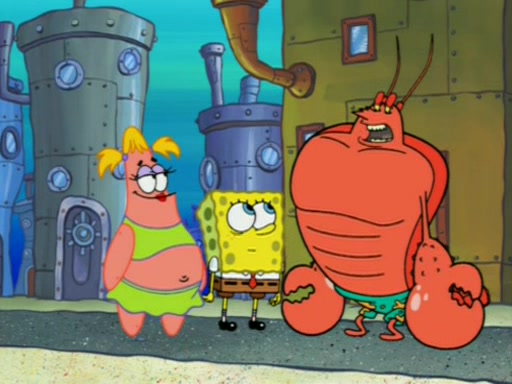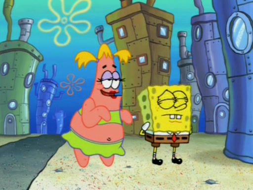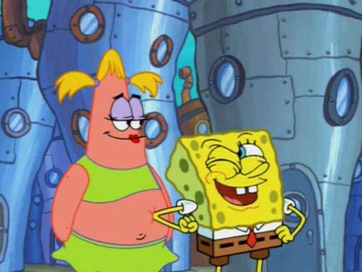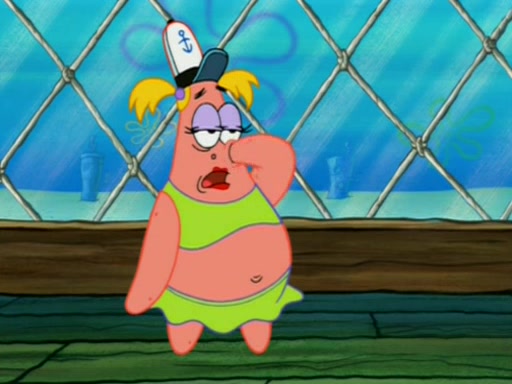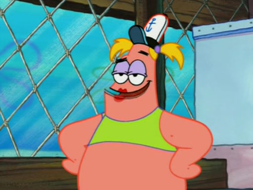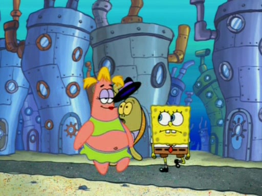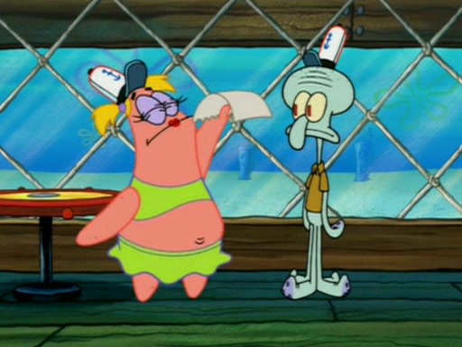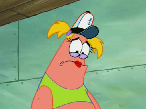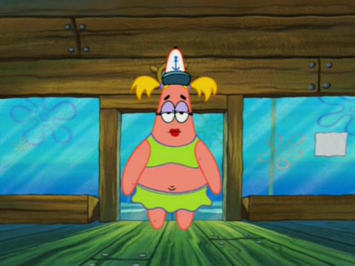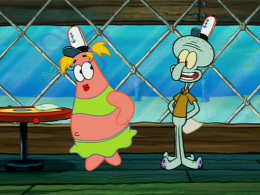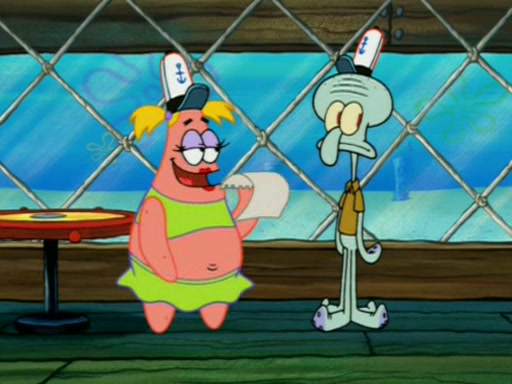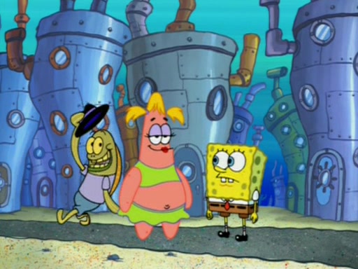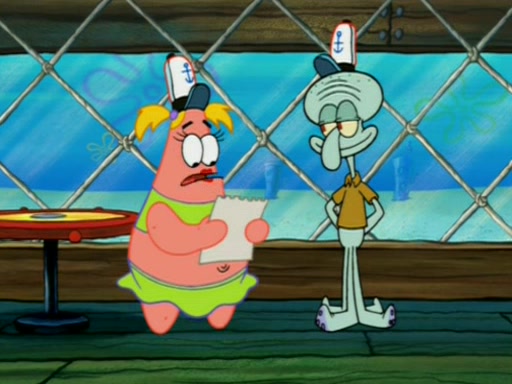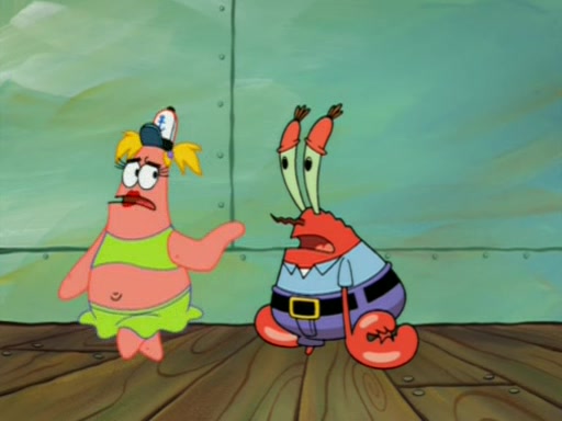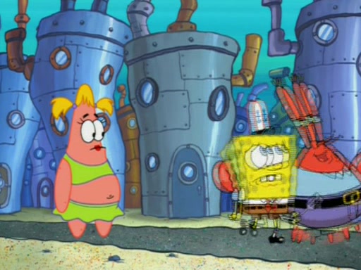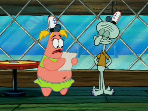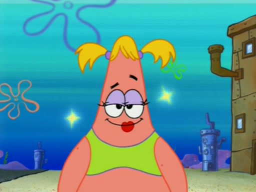 But SpongeBob tells him he can change his identity. So SpongeBob performs a makeover on Patrick and after many tries, he comes up with the idea of making him look like a woman under the name "Patricia." Every male Bikini Bottomite falls in love with "her," especially Squidward and Mr. Krabs, who only hires Patricia since he was a girl. Mr. Krabs and Squidward also flirt with Patricia, although this doesn't present a problem to him. Patrick has no idea what's making Mr. Krabs and Squidward act so weird and nice to him. All of the men fight over Patricia but "she" ignores them.