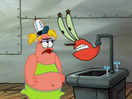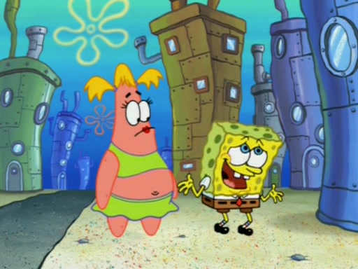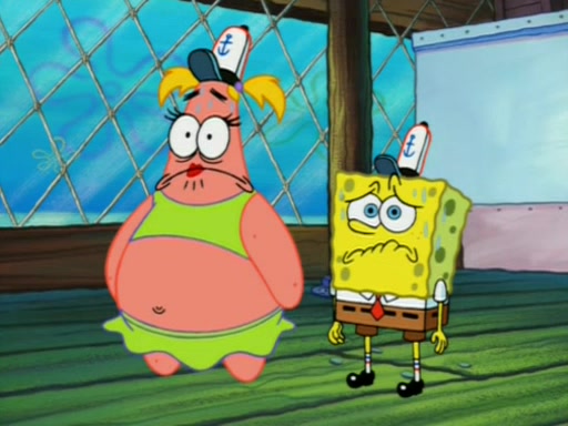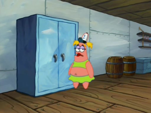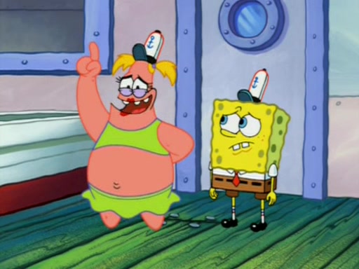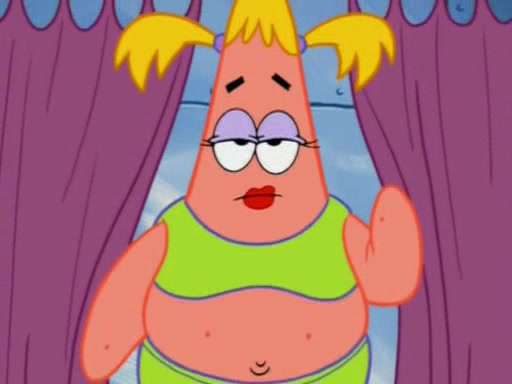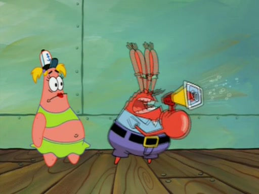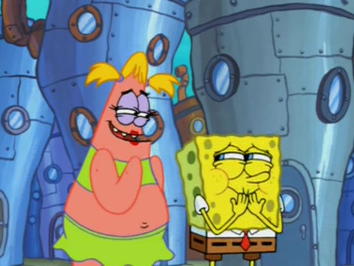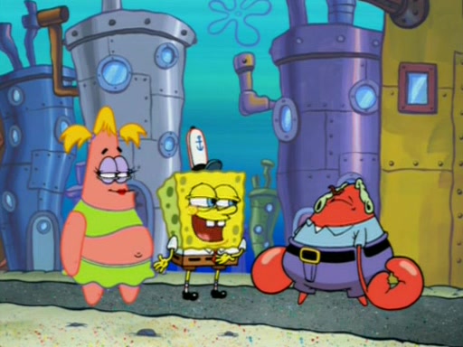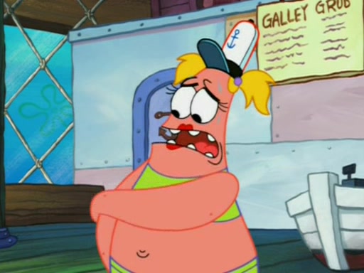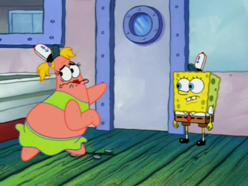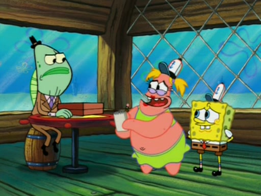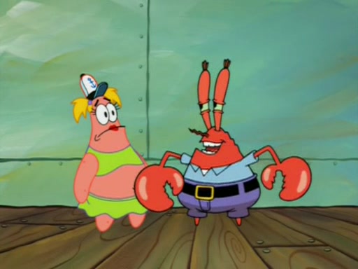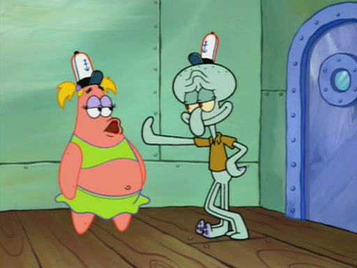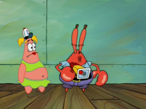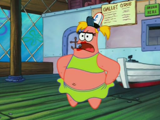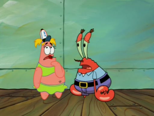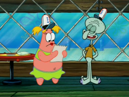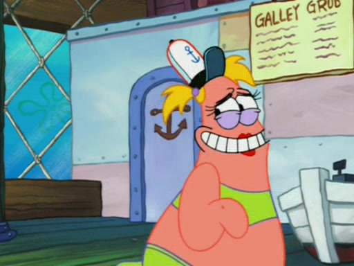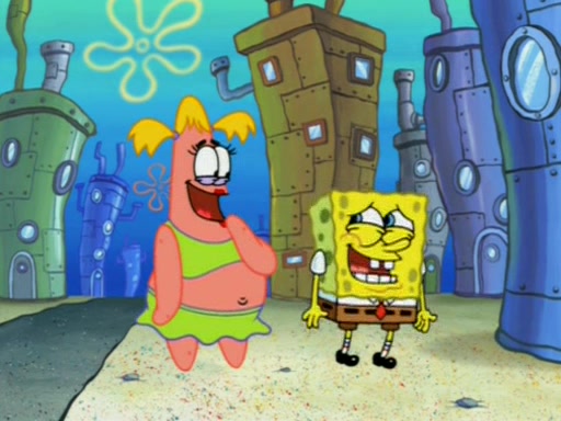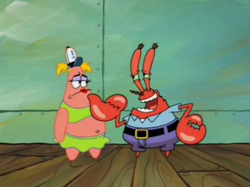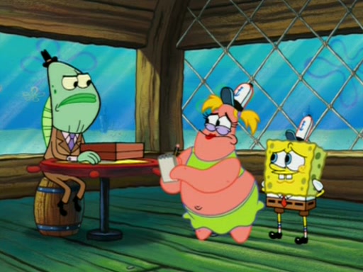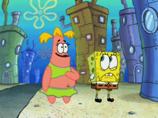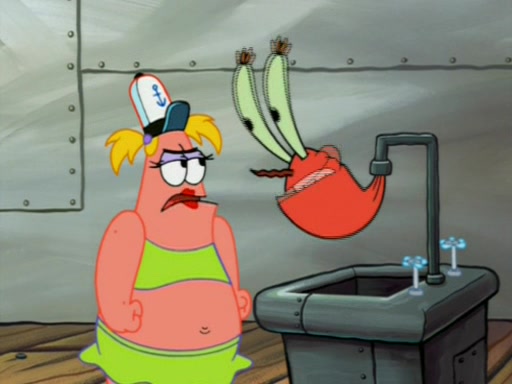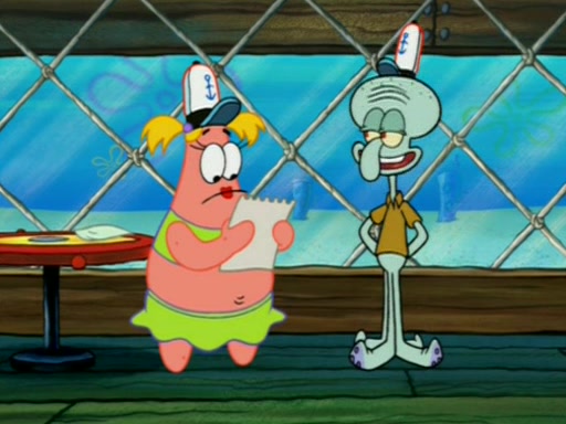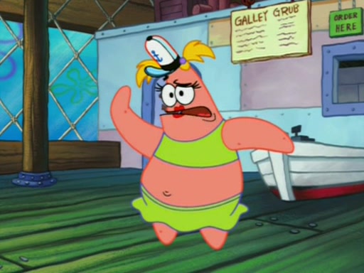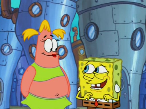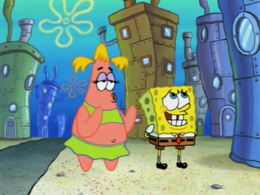 But SpongeBob tells him he can change his identity. So SpongeBob performs a makeover on Patrick and after many tries, he comes up with the idea of making him look like a woman under the name "Patricia." Every male Bikini Bottomite falls in love with "her," especially Squidward and Mr. Krabs, who only hires Patricia since he was a girl. Mr. Krabs and Squidward also flirt with Patricia, although this doesn't present a problem to him. Patrick has no idea what's making Mr. Krabs and Squidward act so weird and nice to him. All of the men fight over Patricia but "she" ignores them.