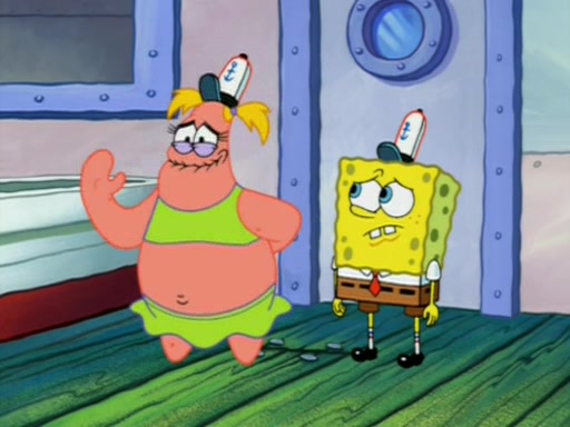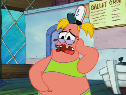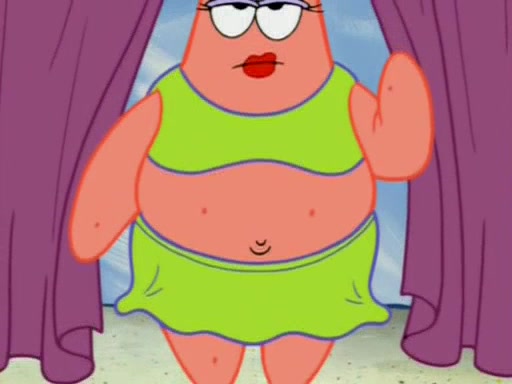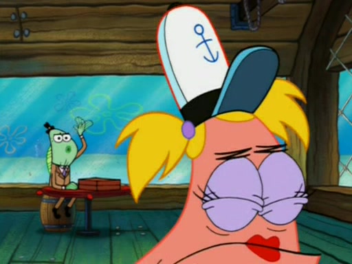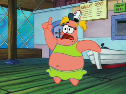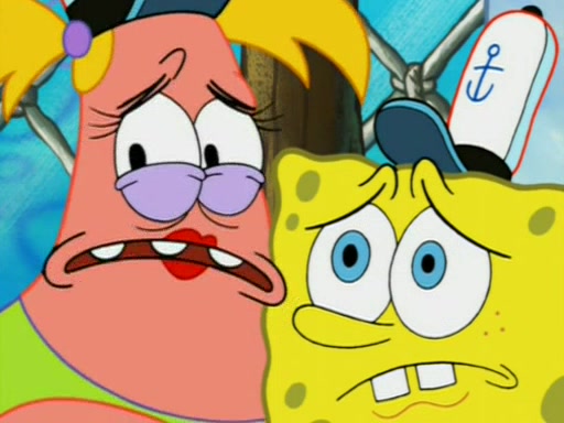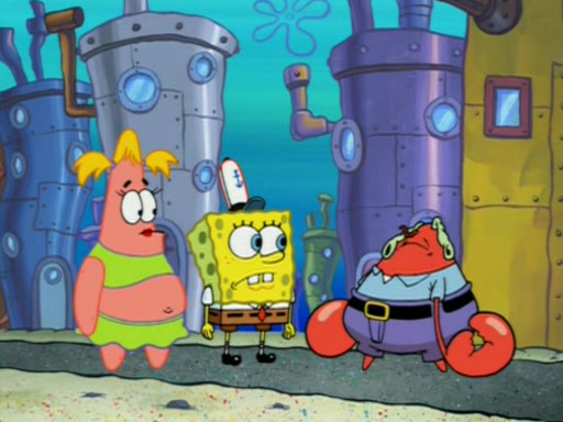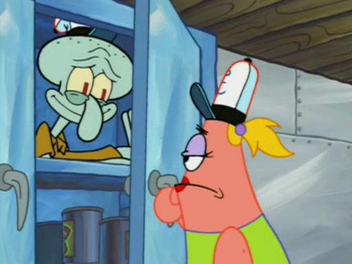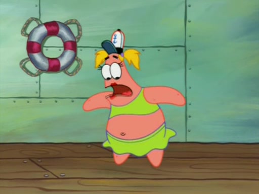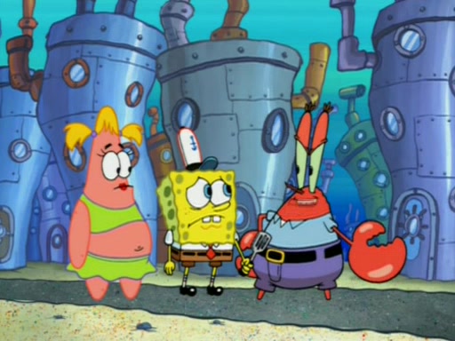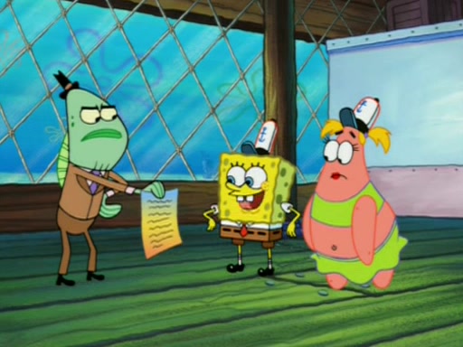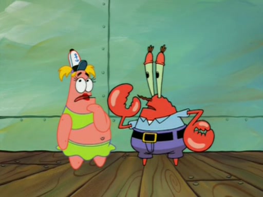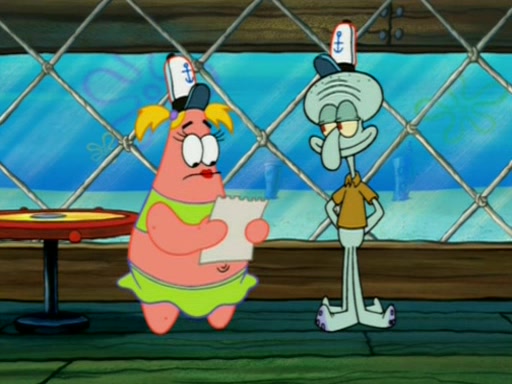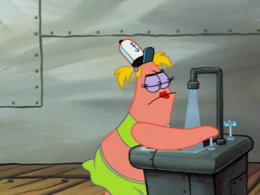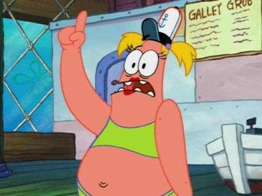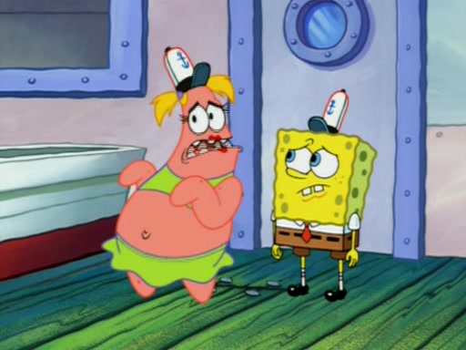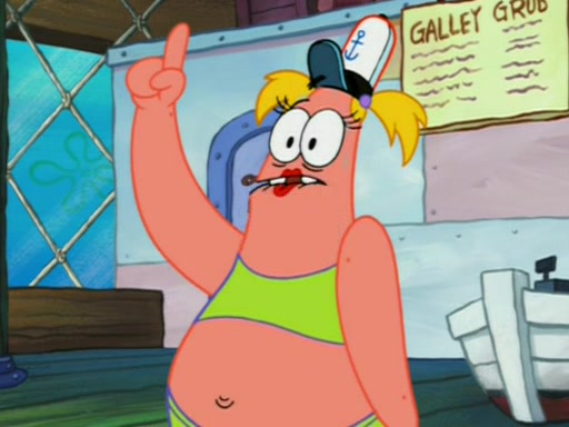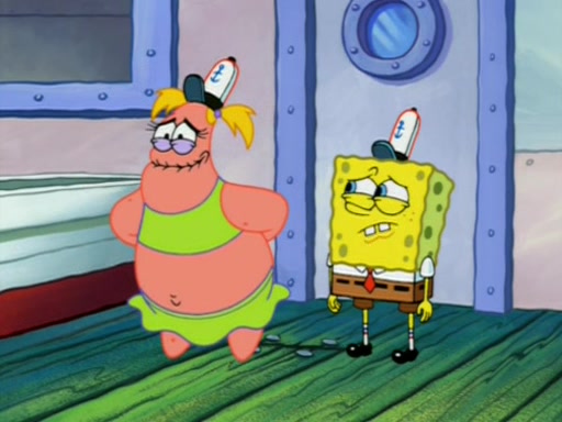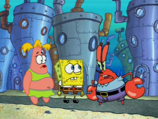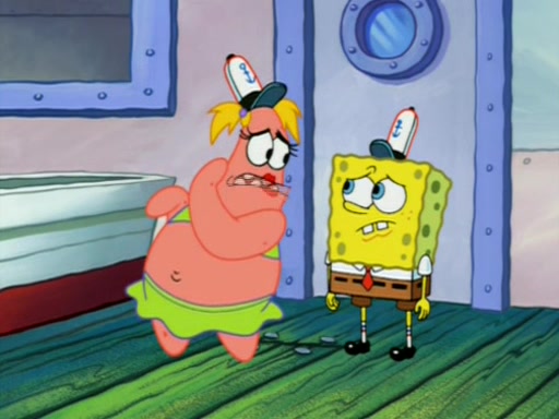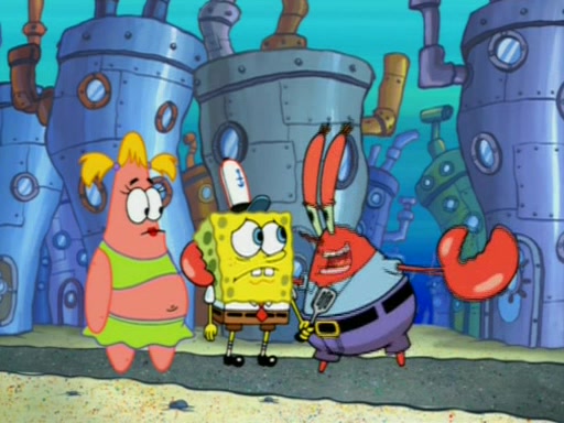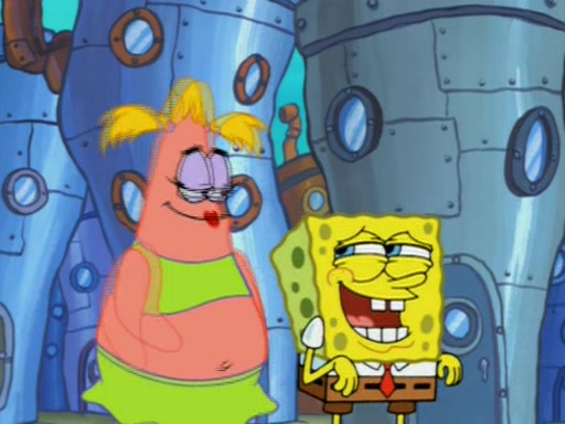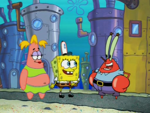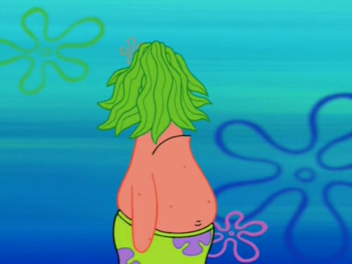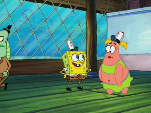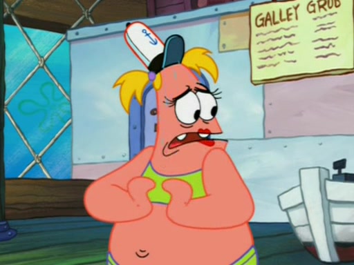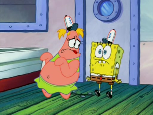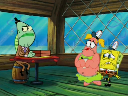 But SpongeBob tells him he can change his identity. So SpongeBob performs a makeover on Patrick and after many tries, he comes up with the idea of making him look like a woman under the name "Patricia." Every male Bikini Bottomite falls in love with "her," especially Squidward and Mr. Krabs, who only hires Patricia since he was a girl. Mr. Krabs and Squidward also flirt with Patricia, although this doesn't present a problem to him. Patrick has no idea what's making Mr. Krabs and Squidward act so weird and nice to him. All of the men fight over Patricia but "she" ignores them.
