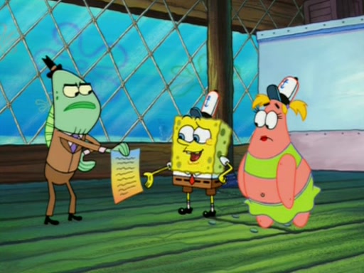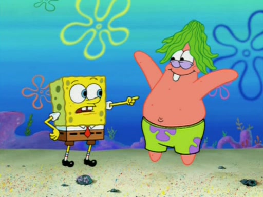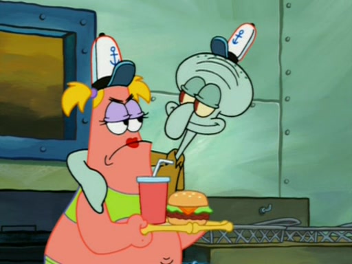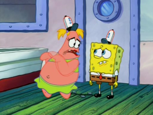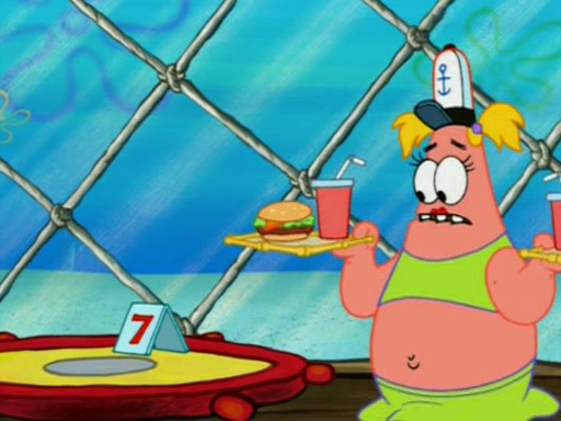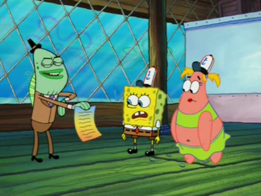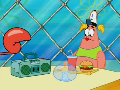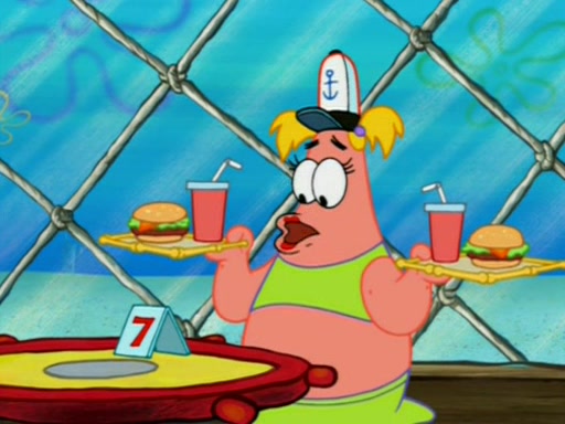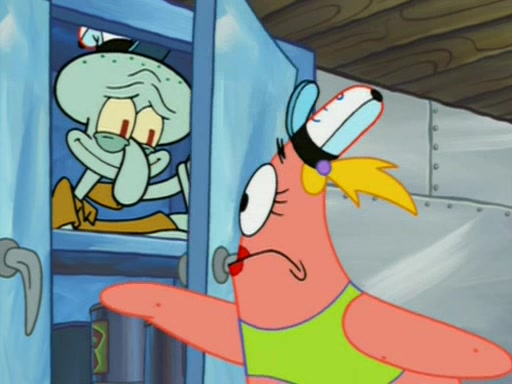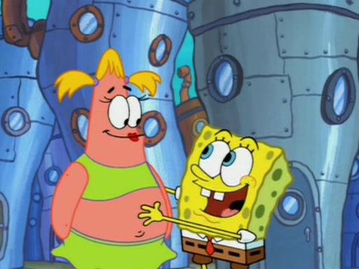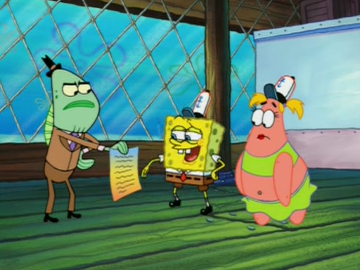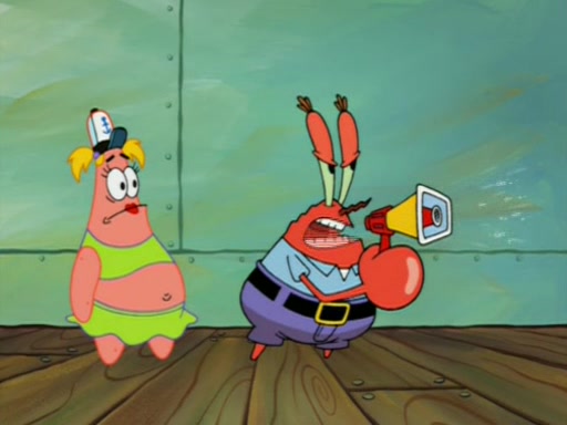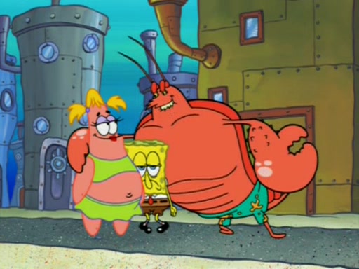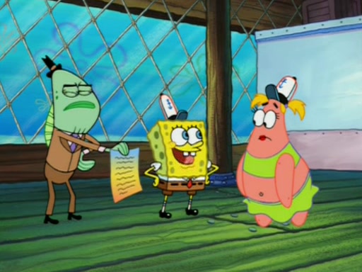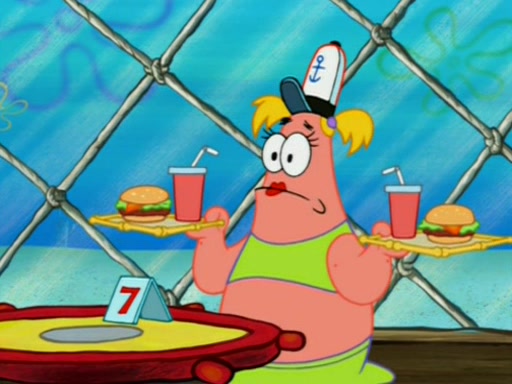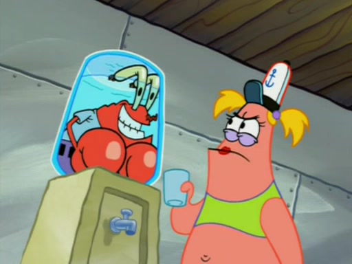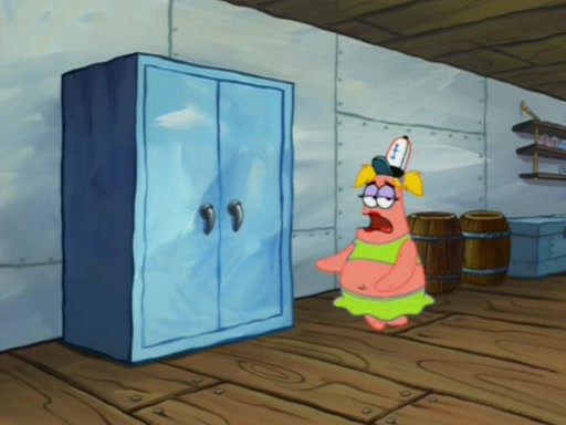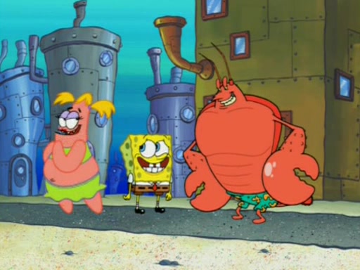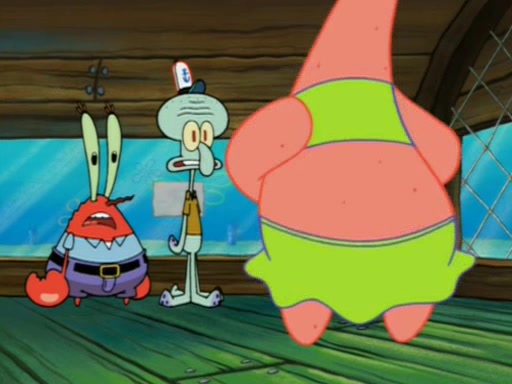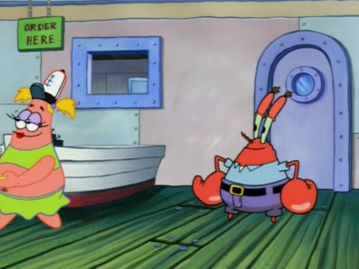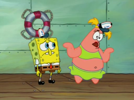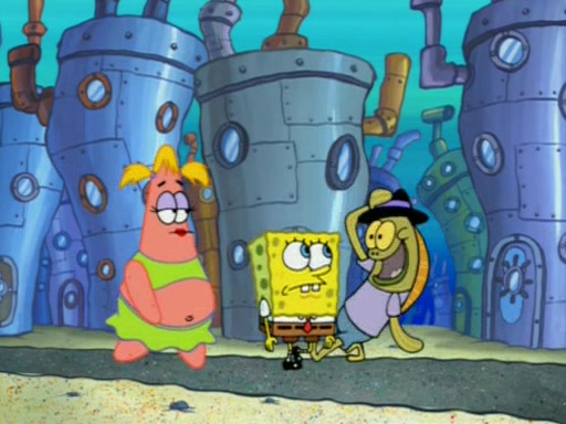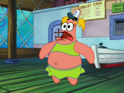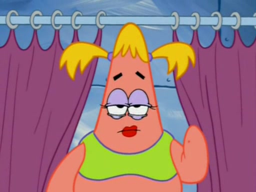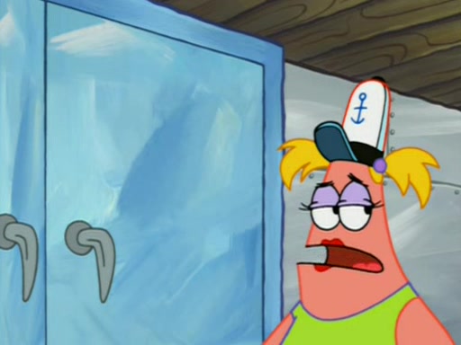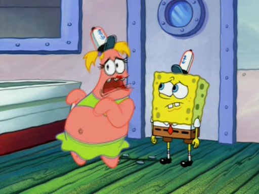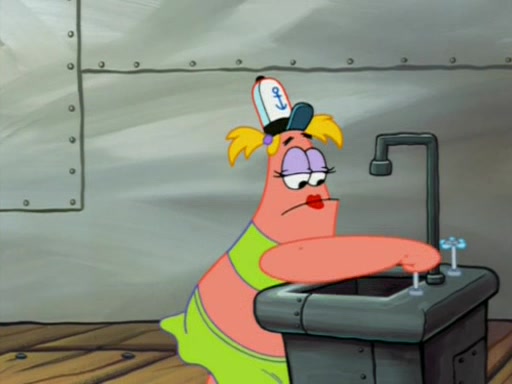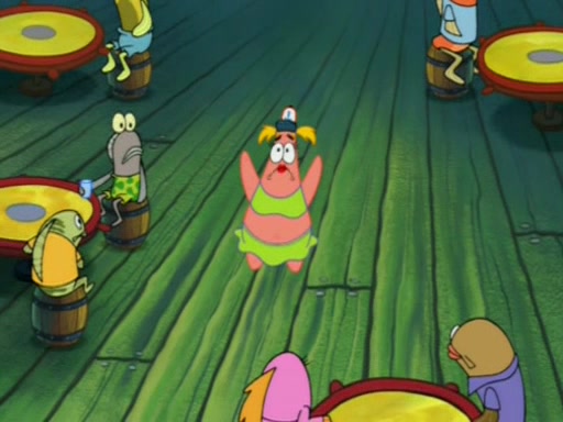 But SpongeBob tells him he can change his identity. So SpongeBob performs a makeover on Patrick and after many tries, he comes up with the idea of making him look like a woman under the name "Patricia." Every male Bikini Bottomite falls in love with "her," especially Squidward and Mr. Krabs, who only hires Patricia since he was a girl. Mr. Krabs and Squidward also flirt with Patricia, although this doesn't present a problem to him. Patrick has no idea what's making Mr. Krabs and Squidward act so weird and nice to him. All of the men fight over Patricia but "she" ignores them.