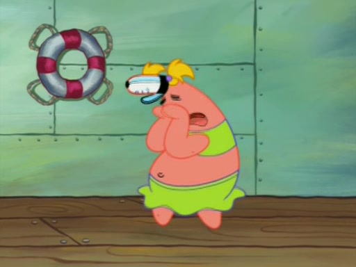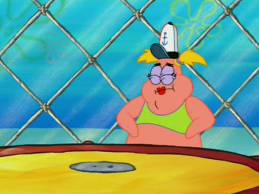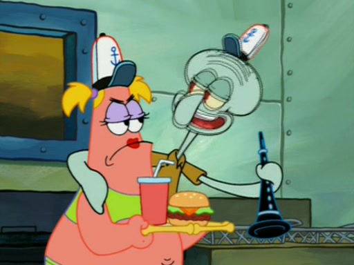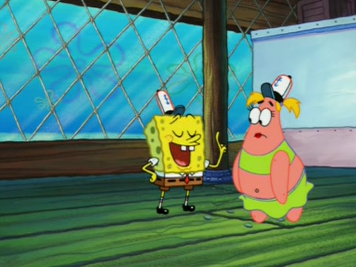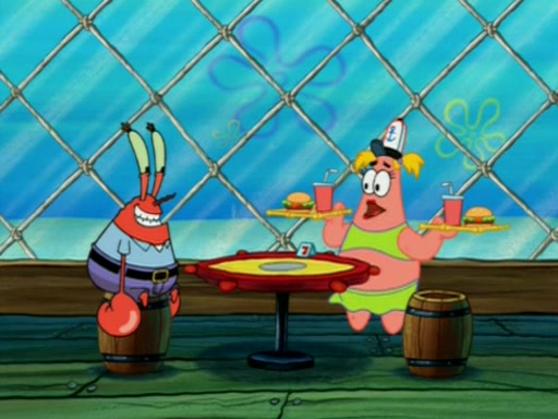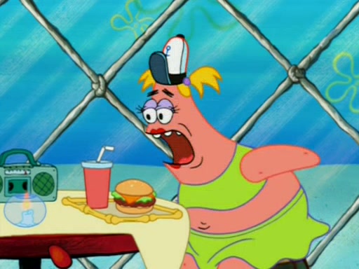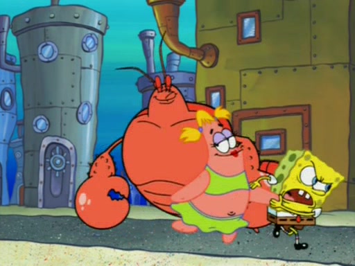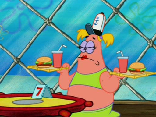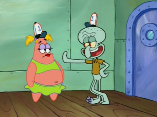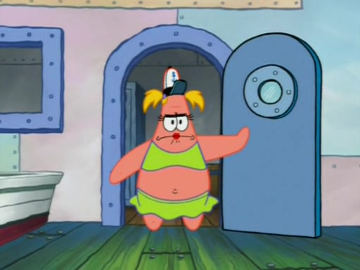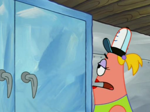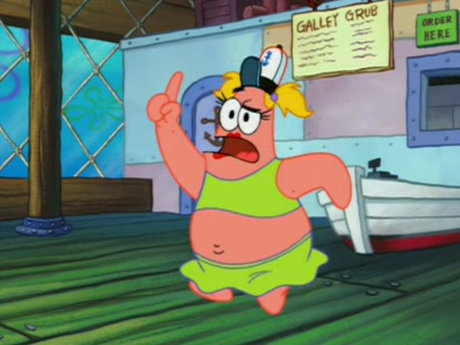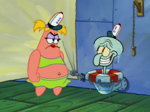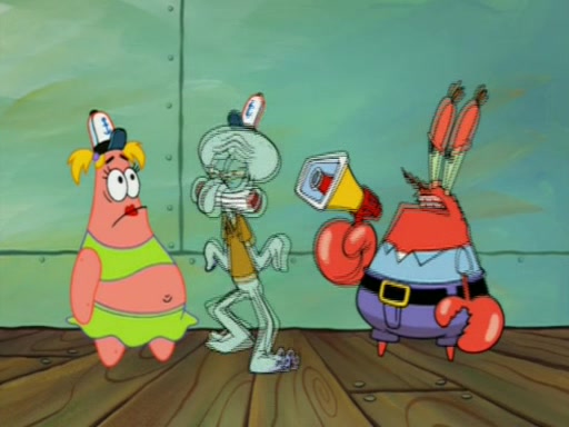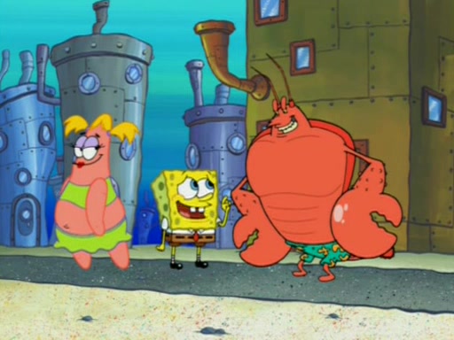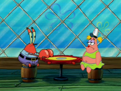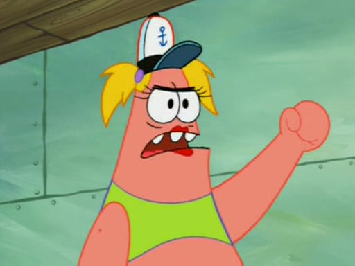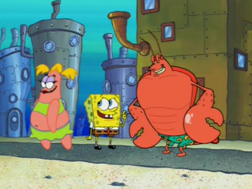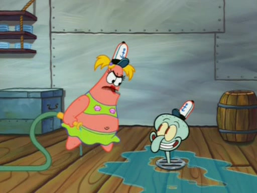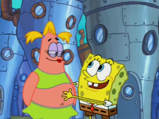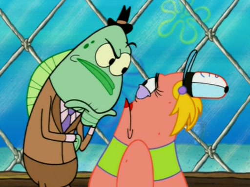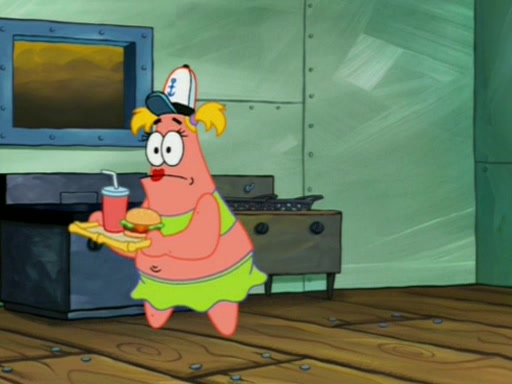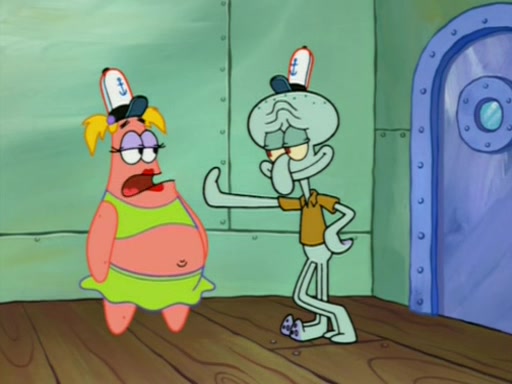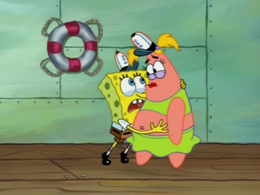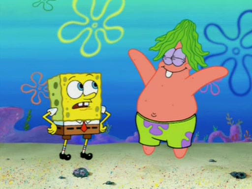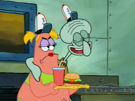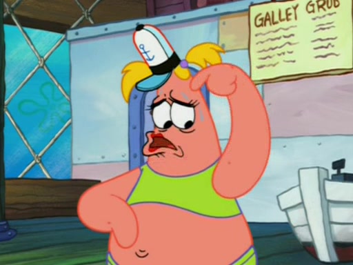 But SpongeBob tells him he can change his identity. So SpongeBob performs a makeover on Patrick and after many tries, he comes up with the idea of making him look like a woman under the name "Patricia." Every male Bikini Bottomite falls in love with "her," especially Squidward and Mr. Krabs, who only hires Patricia since he was a girl. Mr. Krabs and Squidward also flirt with Patricia, although this doesn't present a problem to him. Patrick has no idea what's making Mr. Krabs and Squidward act so weird and nice to him. All of the men fight over Patricia but "she" ignores them.