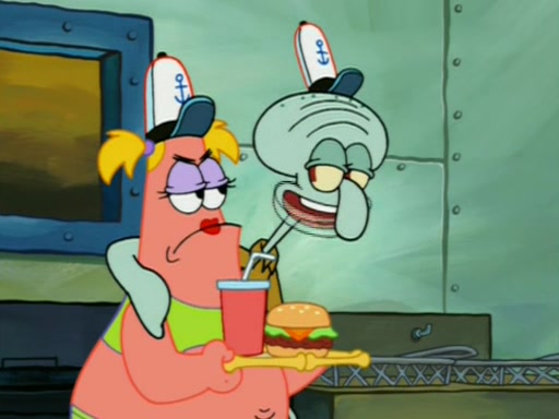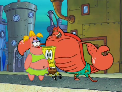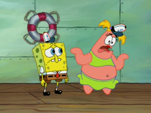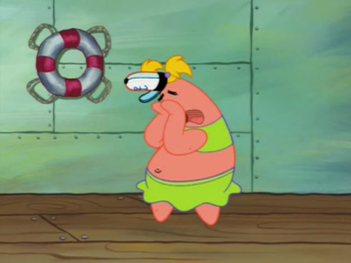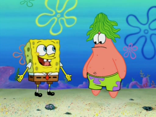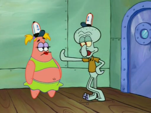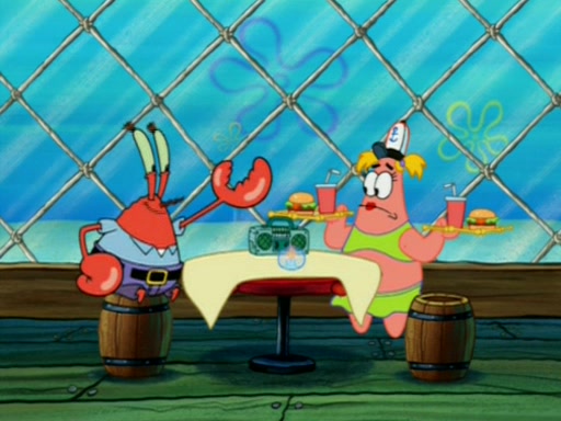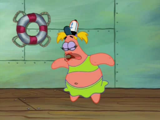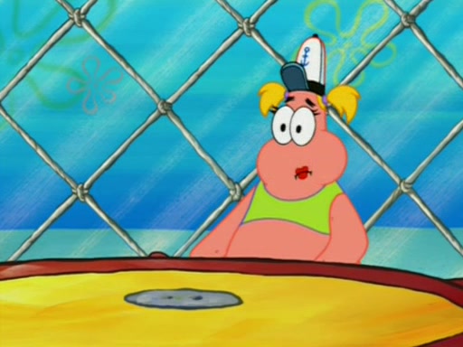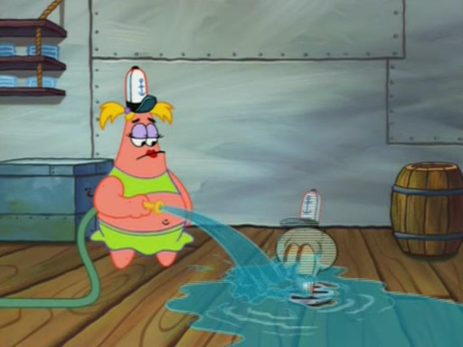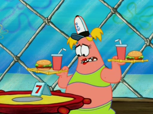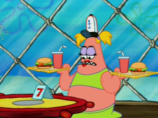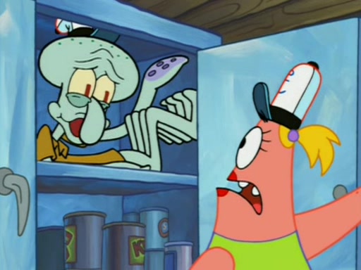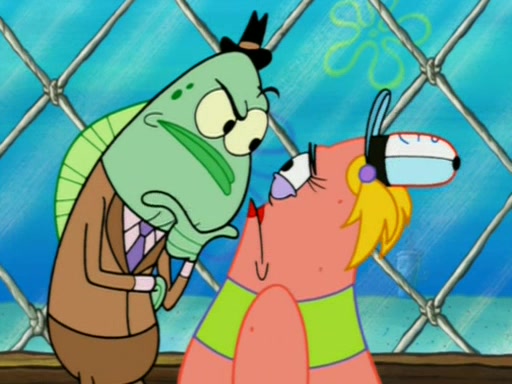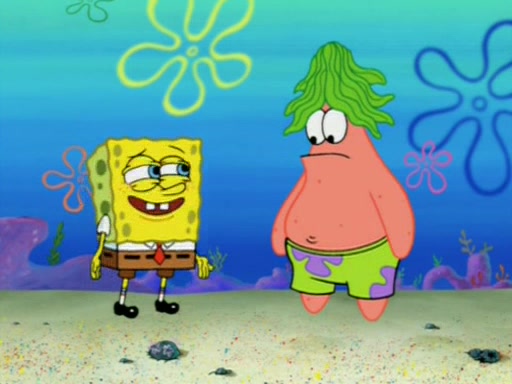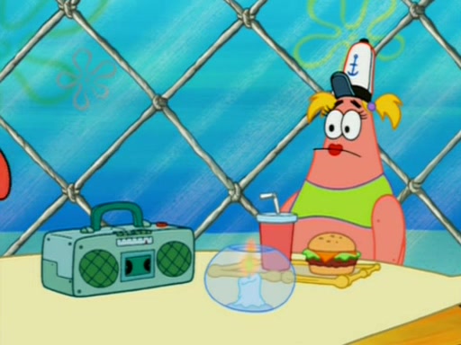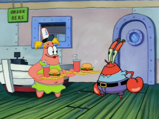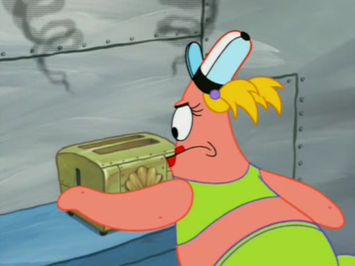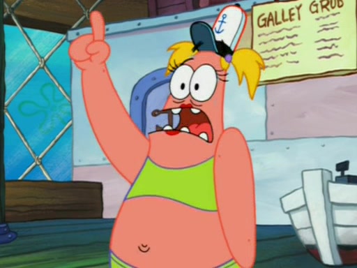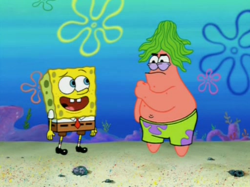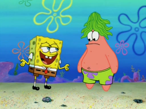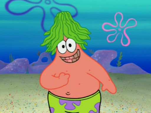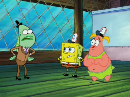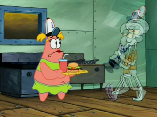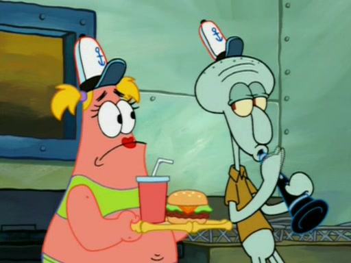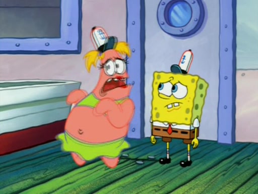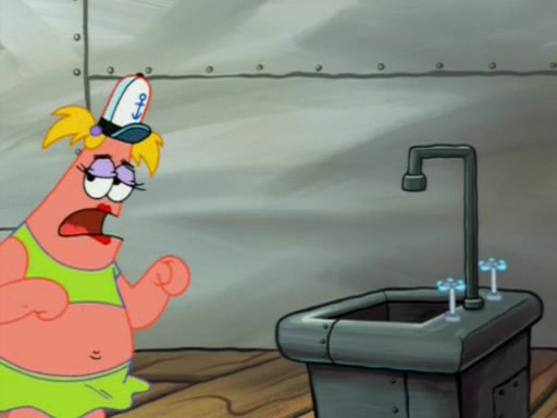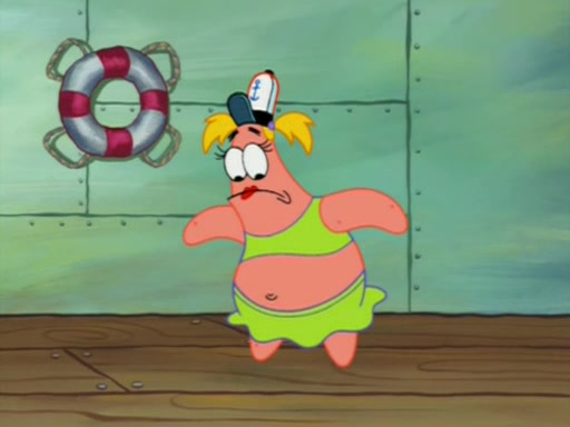 But SpongeBob tells him he can change his identity. So SpongeBob performs a makeover on Patrick and after many tries, he comes up with the idea of making him look like a woman under the name "Patricia." Every male Bikini Bottomite falls in love with "her," especially Squidward and Mr. Krabs, who only hires Patricia since he was a girl. Mr. Krabs and Squidward also flirt with Patricia, although this doesn't present a problem to him. Patrick has no idea what's making Mr. Krabs and Squidward act so weird and nice to him. All of the men fight over Patricia but "she" ignores them.