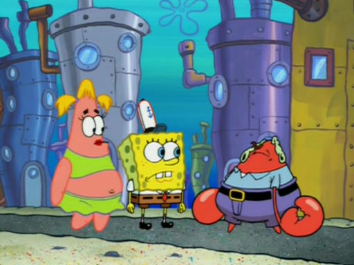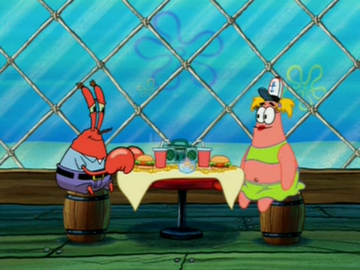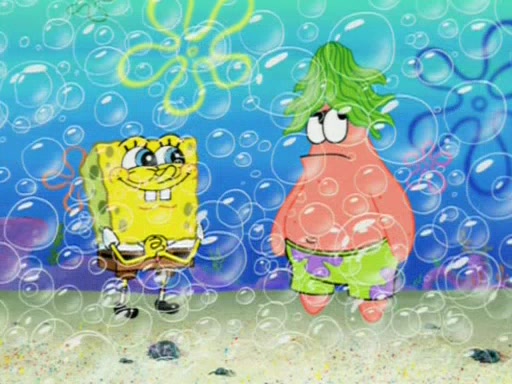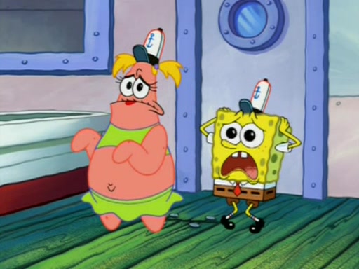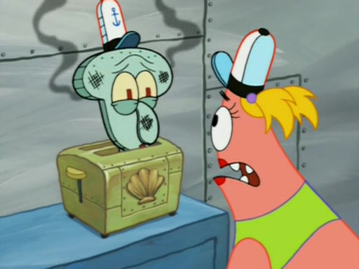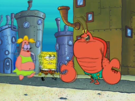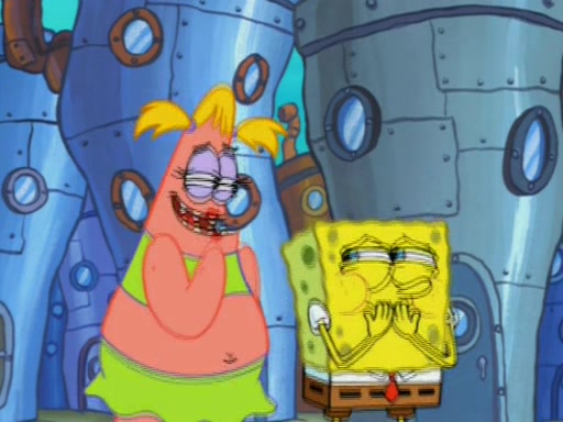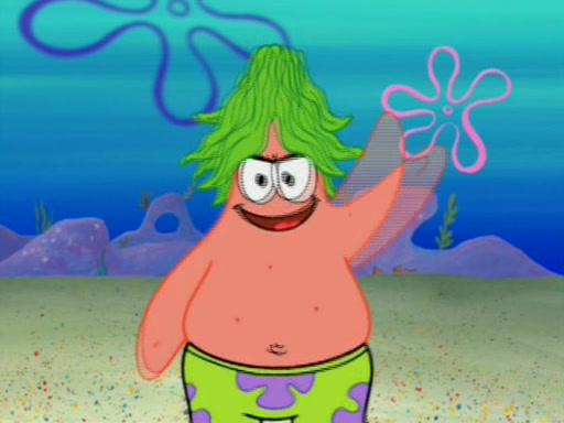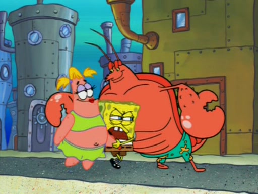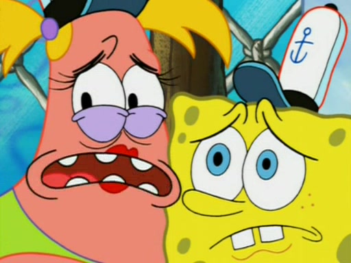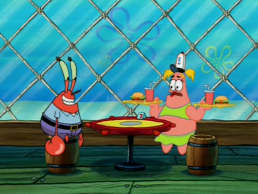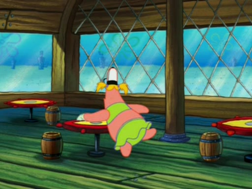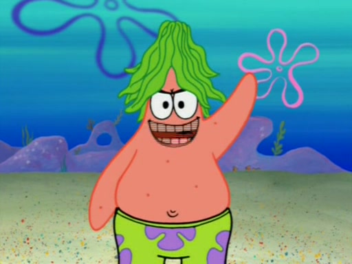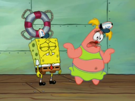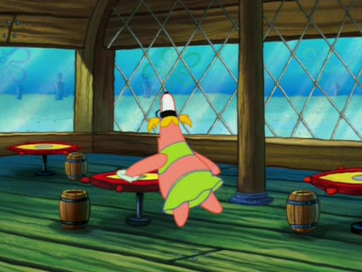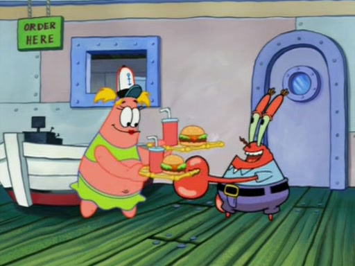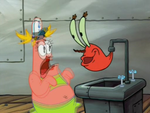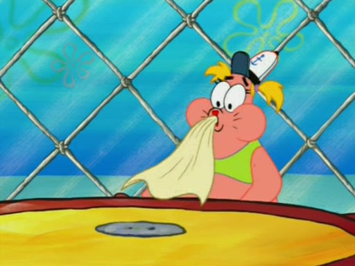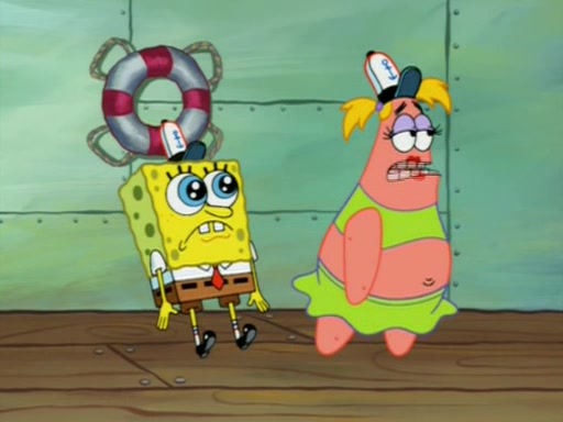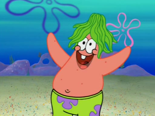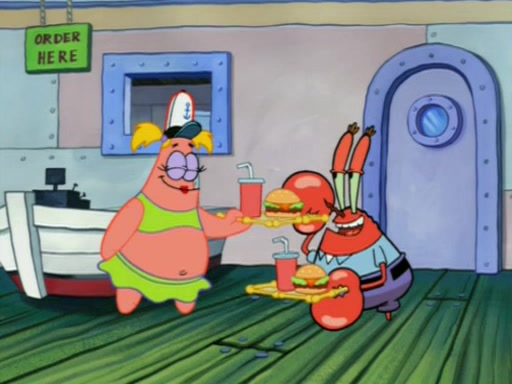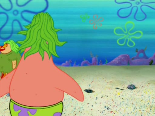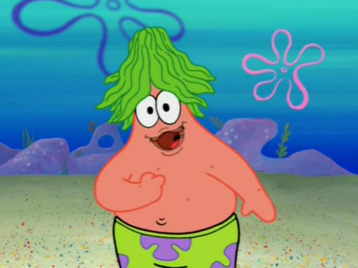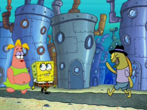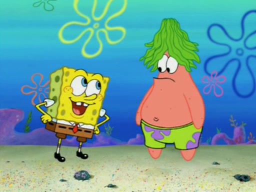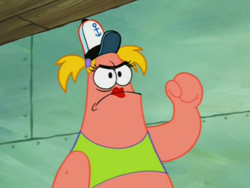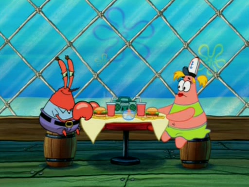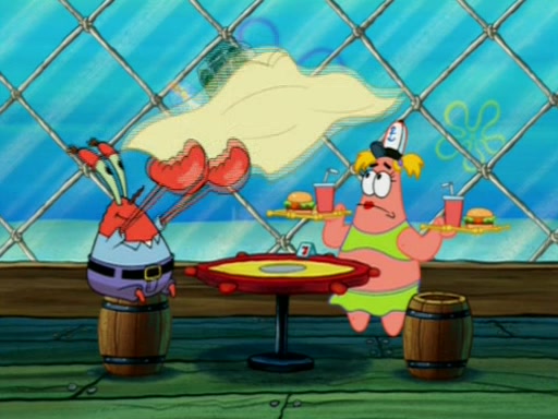 But SpongeBob tells him he can change his identity. So SpongeBob performs a makeover on Patrick and after many tries, he comes up with the idea of making him look like a woman under the name "Patricia." Every male Bikini Bottomite falls in love with "her," especially Squidward and Mr. Krabs, who only hires Patricia since he was a girl. Mr. Krabs and Squidward also flirt with Patricia, although this doesn't present a problem to him. Patrick has no idea what's making Mr. Krabs and Squidward act so weird and nice to him. All of the men fight over Patricia but "she" ignores them.