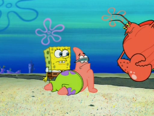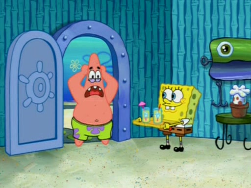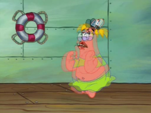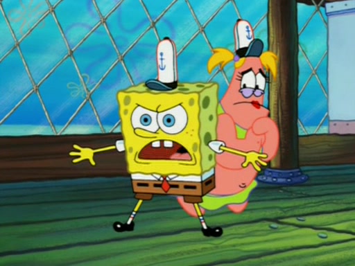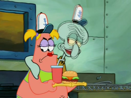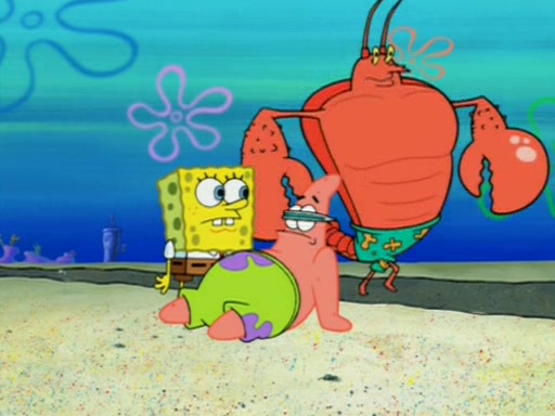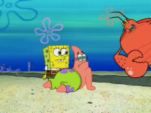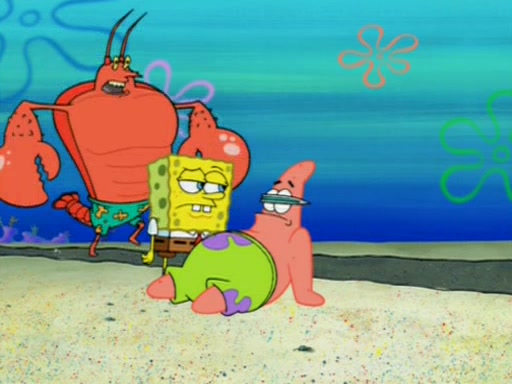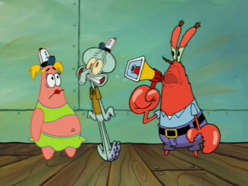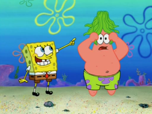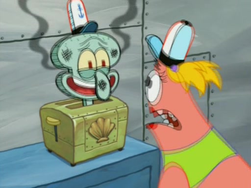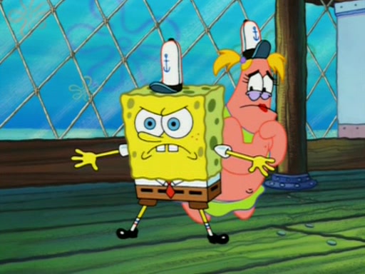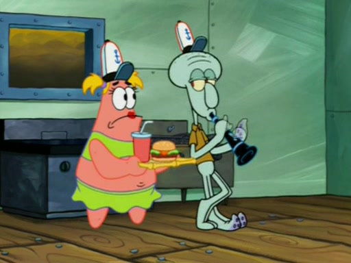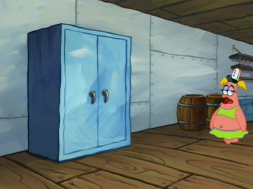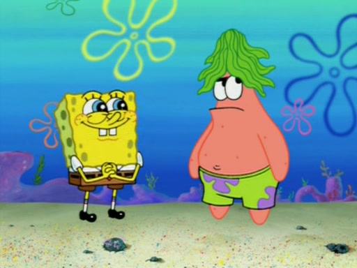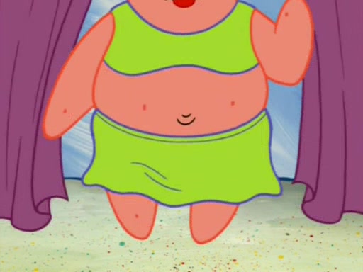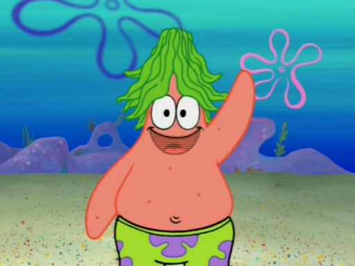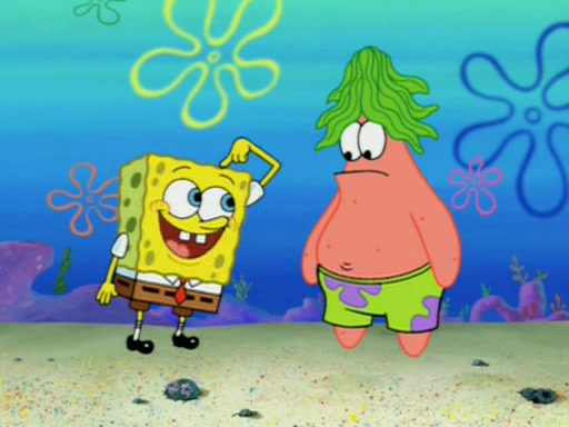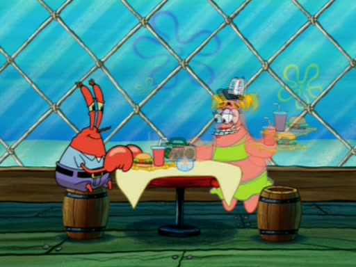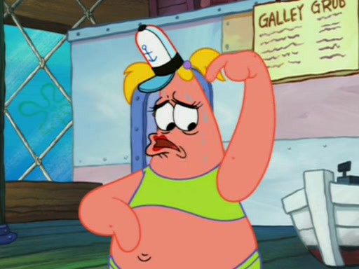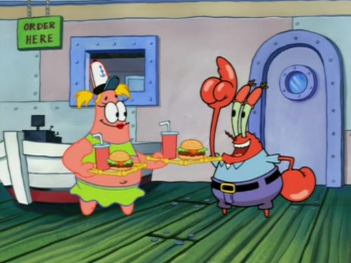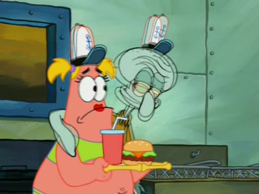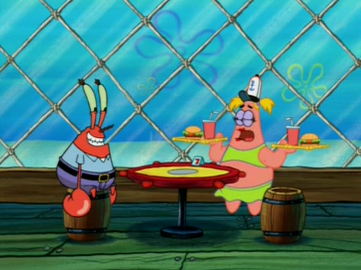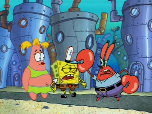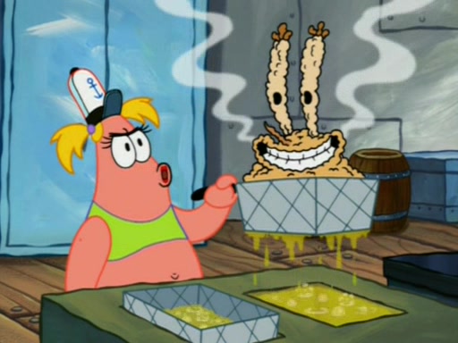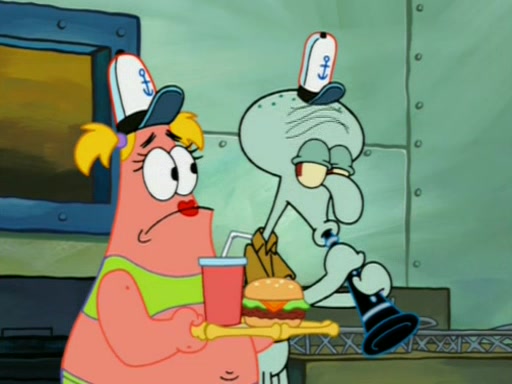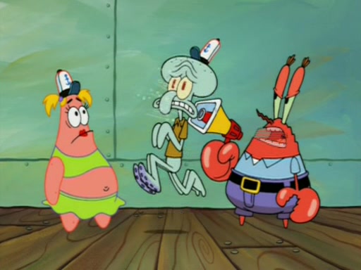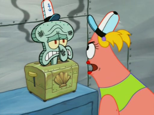 But SpongeBob tells him he can change his identity. So SpongeBob performs a makeover on Patrick and after many tries, he comes up with the idea of making him look like a woman under the name "Patricia." Every male Bikini Bottomite falls in love with "her," especially Squidward and Mr. Krabs, who only hires Patricia since he was a girl. Mr. Krabs and Squidward also flirt with Patricia, although this doesn't present a problem to him. Patrick has no idea what's making Mr. Krabs and Squidward act so weird and nice to him. All of the men fight over Patricia but "she" ignores them.