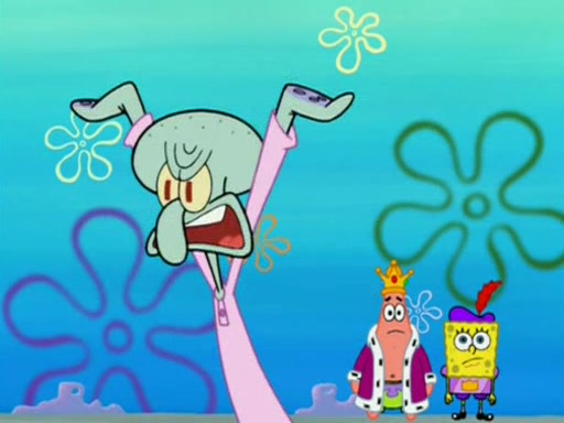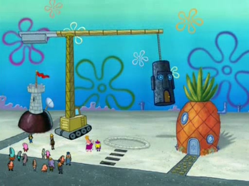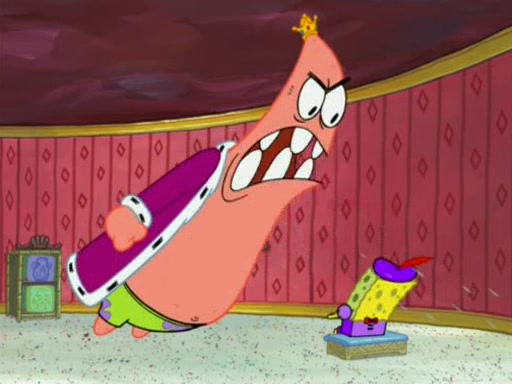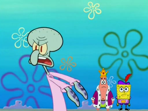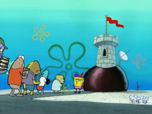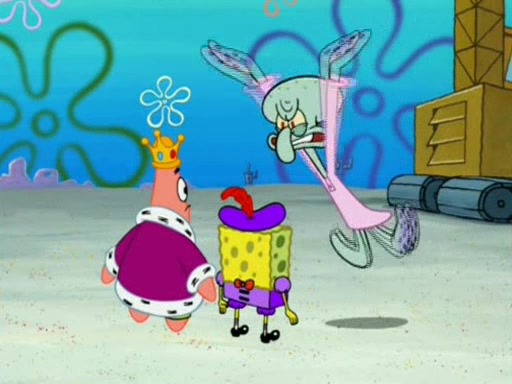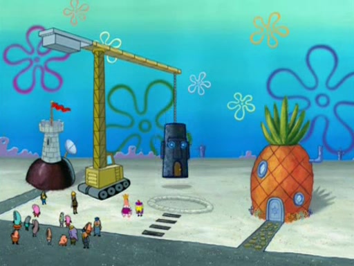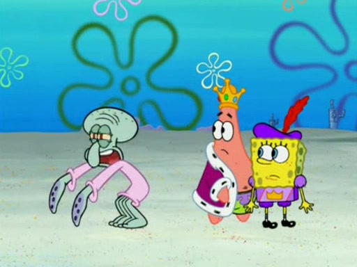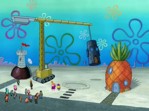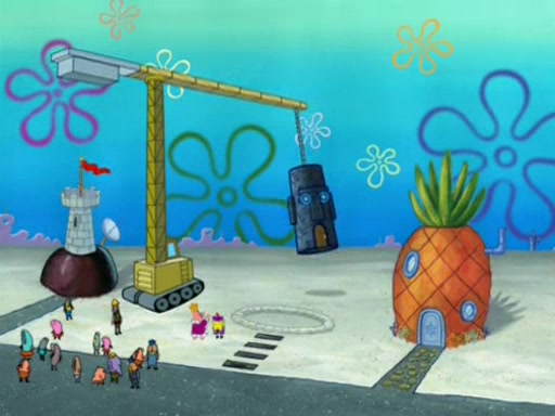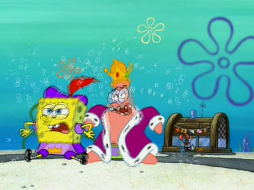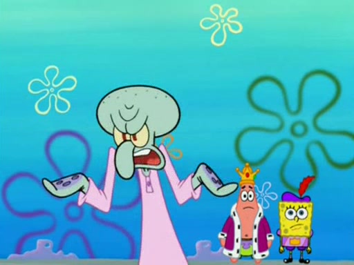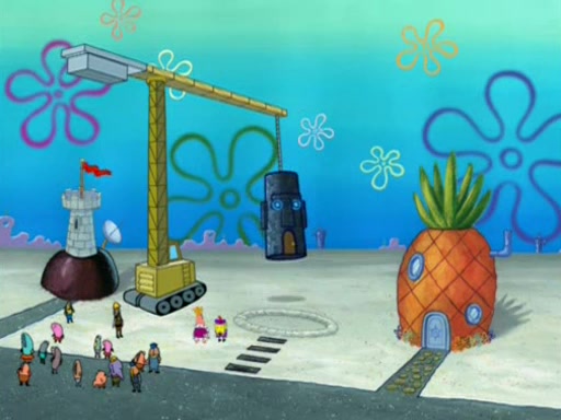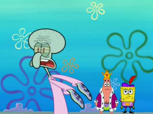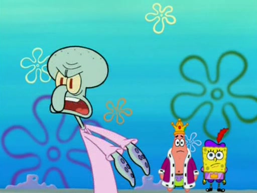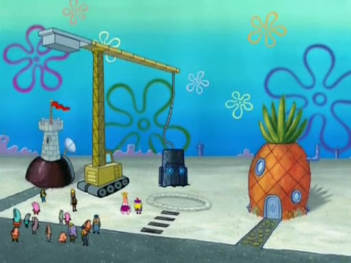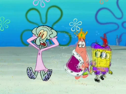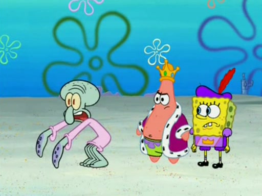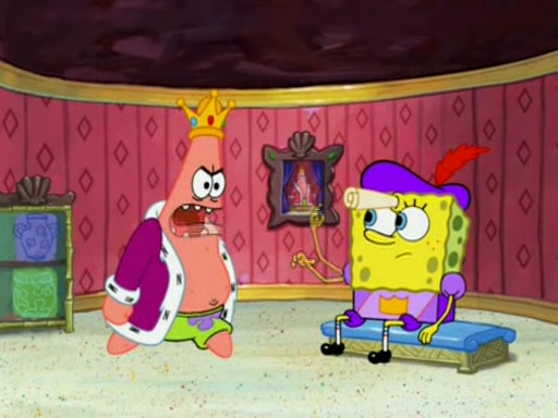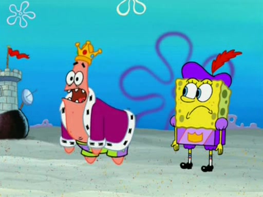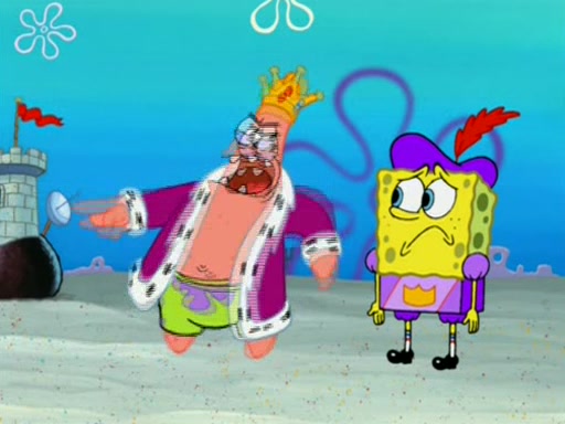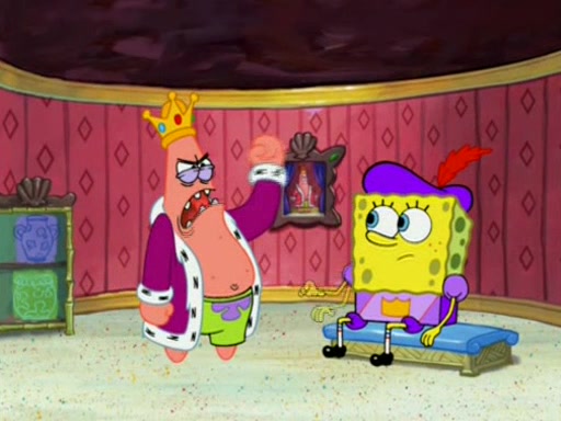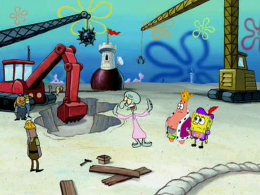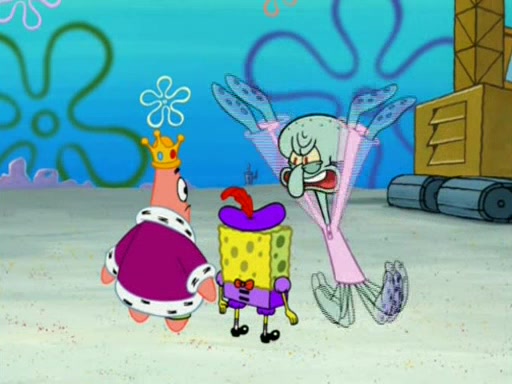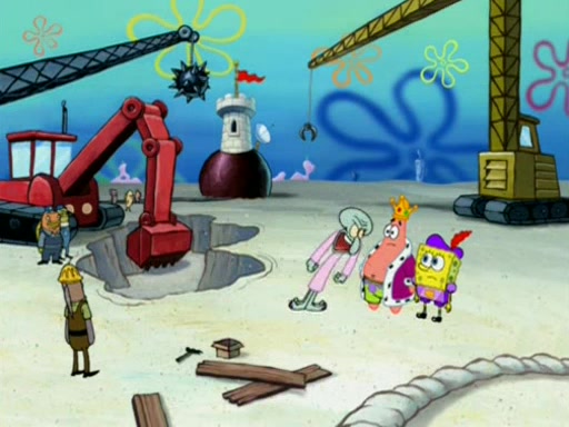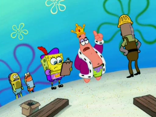 Patrick then gets other citizens to line up leading to his rock, which is turned into a magnificent castle, with one of their possessions. After SpongeBob gains a walker from an old man for Patrick, he comes down to give Patrick his opinion on whether to put his plasma screen TV by the fancy egg display or the indoor swimming pool, which is seen shaped as a star, and is obviously known because he is a starfish. Next morning, Squidward wakes up in a good mood. But that is quickly spoiled when he is blown away by the wind inside his house because Patrick is making a crane move it back a little to build a ferris wheel. Squidward finally explodes after coming out of his house and announces to everyone that Patrick couldn't be a king because he is much too stupid and tells them that he can't be a king of anything (except of being a moron). The townspeople believe Squidward and abandon Patrick. Patrick then explodes and requests SpongeBob to attack Squidward. SpongeBob pretends to go to Squidward right away, but really asks Squidward to sign a treaty. But Squidward rolls up the treaty and plugs it into one of SpongeBob's craters just by throwing it.