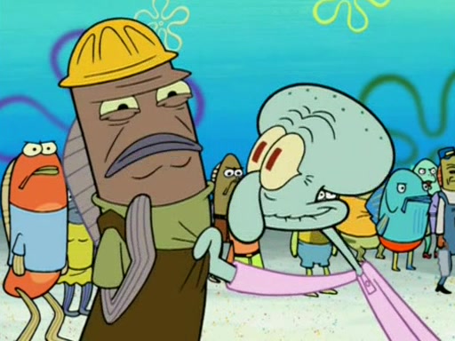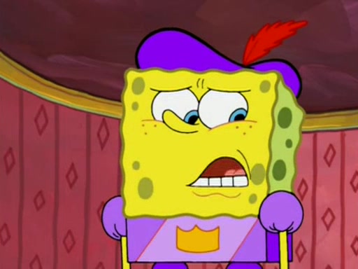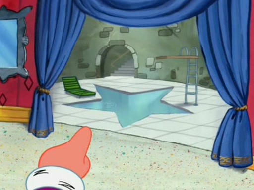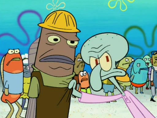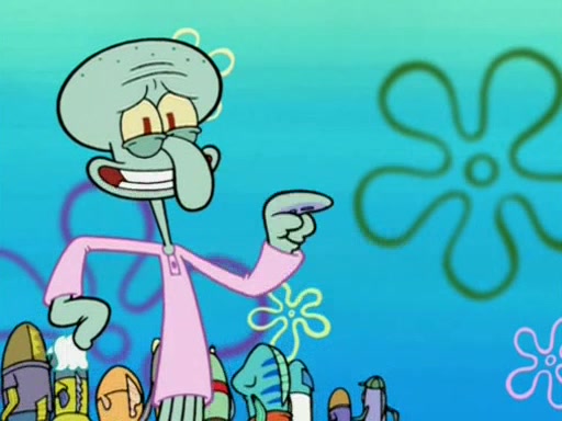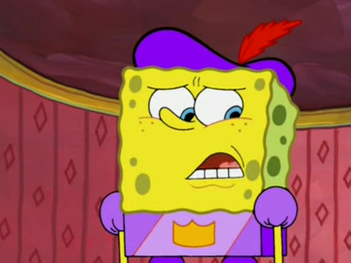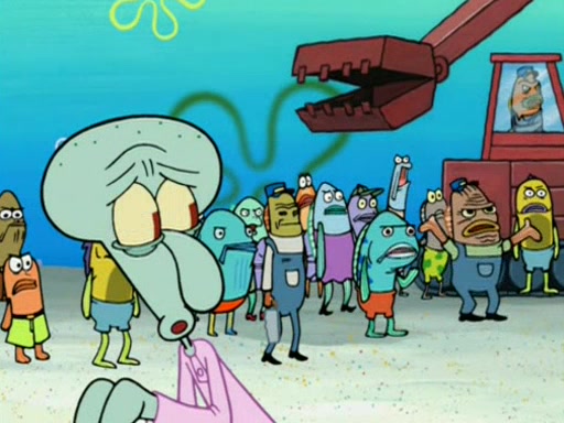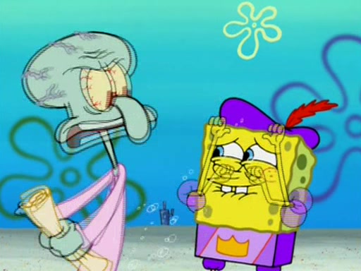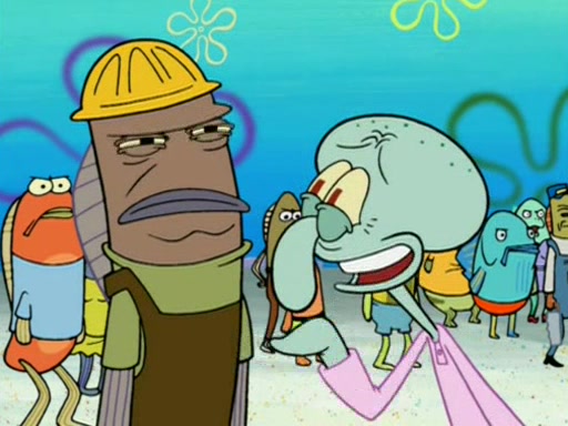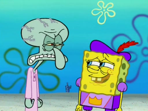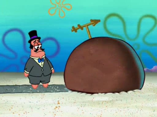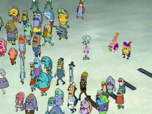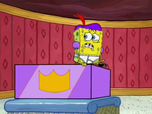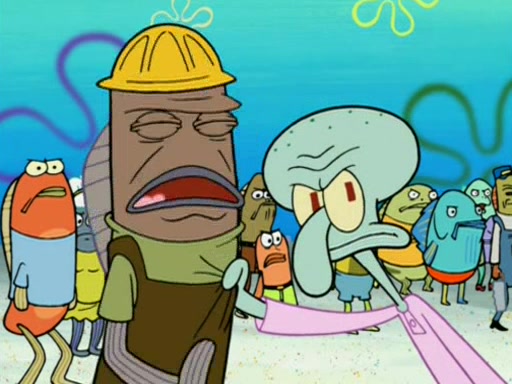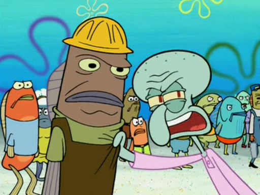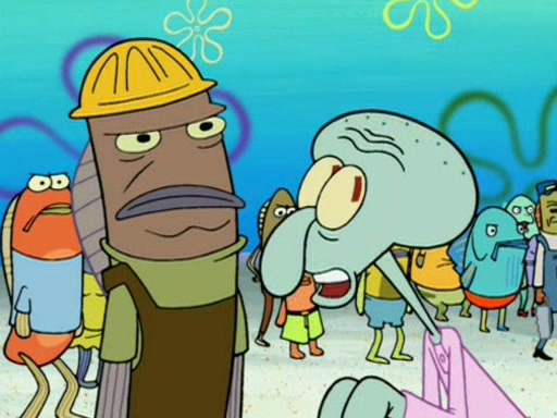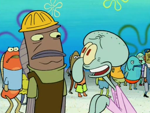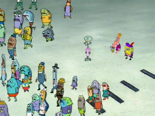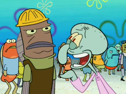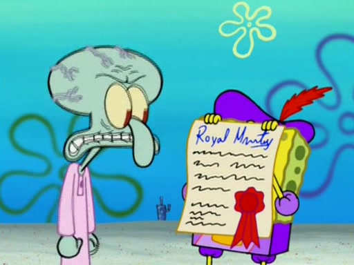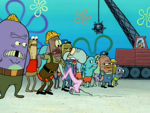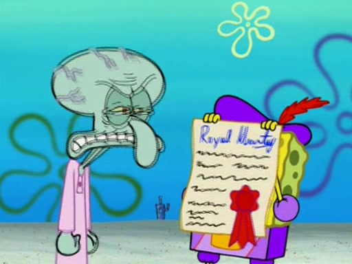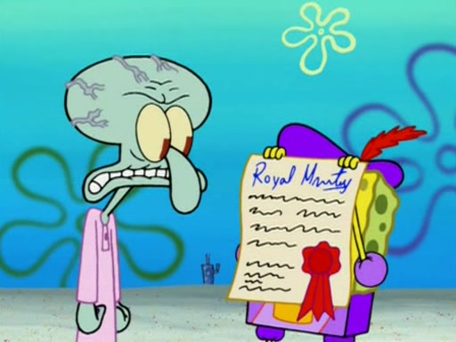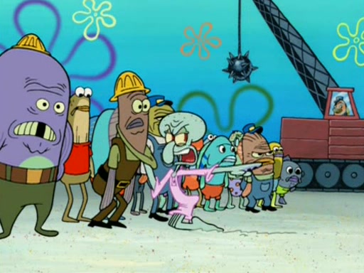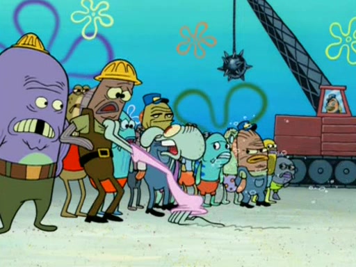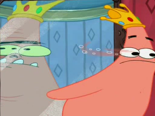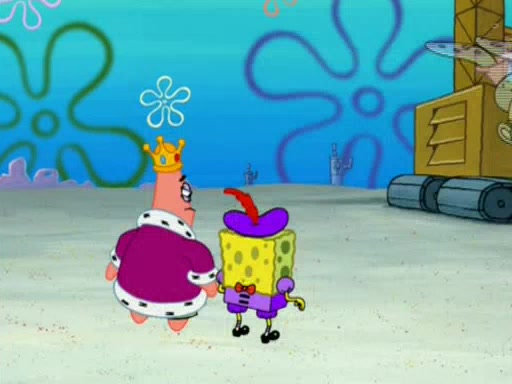 Patrick then gets other citizens to line up leading to his rock, which is turned into a magnificent castle, with one of their possessions. After SpongeBob gains a walker from an old man for Patrick, he comes down to give Patrick his opinion on whether to put his plasma screen TV by the fancy egg display or the indoor swimming pool, which is seen shaped as a star, and is obviously known because he is a starfish. Next morning, Squidward wakes up in a good mood. But that is quickly spoiled when he is blown away by the wind inside his house because Patrick is making a crane move it back a little to build a ferris wheel. Squidward finally explodes after coming out of his house and announces to everyone that Patrick couldn't be a king because he is much too stupid and tells them that he can't be a king of anything (except of being a moron). The townspeople believe Squidward and abandon Patrick. Patrick then explodes and requests SpongeBob to attack Squidward. SpongeBob pretends to go to Squidward right away, but really asks Squidward to sign a treaty. But Squidward rolls up the treaty and plugs it into one of SpongeBob's craters just by throwing it.