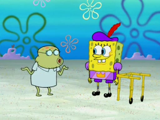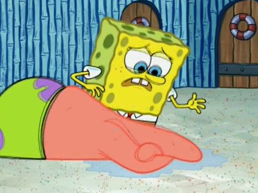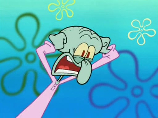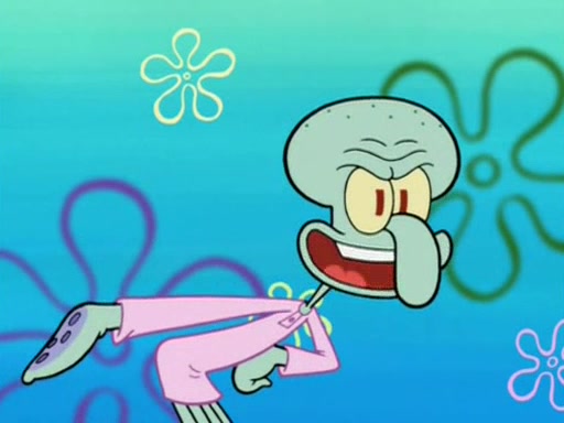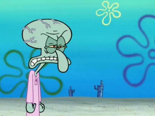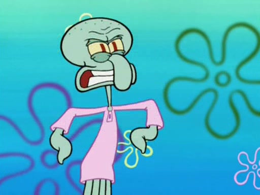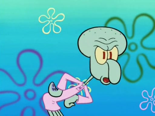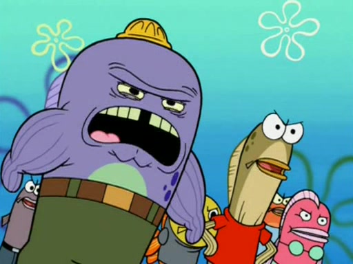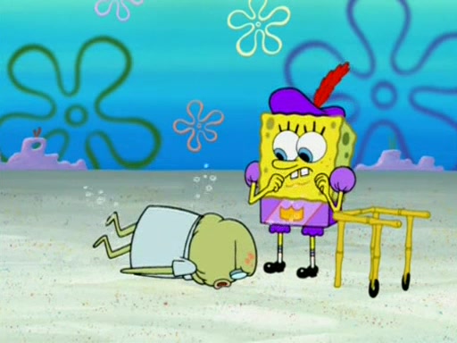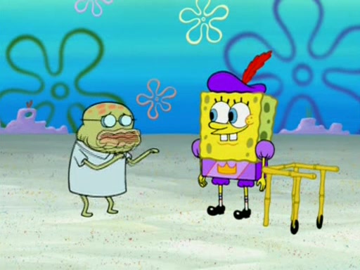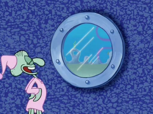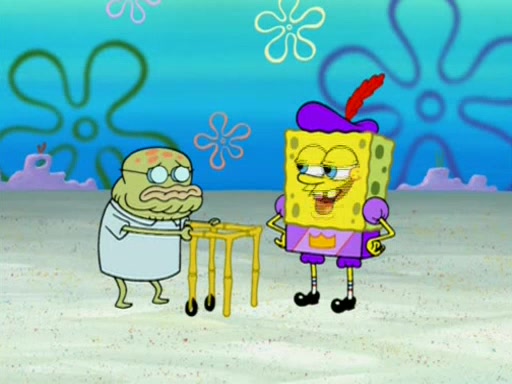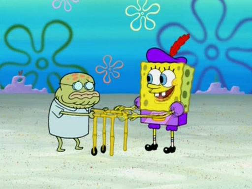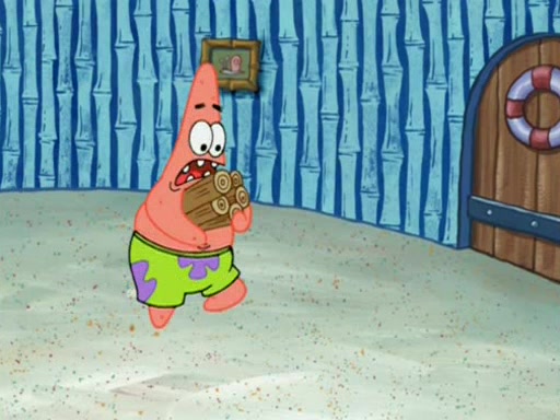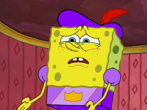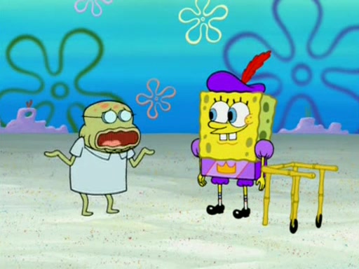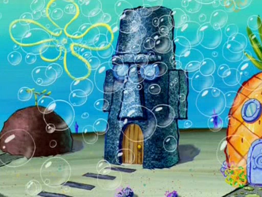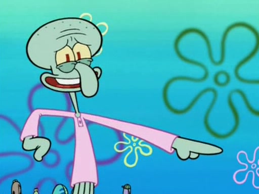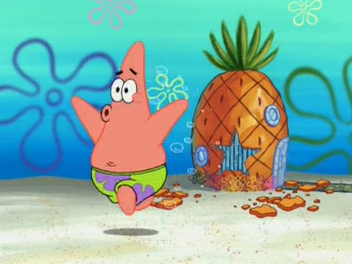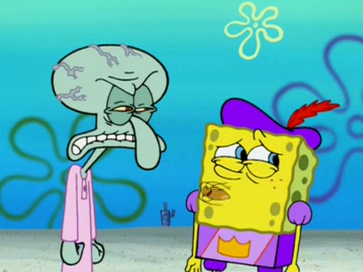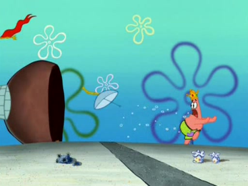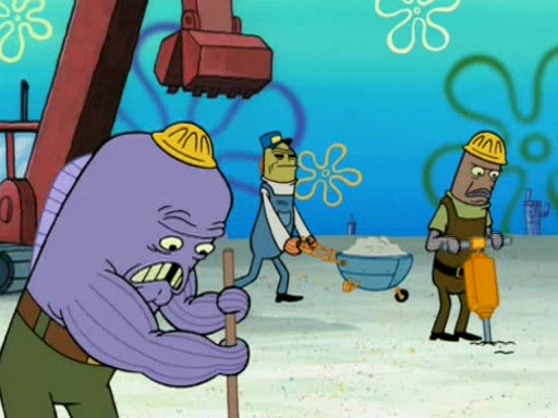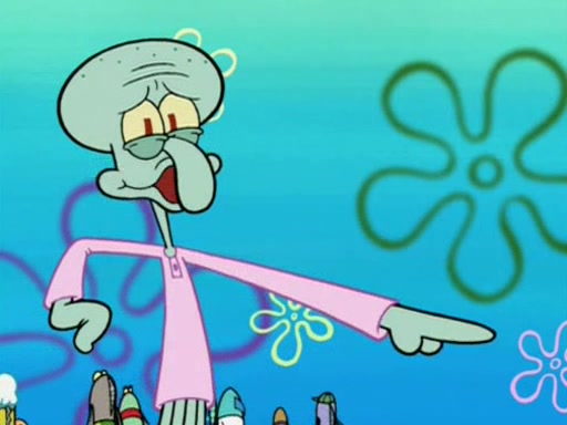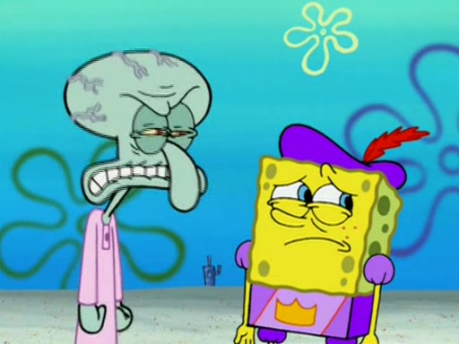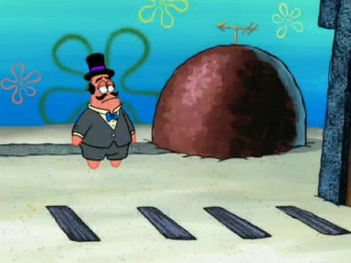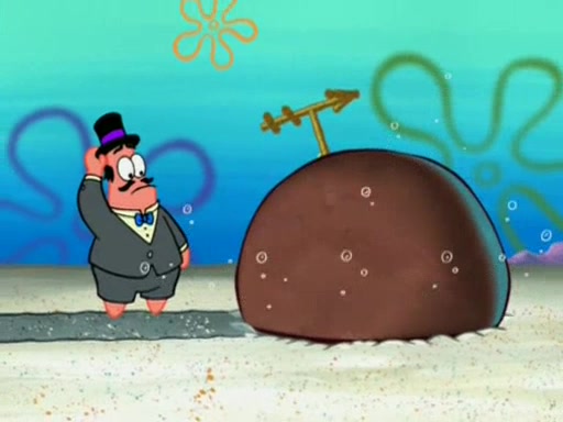 Patrick then gets other citizens to line up leading to his rock, which is turned into a magnificent castle, with one of their possessions. After SpongeBob gains a walker from an old man for Patrick, he comes down to give Patrick his opinion on whether to put his plasma screen TV by the fancy egg display or the indoor swimming pool, which is seen shaped as a star, and is obviously known because he is a starfish. Next morning, Squidward wakes up in a good mood. But that is quickly spoiled when he is blown away by the wind inside his house because Patrick is making a crane move it back a little to build a ferris wheel. Squidward finally explodes after coming out of his house and announces to everyone that Patrick couldn't be a king because he is much too stupid and tells them that he can't be a king of anything (except of being a moron). The townspeople believe Squidward and abandon Patrick. Patrick then explodes and requests SpongeBob to attack Squidward. SpongeBob pretends to go to Squidward right away, but really asks Squidward to sign a treaty. But Squidward rolls up the treaty and plugs it into one of SpongeBob's craters just by throwing it.