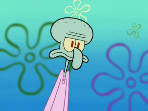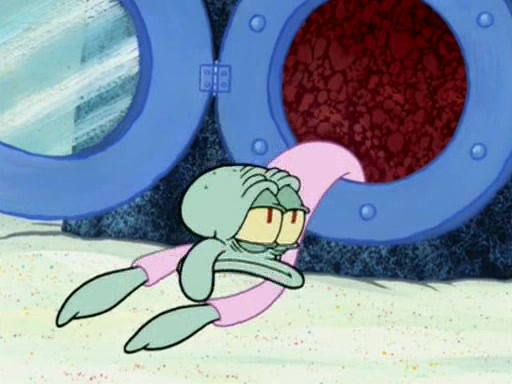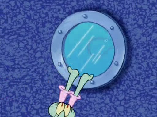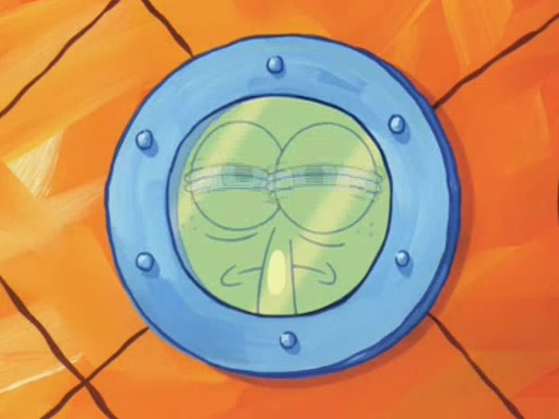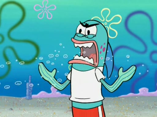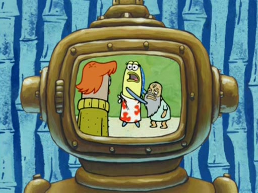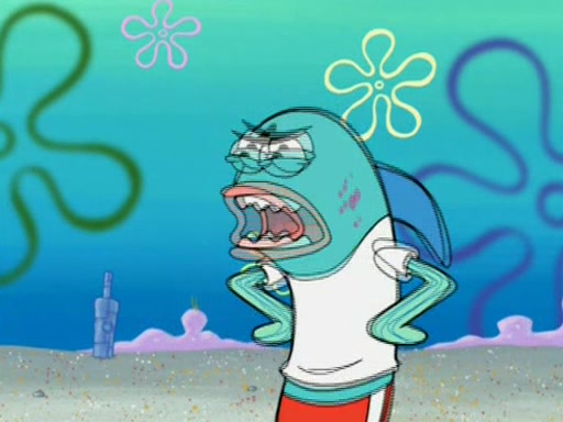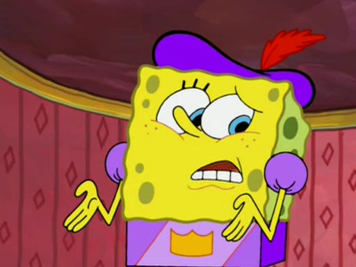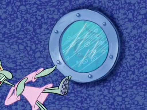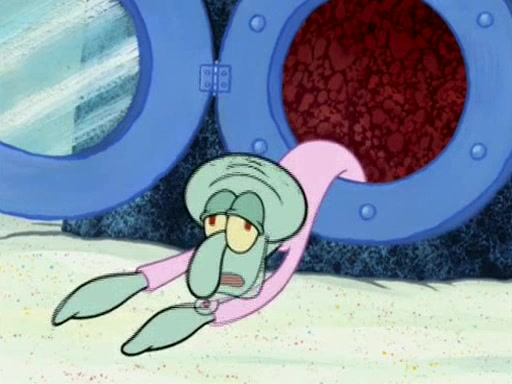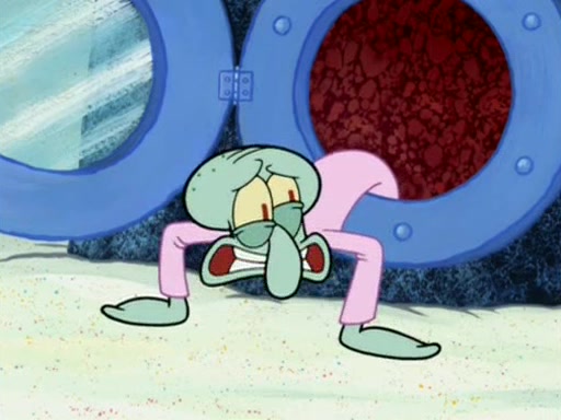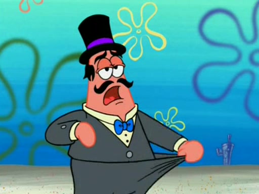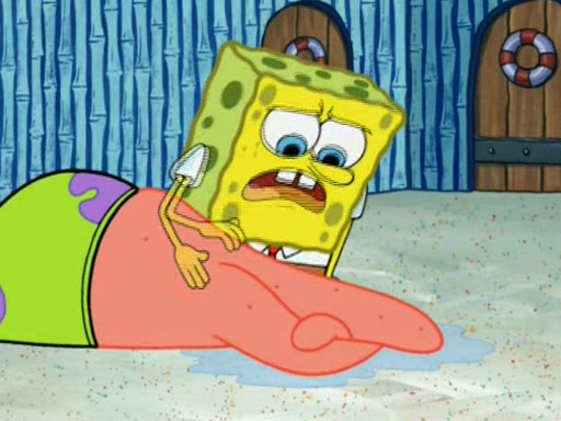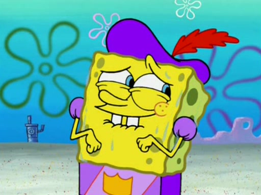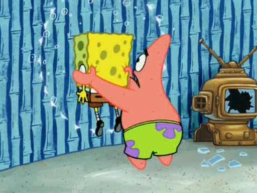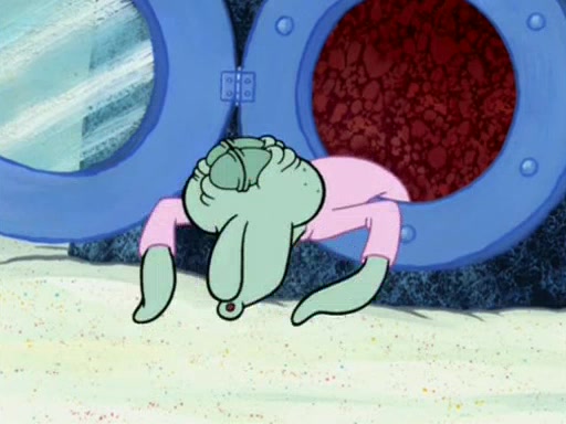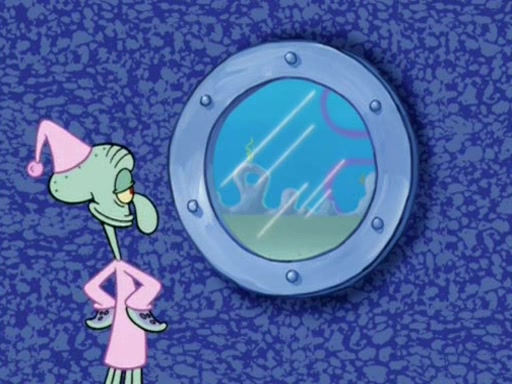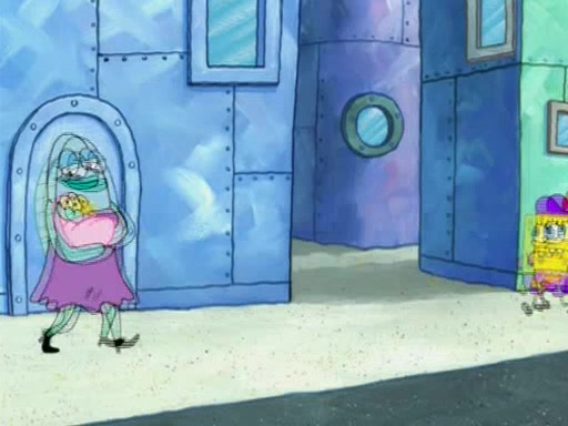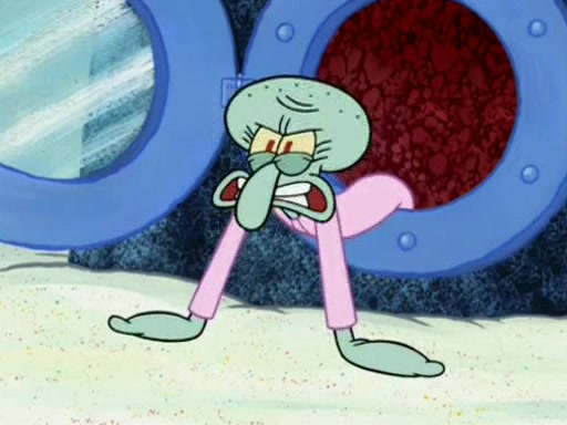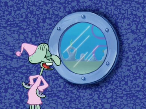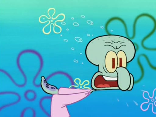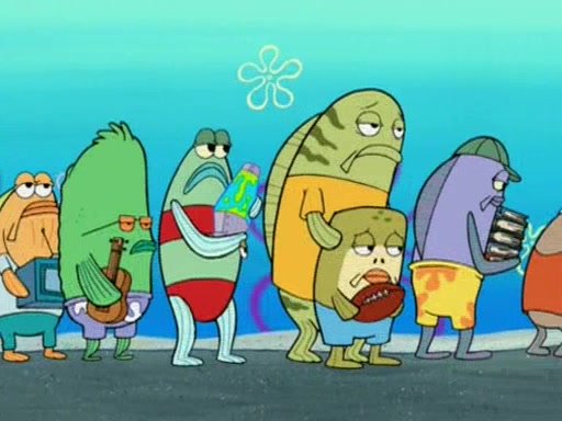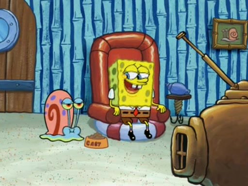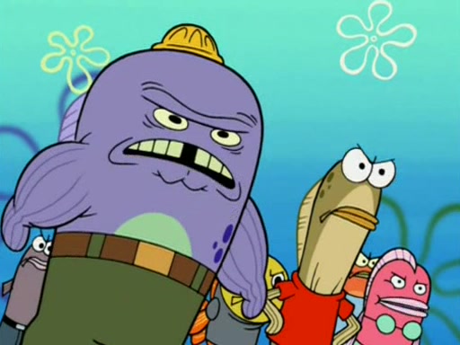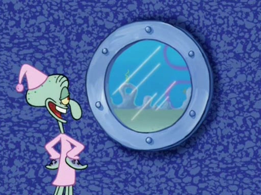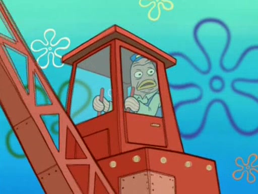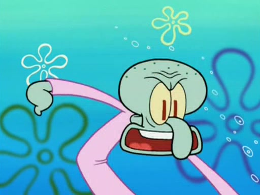 Patrick then gets other citizens to line up leading to his rock, which is turned into a magnificent castle, with one of their possessions. After SpongeBob gains a walker from an old man for Patrick, he comes down to give Patrick his opinion on whether to put his plasma screen TV by the fancy egg display or the indoor swimming pool, which is seen shaped as a star, and is obviously known because he is a starfish. Next morning, Squidward wakes up in a good mood. But that is quickly spoiled when he is blown away by the wind inside his house because Patrick is making a crane move it back a little to build a ferris wheel. Squidward finally explodes after coming out of his house and announces to everyone that Patrick couldn't be a king because he is much too stupid and tells them that he can't be a king of anything (except of being a moron). The townspeople believe Squidward and abandon Patrick. Patrick then explodes and requests SpongeBob to attack Squidward. SpongeBob pretends to go to Squidward right away, but really asks Squidward to sign a treaty. But Squidward rolls up the treaty and plugs it into one of SpongeBob's craters just by throwing it.