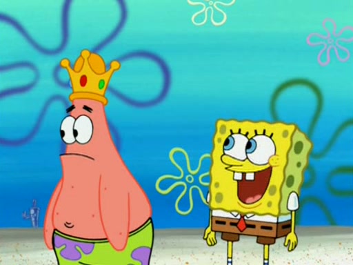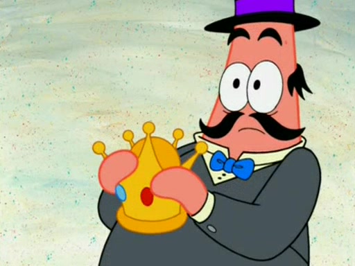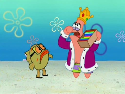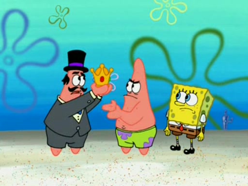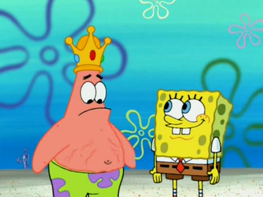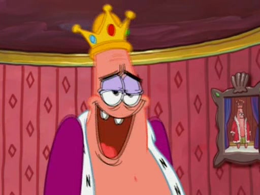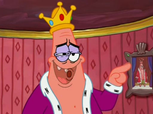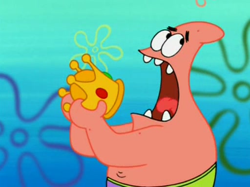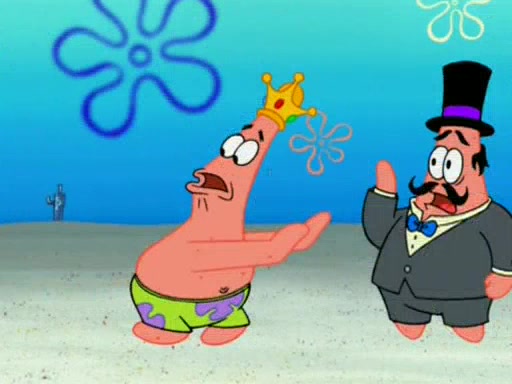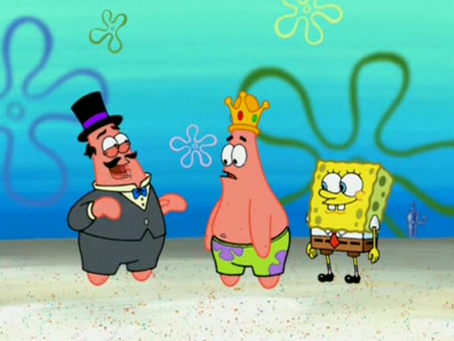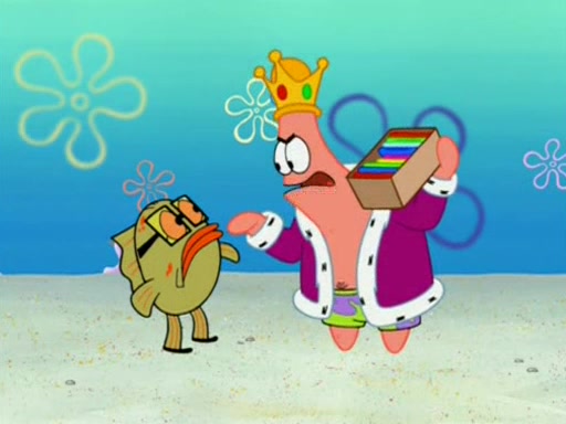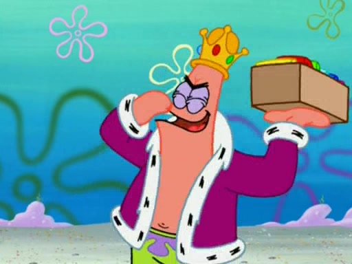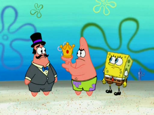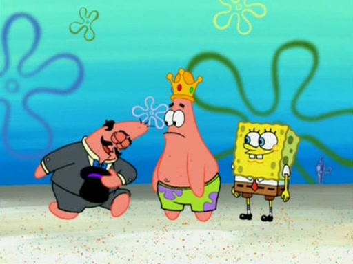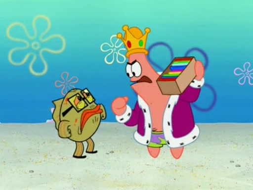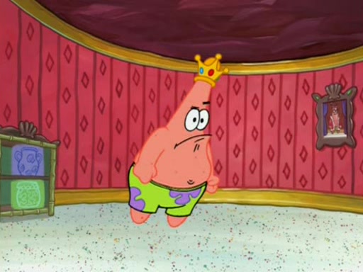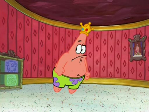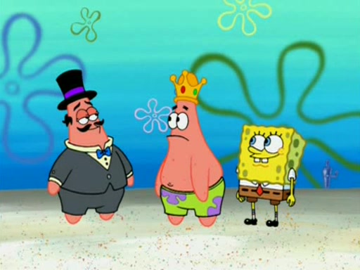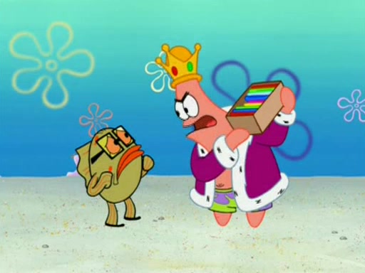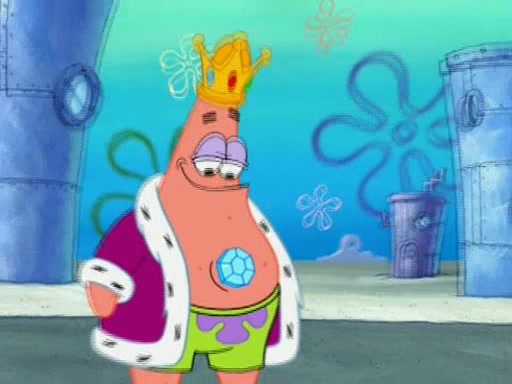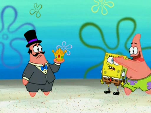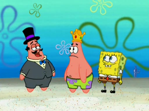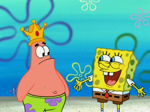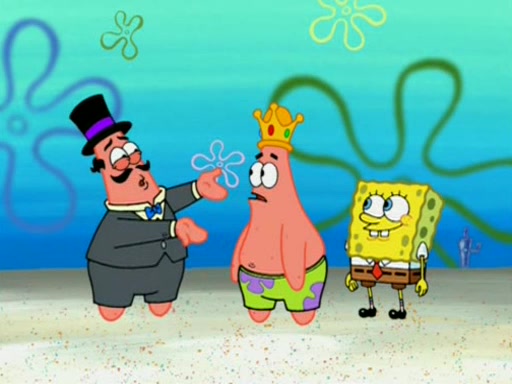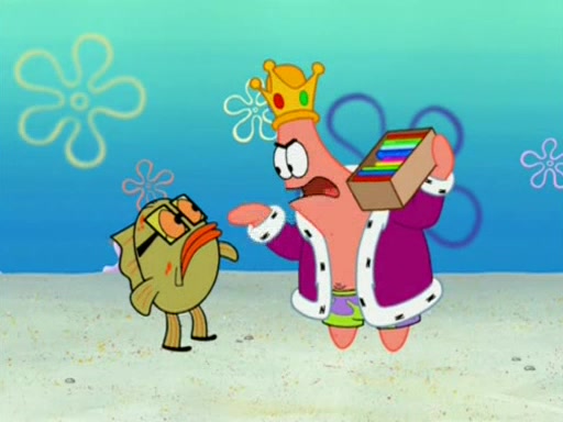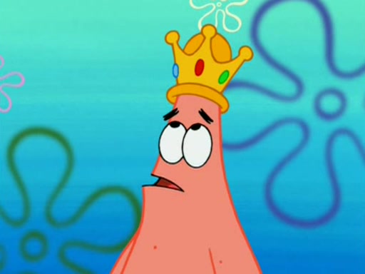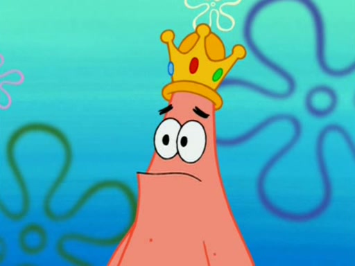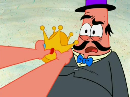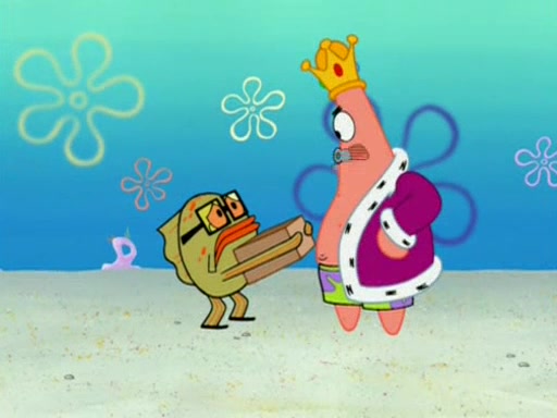 A starfish from the Royal Ministry comes to visit Patrick for a delivery. After Patrick opens his rock, he thinks the starfish is a librarian and has come for his overdue library books. Patrick runs to SpongeBob's house and cries about it. SpongeBob covers for Patrick by coming up to the man and greeting him. The starfish then asks SpongeBob if he knows Patrick, but SpongeBob lies and says: "No, I do not know any starfish!" in surprise and shock. When the starfish announces he has a gift for Patrick, which is a crown; Patrick dashes out of SpongeBob's house and grabs his gift. He starts chewing it and licking it, and announces it's a terrible-tasting gift. The starfish explains it's an item to wear, not to eat. Patrick is pleased when he gets the shiny crown. The starfish explains that he had uncovered a family tree showing Patrick to be descended from a king thus making him an official king.