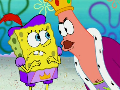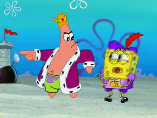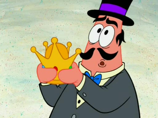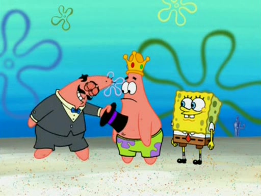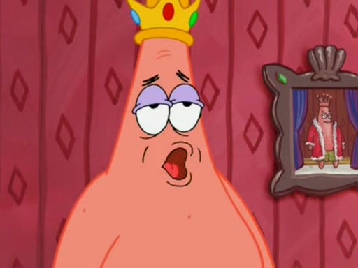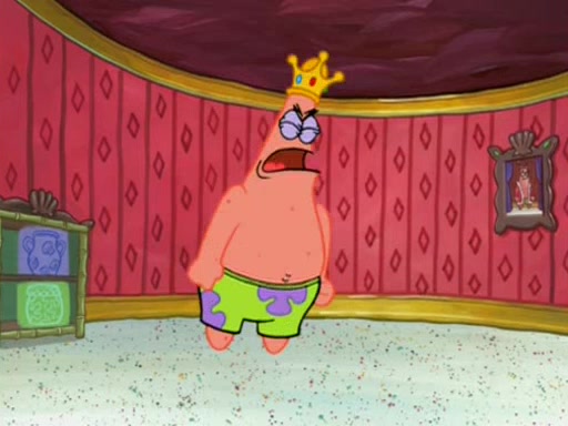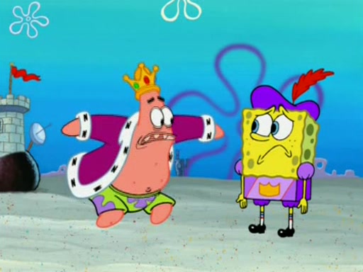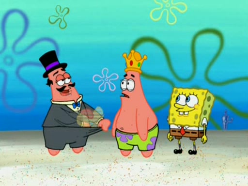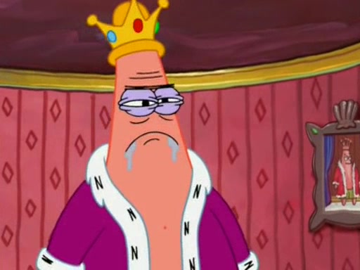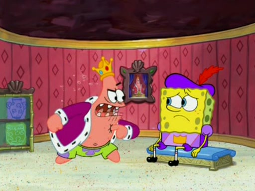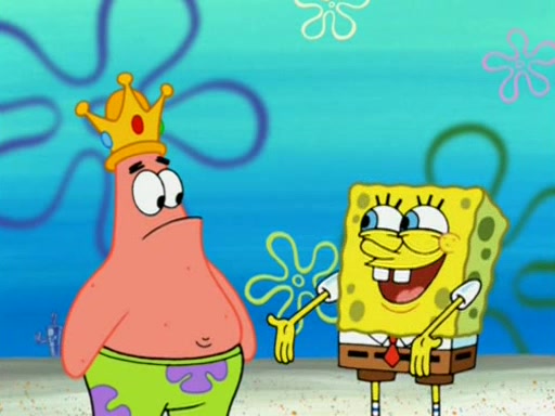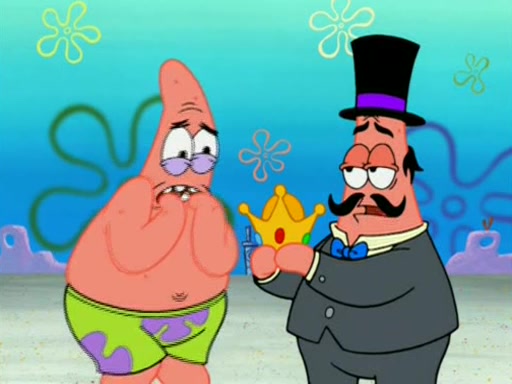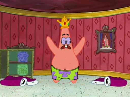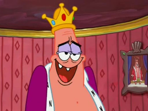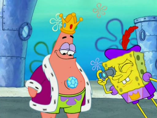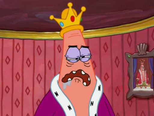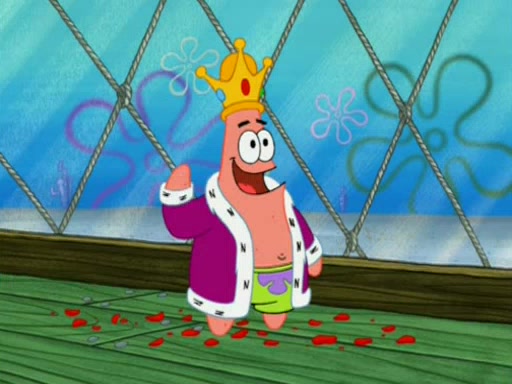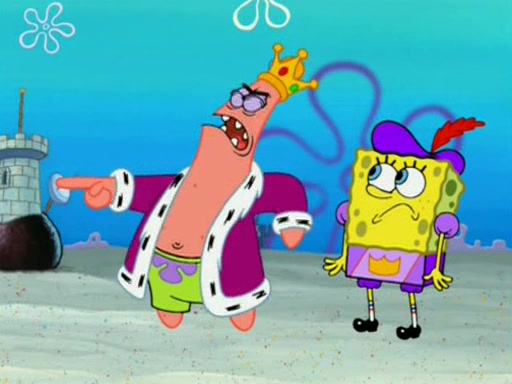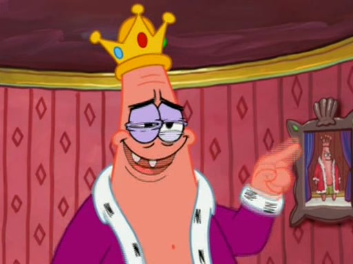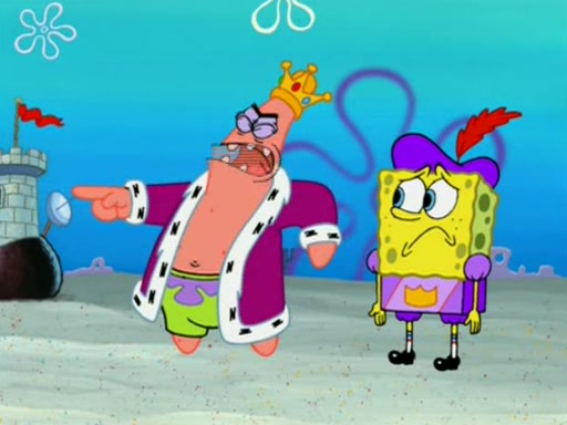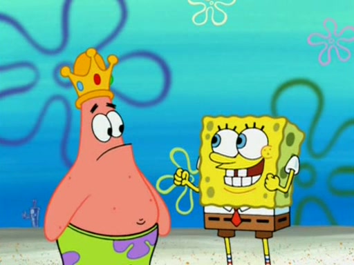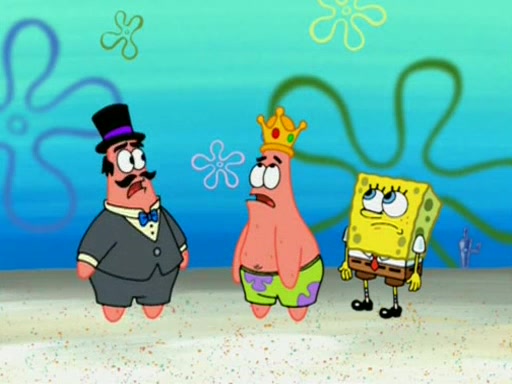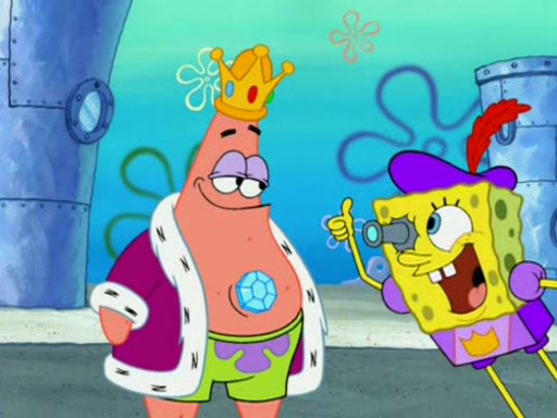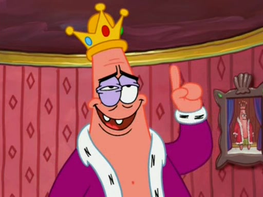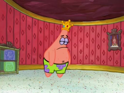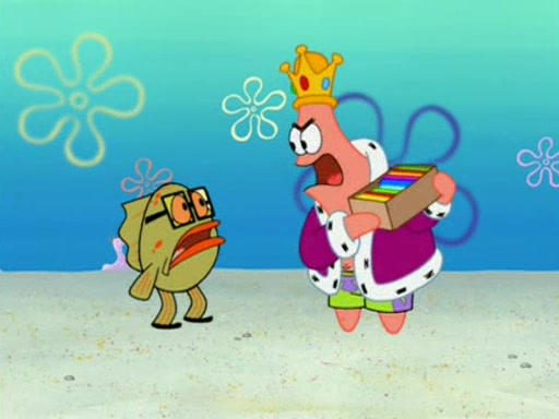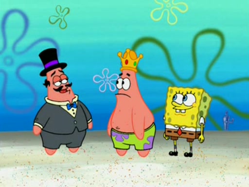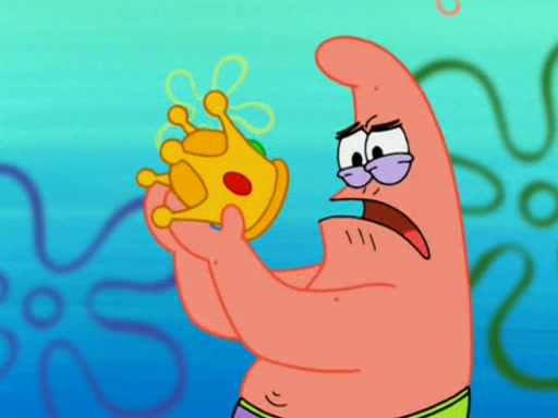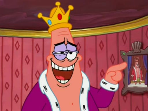 A starfish from the Royal Ministry comes to visit Patrick for a delivery. After Patrick opens his rock, he thinks the starfish is a librarian and has come for his overdue library books. Patrick runs to SpongeBob's house and cries about it. SpongeBob covers for Patrick by coming up to the man and greeting him. The starfish then asks SpongeBob if he knows Patrick, but SpongeBob lies and says: "No, I do not know any starfish!" in surprise and shock. When the starfish announces he has a gift for Patrick, which is a crown; Patrick dashes out of SpongeBob's house and grabs his gift. He starts chewing it and licking it, and announces it's a terrible-tasting gift. The starfish explains it's an item to wear, not to eat. Patrick is pleased when he gets the shiny crown. The starfish explains that he had uncovered a family tree showing Patrick to be descended from a king thus making him an official king.