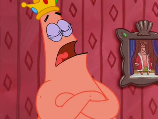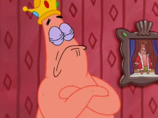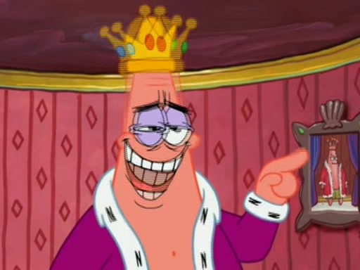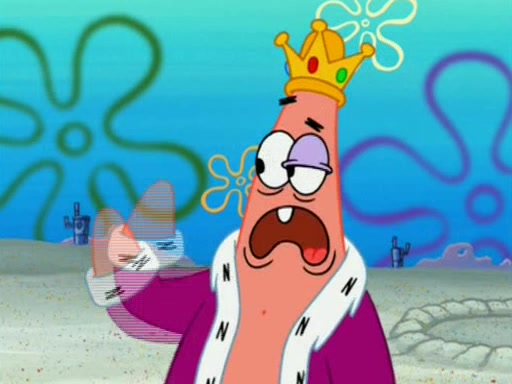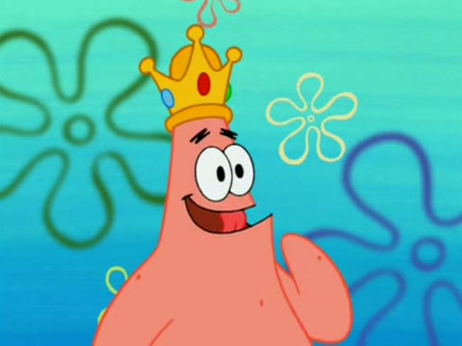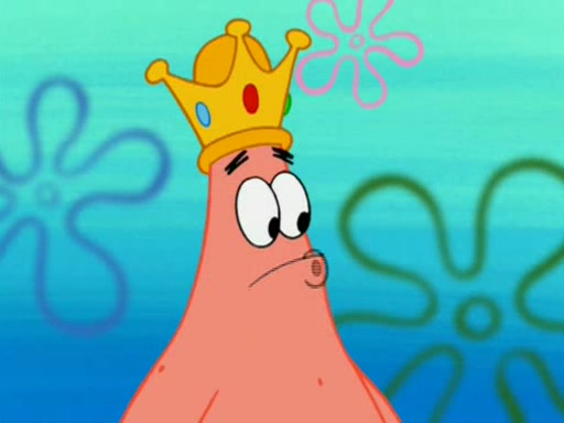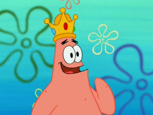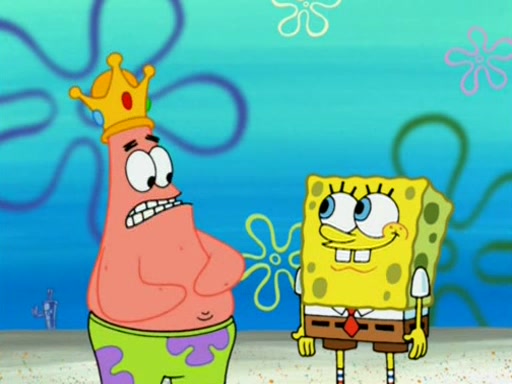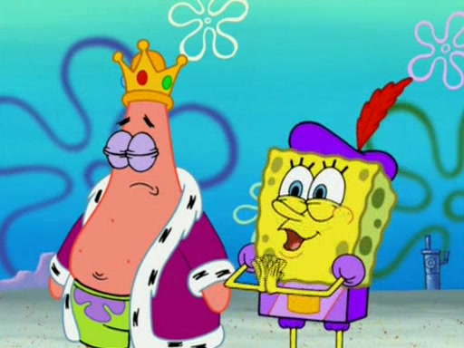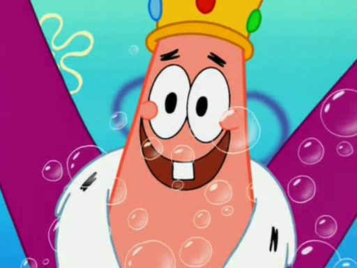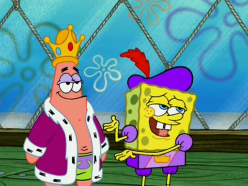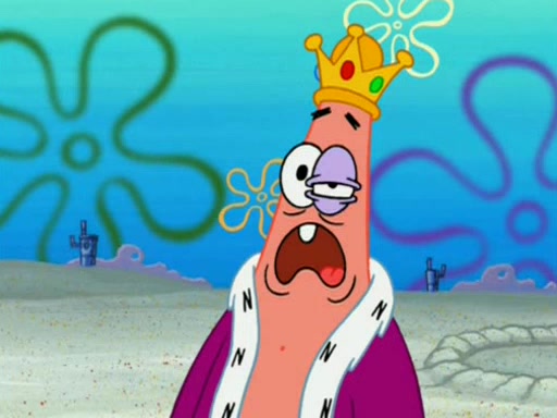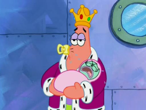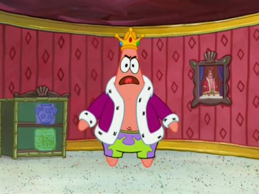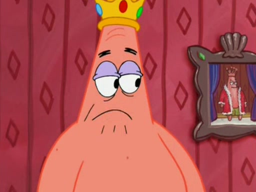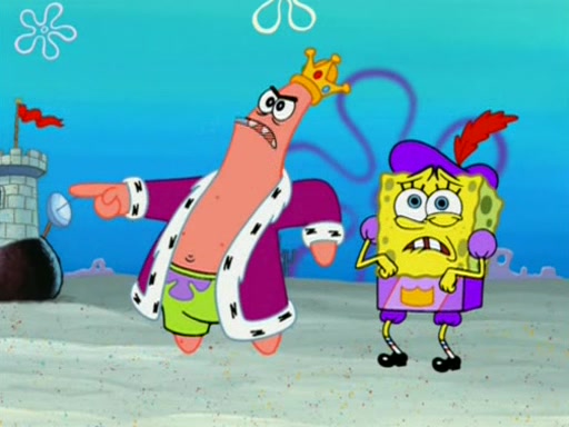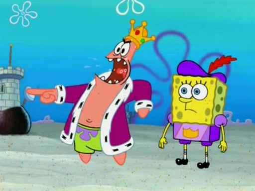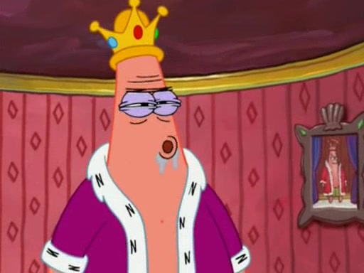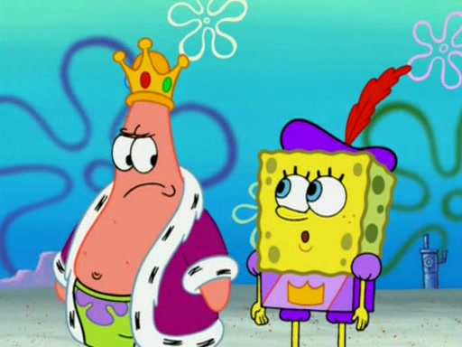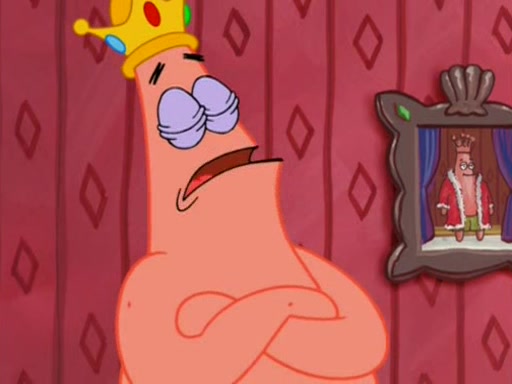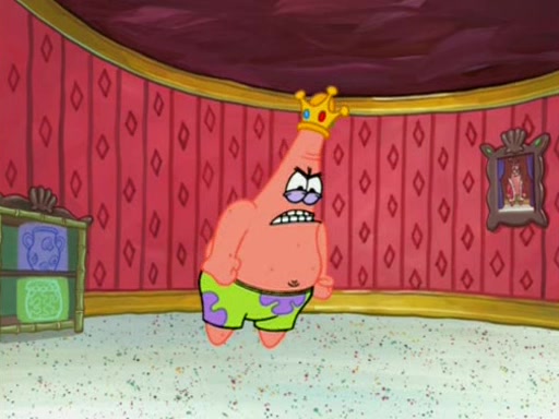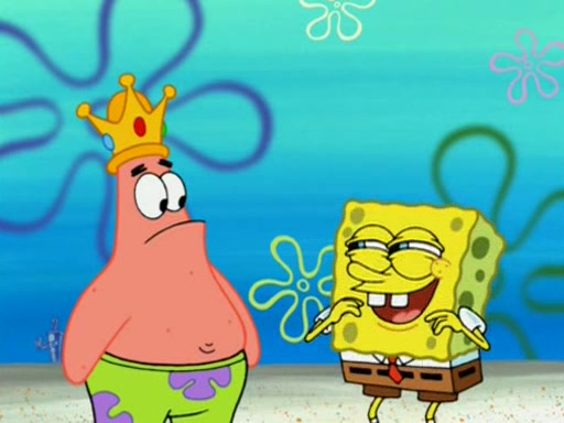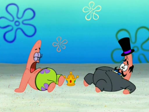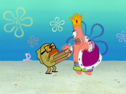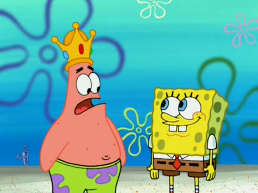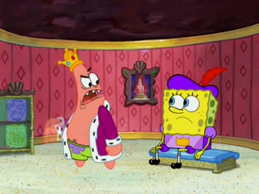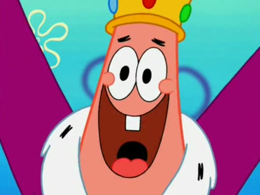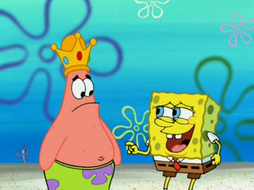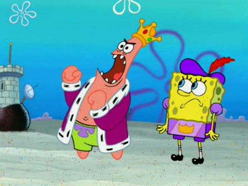 A starfish from the Royal Ministry comes to visit Patrick for a delivery. After Patrick opens his rock, he thinks the starfish is a librarian and has come for his overdue library books. Patrick runs to SpongeBob's house and cries about it. SpongeBob covers for Patrick by coming up to the man and greeting him. The starfish then asks SpongeBob if he knows Patrick, but SpongeBob lies and says: "No, I do not know any starfish!" in surprise and shock. When the starfish announces he has a gift for Patrick, which is a crown; Patrick dashes out of SpongeBob's house and grabs his gift. He starts chewing it and licking it, and announces it's a terrible-tasting gift. The starfish explains it's an item to wear, not to eat. Patrick is pleased when he gets the shiny crown. The starfish explains that he had uncovered a family tree showing Patrick to be descended from a king thus making him an official king.