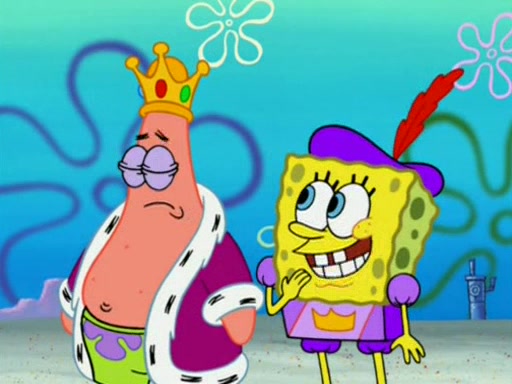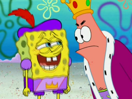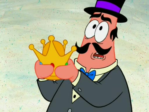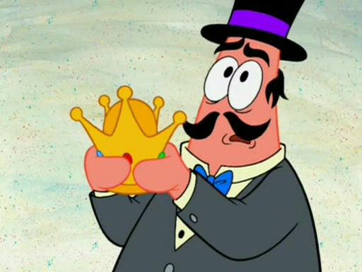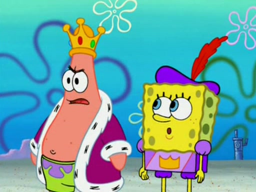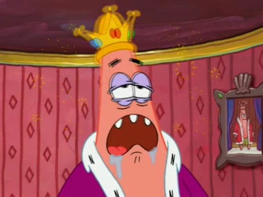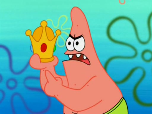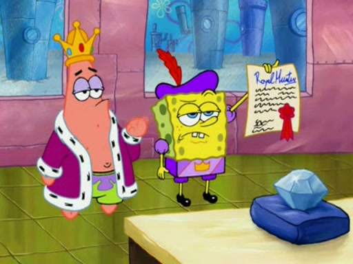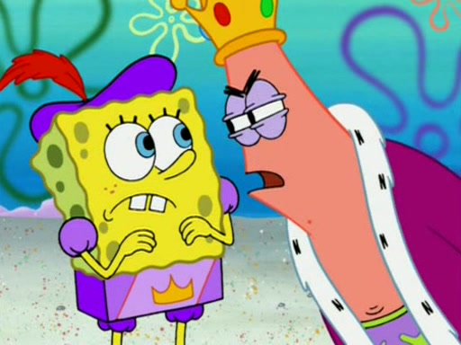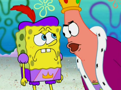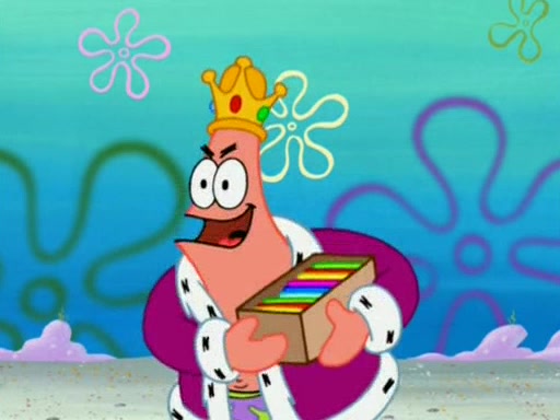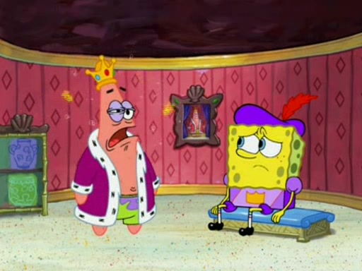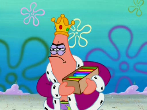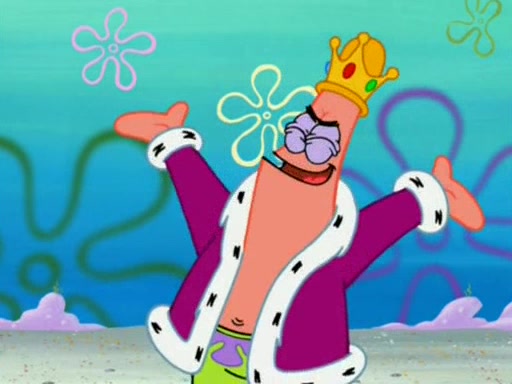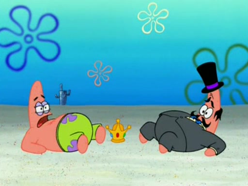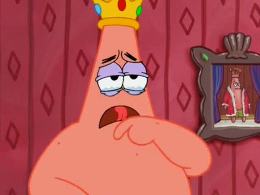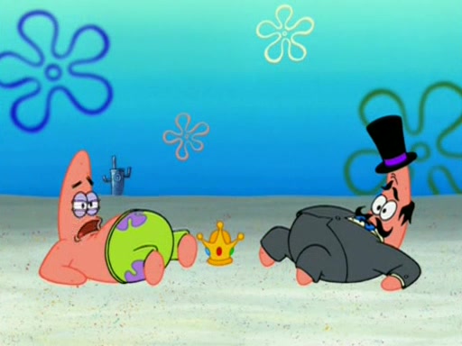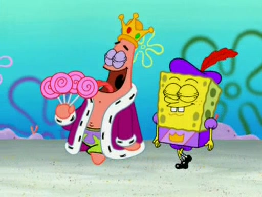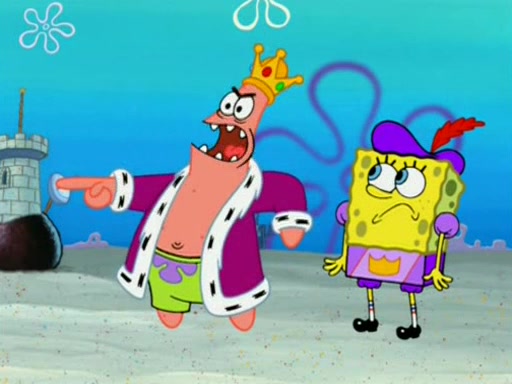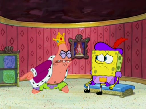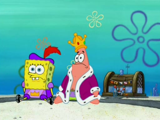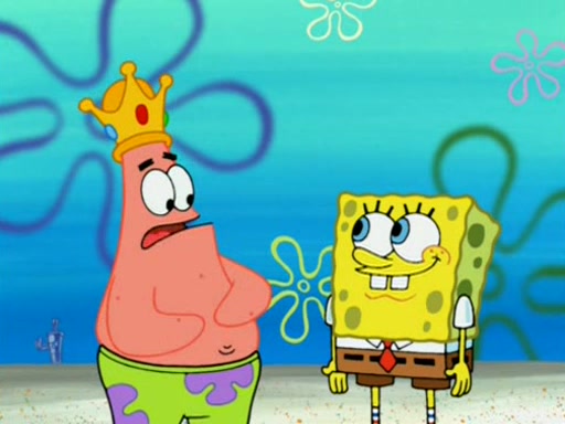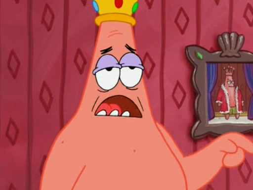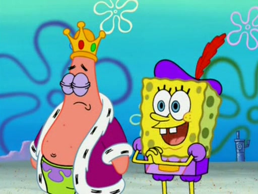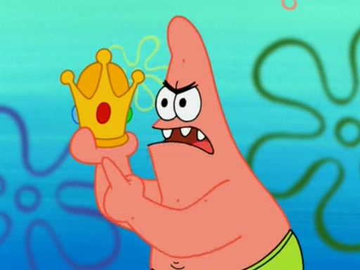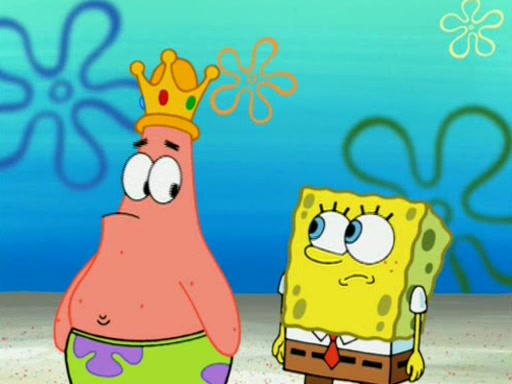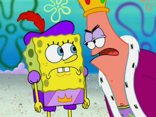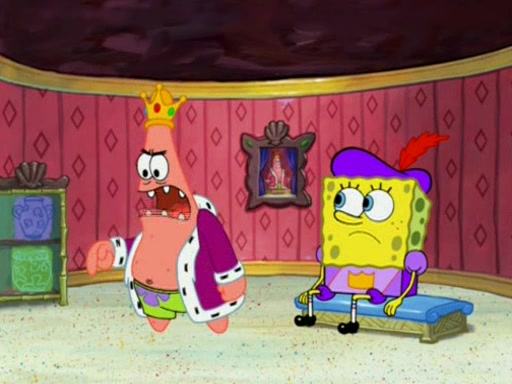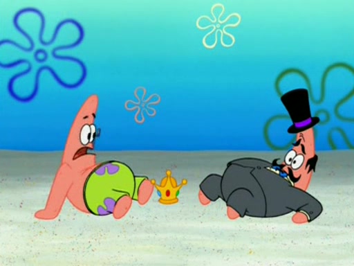 A starfish from the Royal Ministry comes to visit Patrick for a delivery. After Patrick opens his rock, he thinks the starfish is a librarian and has come for his overdue library books. Patrick runs to SpongeBob's house and cries about it. SpongeBob covers for Patrick by coming up to the man and greeting him. The starfish then asks SpongeBob if he knows Patrick, but SpongeBob lies and says: "No, I do not know any starfish!" in surprise and shock. When the starfish announces he has a gift for Patrick, which is a crown; Patrick dashes out of SpongeBob's house and grabs his gift. He starts chewing it and licking it, and announces it's a terrible-tasting gift. The starfish explains it's an item to wear, not to eat. Patrick is pleased when he gets the shiny crown. The starfish explains that he had uncovered a family tree showing Patrick to be descended from a king thus making him an official king.