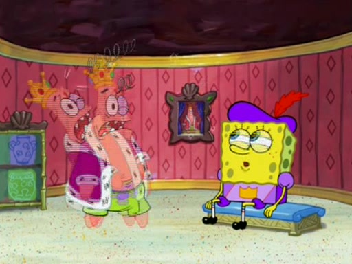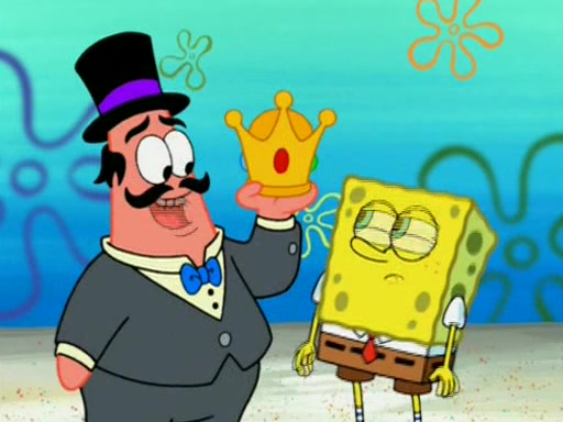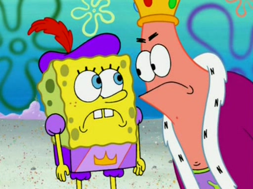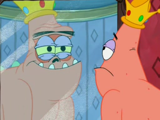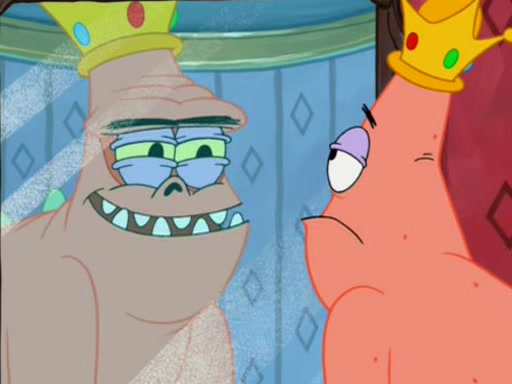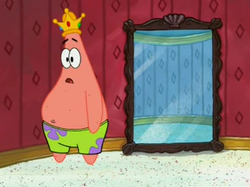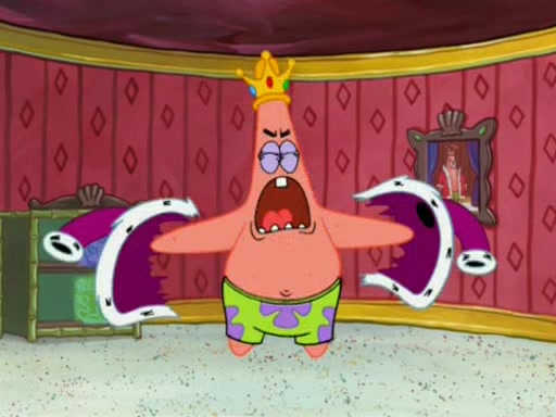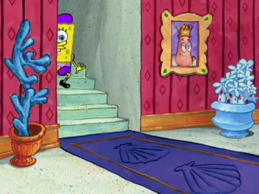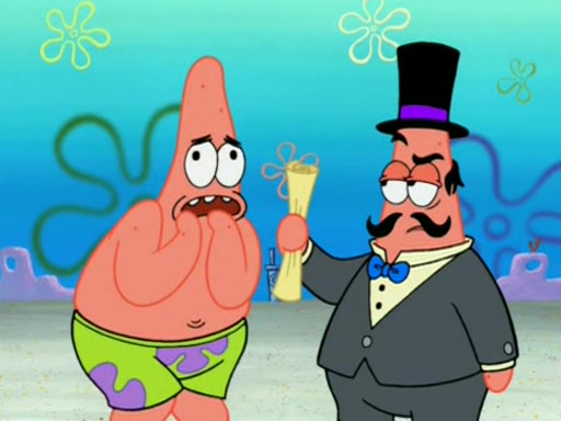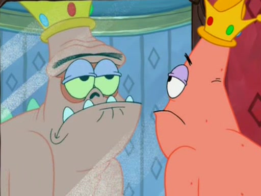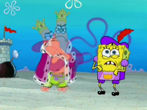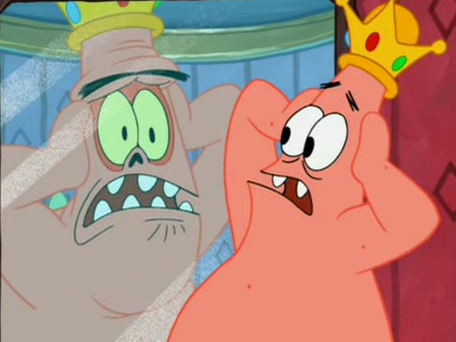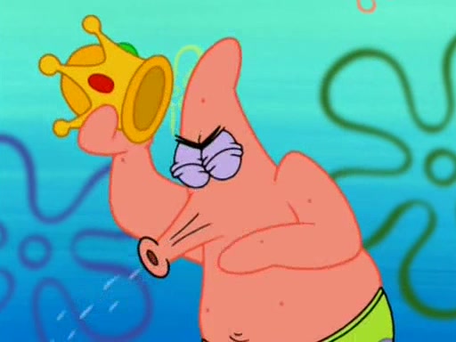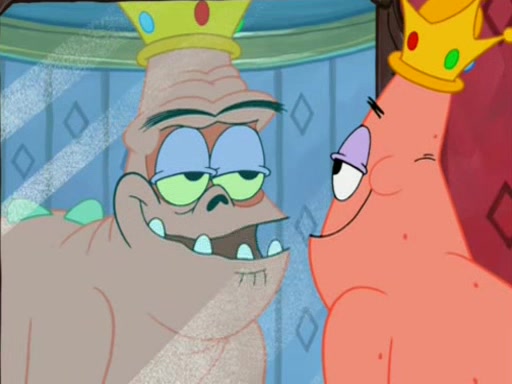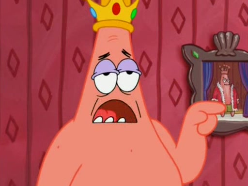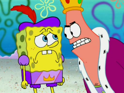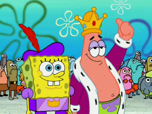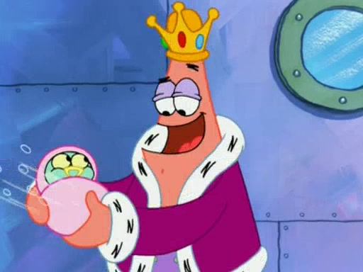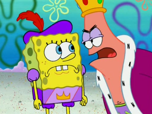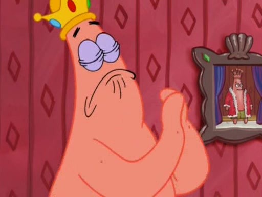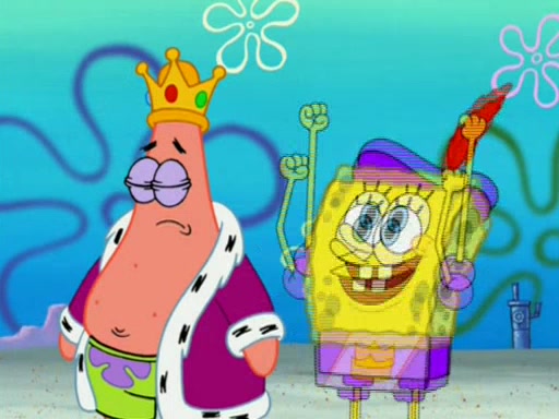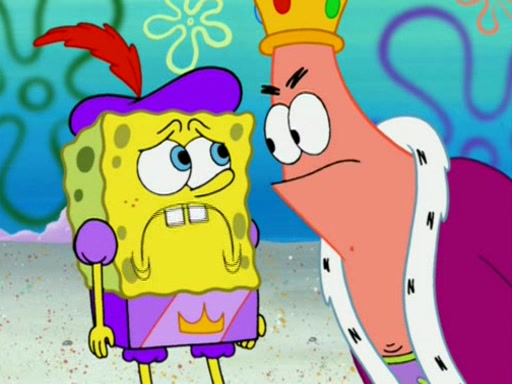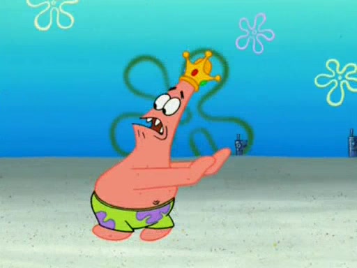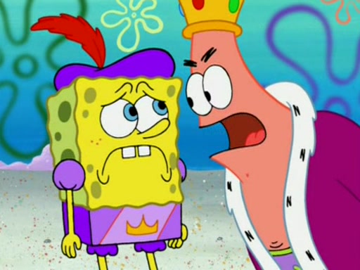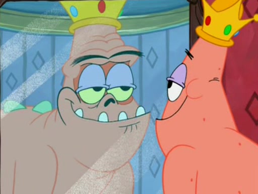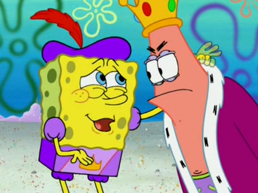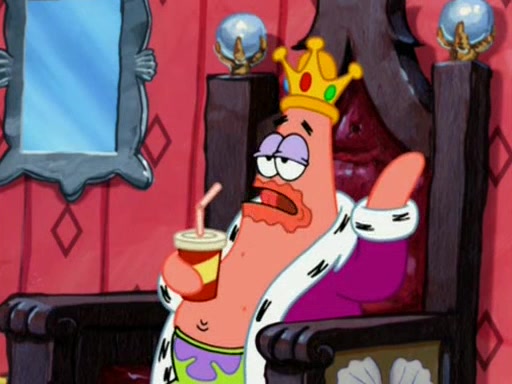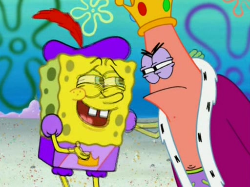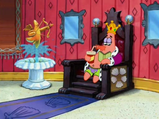 A starfish from the Royal Ministry comes to visit Patrick for a delivery. After Patrick opens his rock, he thinks the starfish is a librarian and has come for his overdue library books. Patrick runs to SpongeBob's house and cries about it. SpongeBob covers for Patrick by coming up to the man and greeting him. The starfish then asks SpongeBob if he knows Patrick, but SpongeBob lies and says: "No, I do not know any starfish!" in surprise and shock. When the starfish announces he has a gift for Patrick, which is a crown; Patrick dashes out of SpongeBob's house and grabs his gift. He starts chewing it and licking it, and announces it's a terrible-tasting gift. The starfish explains it's an item to wear, not to eat. Patrick is pleased when he gets the shiny crown. The starfish explains that he had uncovered a family tree showing Patrick to be descended from a king thus making him an official king.