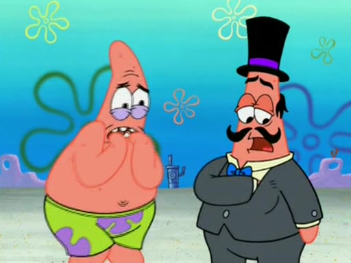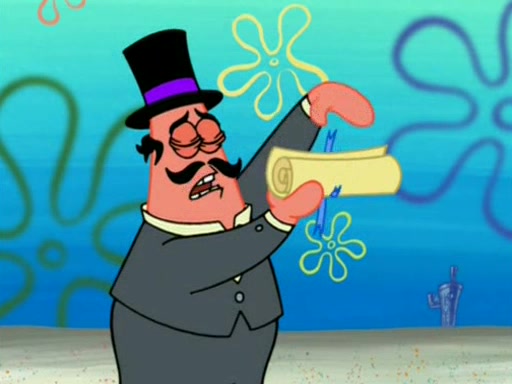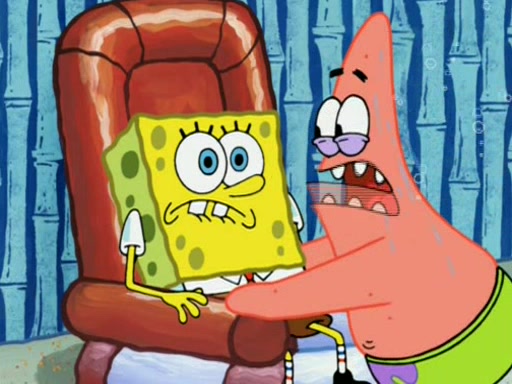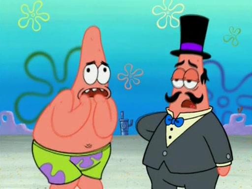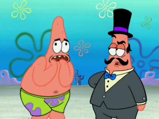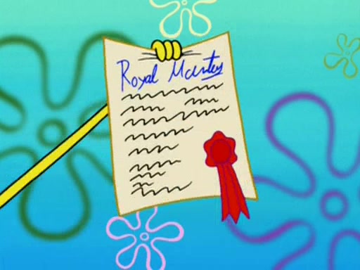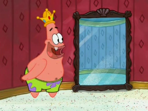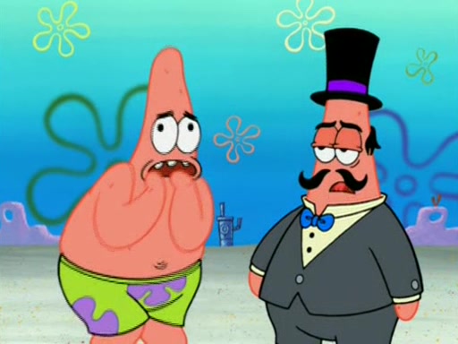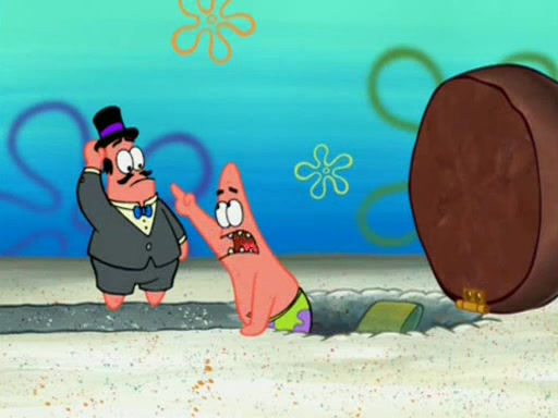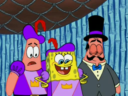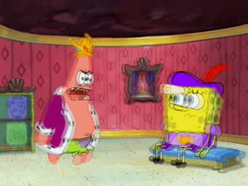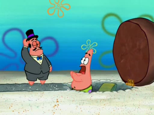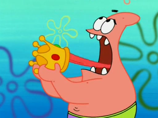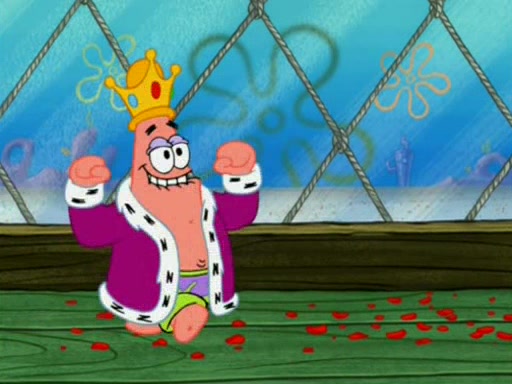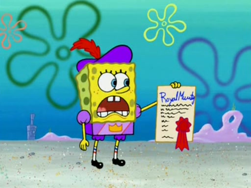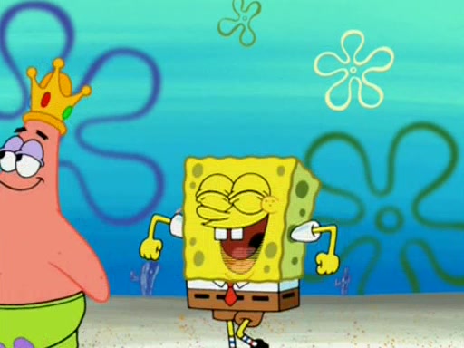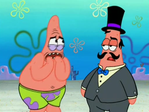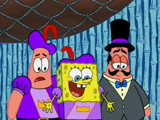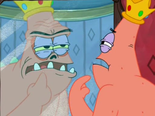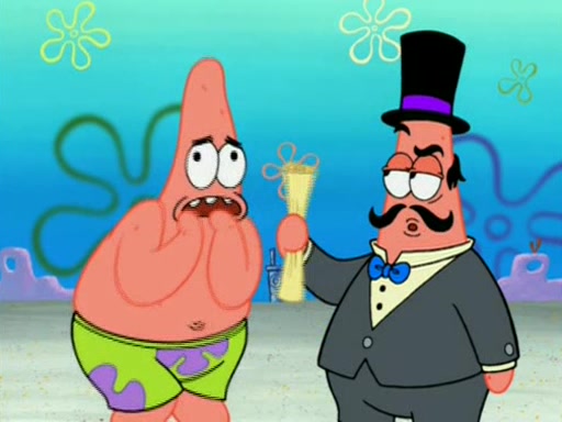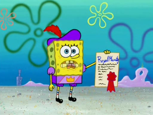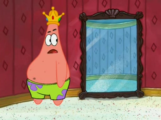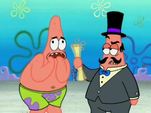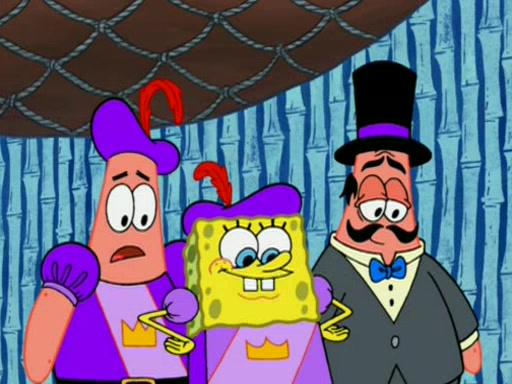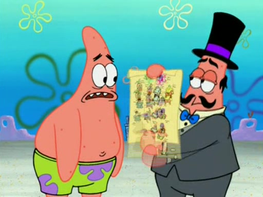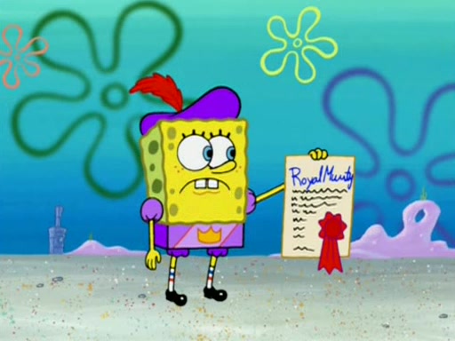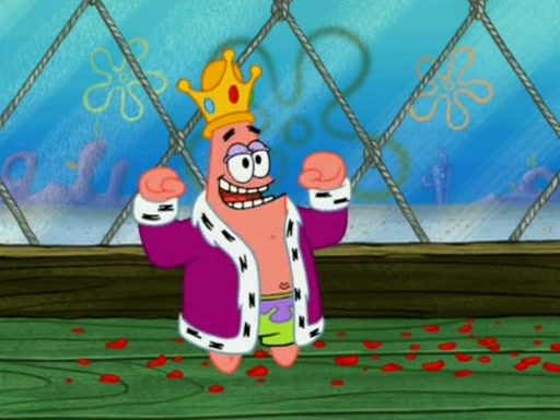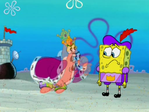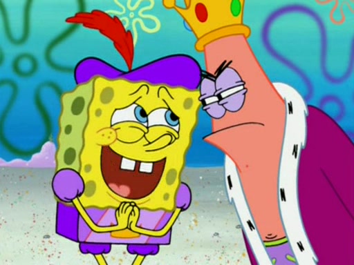 A starfish from the Royal Ministry comes to visit Patrick for a delivery. After Patrick opens his rock, he thinks the starfish is a librarian and has come for his overdue library books. Patrick runs to SpongeBob's house and cries about it. SpongeBob covers for Patrick by coming up to the man and greeting him. The starfish then asks SpongeBob if he knows Patrick, but SpongeBob lies and says: "No, I do not know any starfish!" in surprise and shock. When the starfish announces he has a gift for Patrick, which is a crown; Patrick dashes out of SpongeBob's house and grabs his gift. He starts chewing it and licking it, and announces it's a terrible-tasting gift. The starfish explains it's an item to wear, not to eat. Patrick is pleased when he gets the shiny crown. The starfish explains that he had uncovered a family tree showing Patrick to be descended from a king thus making him an official king.
