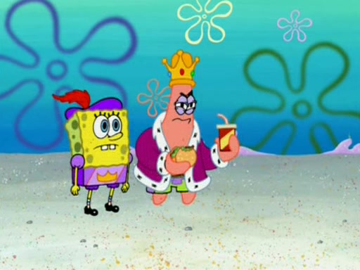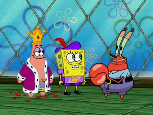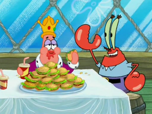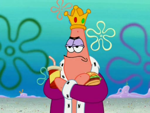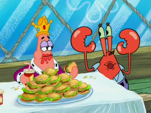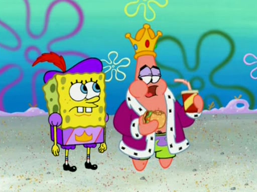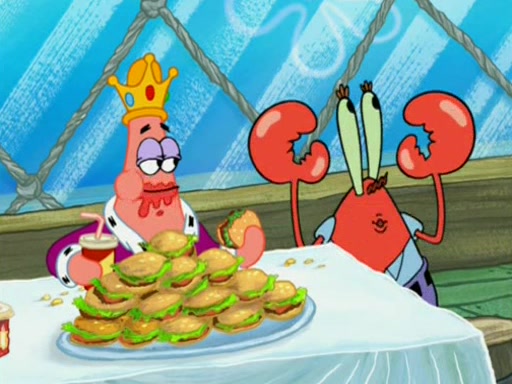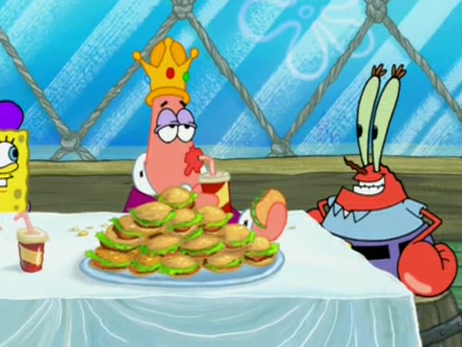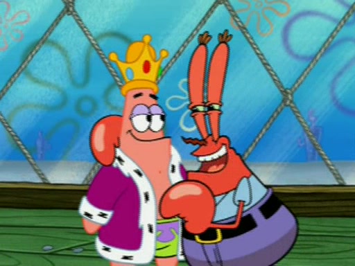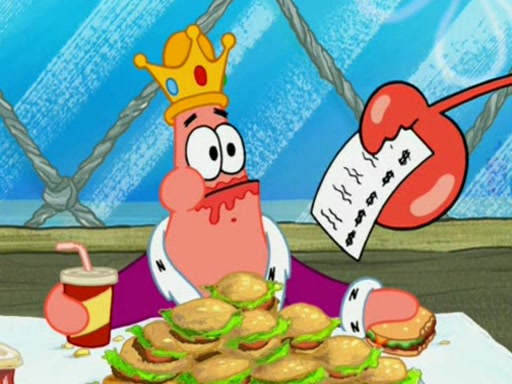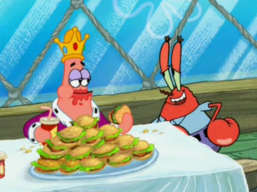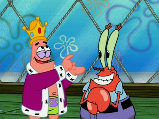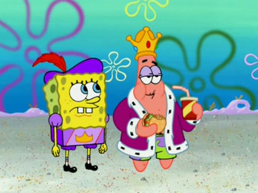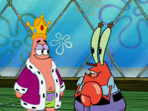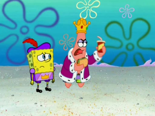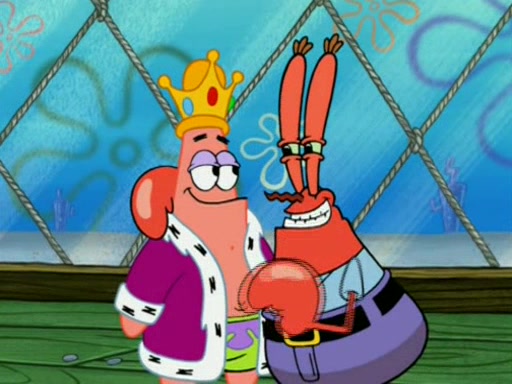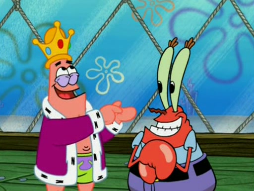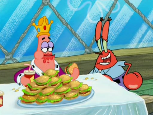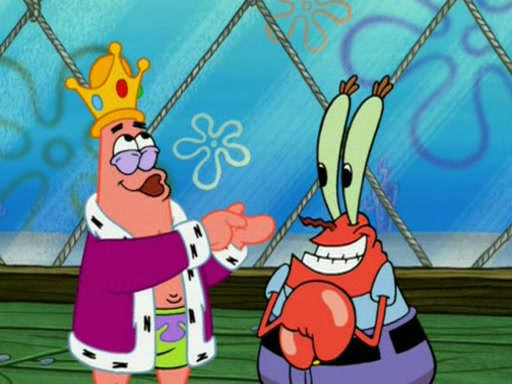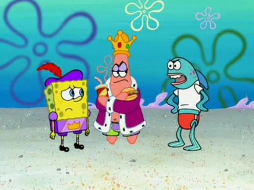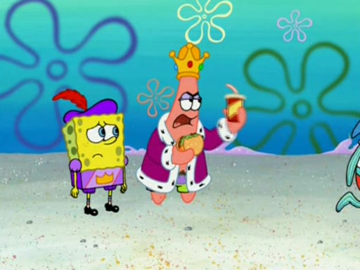SpongeBob becomes Patrick's servant and shows a treaty to the other Bikini Bottomites whenever Patrick takes something from them. SpongeBob assists Patrick firstly by going to the Krusty Krab and ordering for Patrick when Mr. Krabs looks at Patrick in shock and comes to him in a happy way. But SpongeBob is thrown away by Mr. Krabs and Patrick orders for himself with 10 Krabby Patties, a large fries, and a shake; Mr. Krabs lays out a buffet for him on the table consisting plates of Krabby Patties, a dozen shakes, and fries. Soon, Patrick requests for more ketchup, but Mr. Krabs tells him to pay a bill instead. Patrick then states that he has no money and anything he gets is free. Mr. Krabs gets upset at this and kicks both SpongeBob & Patrick out of the restaurant and screams out the front door, "Nobody eats at me restaurant for free, king or no king!," and closes the doors. He then finds a fish with a Krabby Patty and a shake and asks if he was going to eat it, and when the blue fish says he was planning to, Patrick takes it. Then a nerdy fish, Horace, comes up with a comic book collection, and becomes overjoyed at it especially at one of the comics "Wonder Space Fish," and states his 40-year old life and his comic book collection are complete, but he bumps into Patrick and Patrick takes the comic books, and Horace (who worked his whole life on the comic book collection) becomes sad. When the nerd begins to cry, Patrick laughs viciously, and he exclaims happily that he loves being a king.