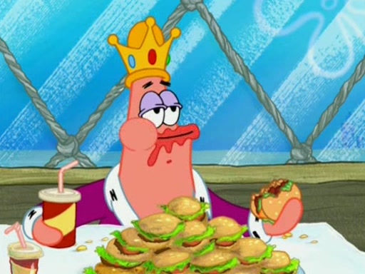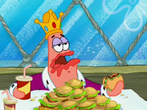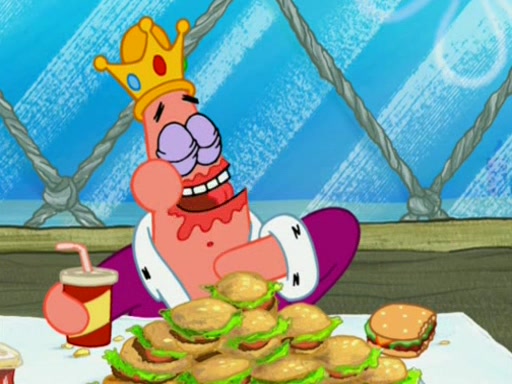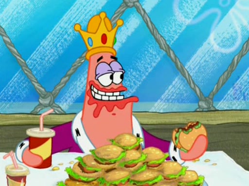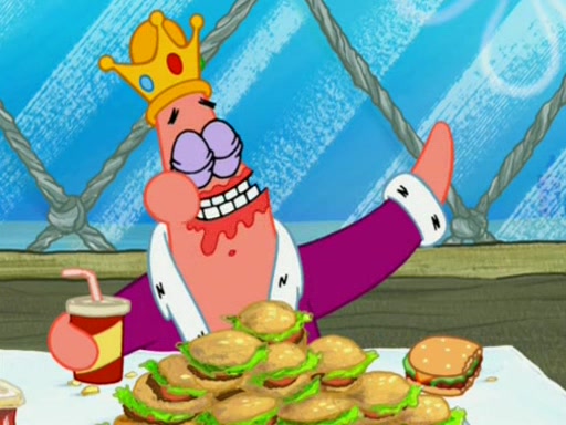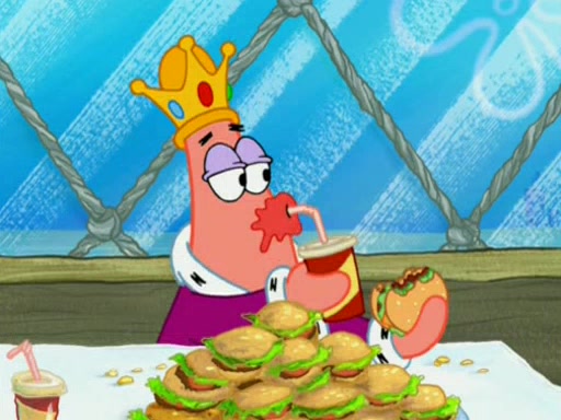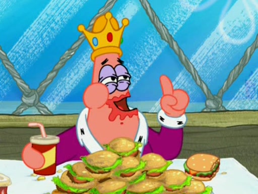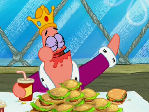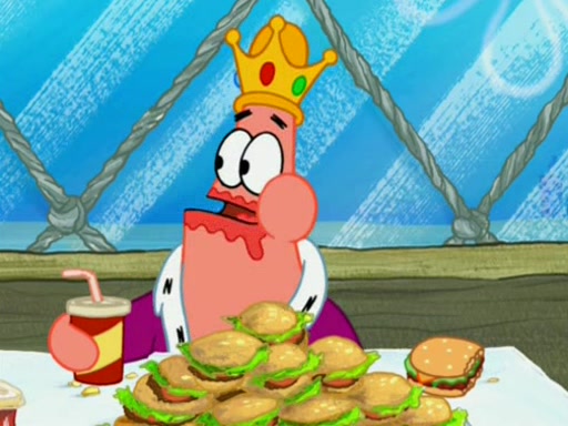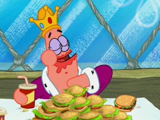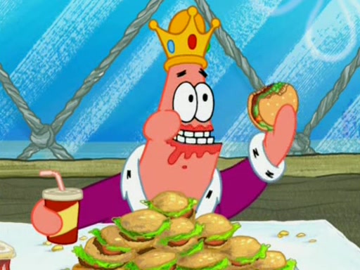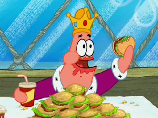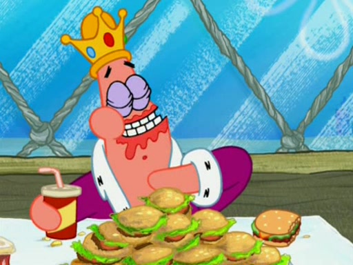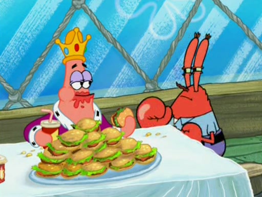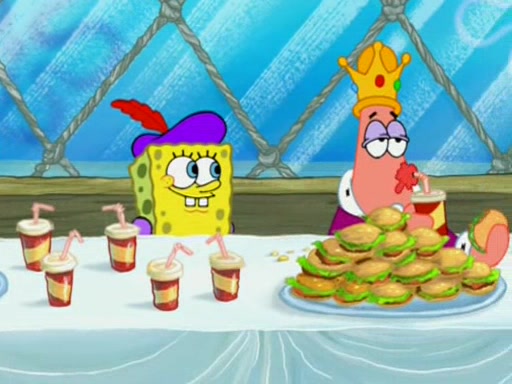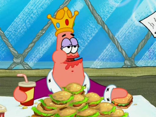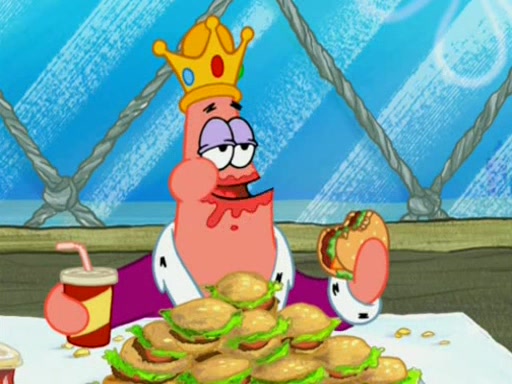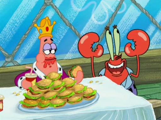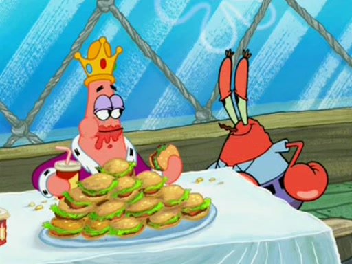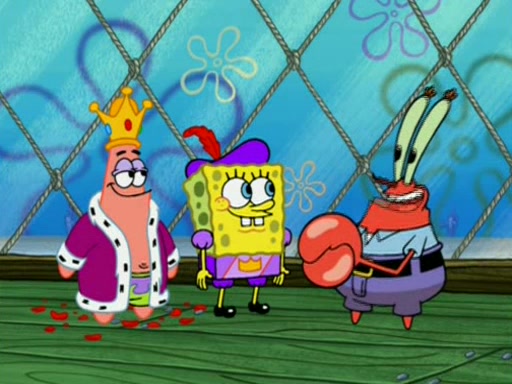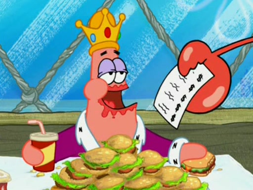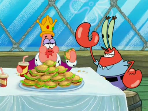 SpongeBob becomes Patrick's servant and shows a treaty to the other Bikini Bottomites whenever Patrick takes something from them. SpongeBob assists Patrick firstly by going to the Krusty Krab and ordering for Patrick when Mr. Krabs looks at Patrick in shock and comes to him in a happy way. But SpongeBob is thrown away by Mr. Krabs and Patrick orders for himself with 10 Krabby Patties, a large fries, and a shake; Mr. Krabs lays out a buffet for him on the table consisting plates of Krabby Patties, a dozen shakes, and fries. Soon, Patrick requests for more ketchup, but Mr. Krabs tells him to pay a bill instead. Patrick then states that he has no money and anything he gets is free. Mr. Krabs gets upset at this and kicks both SpongeBob & Patrick out of the restaurant and screams out the front door, "Nobody eats at me restaurant for free, king or no king!," and closes the doors. He then finds a fish with a Krabby Patty and a shake and asks if he was going to eat it, and when the blue fish says he was planning to, Patrick takes it. Then a nerdy fish, Horace, comes up with a comic book collection, and becomes overjoyed at it especially at one of the comics "Wonder Space Fish," and states his 40-year old life and his comic book collection are complete, but he bumps into Patrick and Patrick takes the comic books, and Horace (who worked his whole life on the comic book collection) becomes sad. When the nerd begins to cry, Patrick laughs viciously, and he exclaims happily that he loves being a king.