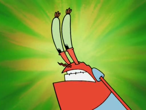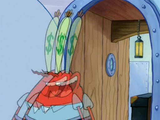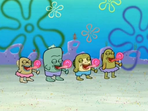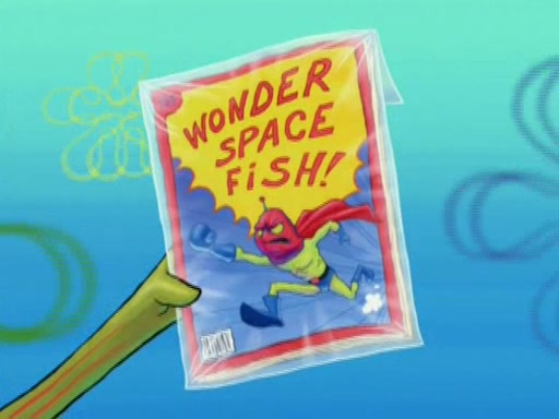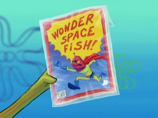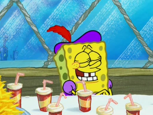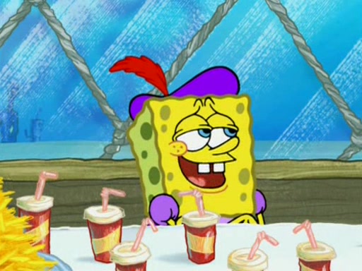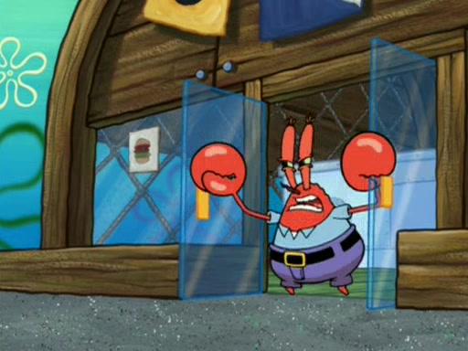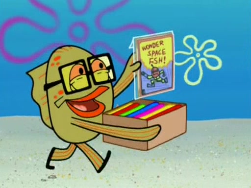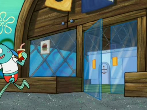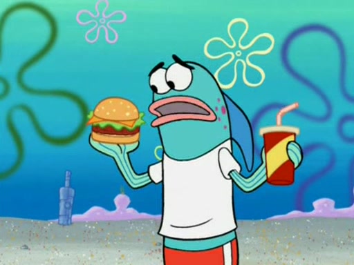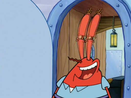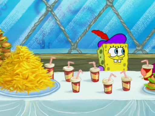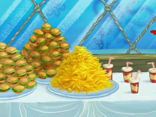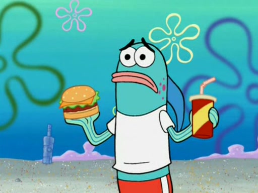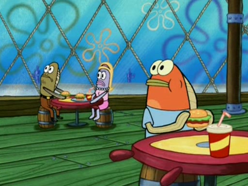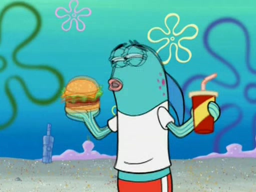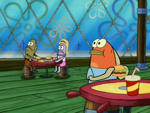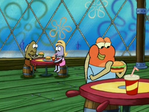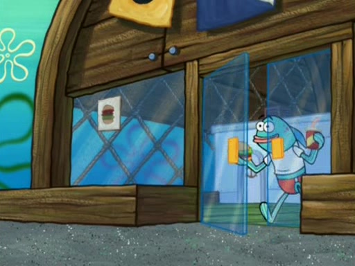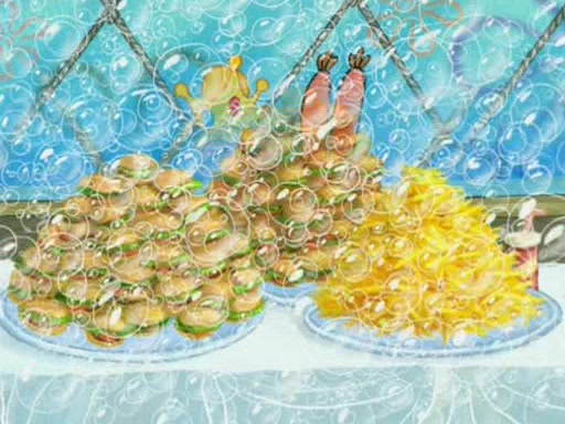 SpongeBob becomes Patrick's servant and shows a treaty to the other Bikini Bottomites whenever Patrick takes something from them. SpongeBob assists Patrick firstly by going to the Krusty Krab and ordering for Patrick when Mr. Krabs looks at Patrick in shock and comes to him in a happy way. But SpongeBob is thrown away by Mr. Krabs and Patrick orders for himself with 10 Krabby Patties, a large fries, and a shake; Mr. Krabs lays out a buffet for him on the table consisting plates of Krabby Patties, a dozen shakes, and fries. Soon, Patrick requests for more ketchup, but Mr. Krabs tells him to pay a bill instead. Patrick then states that he has no money and anything he gets is free. Mr. Krabs gets upset at this and kicks both SpongeBob & Patrick out of the restaurant and screams out the front door, "Nobody eats at me restaurant for free, king or no king!," and closes the doors. He then finds a fish with a Krabby Patty and a shake and asks if he was going to eat it, and when the blue fish says he was planning to, Patrick takes it. Then a nerdy fish, Horace, comes up with a comic book collection, and becomes overjoyed at it especially at one of the comics "Wonder Space Fish," and states his 40-year old life and his comic book collection are complete, but he bumps into Patrick and Patrick takes the comic books, and Horace (who worked his whole life on the comic book collection) becomes sad. When the nerd begins to cry, Patrick laughs viciously, and he exclaims happily that he loves being a king.