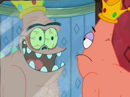 Patrick's insane and awful attitude inside his castle makes SpongeBob afraid of him, and he slowly walks away, saying he needs to go to the Krusty Krab for work. Realizing that his servant just left him, Patrick goes for a drink. On his way, Patrick looks at himself in the mirror and sees that he is literally turning into a monster. He gets frightened at this sight and goes back to the starfish who made him king. He gives the crown back to the Royal Ministry starfish and rechecks the paper of ancestors who was made to be king. After wiping a stain on the other side of Patrick's family he realizes that Gary is the one who really has struck royalty. SpongeBob and Patrick become servants and Gary gets the crown. The episode is finally ended with a happy and questioning "meow" from Gary.