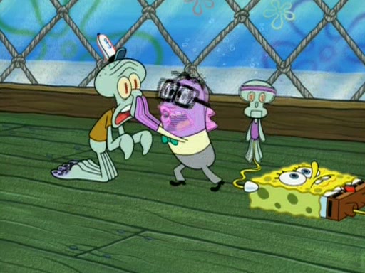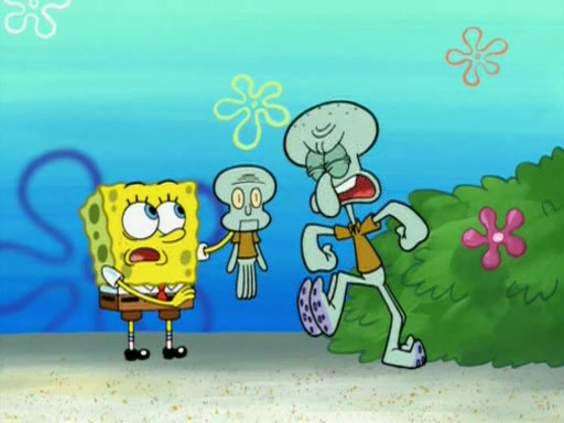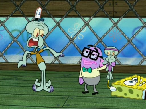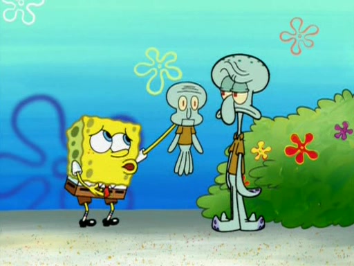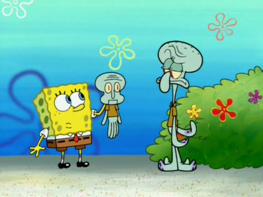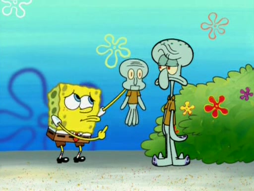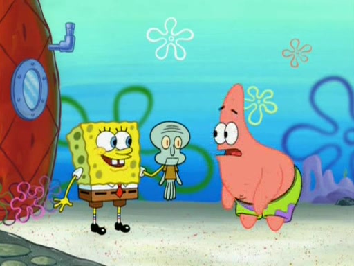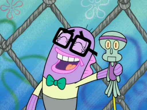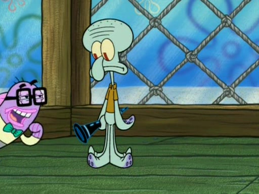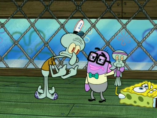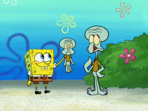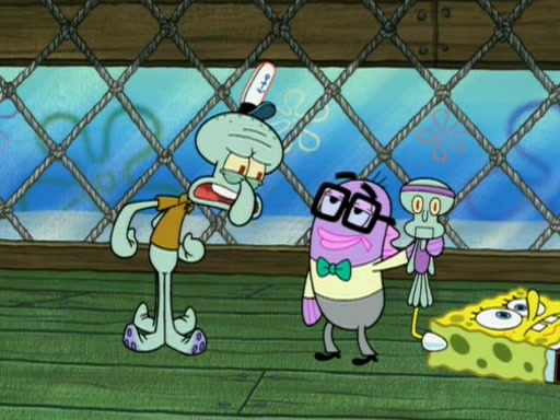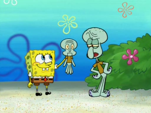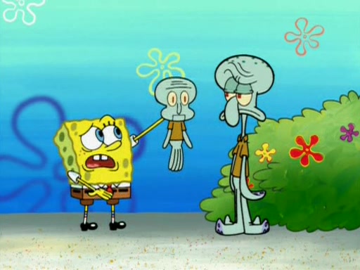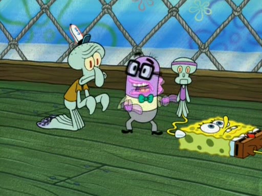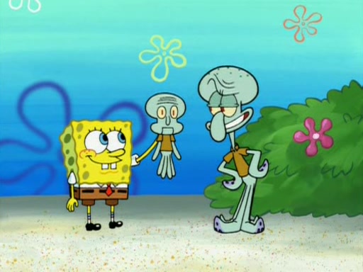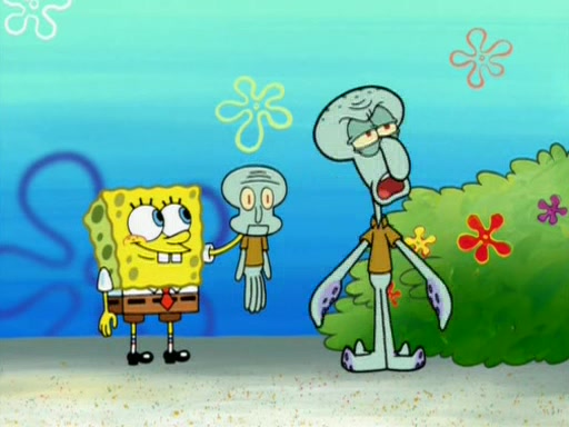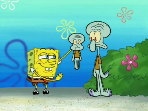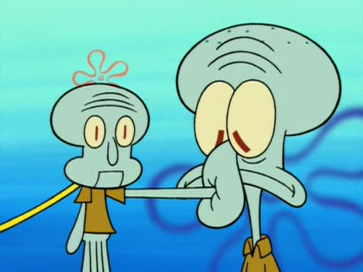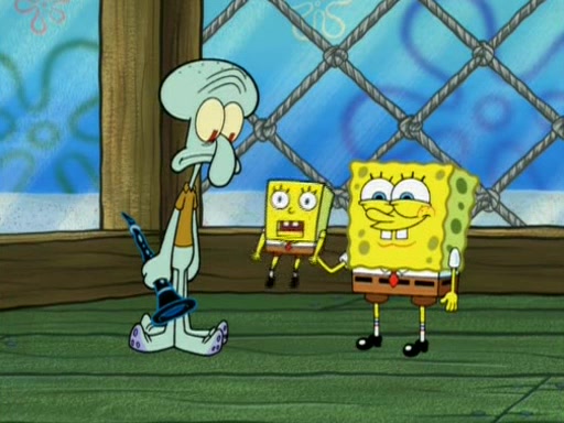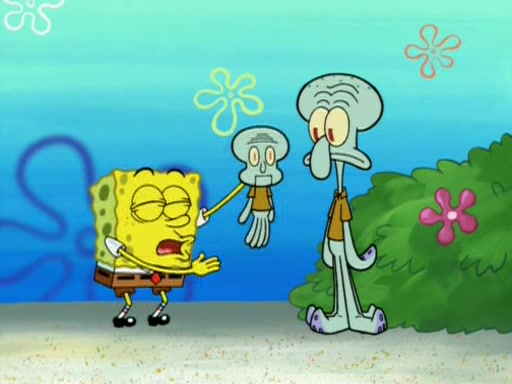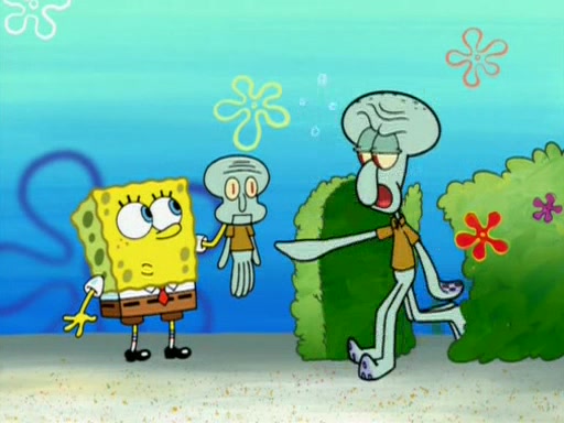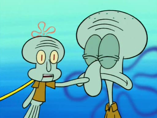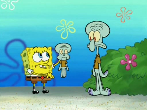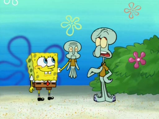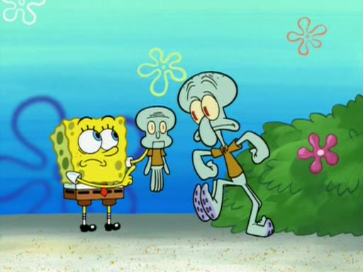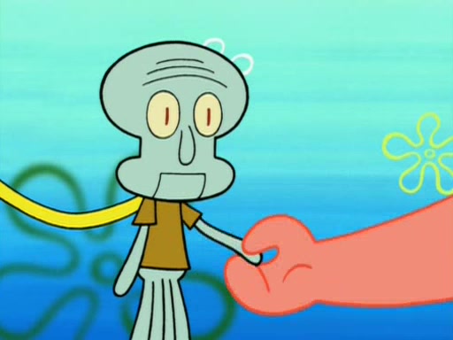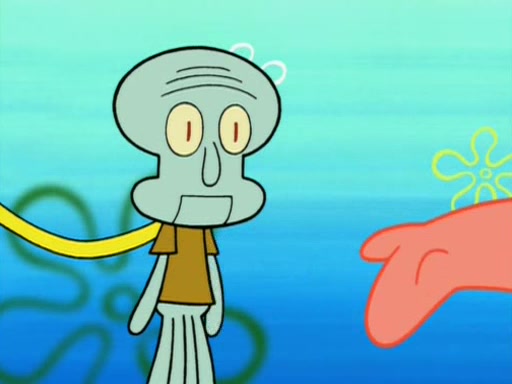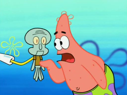 While SpongeBob and Mini Squid play Charades, Patrick walks by and thinks the Mini Squid is Squidward, and also thinks he's gotten smaller and shaved his beard, even though Squidward doesn't have a beard, confusing SpongeBob and Mini Squid.