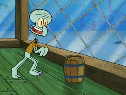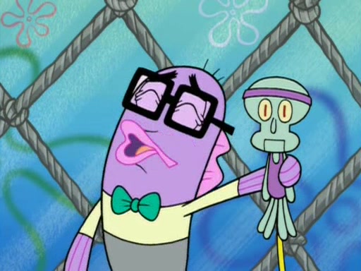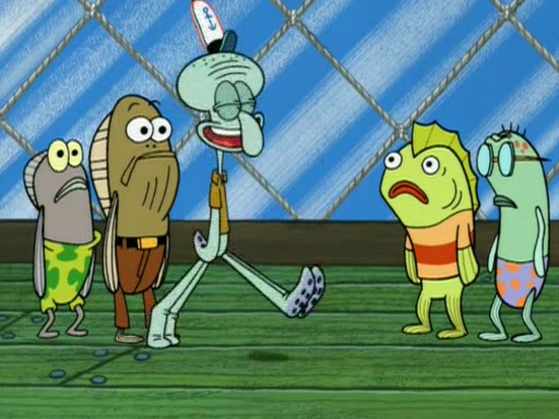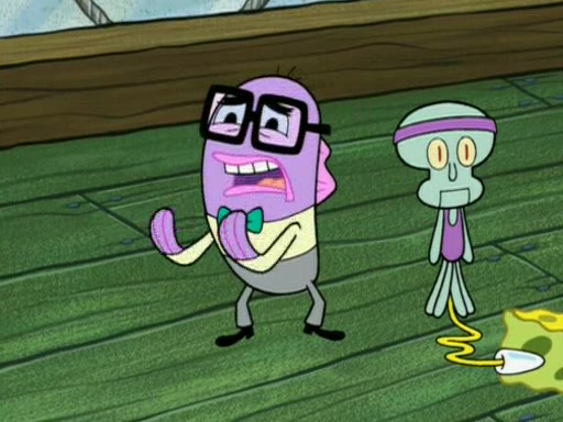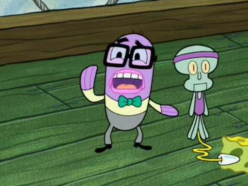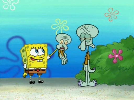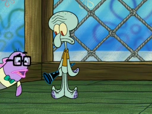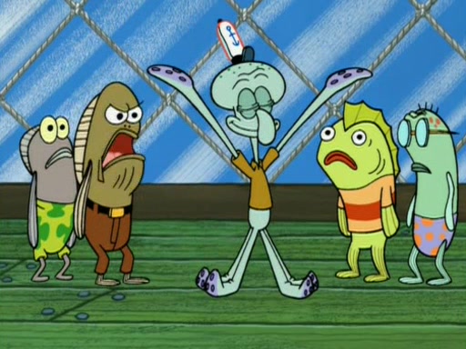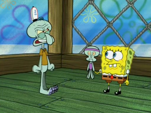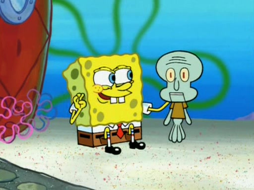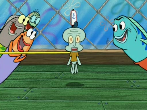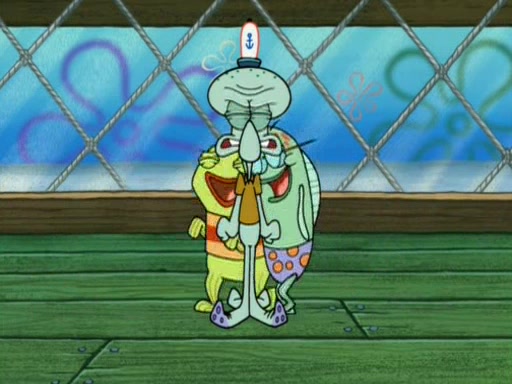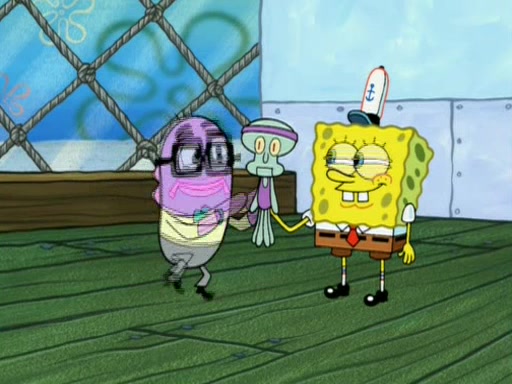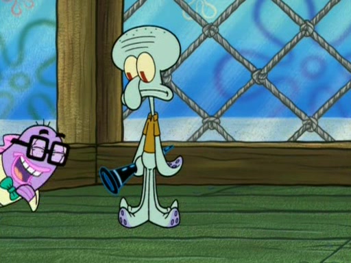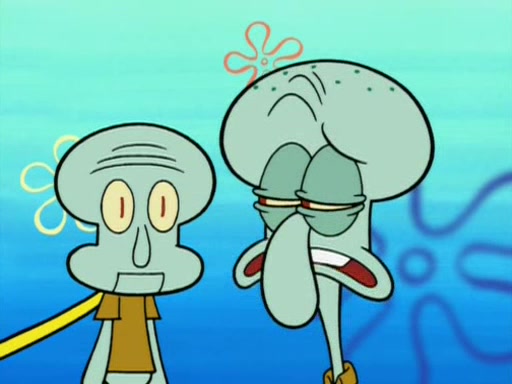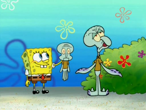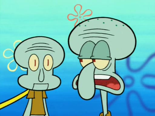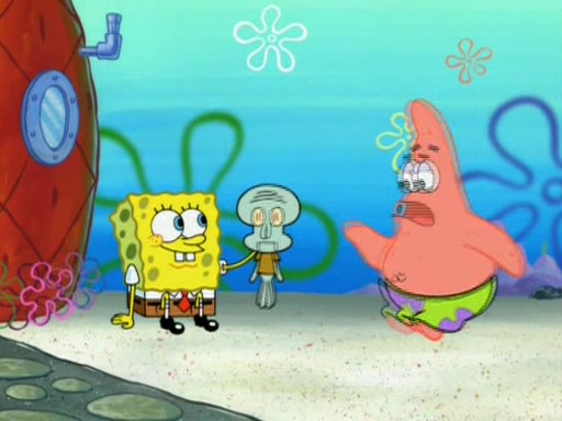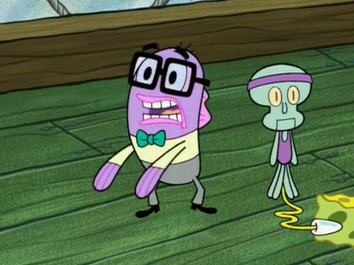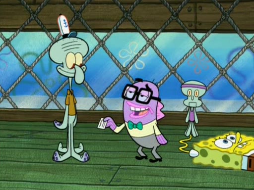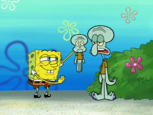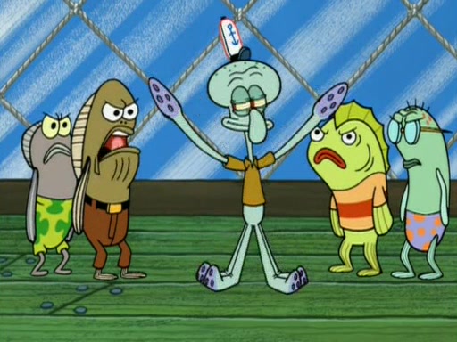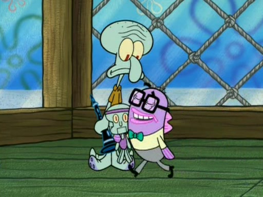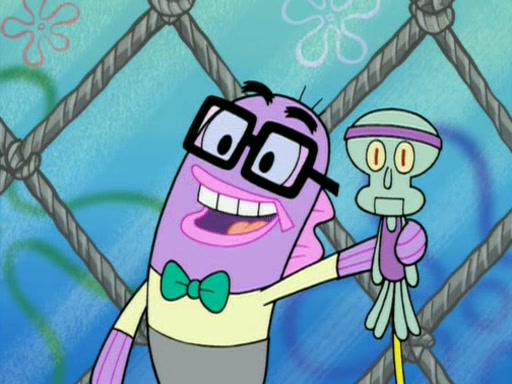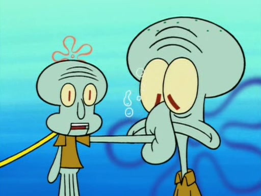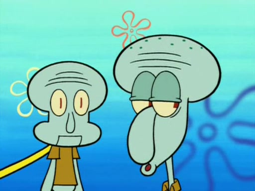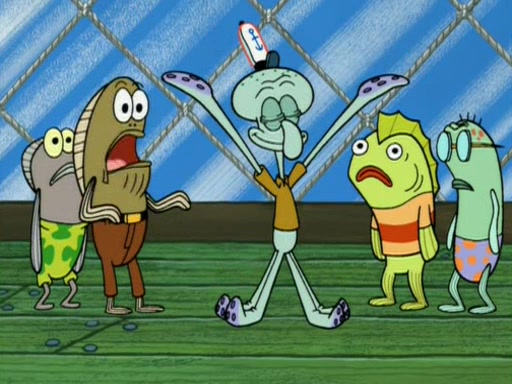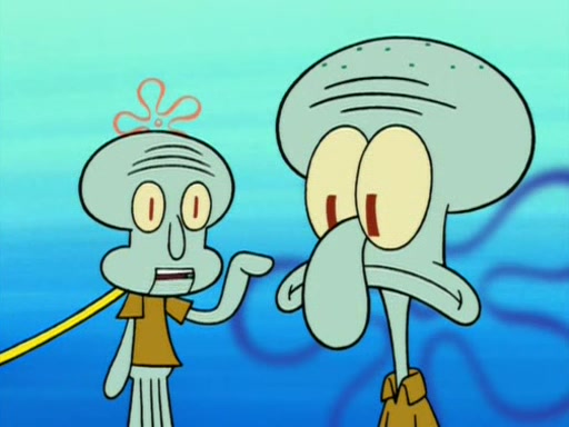 While SpongeBob and Mini Squid play Charades, Patrick walks by and thinks the Mini Squid is Squidward, and also thinks he's gotten smaller and shaved his beard, even though Squidward doesn't have a beard, confusing SpongeBob and Mini Squid.