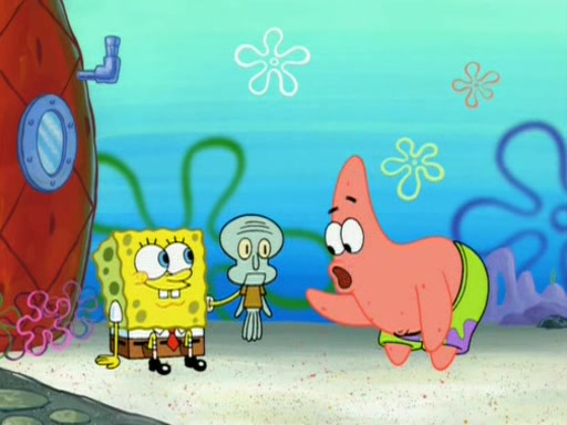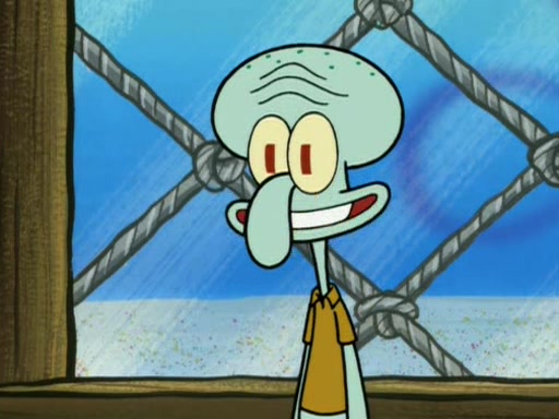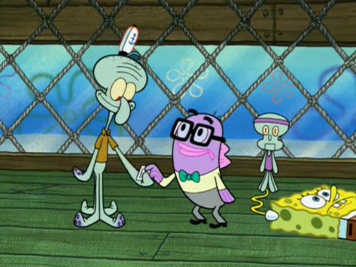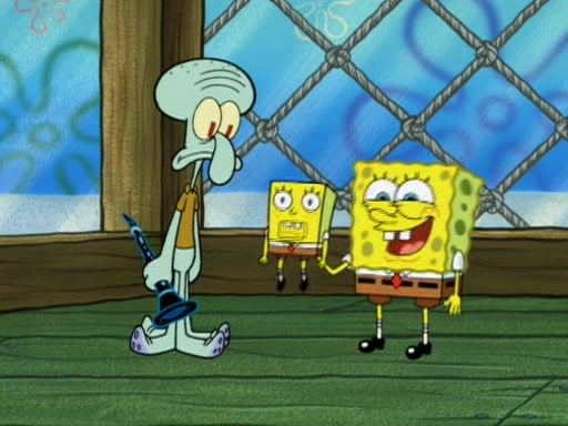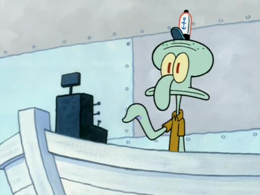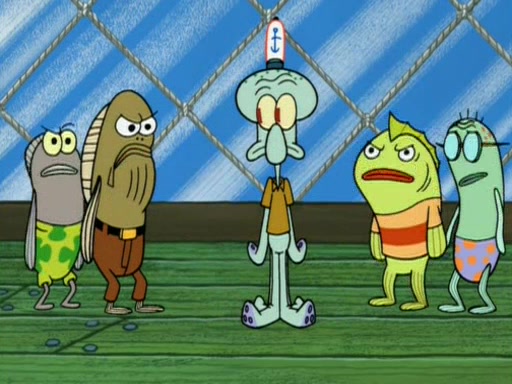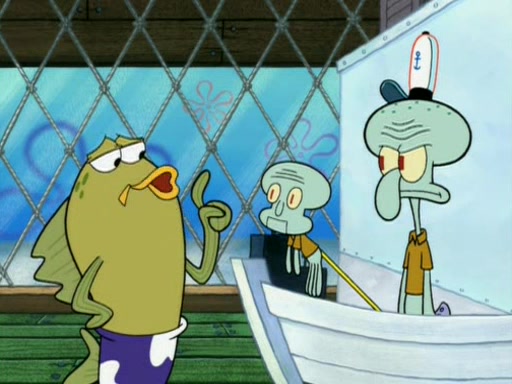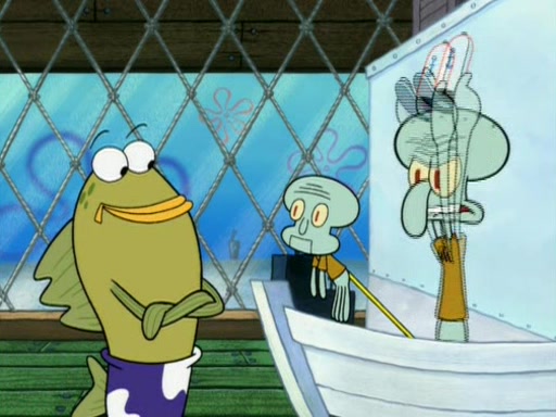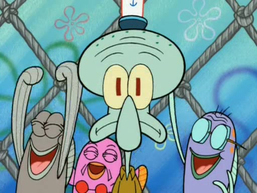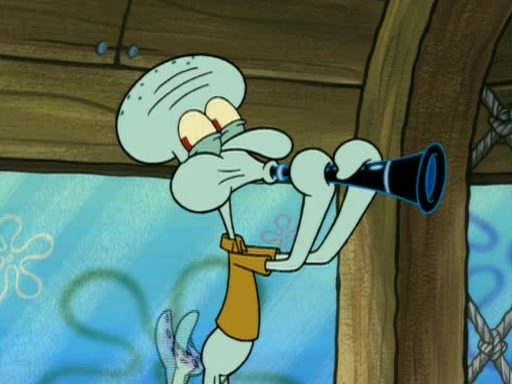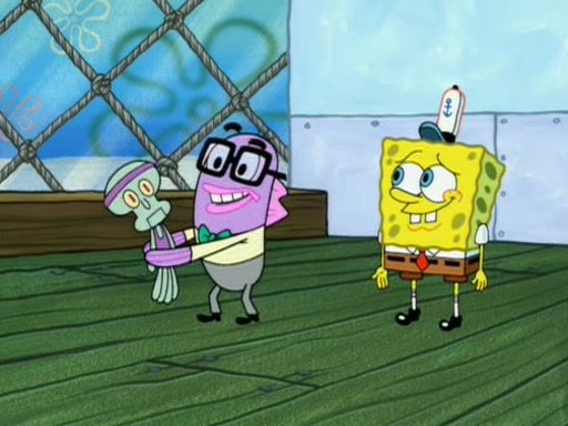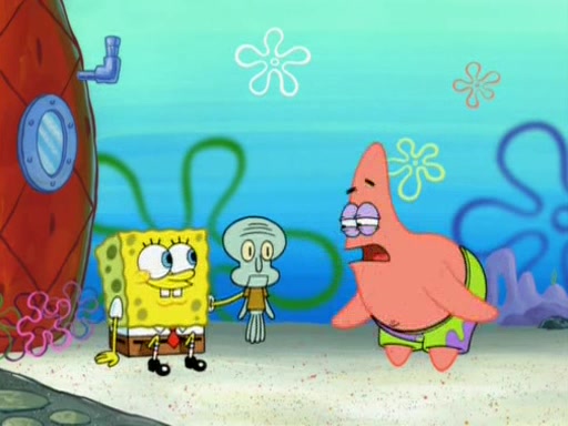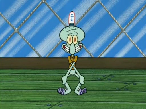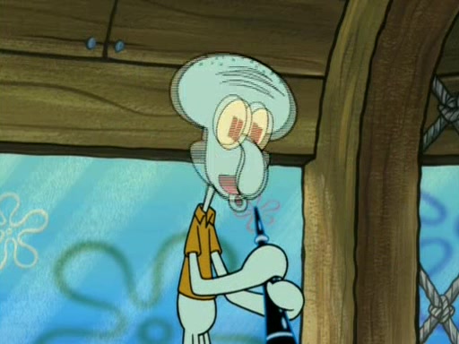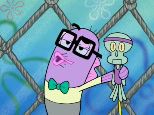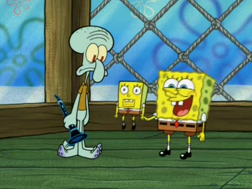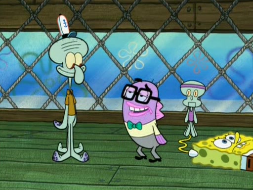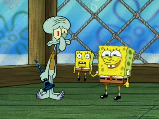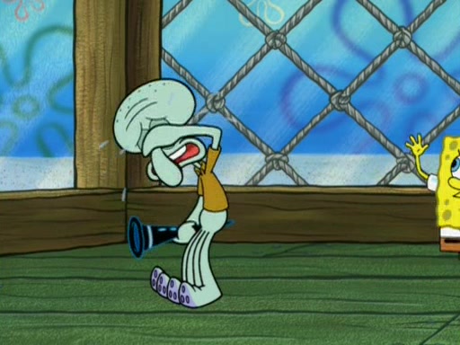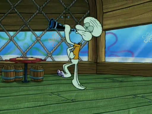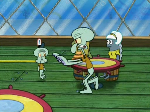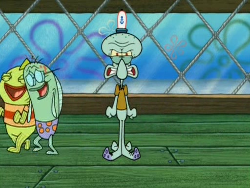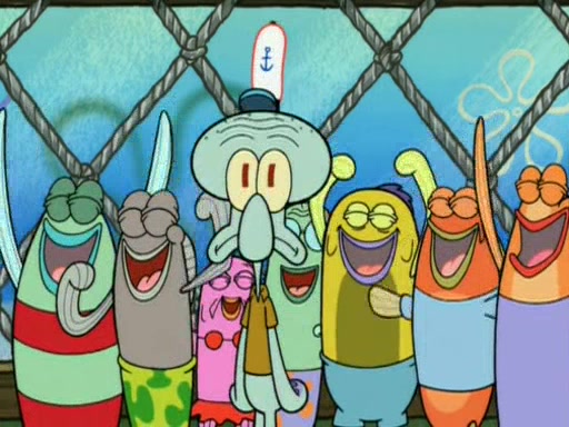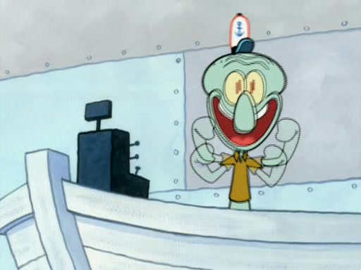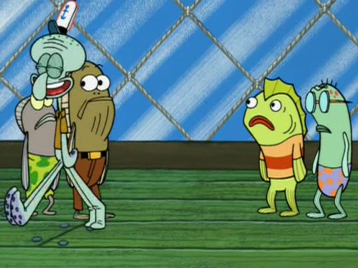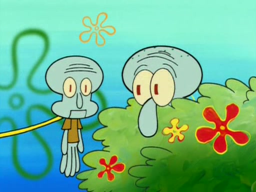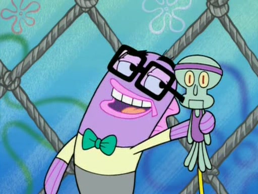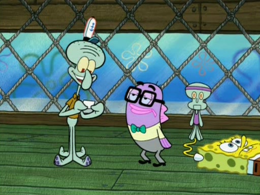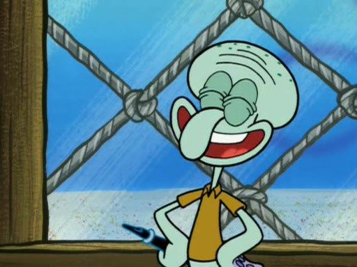 While SpongeBob and Mini Squid play Charades, Patrick walks by and thinks the Mini Squid is Squidward, and also thinks he's gotten smaller and shaved his beard, even though Squidward doesn't have a beard, confusing SpongeBob and Mini Squid.