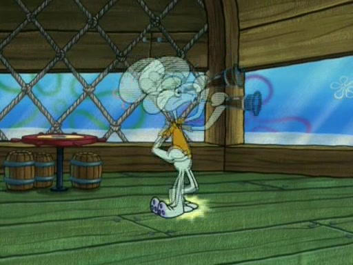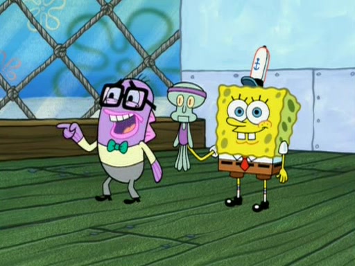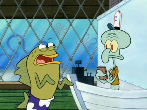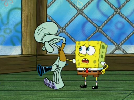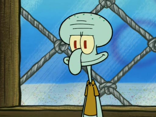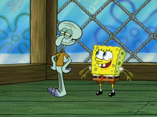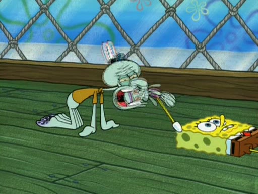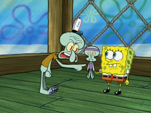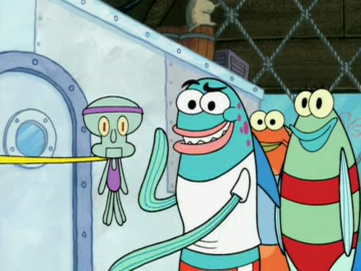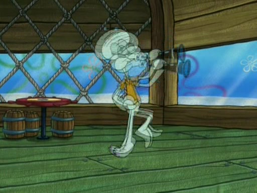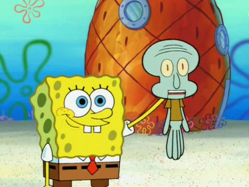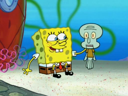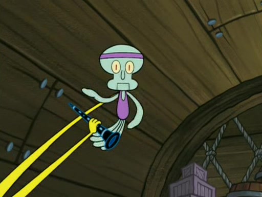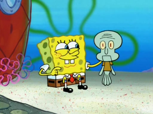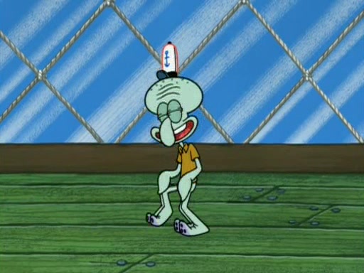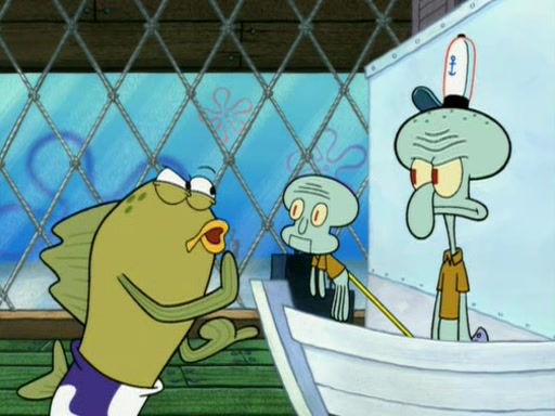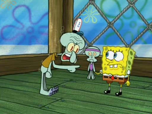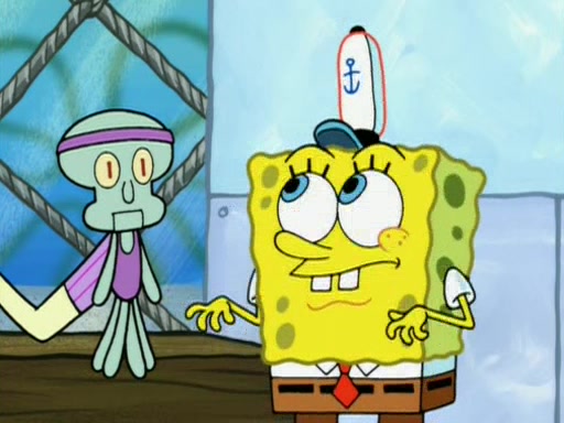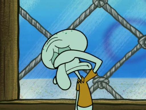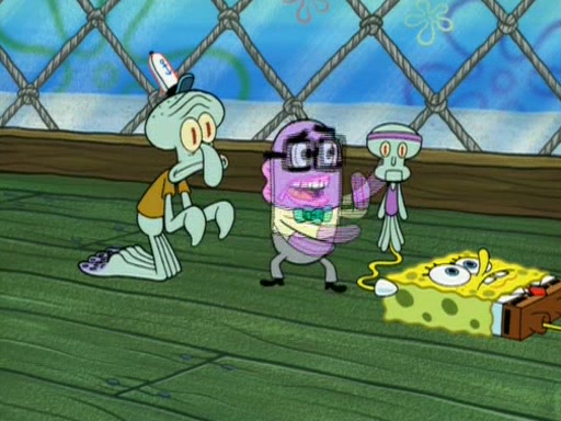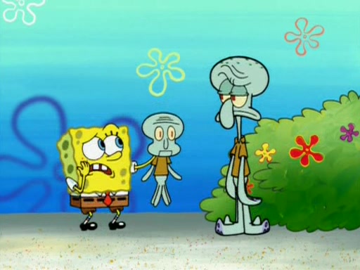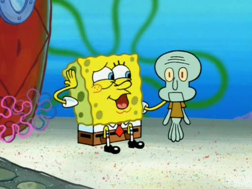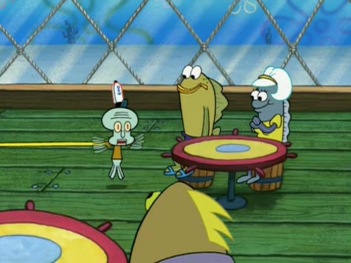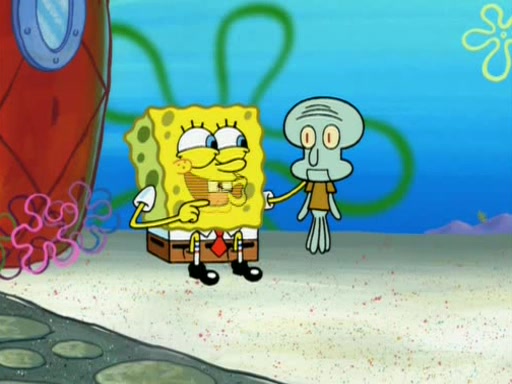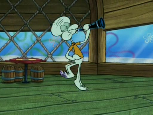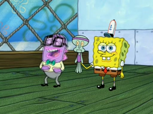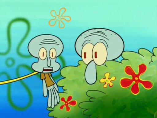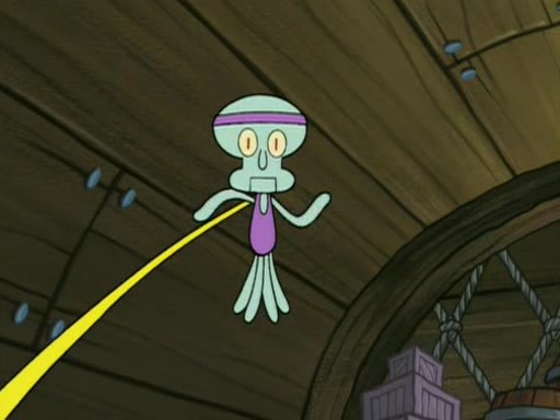 While SpongeBob and Mini Squid play Charades, Patrick walks by and thinks the Mini Squid is Squidward, and also thinks he's gotten smaller and shaved his beard, even though Squidward doesn't have a beard, confusing SpongeBob and Mini Squid.