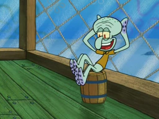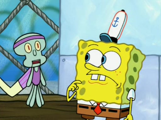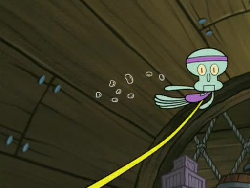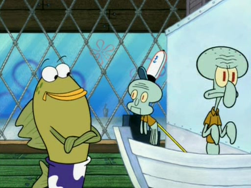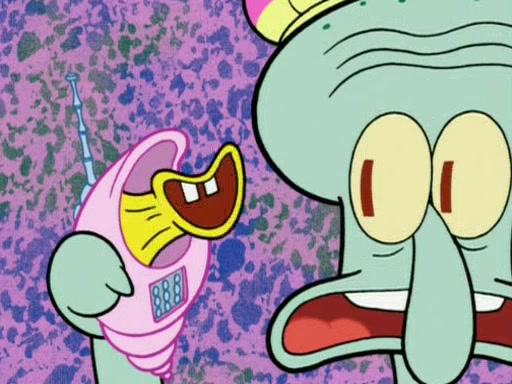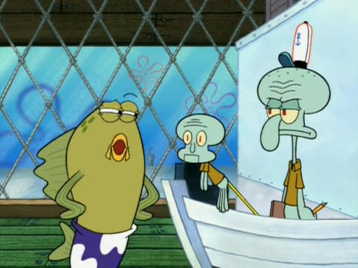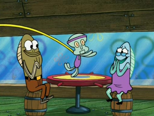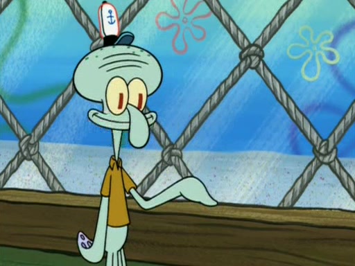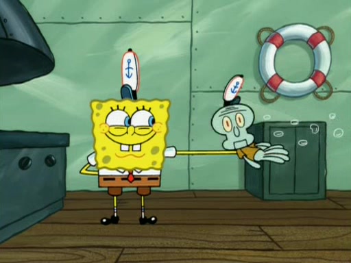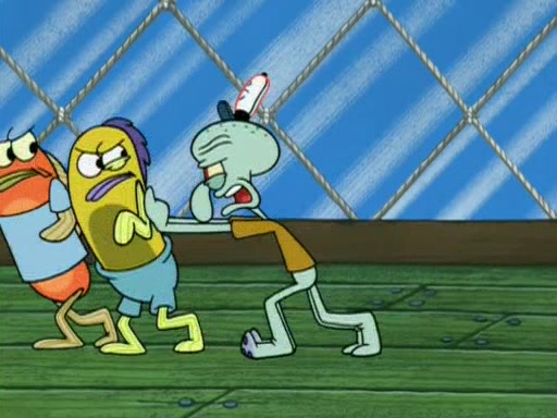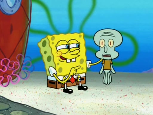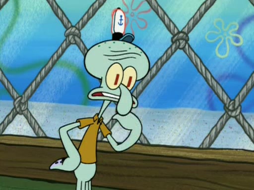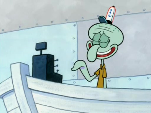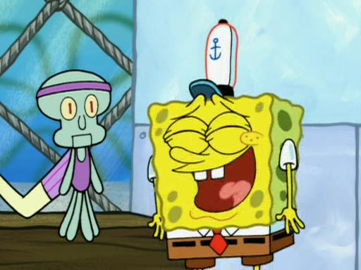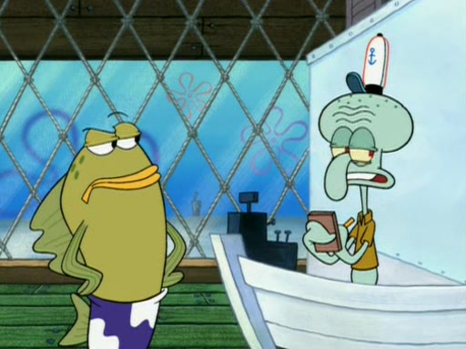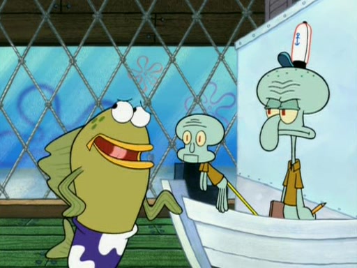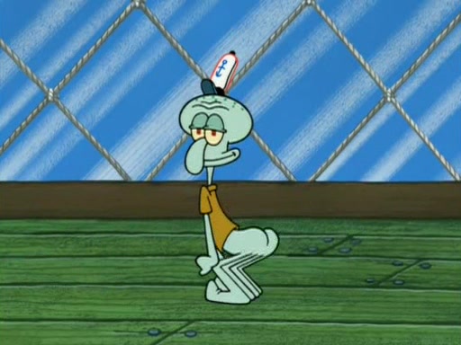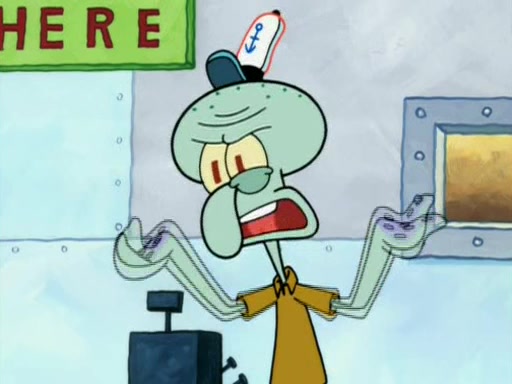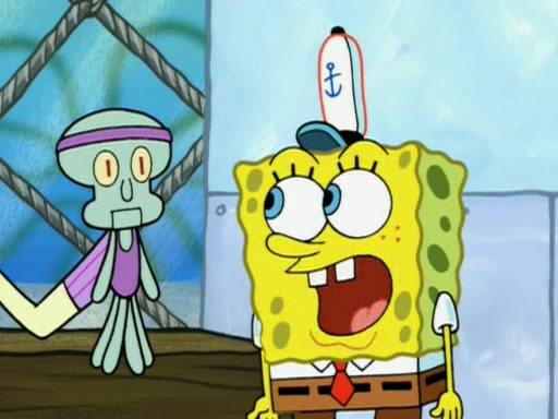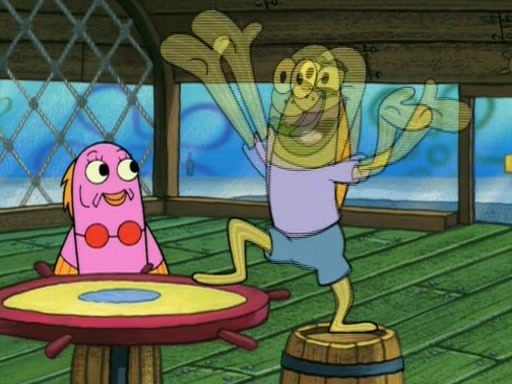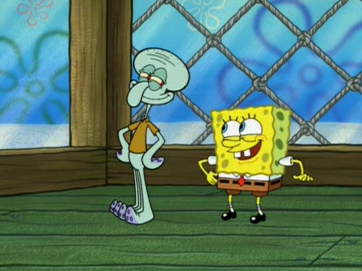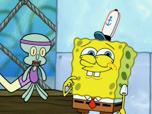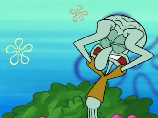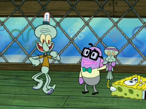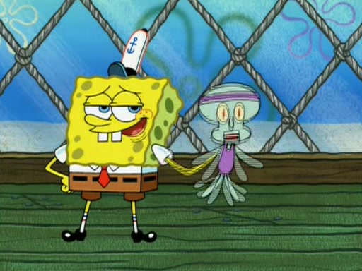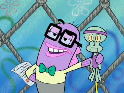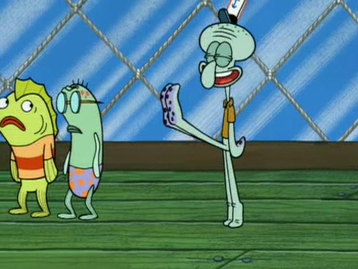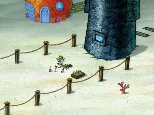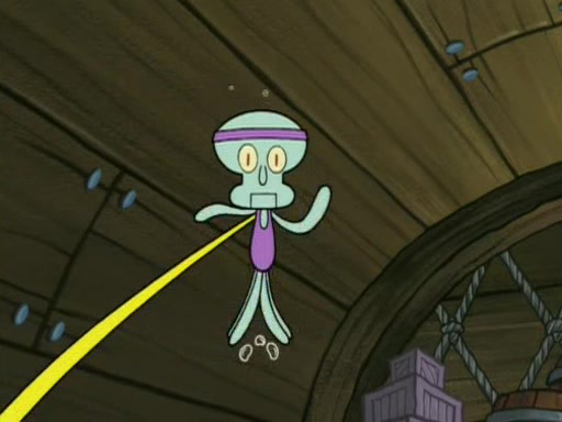 While SpongeBob and Mini Squid play Charades, Patrick walks by and thinks the Mini Squid is Squidward, and also thinks he's gotten smaller and shaved his beard, even though Squidward doesn't have a beard, confusing SpongeBob and Mini Squid.