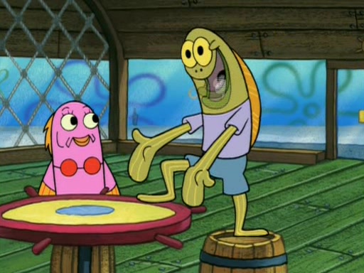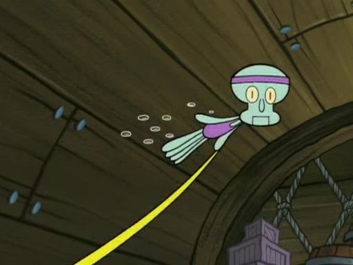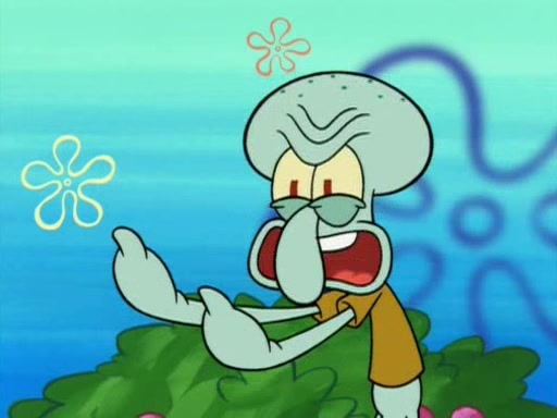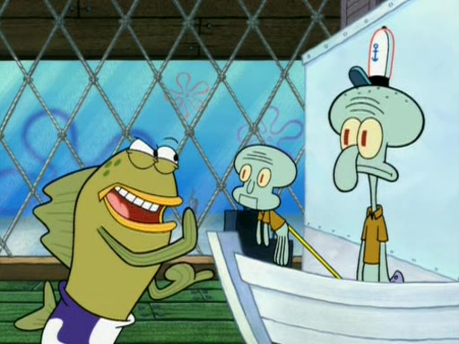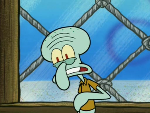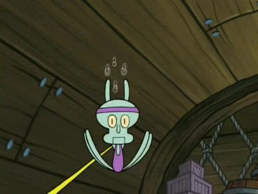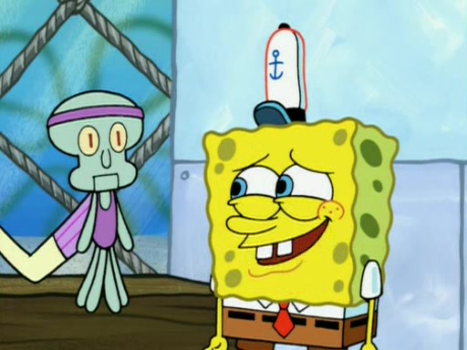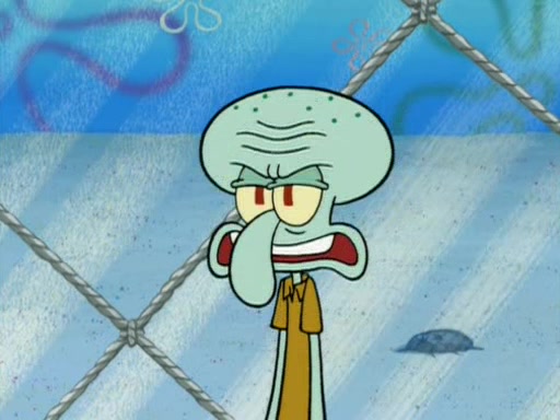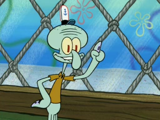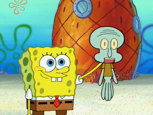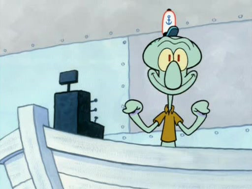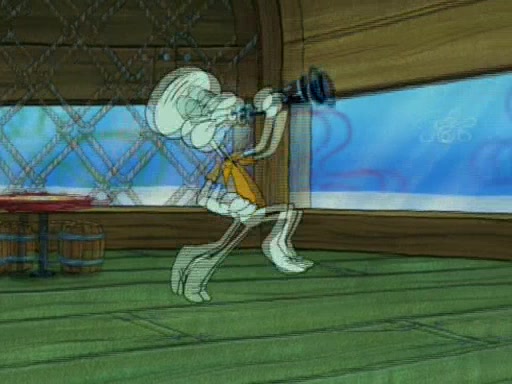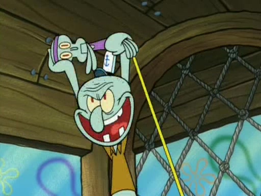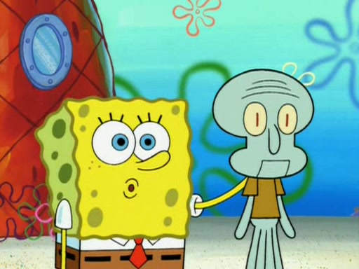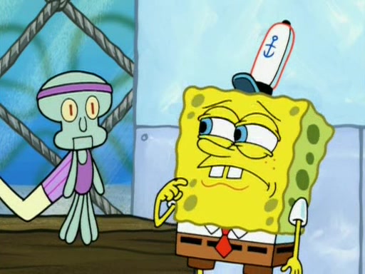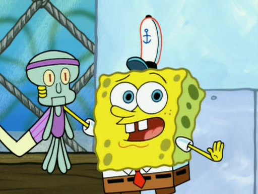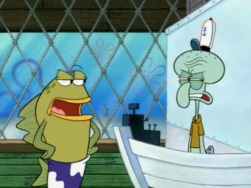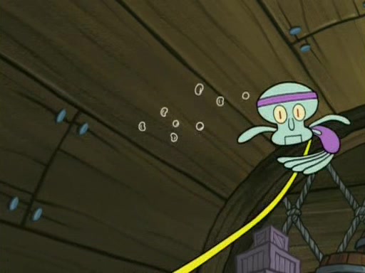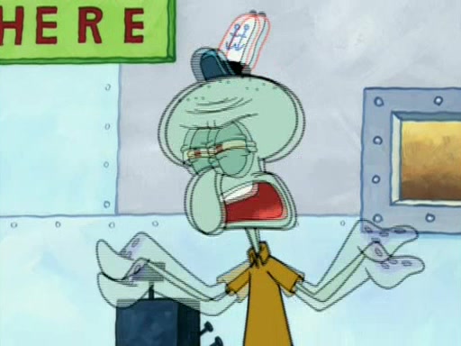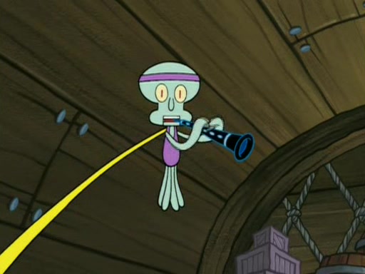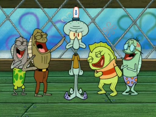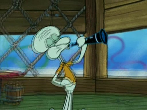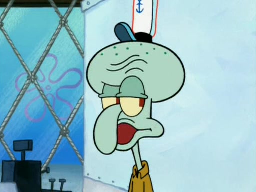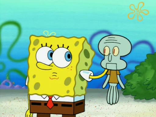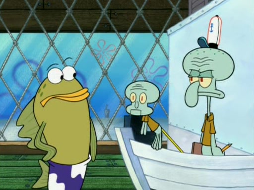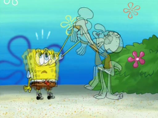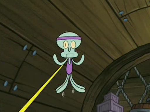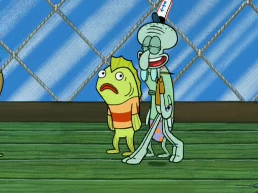 While SpongeBob and Mini Squid play Charades, Patrick walks by and thinks the Mini Squid is Squidward, and also thinks he's gotten smaller and shaved his beard, even though Squidward doesn't have a beard, confusing SpongeBob and Mini Squid.