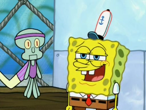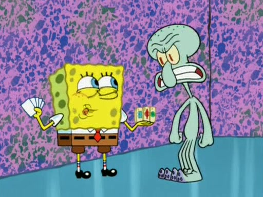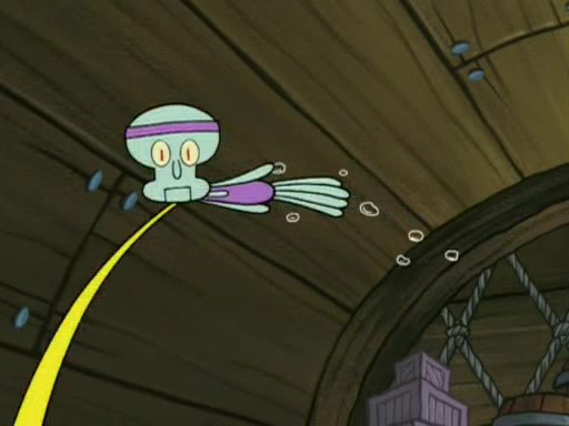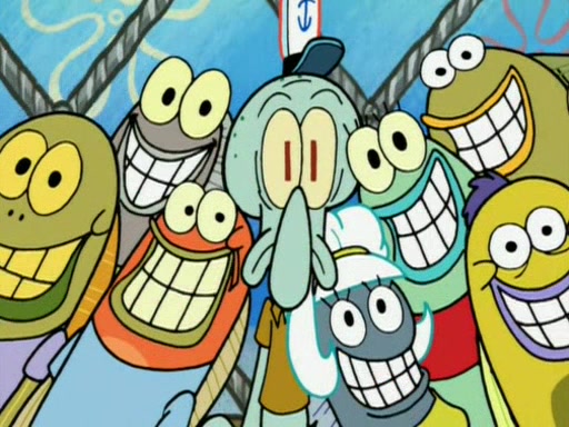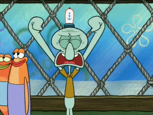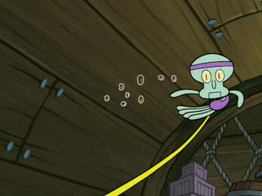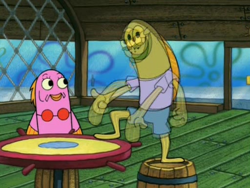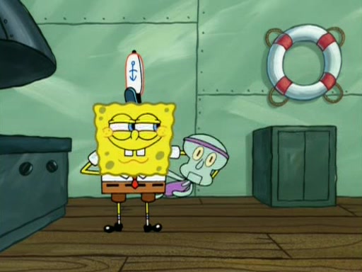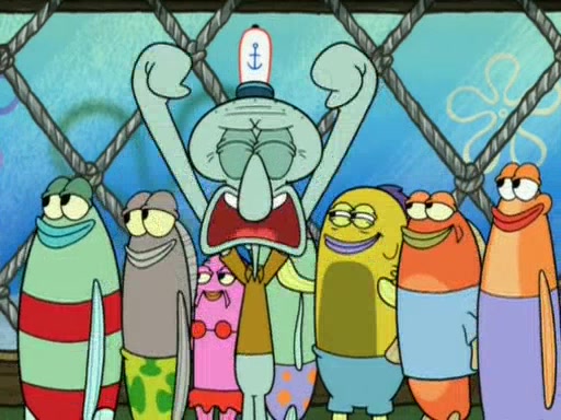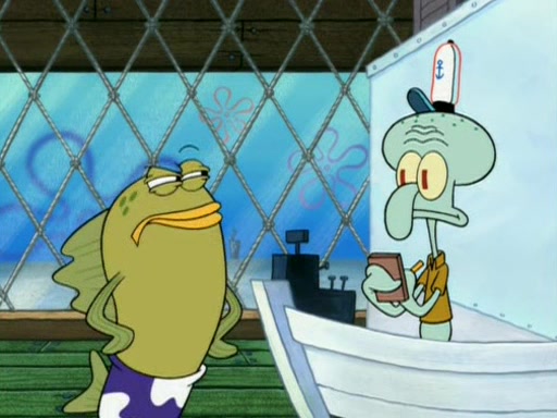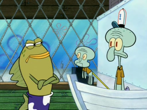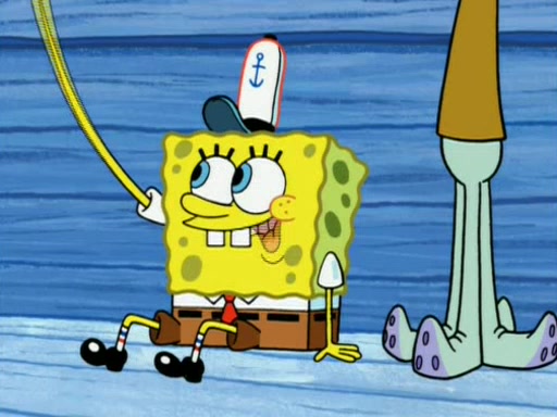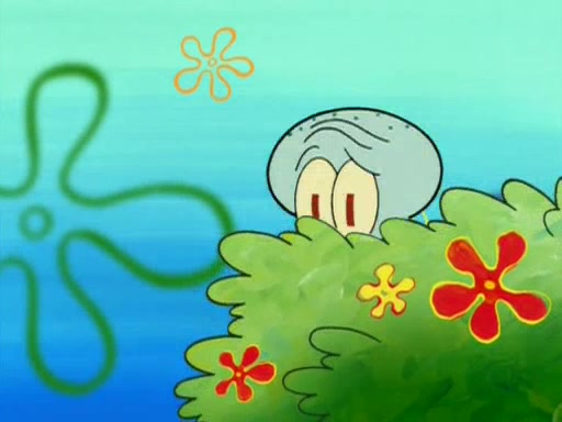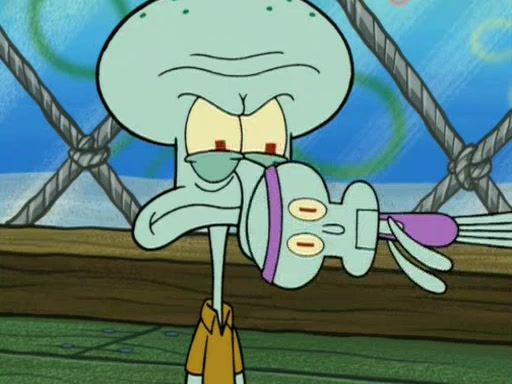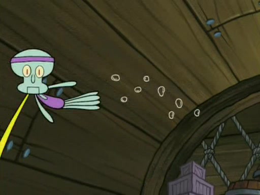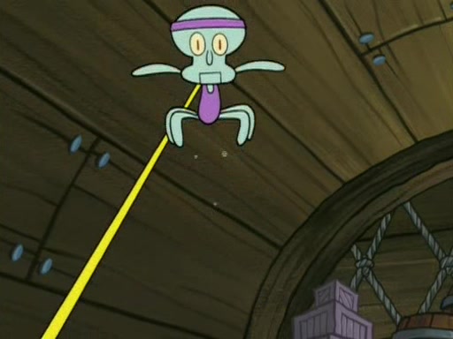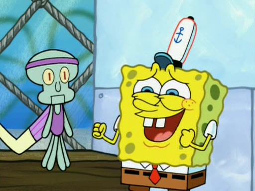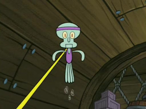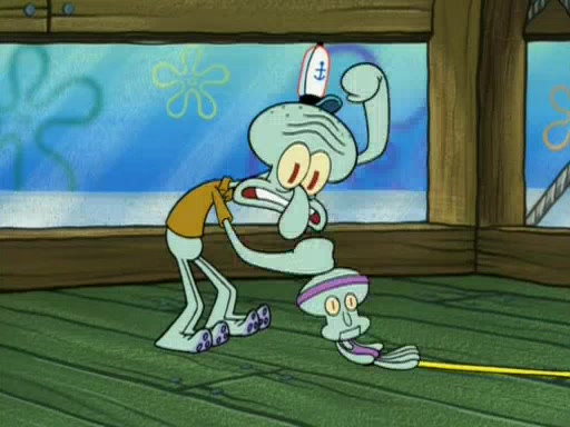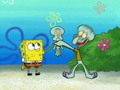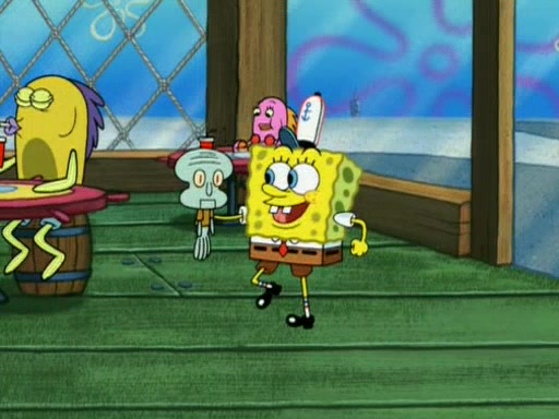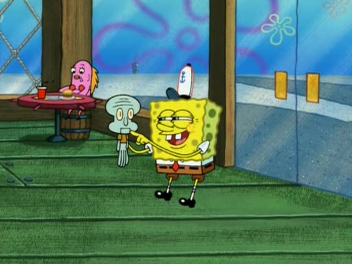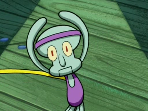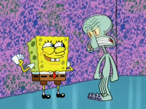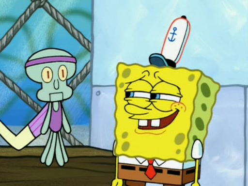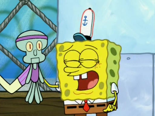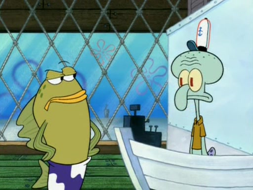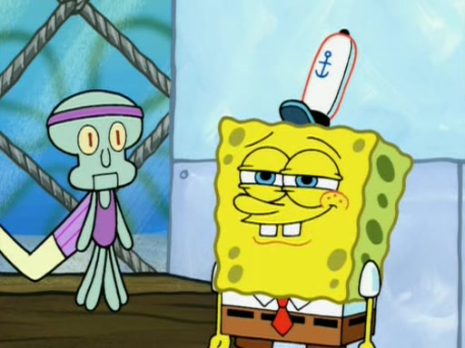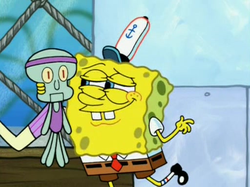 While SpongeBob and Mini Squid play Charades, Patrick walks by and thinks the Mini Squid is Squidward, and also thinks he's gotten smaller and shaved his beard, even though Squidward doesn't have a beard, confusing SpongeBob and Mini Squid.