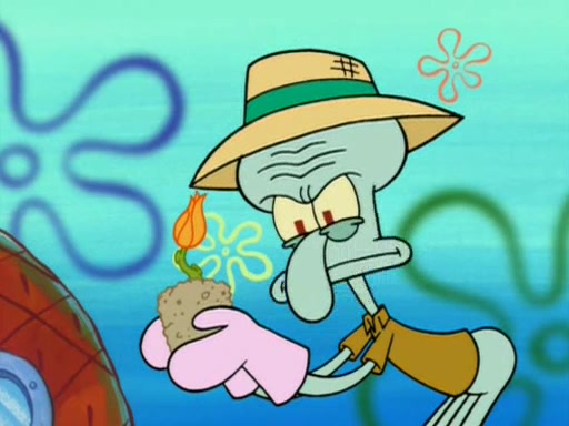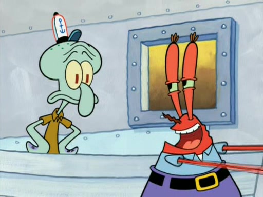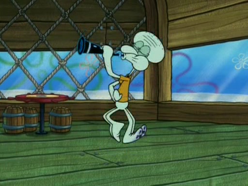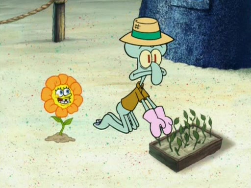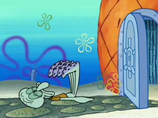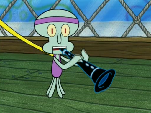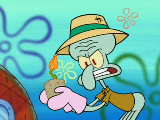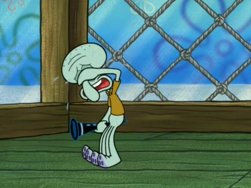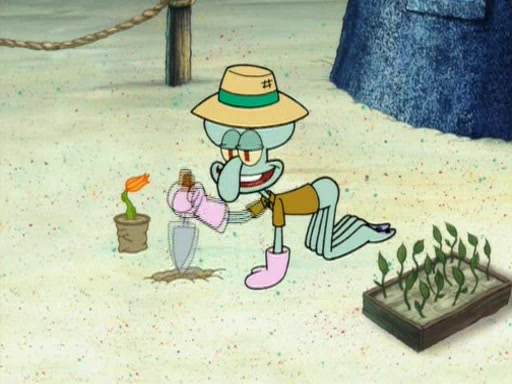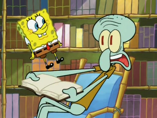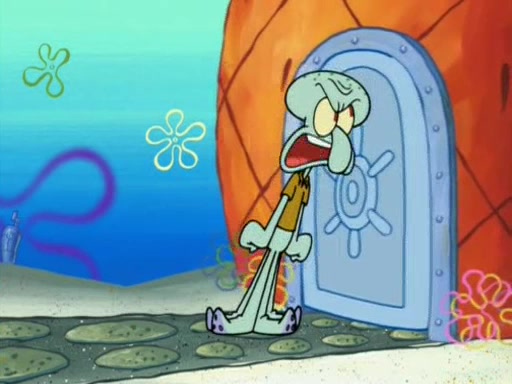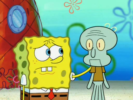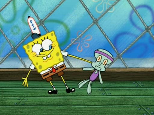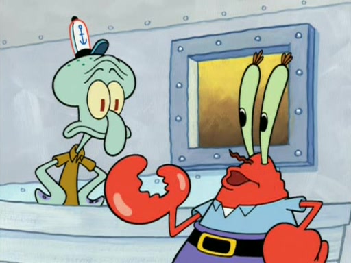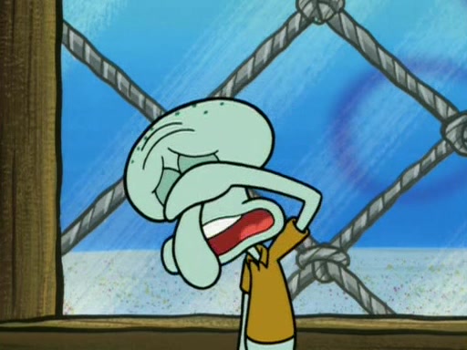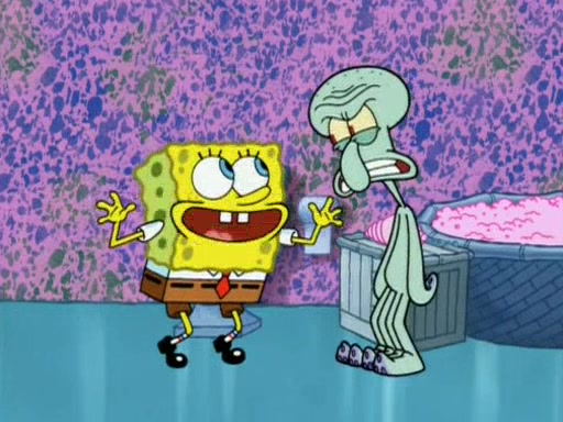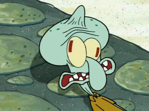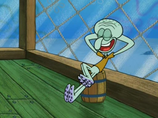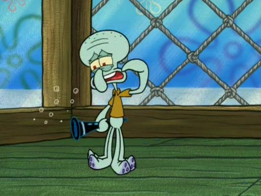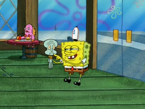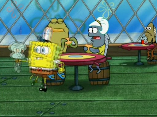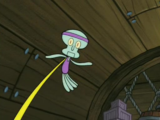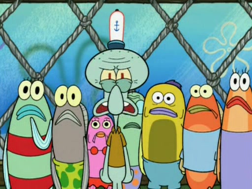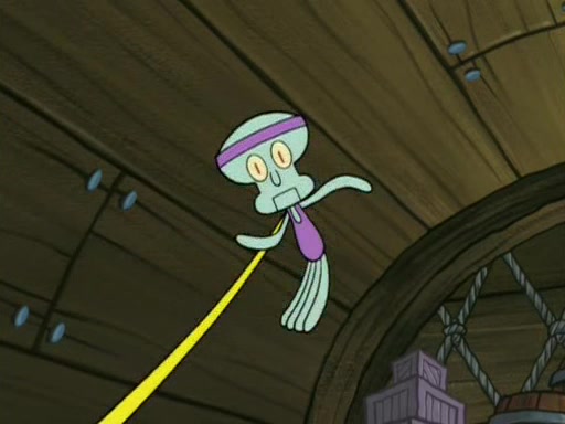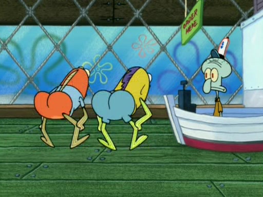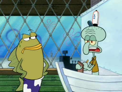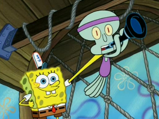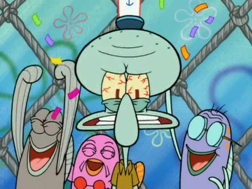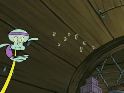 While SpongeBob and Mini Squid play Charades, Patrick walks by and thinks the Mini Squid is Squidward, and also thinks he's gotten smaller and shaved his beard, even though Squidward doesn't have a beard, confusing SpongeBob and Mini Squid.