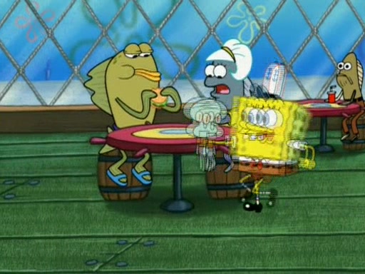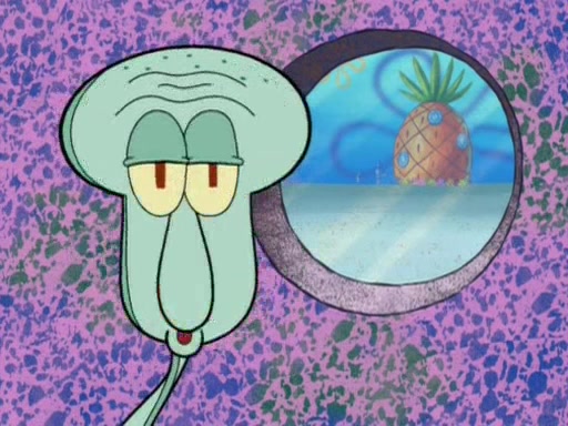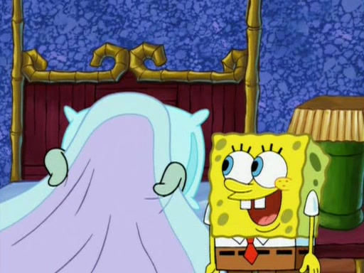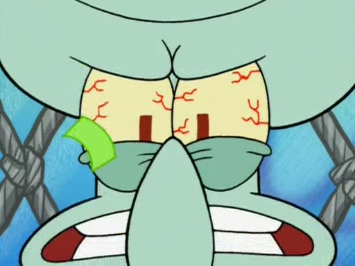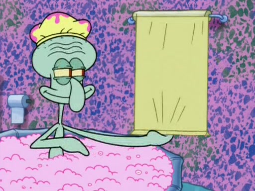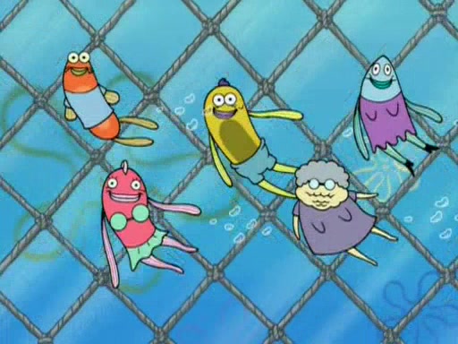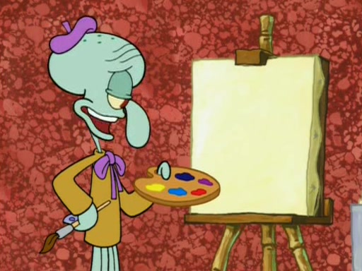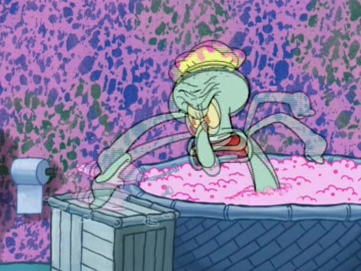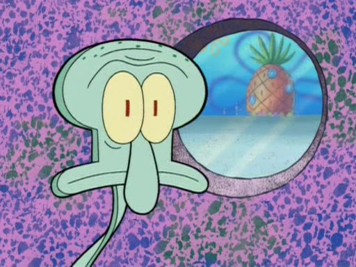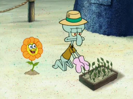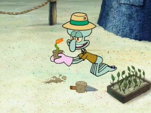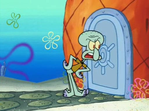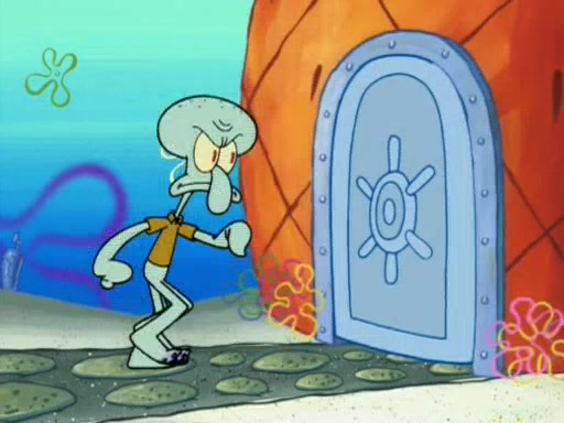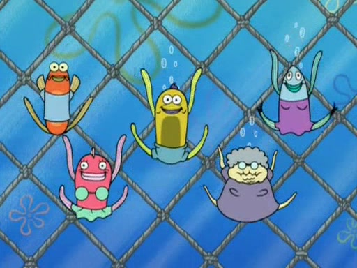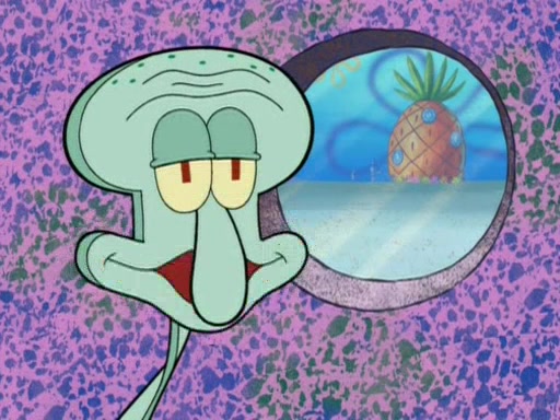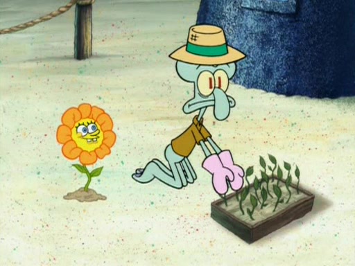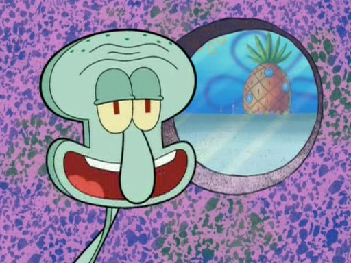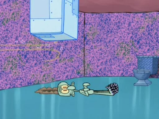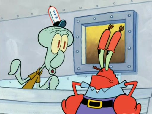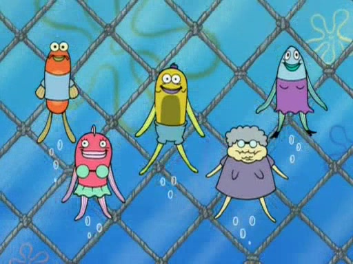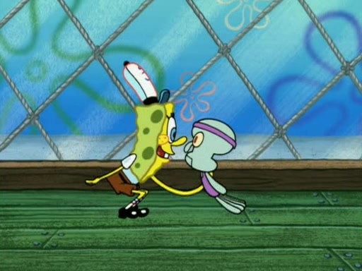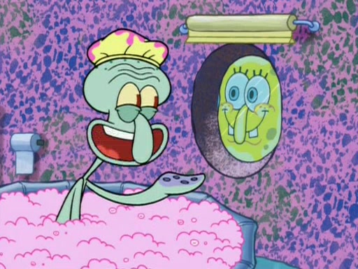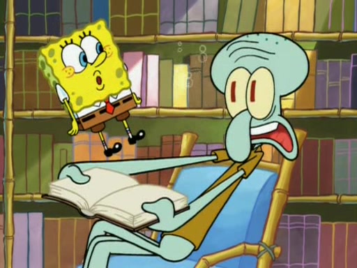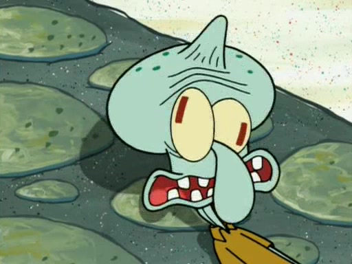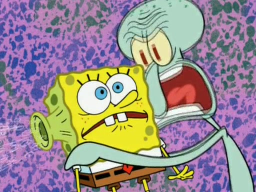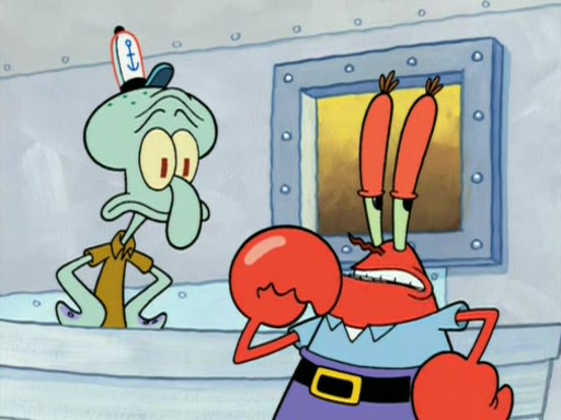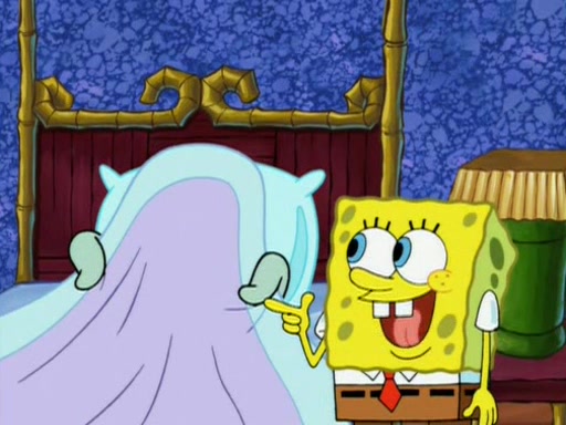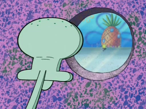 While SpongeBob and Mini Squid play Charades, Patrick walks by and thinks the Mini Squid is Squidward, and also thinks he's gotten smaller and shaved his beard, even though Squidward doesn't have a beard, confusing SpongeBob and Mini Squid.