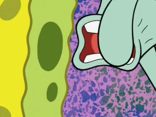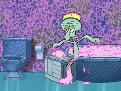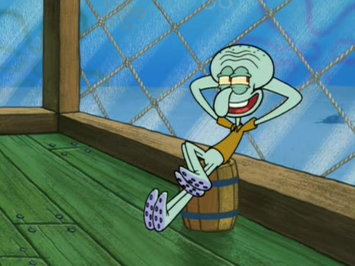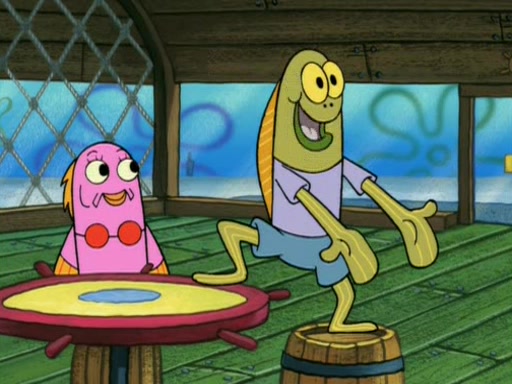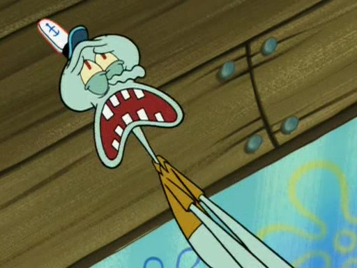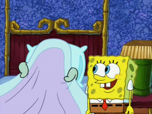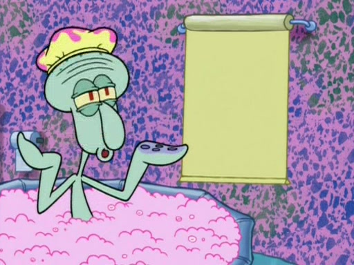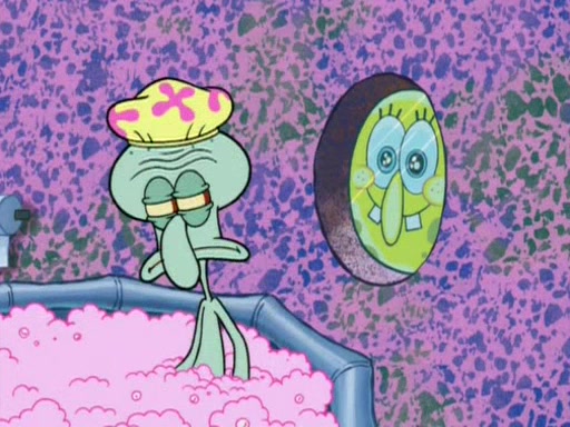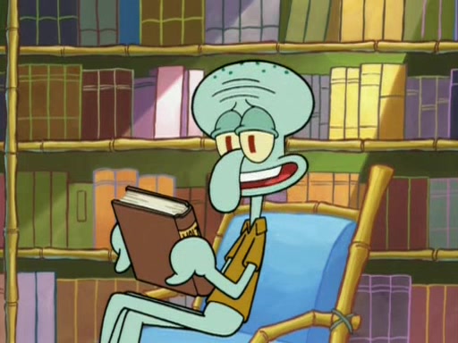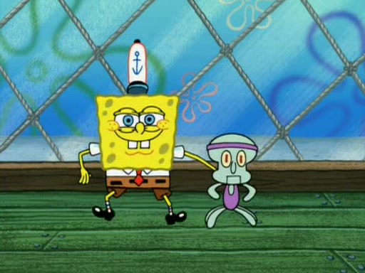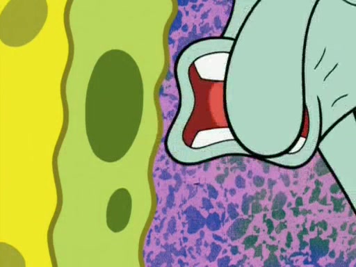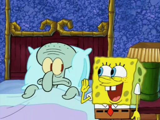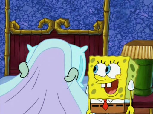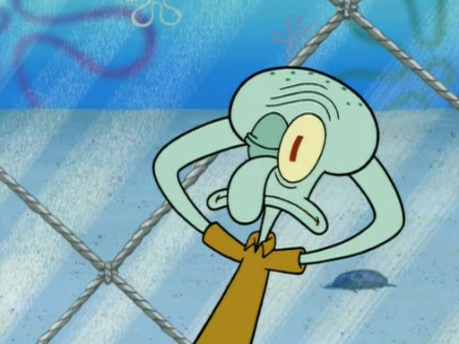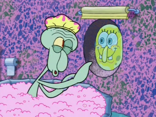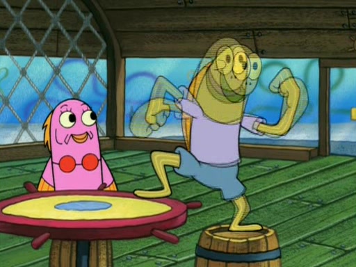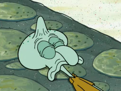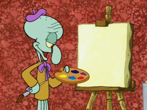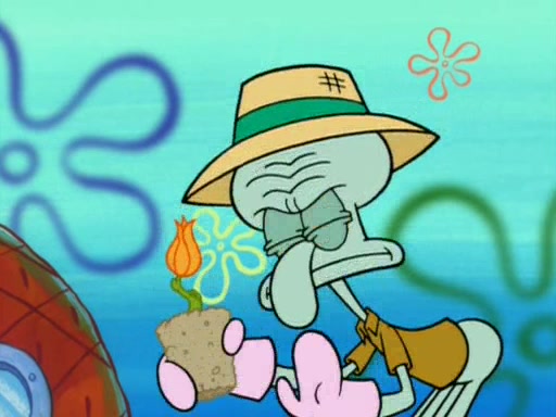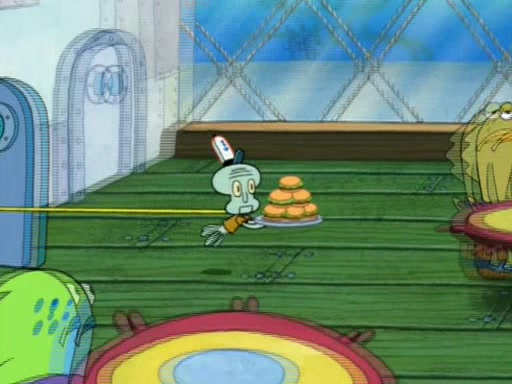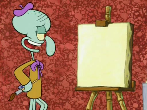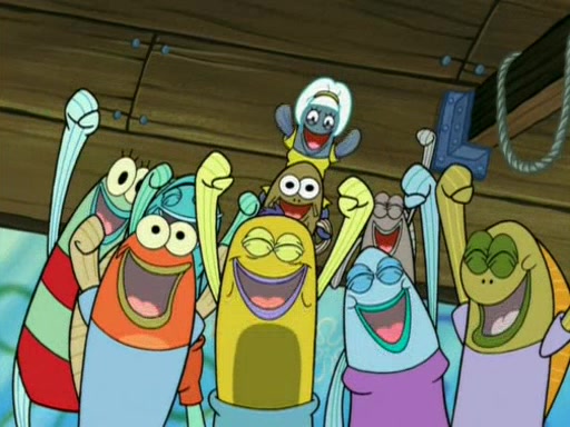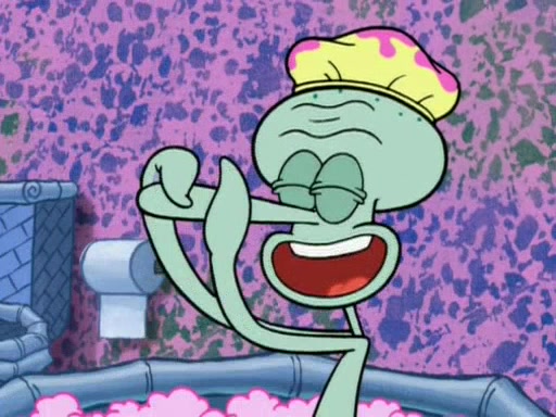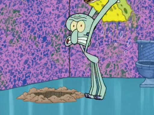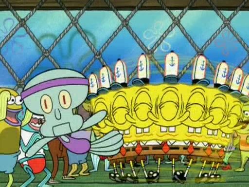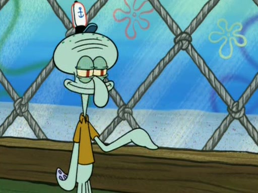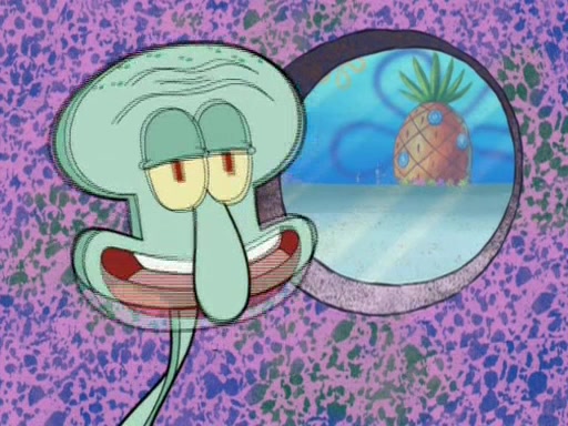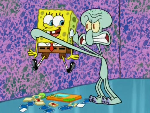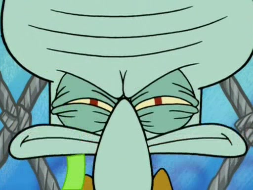 While SpongeBob and Mini Squid play Charades, Patrick walks by and thinks the Mini Squid is Squidward, and also thinks he's gotten smaller and shaved his beard, even though Squidward doesn't have a beard, confusing SpongeBob and Mini Squid.