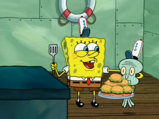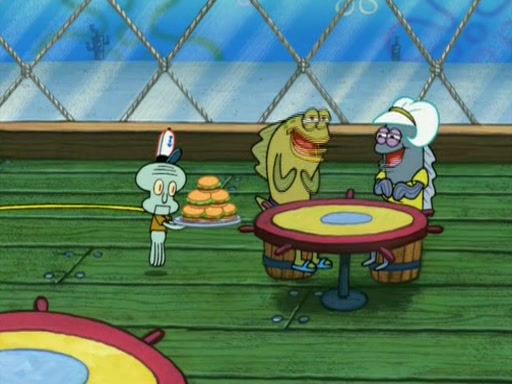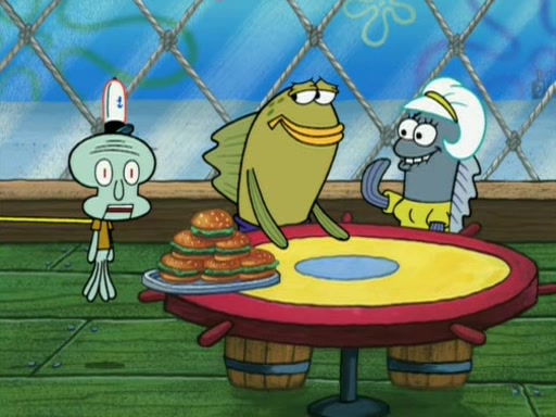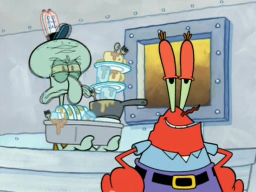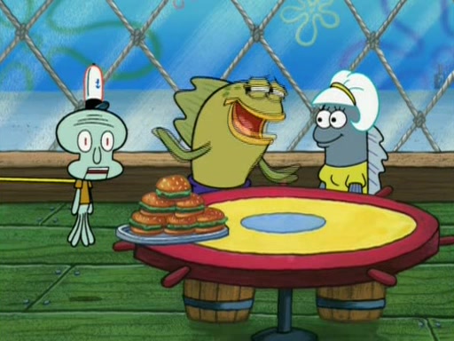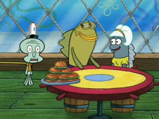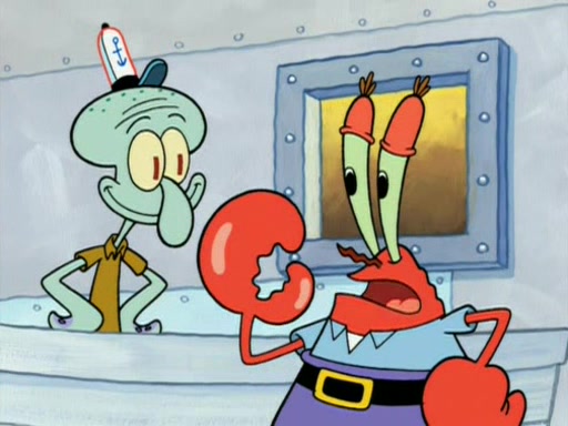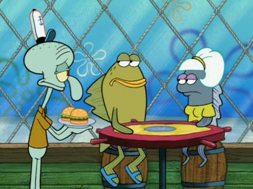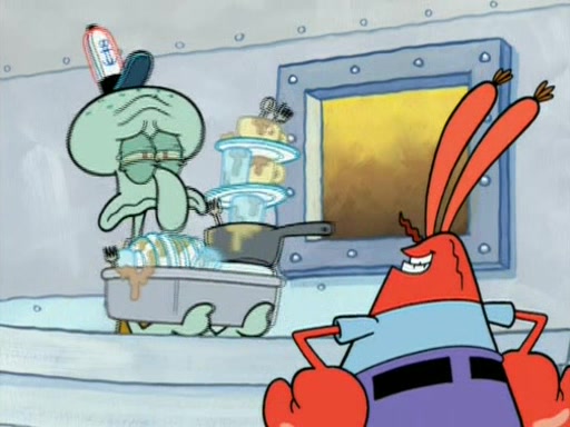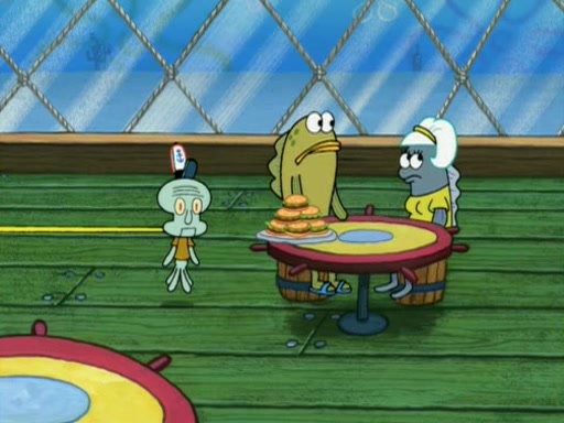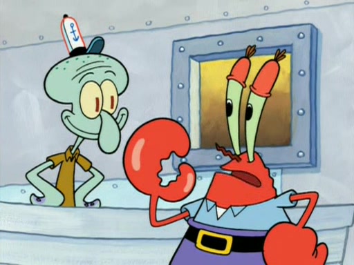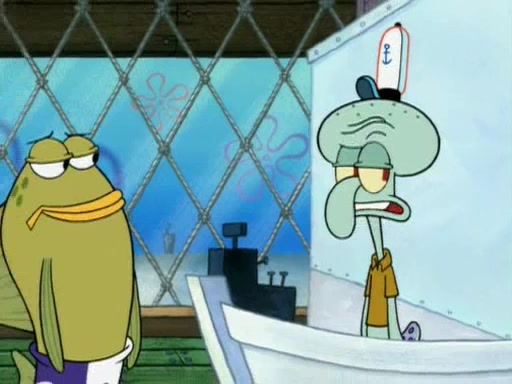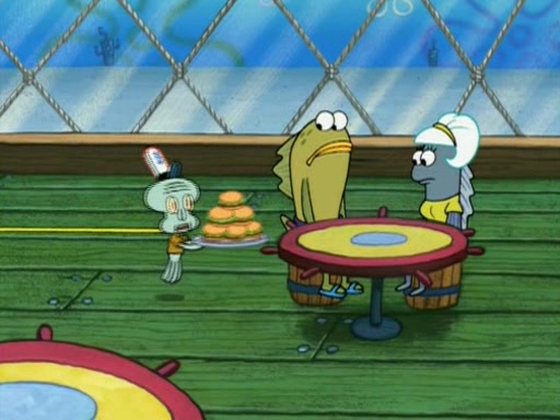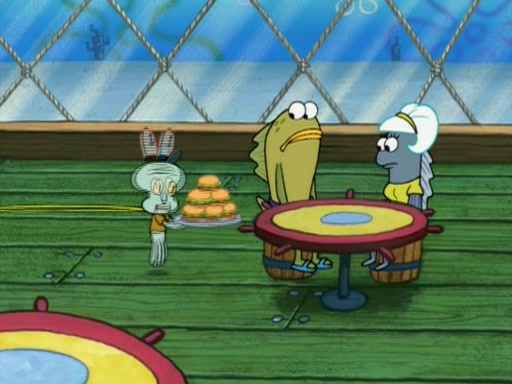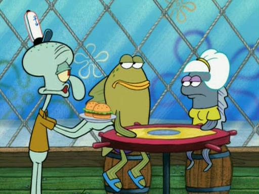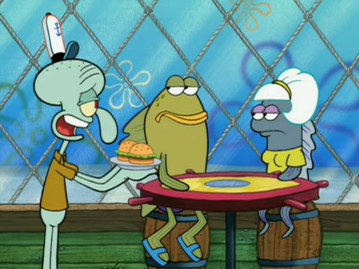 At the Krusty Krab, Squidward tells a joke to two customers, but they don't laugh because of his mood while telling the joke. As SpongeBob and Mini Squid come in, the two customers start to favor him. Squidward takes a customer's order, but he doesn't like his attitude. Mini Squid takes Squidward's job as Cashier and takes the customer's order, and the customer likes his attitude. SpongeBob cooks the patties and Mini Squid delivers them to the customers. He tells Squidward's joke to the customers and they laugh because of his happy mood while telling the joke. Squidward starts to get mad at Mini Squid for stealing his joke. A lady wants to give Mini Squid a $300 tip. Squidward takes his hat and his job back, but Mr. Krabs tells him that he prefers Mini Squid because he's making him plenty of money and changes Squidward's job to dish washer.