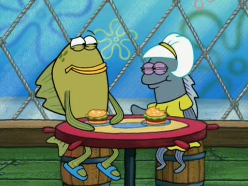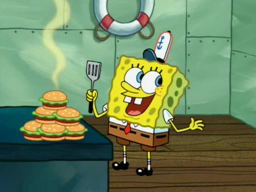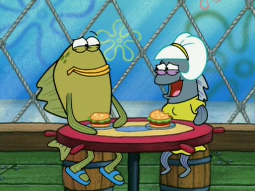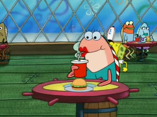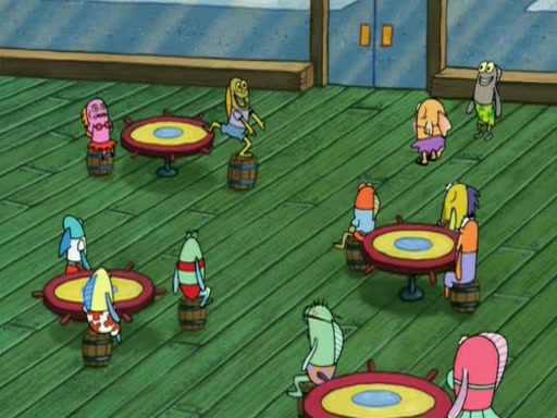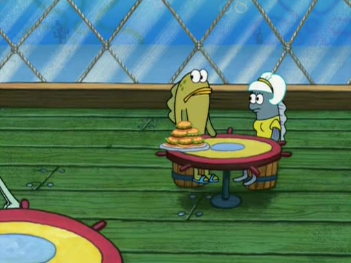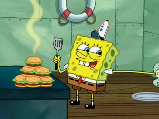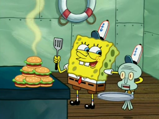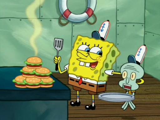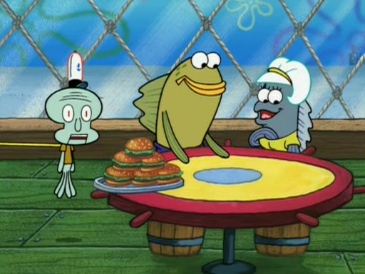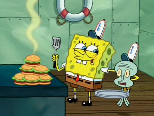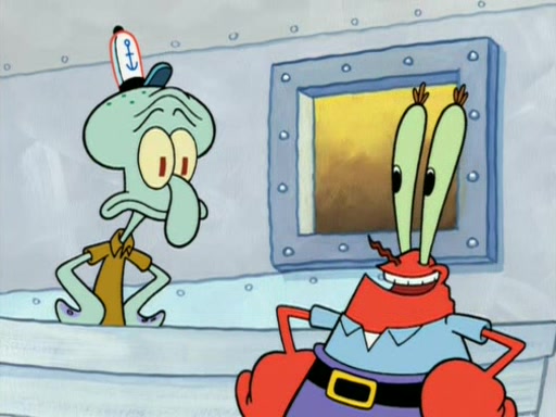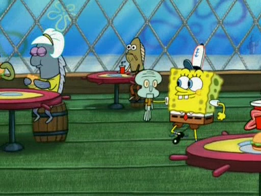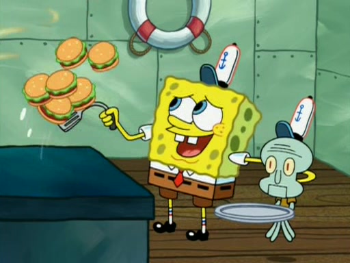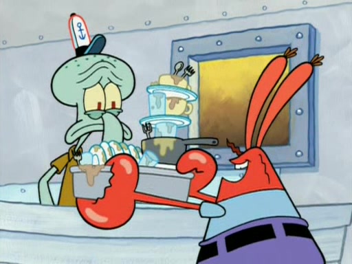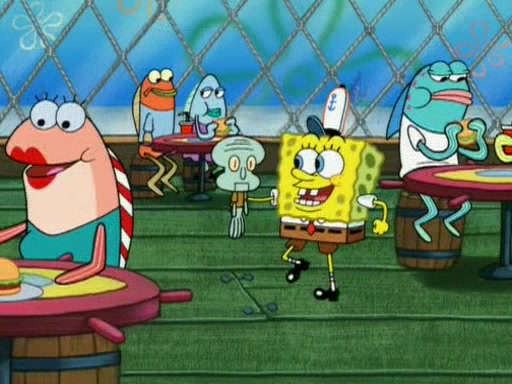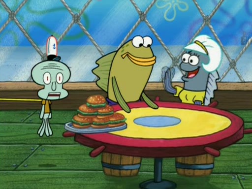 At the Krusty Krab, Squidward tells a joke to two customers, but they don't laugh because of his mood while telling the joke. As SpongeBob and Mini Squid come in, the two customers start to favor him. Squidward takes a customer's order, but he doesn't like his attitude. Mini Squid takes Squidward's job as Cashier and takes the customer's order, and the customer likes his attitude. SpongeBob cooks the patties and Mini Squid delivers them to the customers. He tells Squidward's joke to the customers and they laugh because of his happy mood while telling the joke. Squidward starts to get mad at Mini Squid for stealing his joke. A lady wants to give Mini Squid a $300 tip. Squidward takes his hat and his job back, but Mr. Krabs tells him that he prefers Mini Squid because he's making him plenty of money and changes Squidward's job to dish washer.