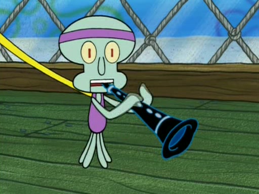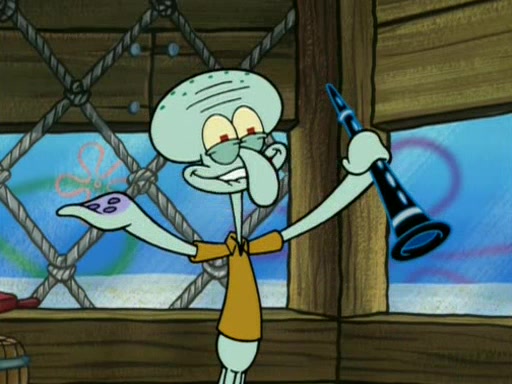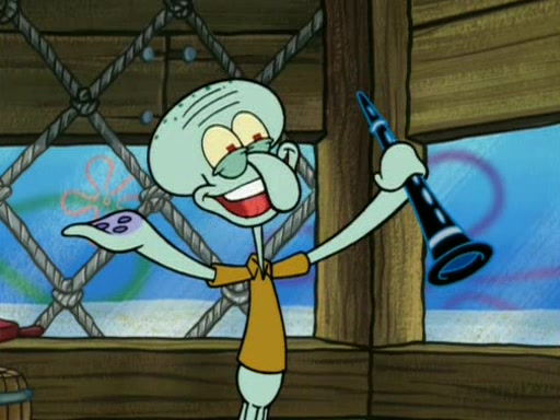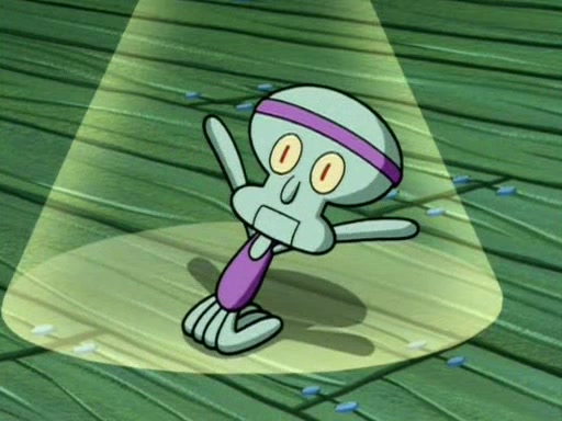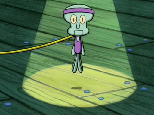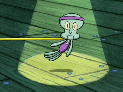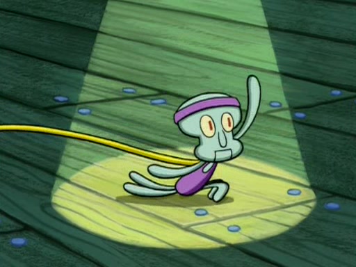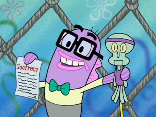 Soon, Mini Squid starts impressing the customers with some dance moves. Squidward realizes that they were his moves and starts to dance, but the customers finds him lacking talent. Mini Squid and customers soon start dancing like jellyfish. Afterwards, Squidward gets mad at Mini Squid for stealing his life and starts squeezing him, bashing him, stomping him, and mauling him. Suddenly, a man tells Squidward to stop mauling the head of his "new client". Squidward realizes the man is a producer that represents his favorite clarinet player. Squidward thought he was there to sign him up, but the producer takes Mini Squid. He's offering Mini Squid a $1,000,000 contract and a sequined suit. Squidward tries to impress him, but fails with the agent essentially telling him that he will never become famous. SpongeBob bids goodbye to his new friend.