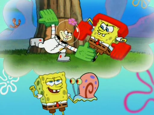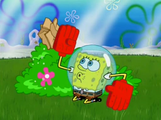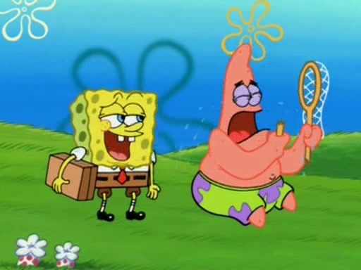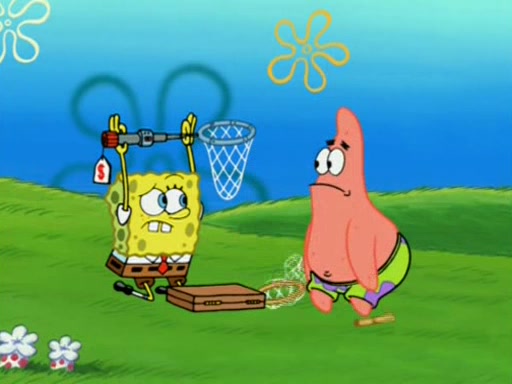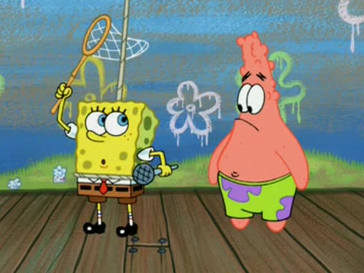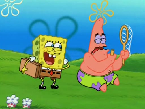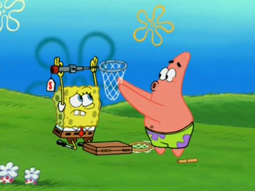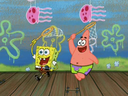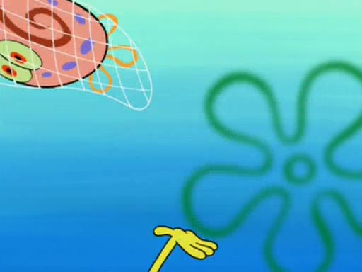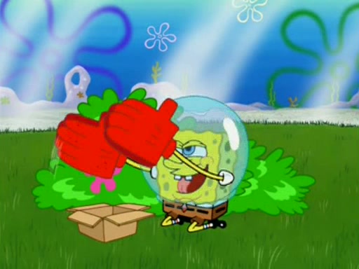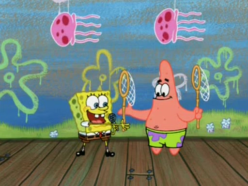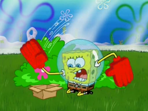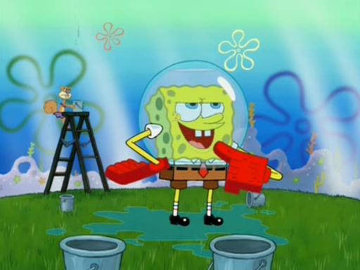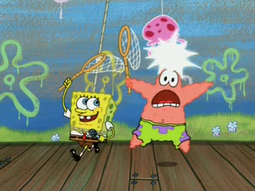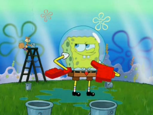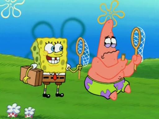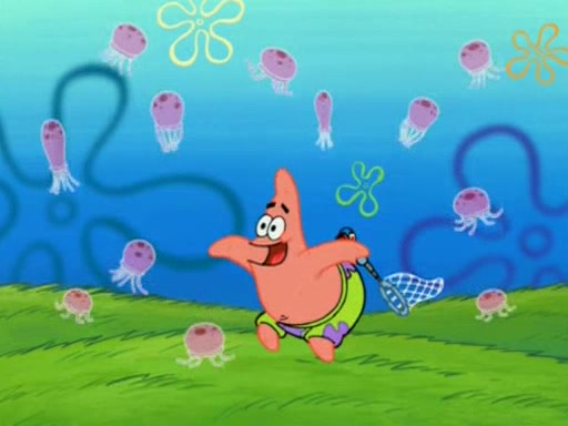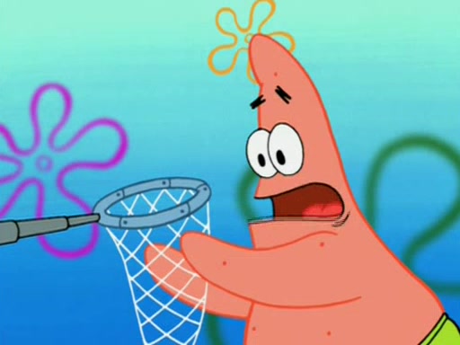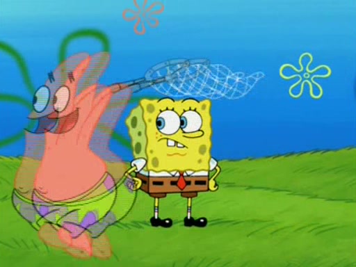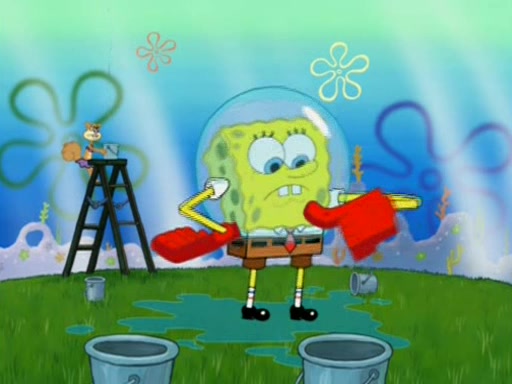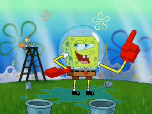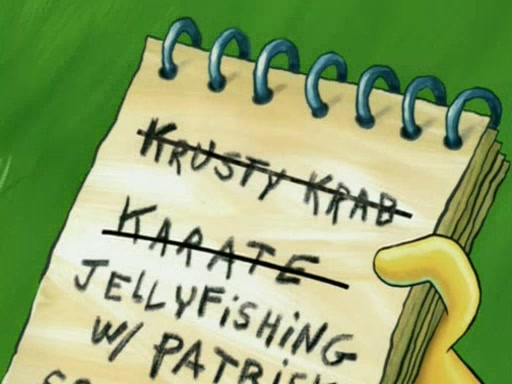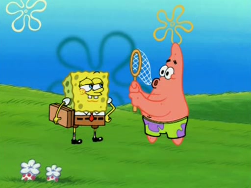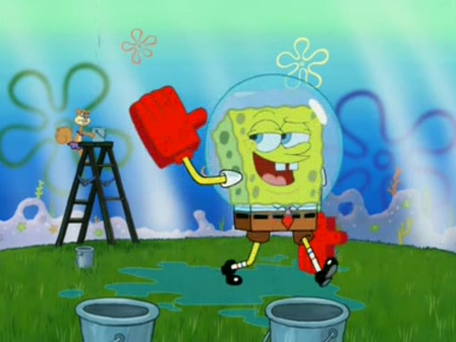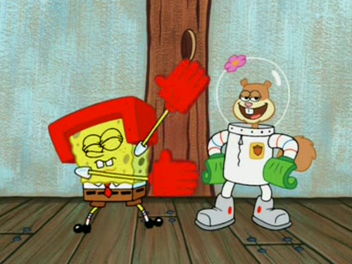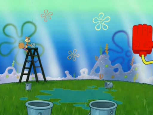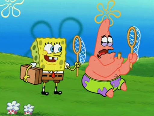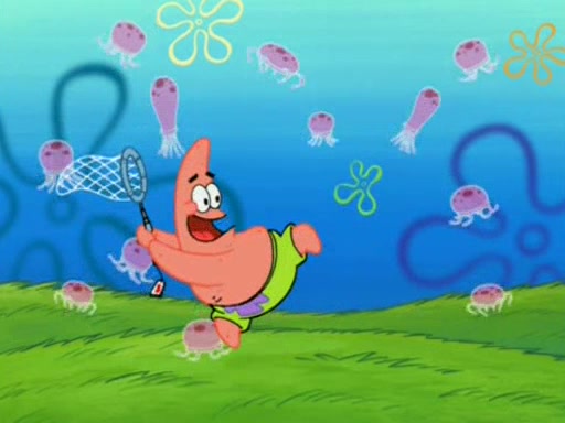 He then goes to Sandy's tree dome for karate, but Sandy is busy trying to fix a leak in the roof of her treedome. SpongeBob thinks that this is a trap, and attacks her anyway. Sandy hits him and sends him flying up to the roof, and his glove sticks to it, sealing the leak. Afterward, SpongeBob heads over to Jellyfish Fields to go jelly fishing with Patrick, but Patrick explains that he has broken his net. SpongeBob gives him his old net to use, but he quickly breaks it as well. Finally, SpongeBob gives Patrick his brand-new net, and sits there watching as Patrick has fun jellyfishing with it.