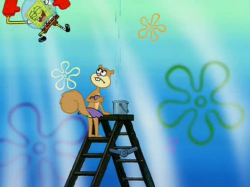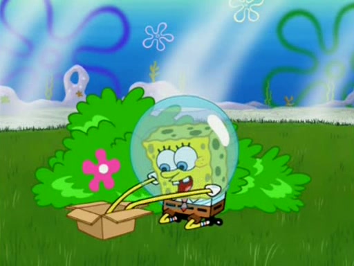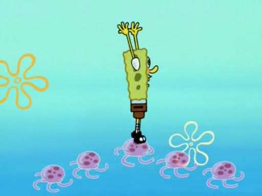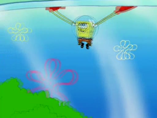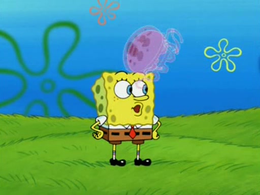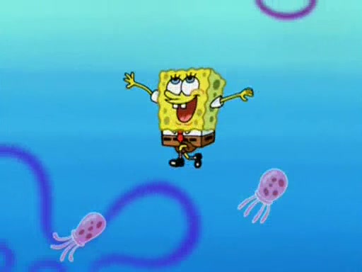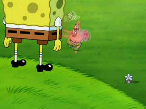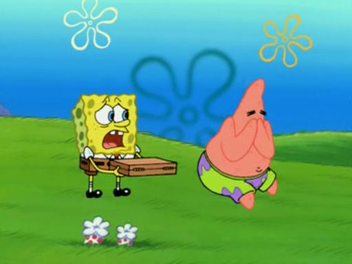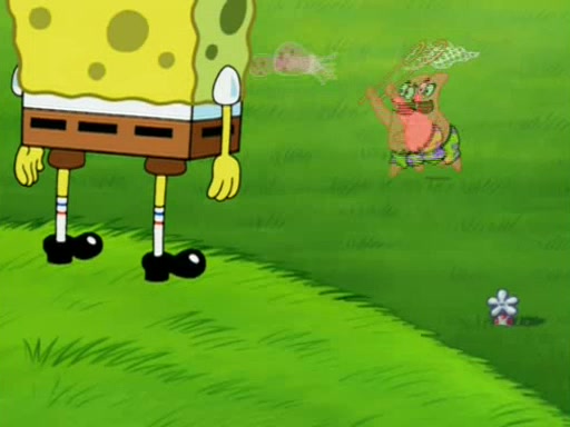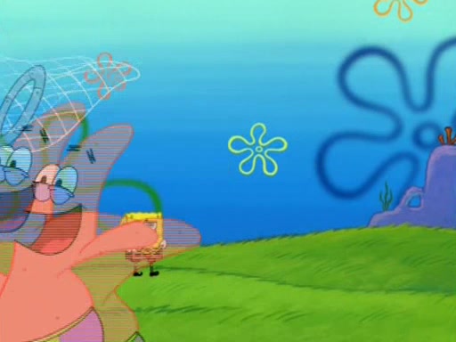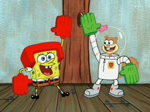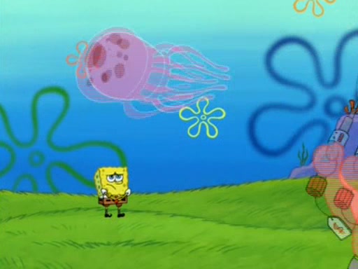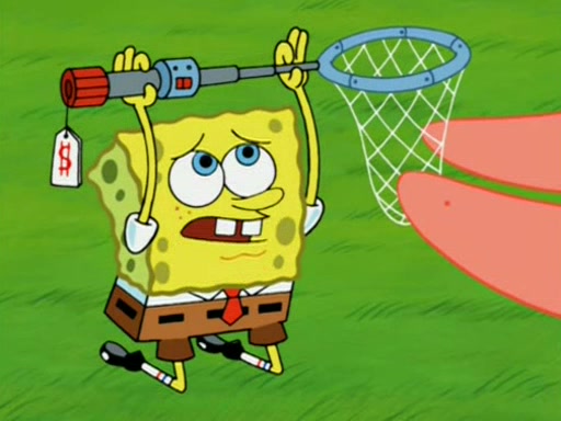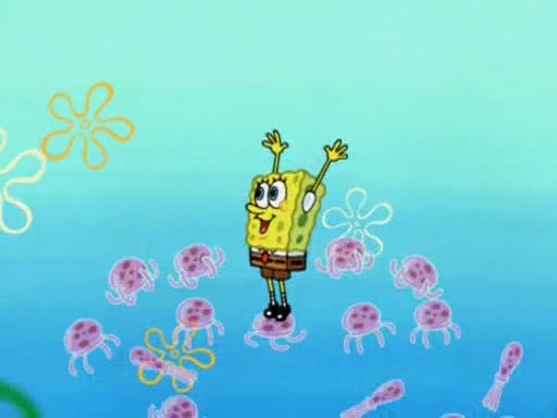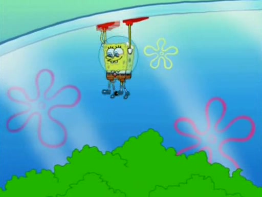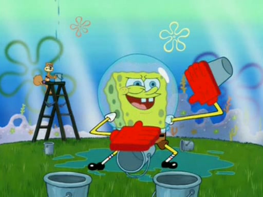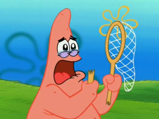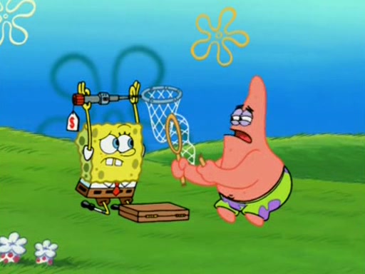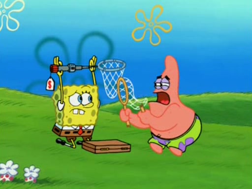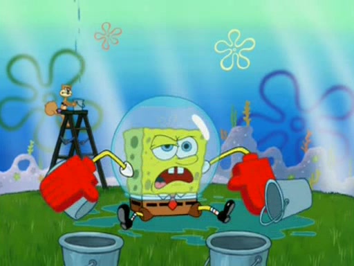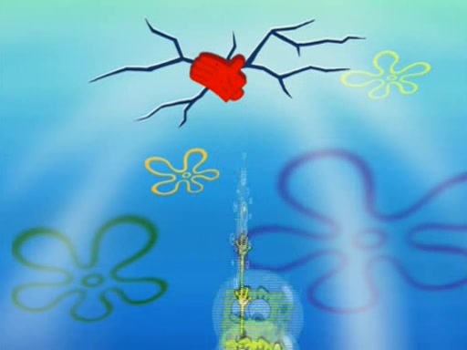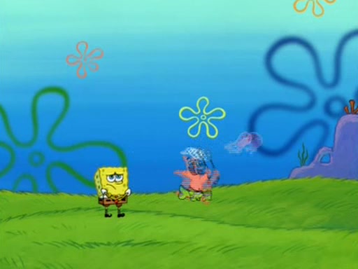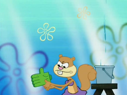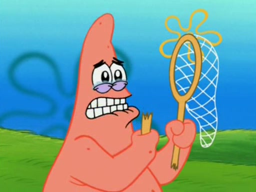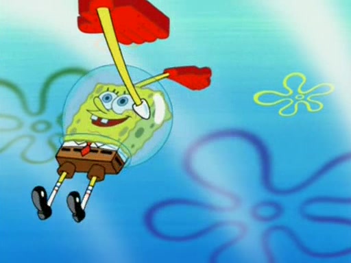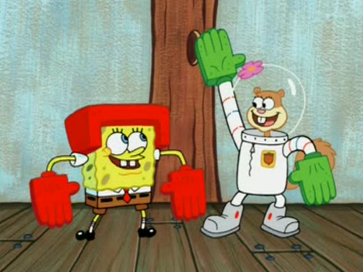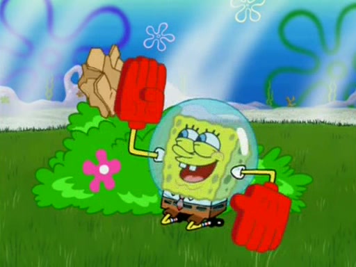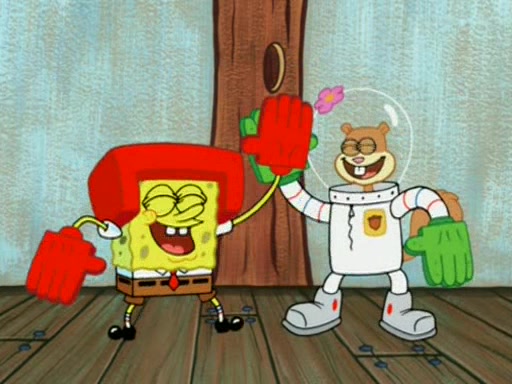 He then goes to Sandy's tree dome for karate, but Sandy is busy trying to fix a leak in the roof of her treedome. SpongeBob thinks that this is a trap, and attacks her anyway. Sandy hits him and sends him flying up to the roof, and his glove sticks to it, sealing the leak. Afterward, SpongeBob heads over to Jellyfish Fields to go jelly fishing with Patrick, but Patrick explains that he has broken his net. SpongeBob gives him his old net to use, but he quickly breaks it as well. Finally, SpongeBob gives Patrick his brand-new net, and sits there watching as Patrick has fun jellyfishing with it.