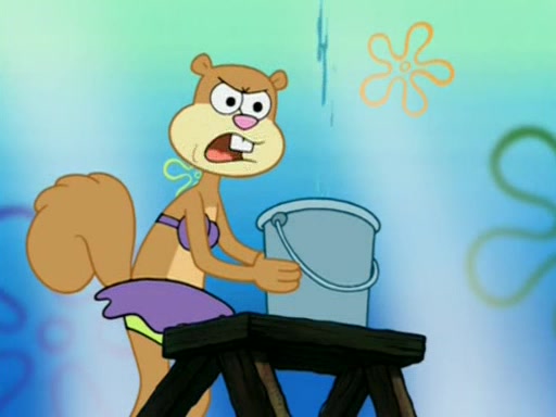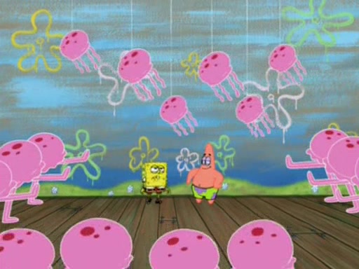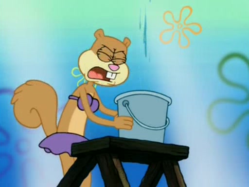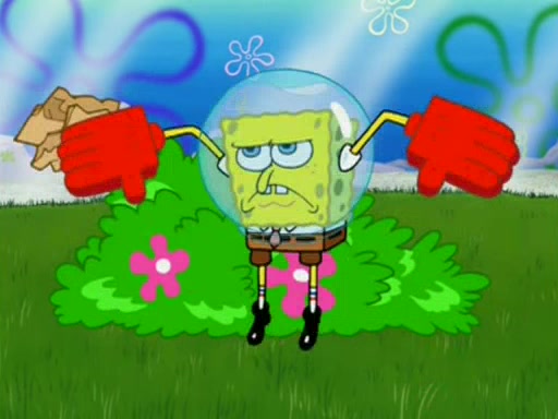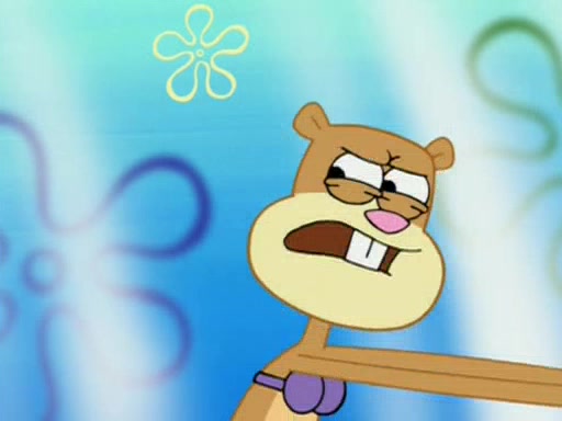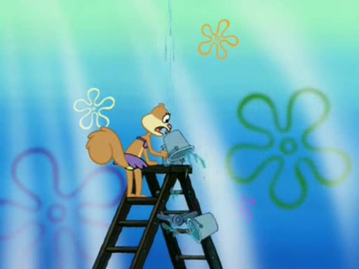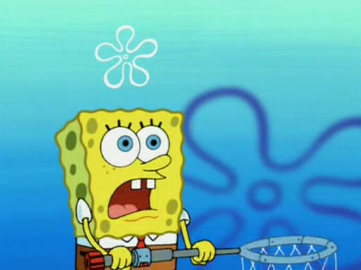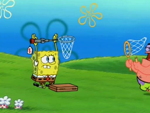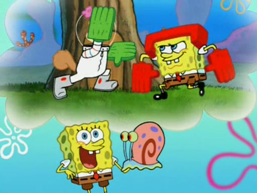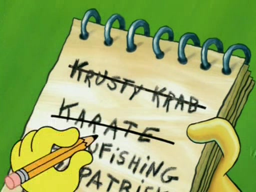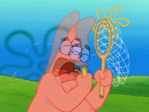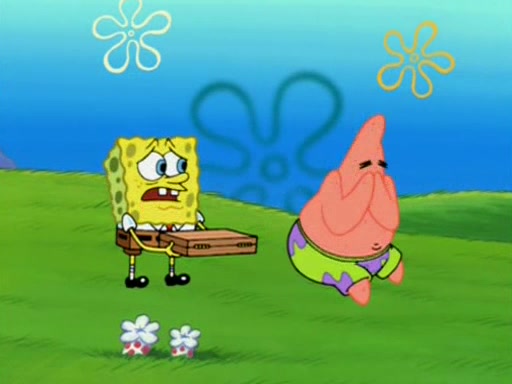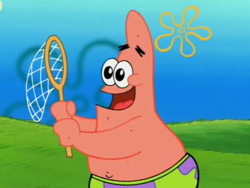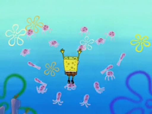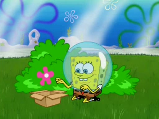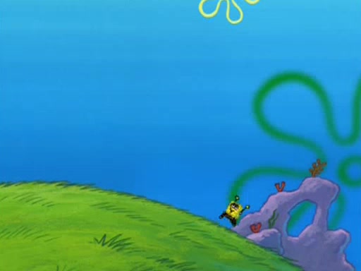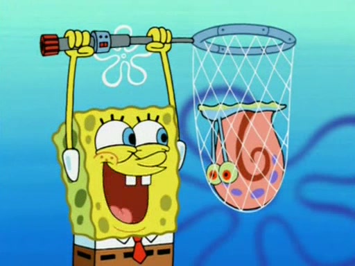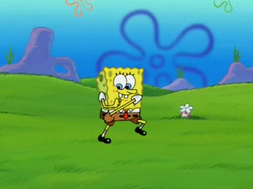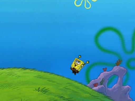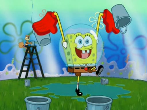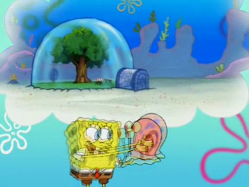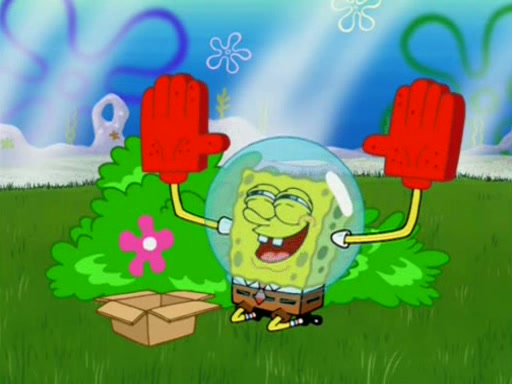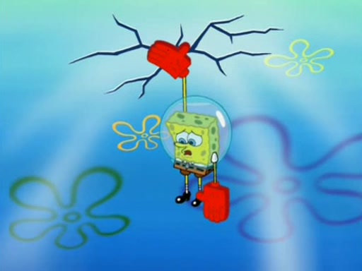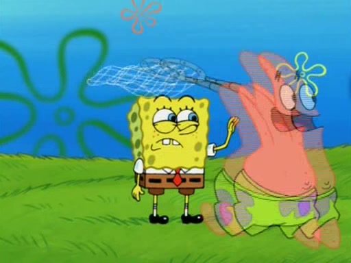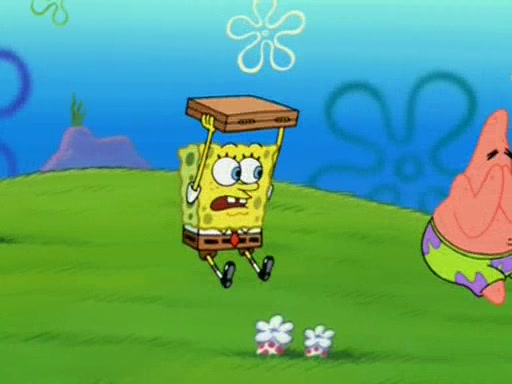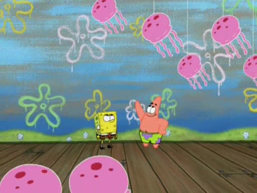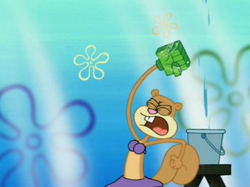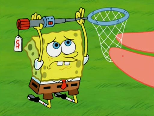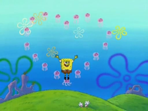 He then goes to Sandy's tree dome for karate, but Sandy is busy trying to fix a leak in the roof of her treedome. SpongeBob thinks that this is a trap, and attacks her anyway. Sandy hits him and sends him flying up to the roof, and his glove sticks to it, sealing the leak. Afterward, SpongeBob heads over to Jellyfish Fields to go jelly fishing with Patrick, but Patrick explains that he has broken his net. SpongeBob gives him his old net to use, but he quickly breaks it as well. Finally, SpongeBob gives Patrick his brand-new net, and sits there watching as Patrick has fun jellyfishing with it.