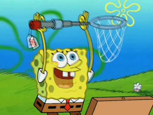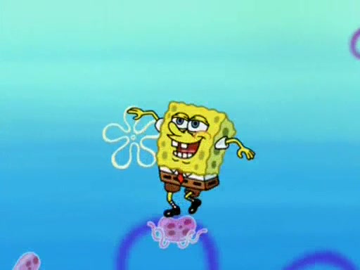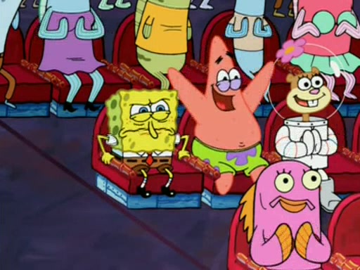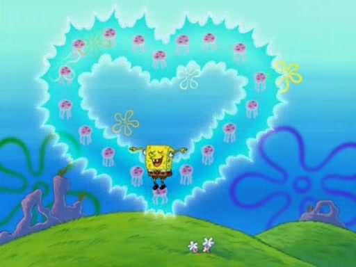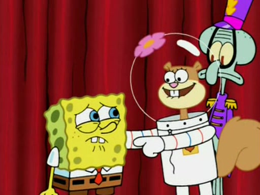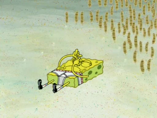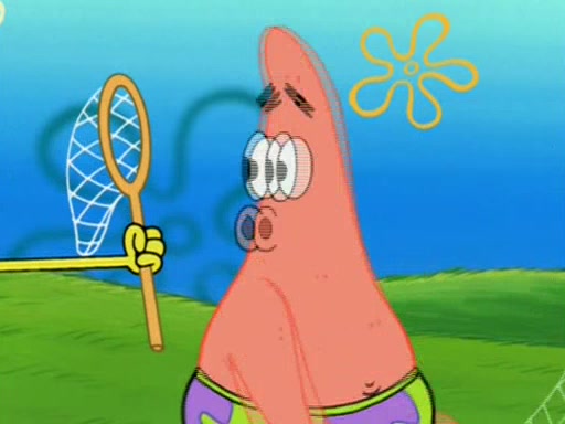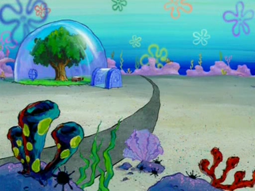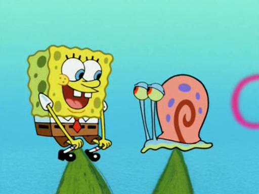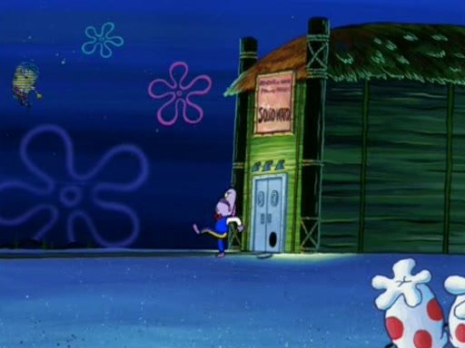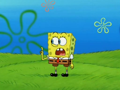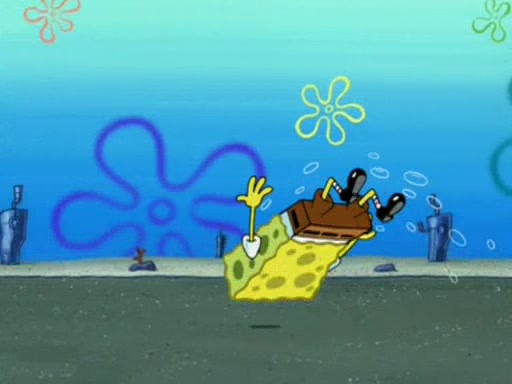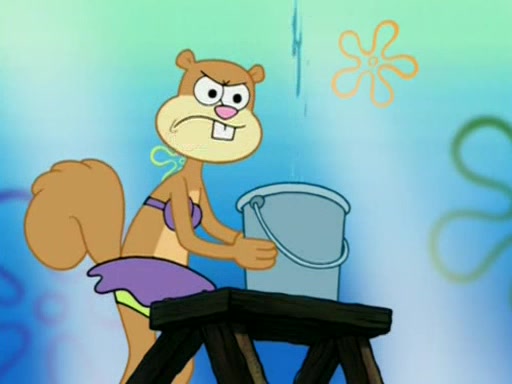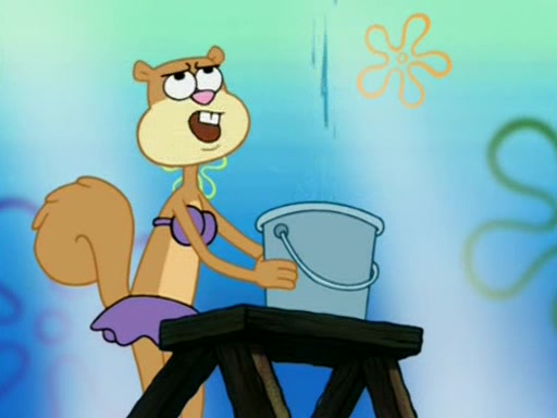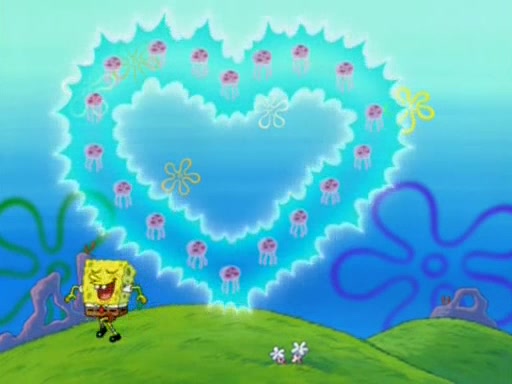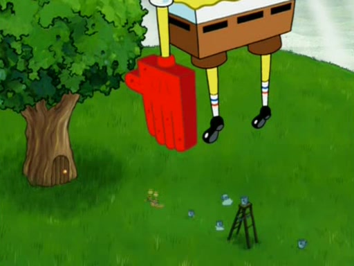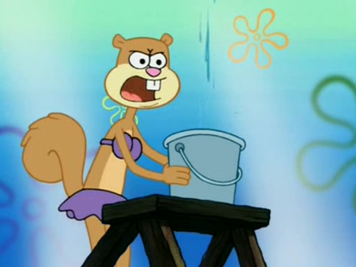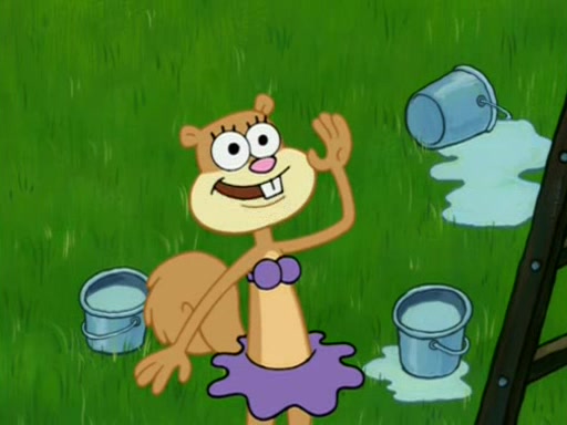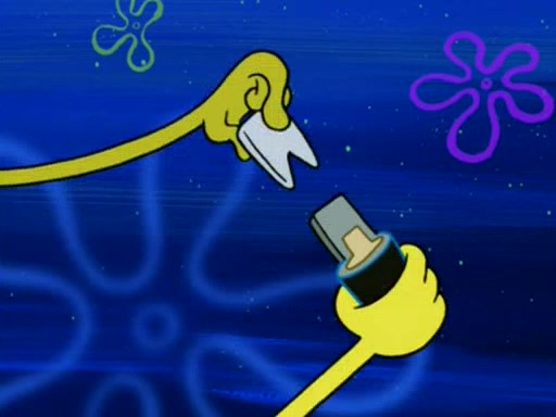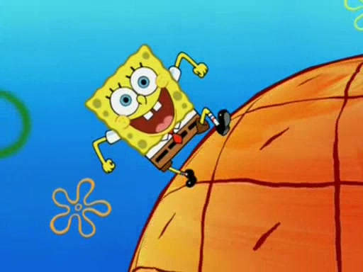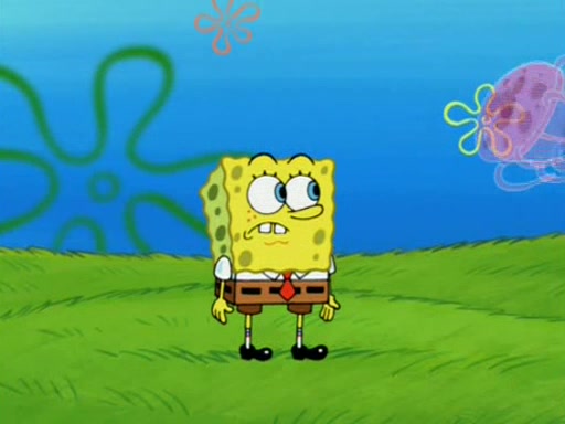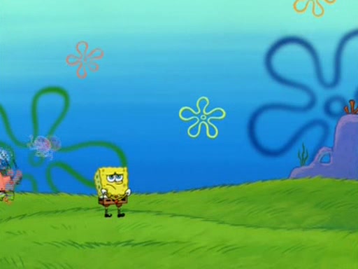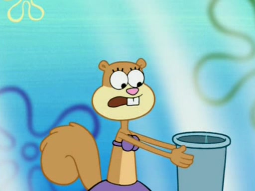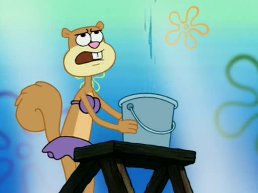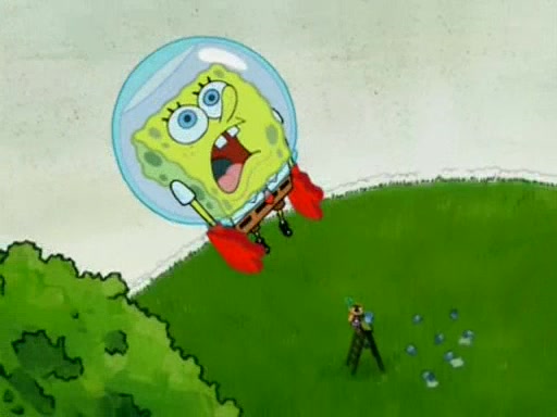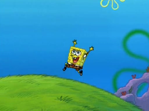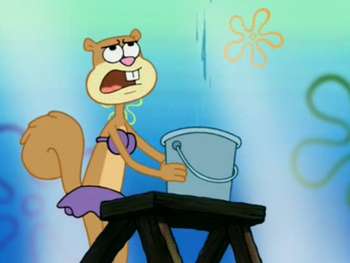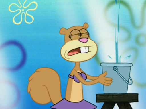 He then goes to Sandy's tree dome for karate, but Sandy is busy trying to fix a leak in the roof of her treedome. SpongeBob thinks that this is a trap, and attacks her anyway. Sandy hits him and sends him flying up to the roof, and his glove sticks to it, sealing the leak. Afterward, SpongeBob heads over to Jellyfish Fields to go jelly fishing with Patrick, but Patrick explains that he has broken his net. SpongeBob gives him his old net to use, but he quickly breaks it as well. Finally, SpongeBob gives Patrick his brand-new net, and sits there watching as Patrick has fun jellyfishing with it.