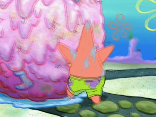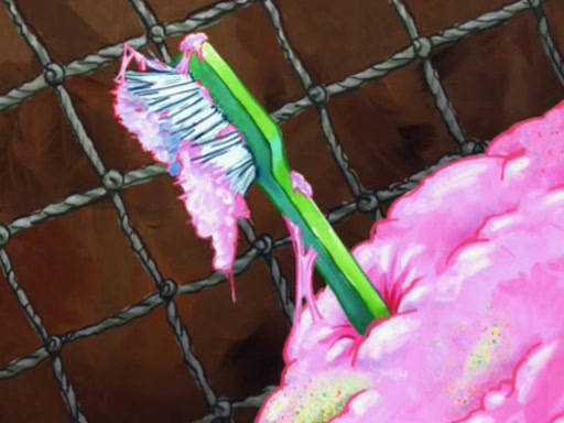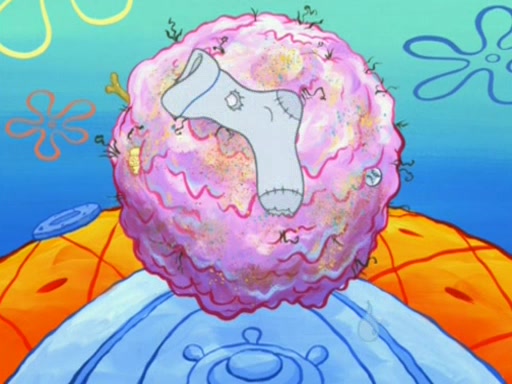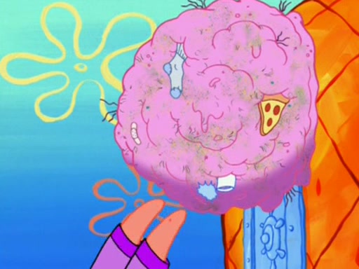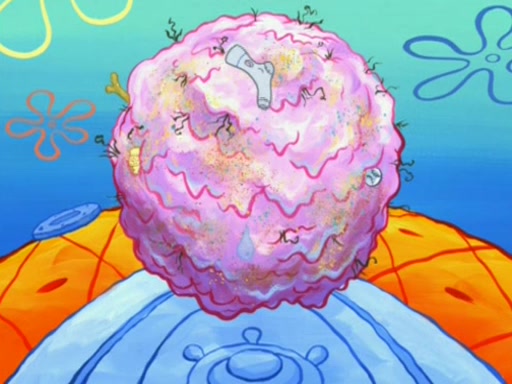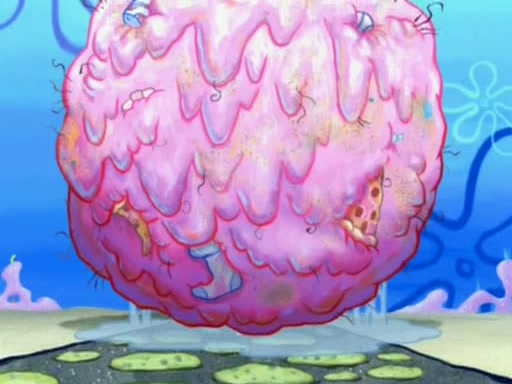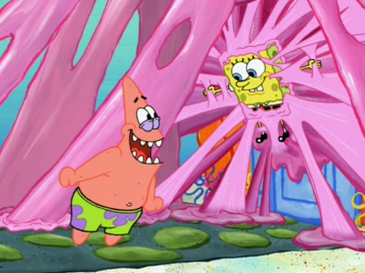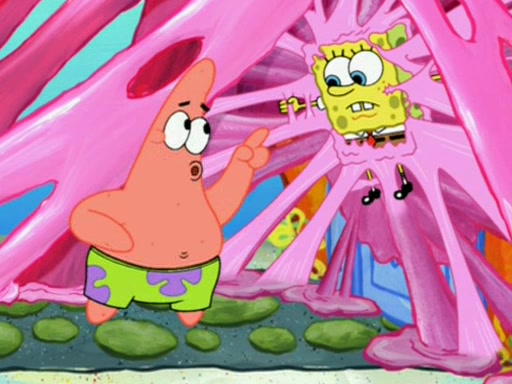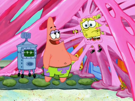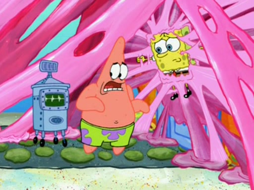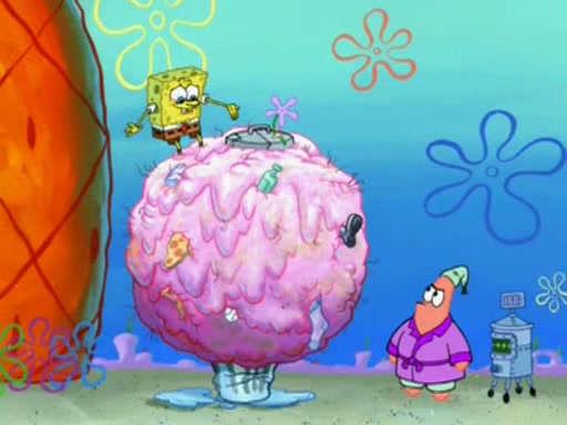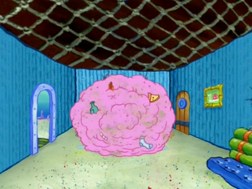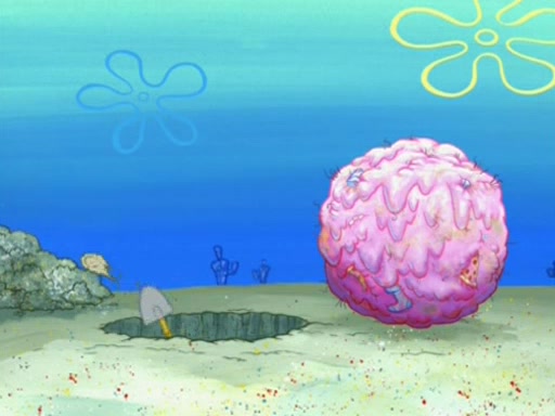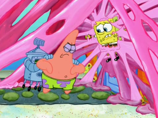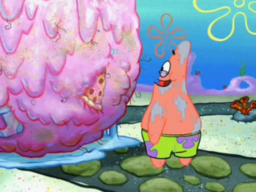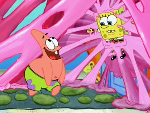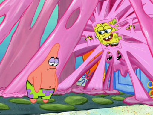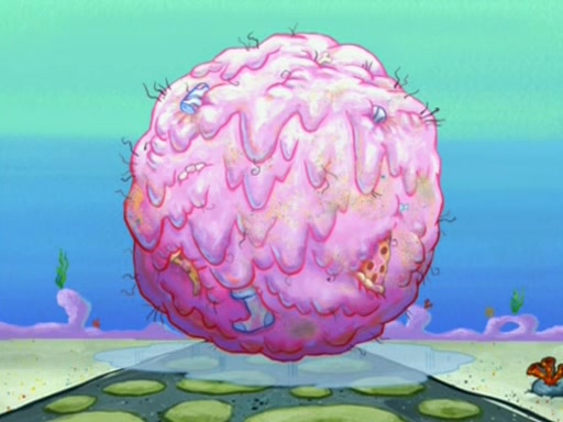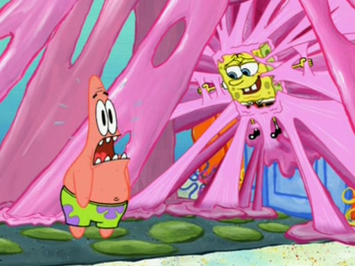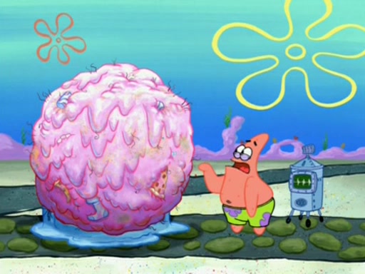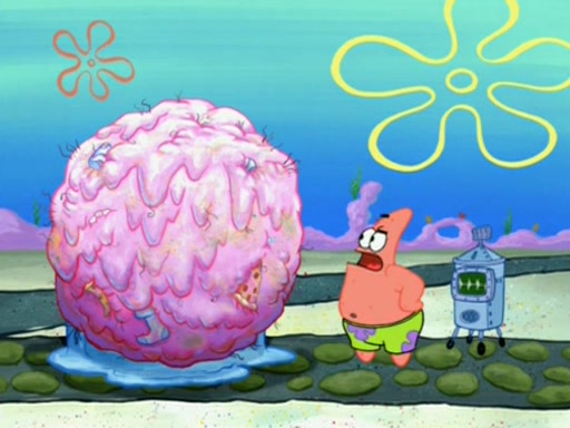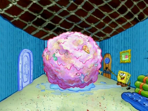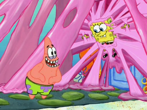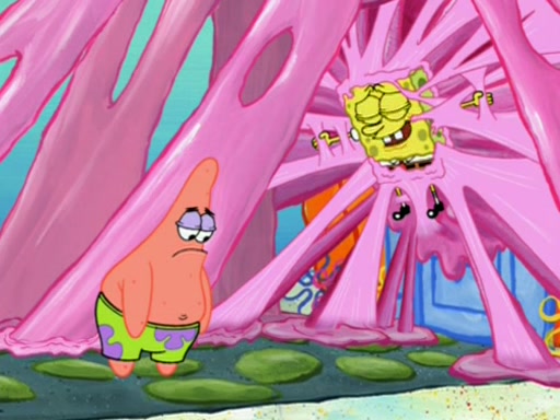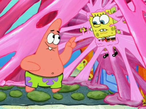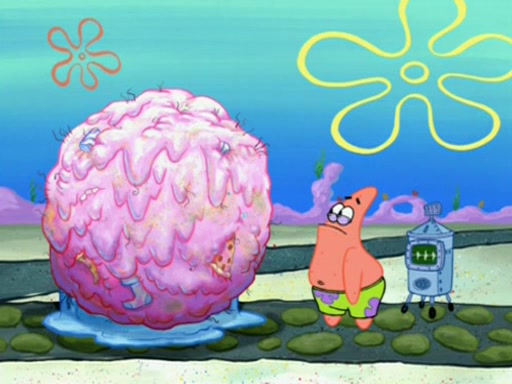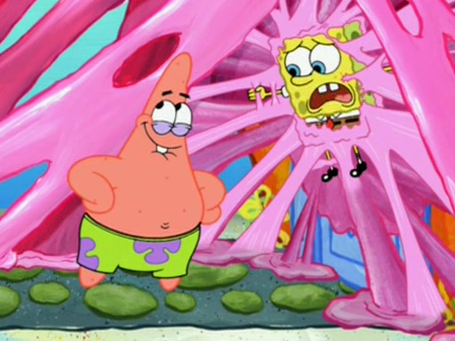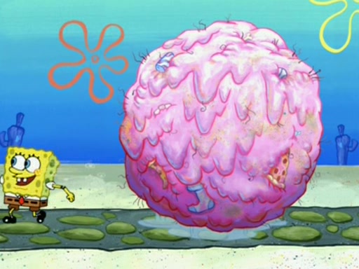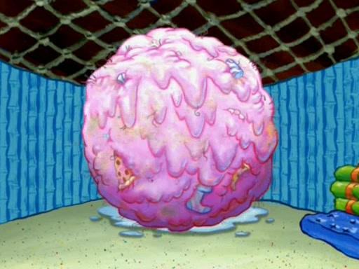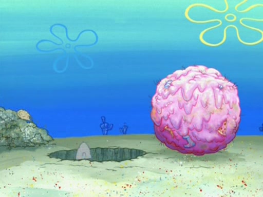 On "Best Friend's Day," Patrick gives SpongeBob an enormous wad of used gum he has amassed over his entire lifetime (fondly referred to as "Gummy"), and SpongeBob finds it a better gift than his own (a robotic butler). However, when he takes it inside, he realizes how disgusting it is, and it even starts to scare him, with a pair of underpants crawling out of the gum and saying in a demonic voice, "You're not Patrick!" First, SpongeBob tries to throw it away, but Patrick catches him in doing so, and he says that he was dressing it up with the garbage can. Later, SpongeBob tries to bury Gummy, but Patrick catches him again, and he says that he dug the hole to be able to look at Gummy from below. Patrick insists that it must be displayed properly, and places it above SpongeBob's doorway. SpongeBob next tries to dispose of it in the night, and in the process frees several people who were literally trapped inside it. He tries to pull Gummy off of his house, and fails, destroying the ball and getting stuck to it in the process.