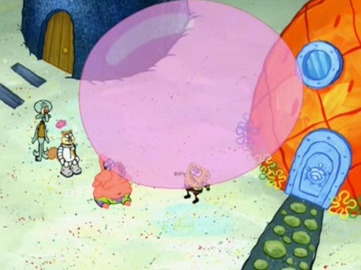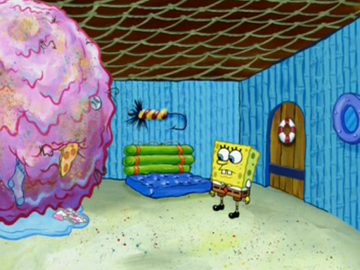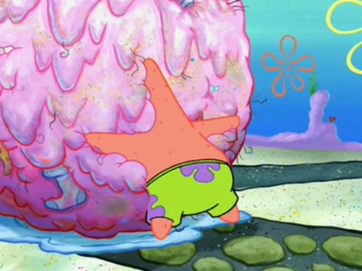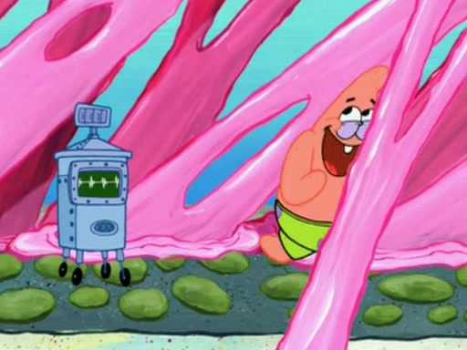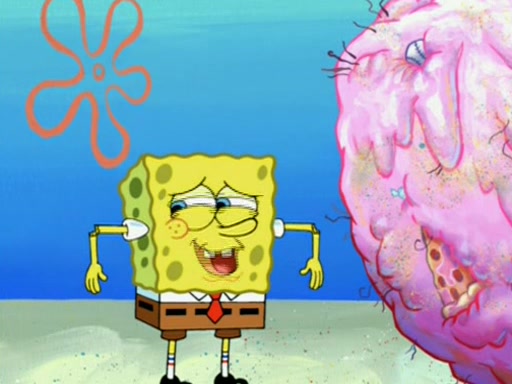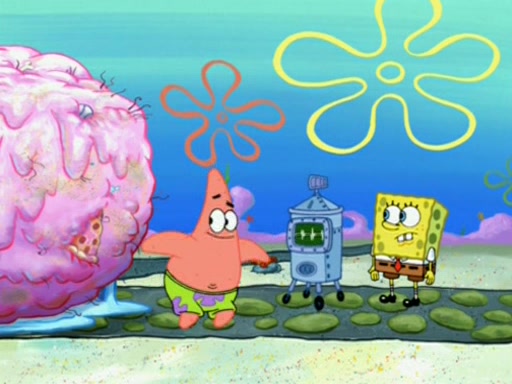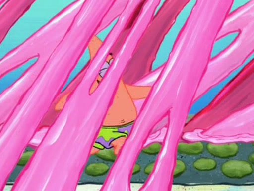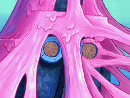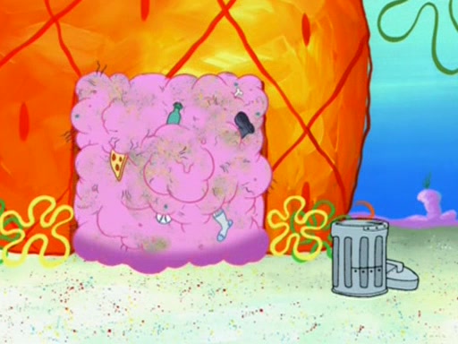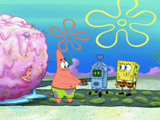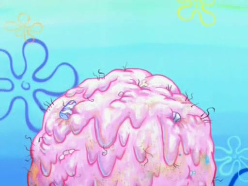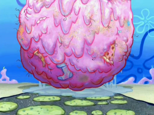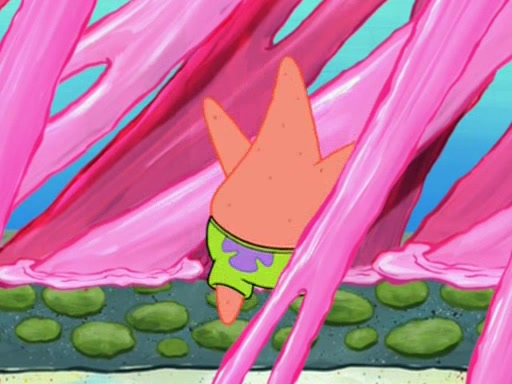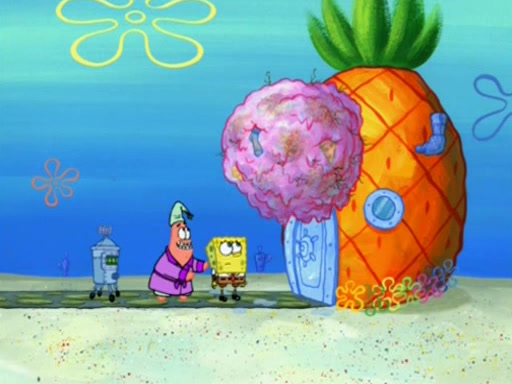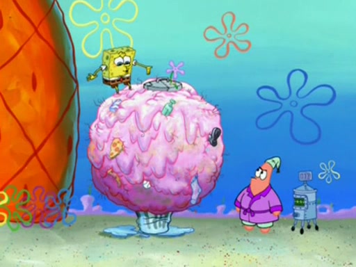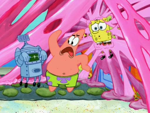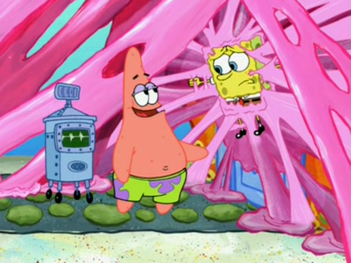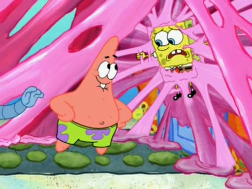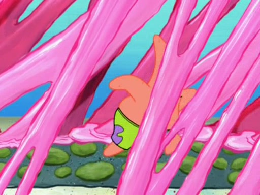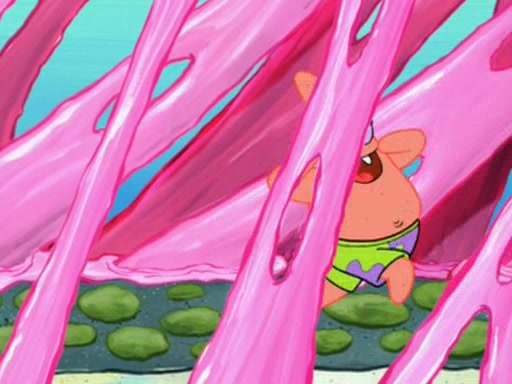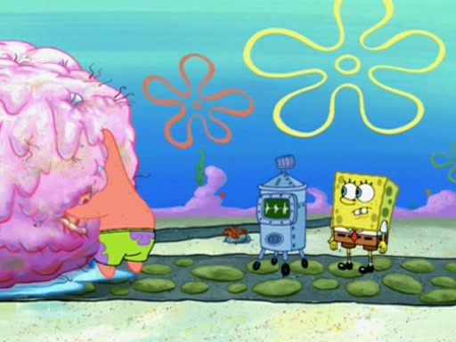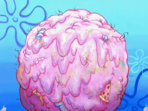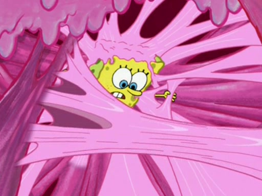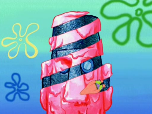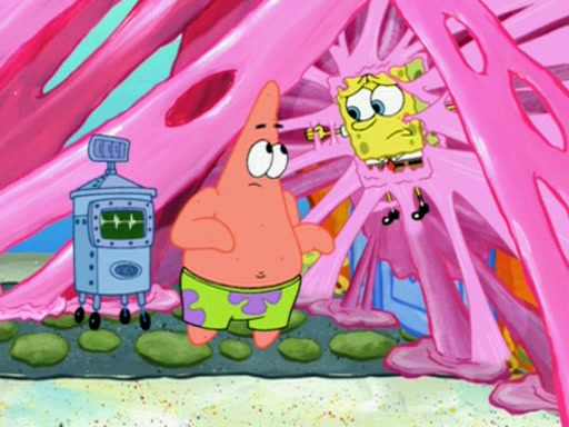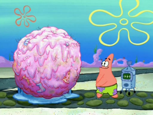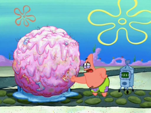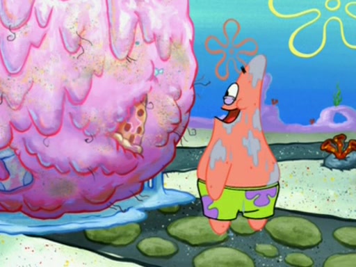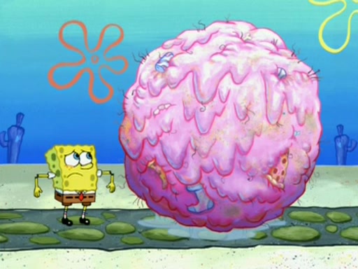 On "Best Friend's Day," Patrick gives SpongeBob an enormous wad of used gum he has amassed over his entire lifetime (fondly referred to as "Gummy"), and SpongeBob finds it a better gift than his own (a robotic butler). However, when he takes it inside, he realizes how disgusting it is, and it even starts to scare him, with a pair of underpants crawling out of the gum and saying in a demonic voice, "You're not Patrick!" First, SpongeBob tries to throw it away, but Patrick catches him in doing so, and he says that he was dressing it up with the garbage can. Later, SpongeBob tries to bury Gummy, but Patrick catches him again, and he says that he dug the hole to be able to look at Gummy from below. Patrick insists that it must be displayed properly, and places it above SpongeBob's doorway. SpongeBob next tries to dispose of it in the night, and in the process frees several people who were literally trapped inside it. He tries to pull Gummy off of his house, and fails, destroying the ball and getting stuck to it in the process.