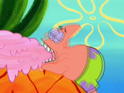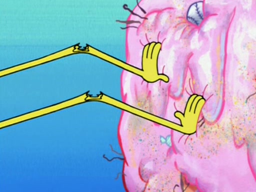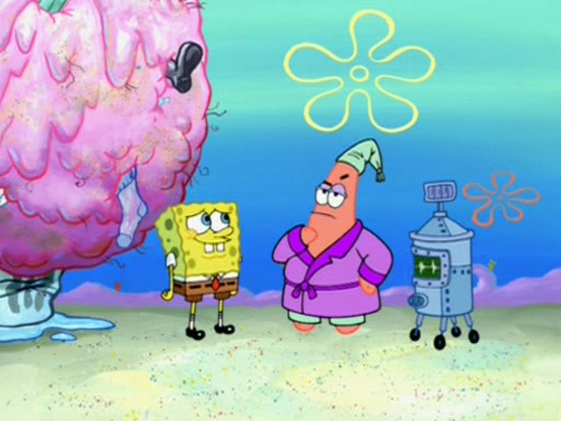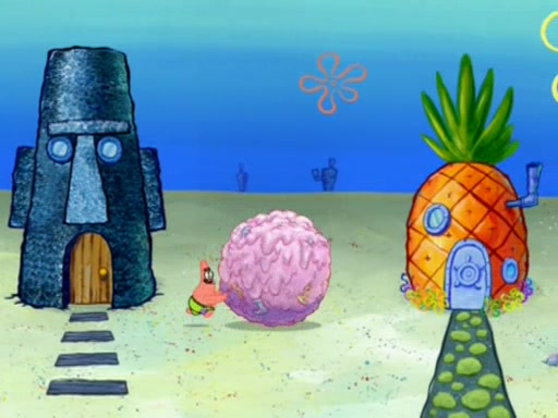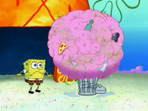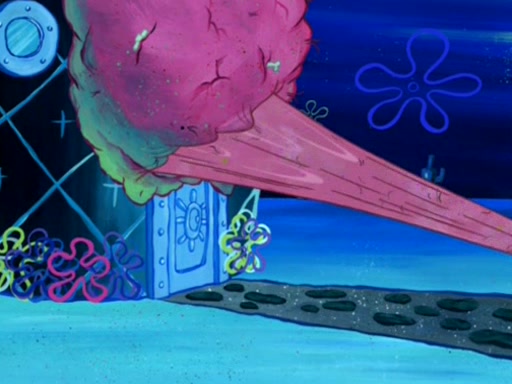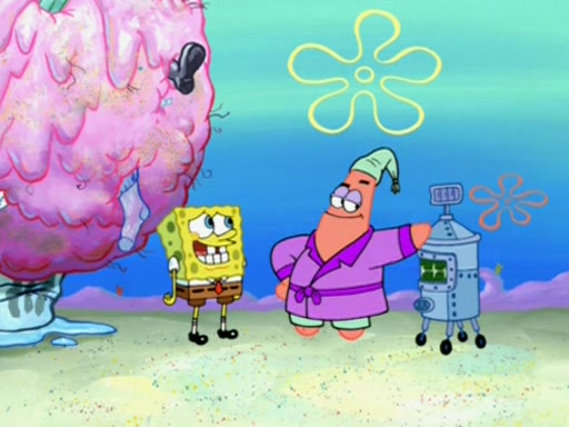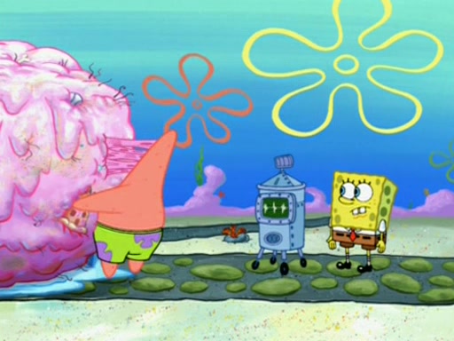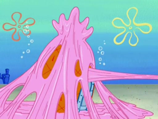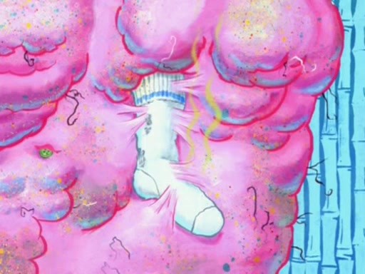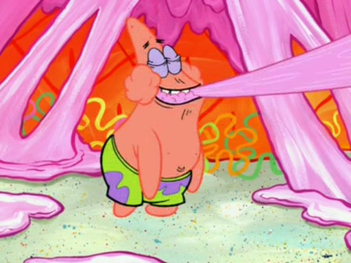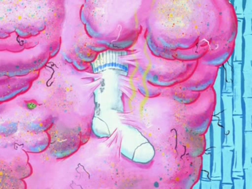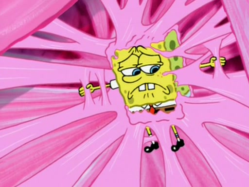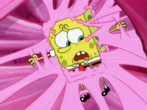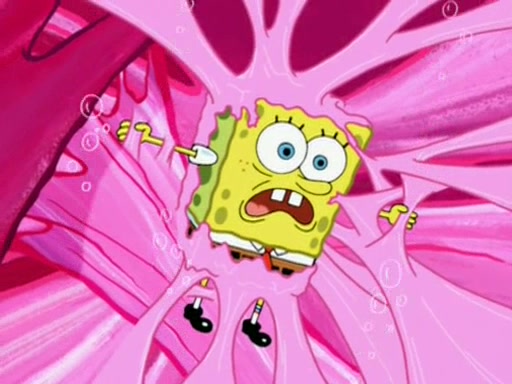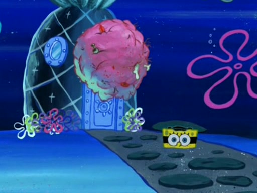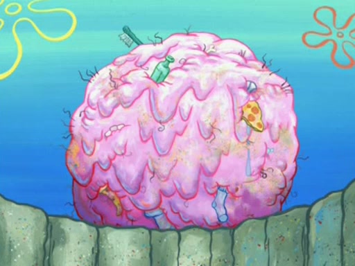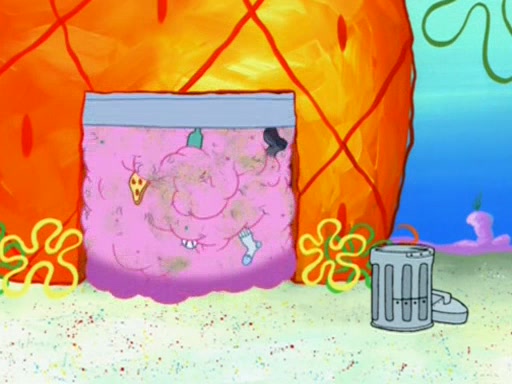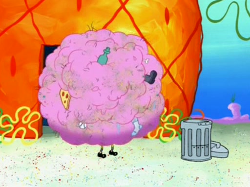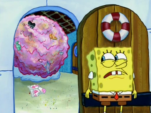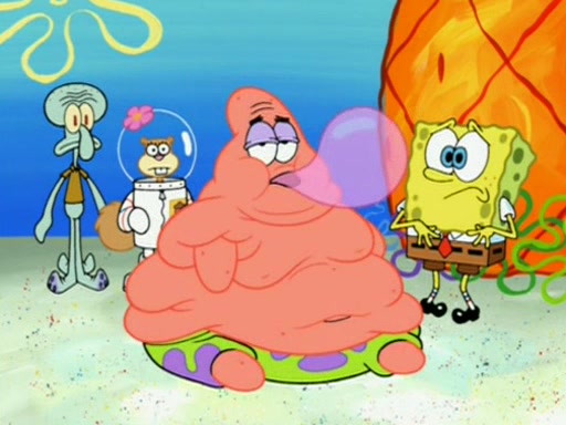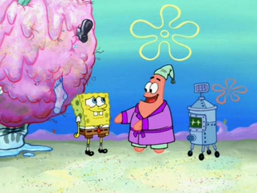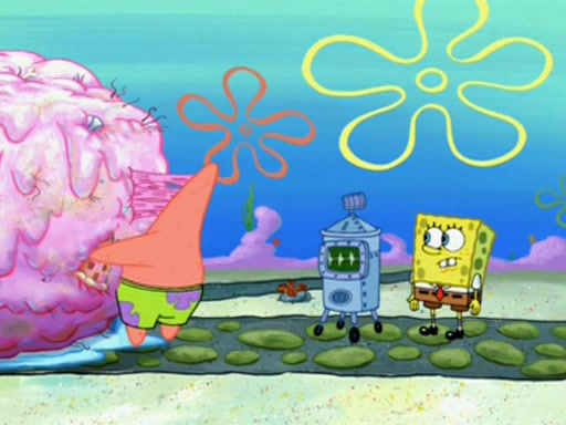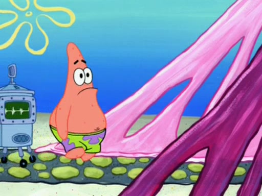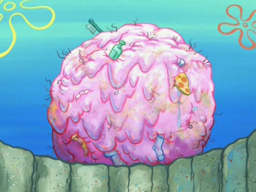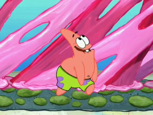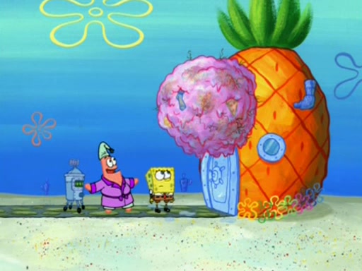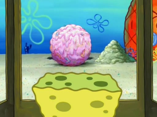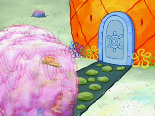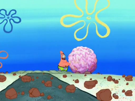 On "Best Friend's Day," Patrick gives SpongeBob an enormous wad of used gum he has amassed over his entire lifetime (fondly referred to as "Gummy"), and SpongeBob finds it a better gift than his own (a robotic butler). However, when he takes it inside, he realizes how disgusting it is, and it even starts to scare him, with a pair of underpants crawling out of the gum and saying in a demonic voice, "You're not Patrick!" First, SpongeBob tries to throw it away, but Patrick catches him in doing so, and he says that he was dressing it up with the garbage can. Later, SpongeBob tries to bury Gummy, but Patrick catches him again, and he says that he dug the hole to be able to look at Gummy from below. Patrick insists that it must be displayed properly, and places it above SpongeBob's doorway. SpongeBob next tries to dispose of it in the night, and in the process frees several people who were literally trapped inside it. He tries to pull Gummy off of his house, and fails, destroying the ball and getting stuck to it in the process.