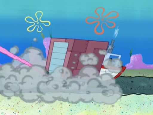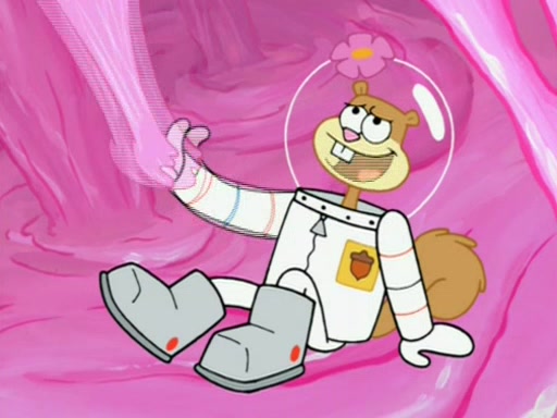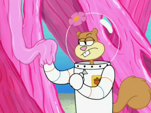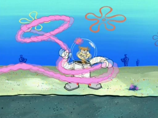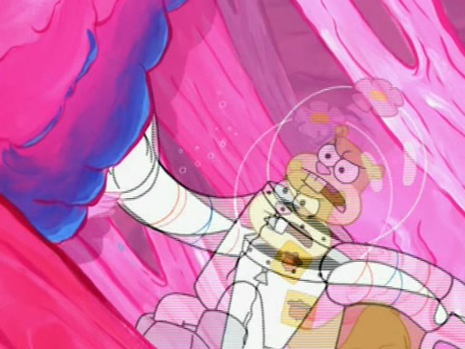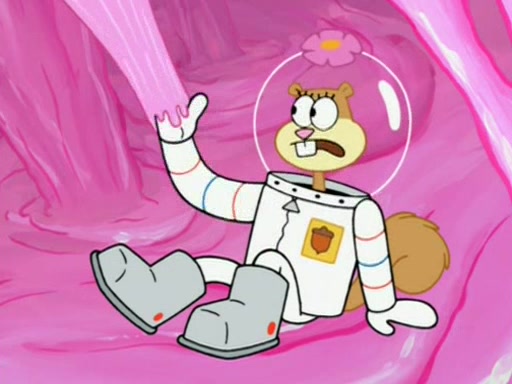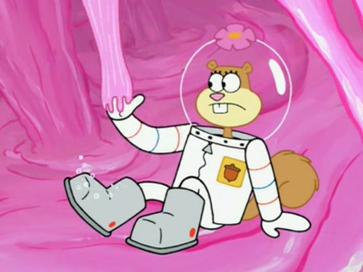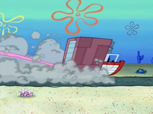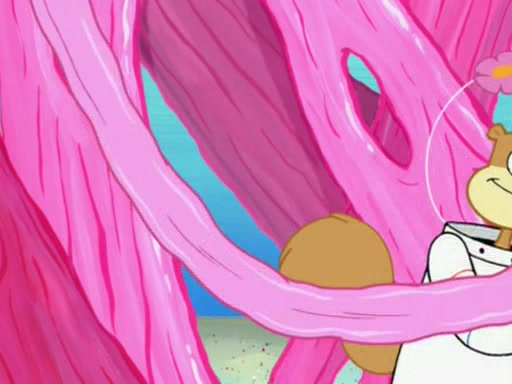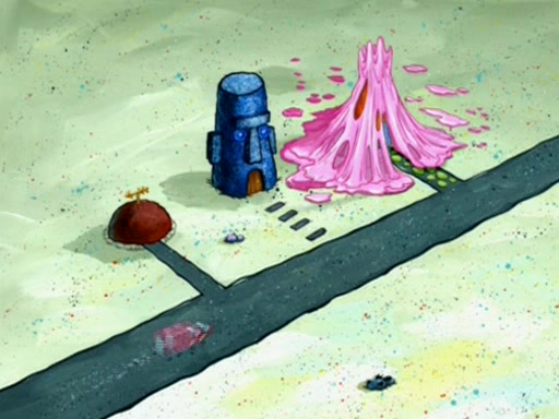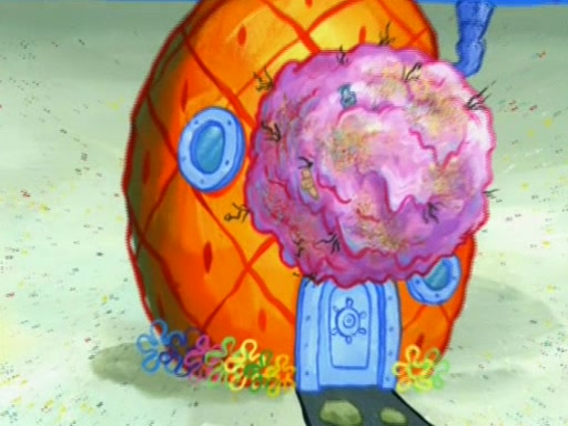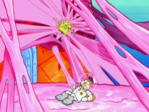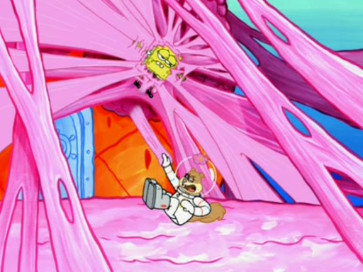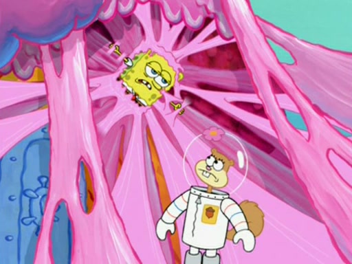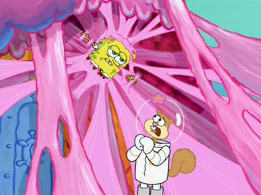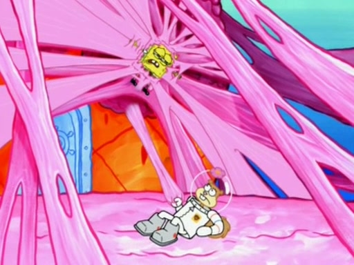 The next day, Sandy visits SpongeBob's house to see it covered in the sticky remains of Gummy, with SpongeBob hanging above his doorway. She tries to free him by lassoing a piece of Gummy onto a passing truck, which is almost able to pull it away, but is ultimately pulled in by it, hitting SpongeBob's house and causing the gum to explode, completely covering the houses of SpongeBob, Squidward and Patrick, and trapping Squidward and Sandy as well. Patrick then appears, and SpongeBob tells him he can have Gummy back. Patrick then wolfs down all of the gum making Patrick obese, freeing SpongeBob, his friends and their houses. However, he then hiccups a massive bubble, which explodes and covers the whole town in gum.