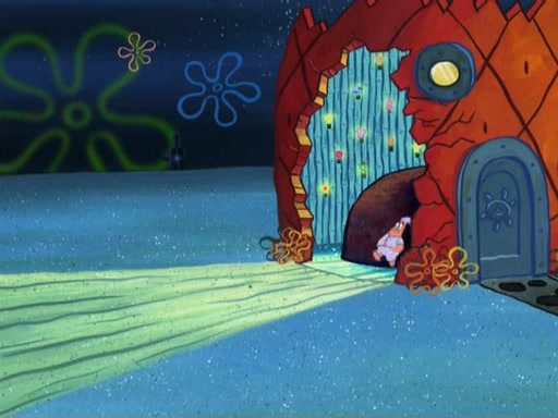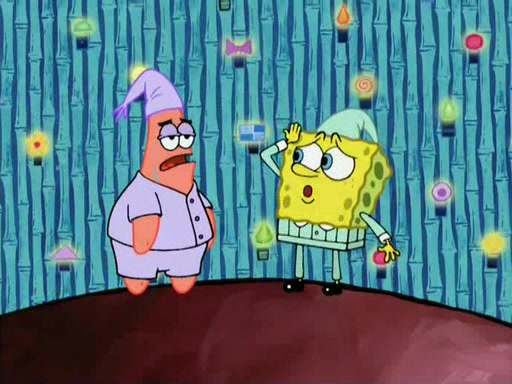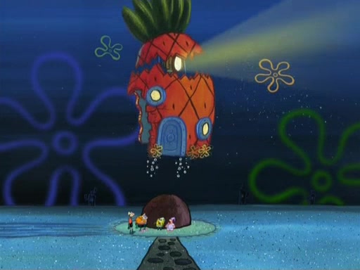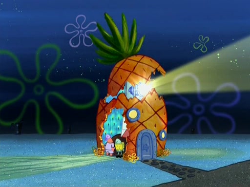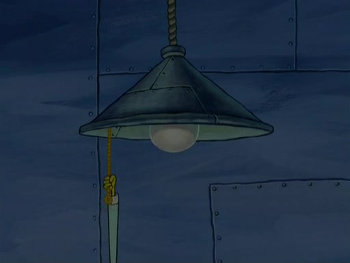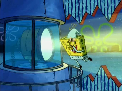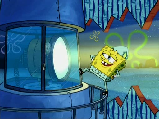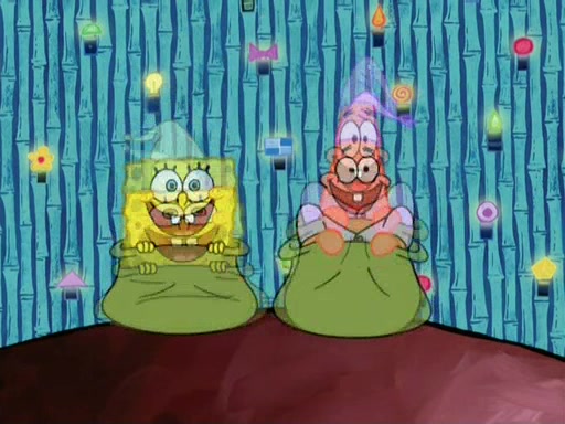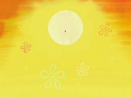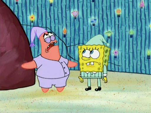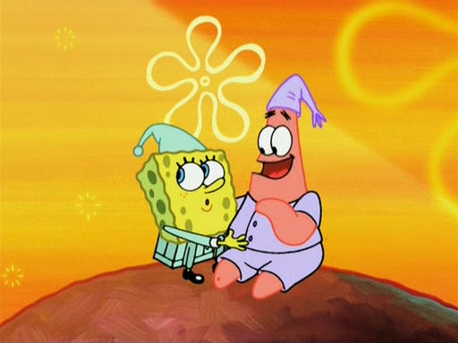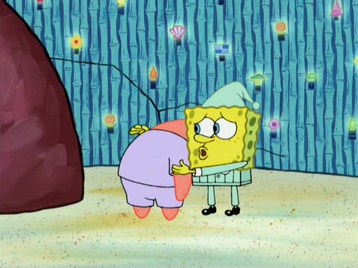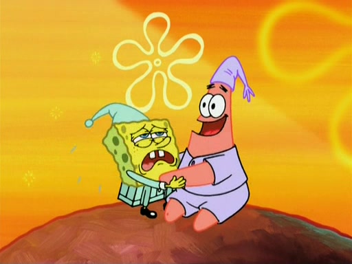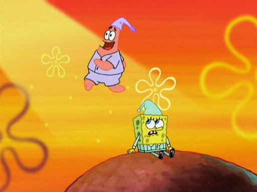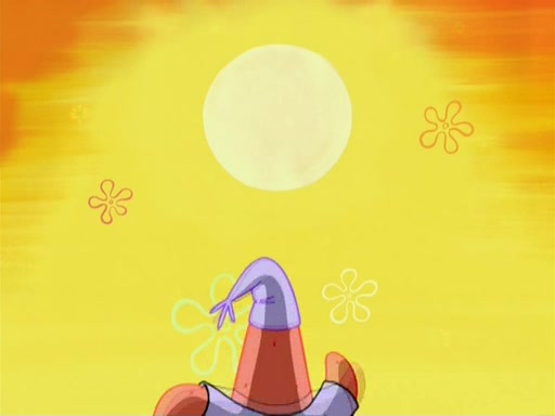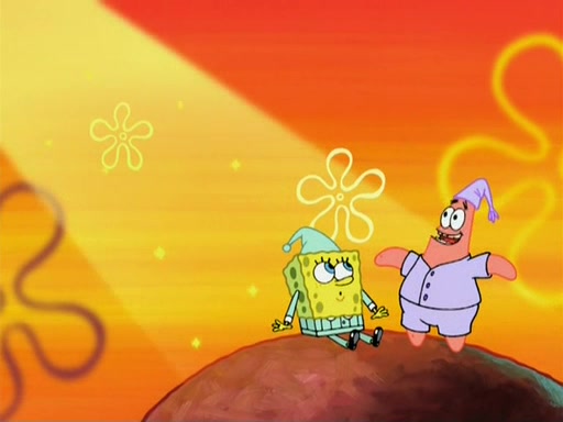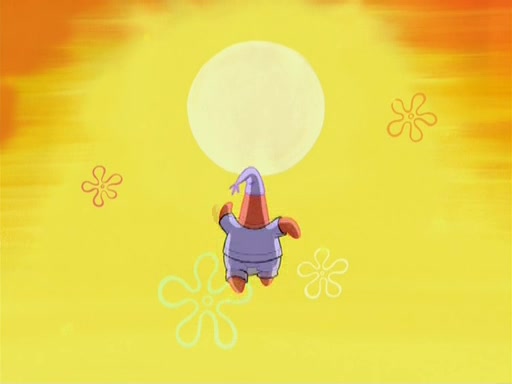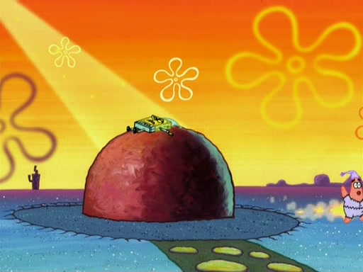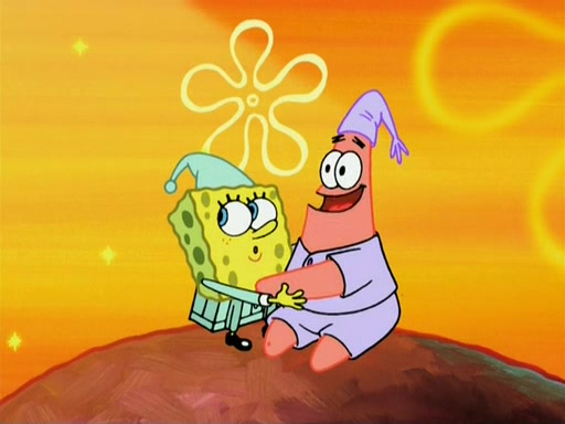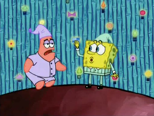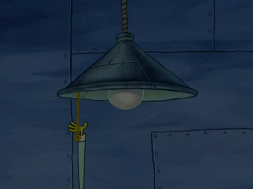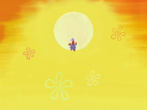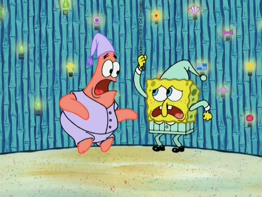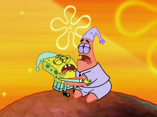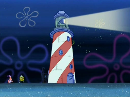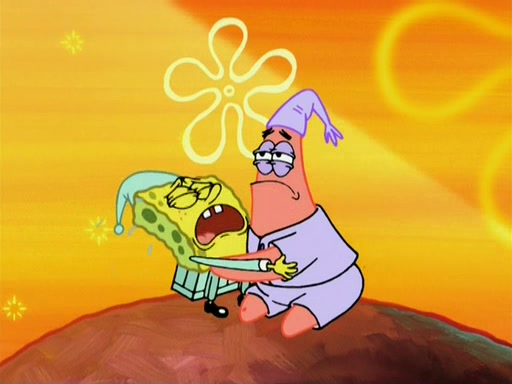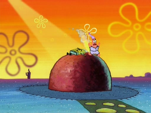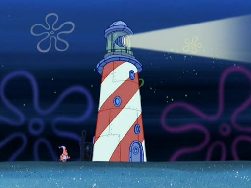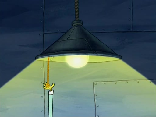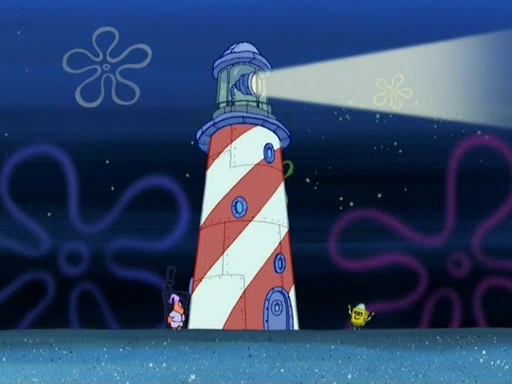 SpongeBob and Patrick are alone in the dark until the sun rises. Patrick goes up to get it, thinking it is a light and SpongeBob falls asleep. Patrick comes down again on fire shouting"Too much light!