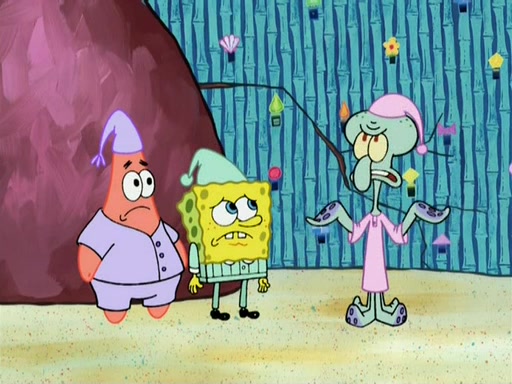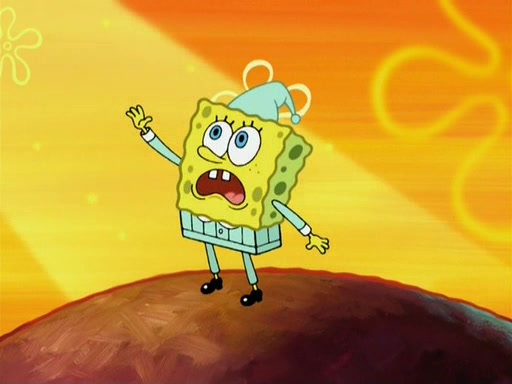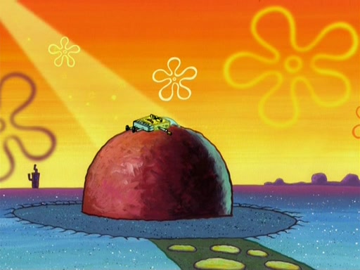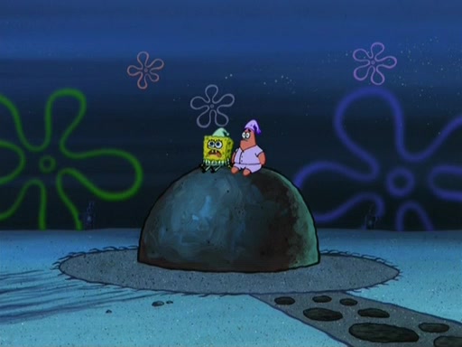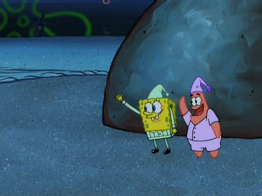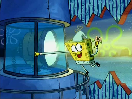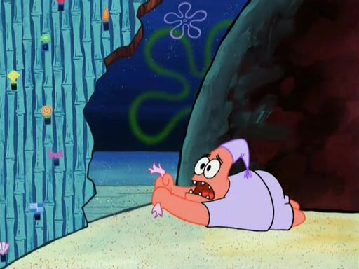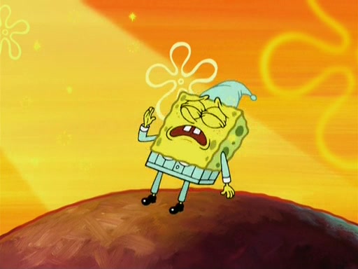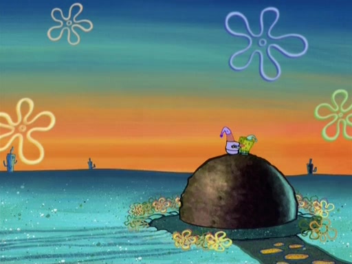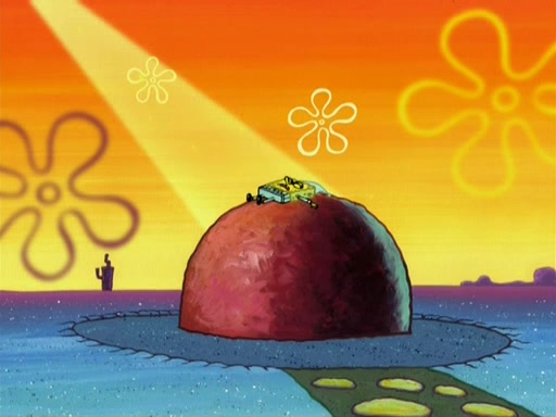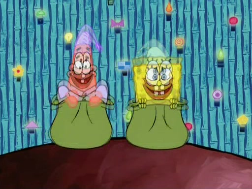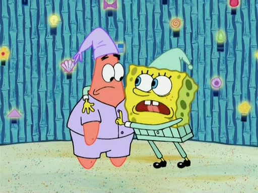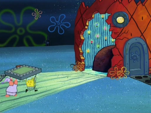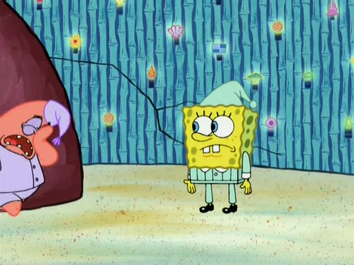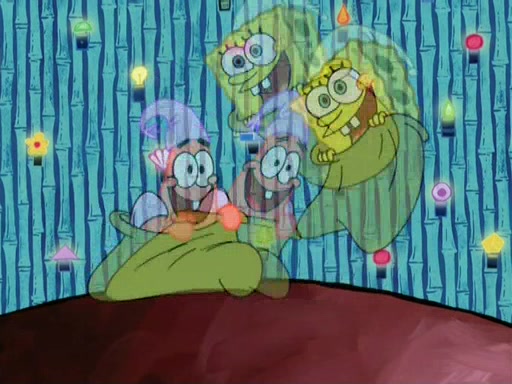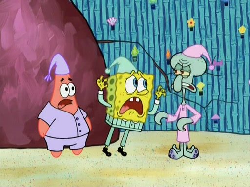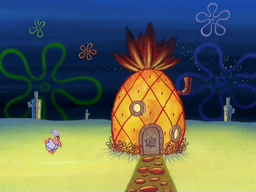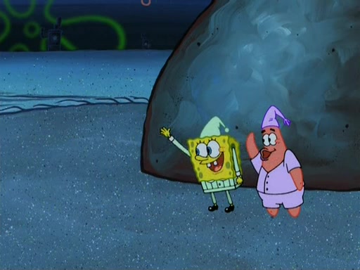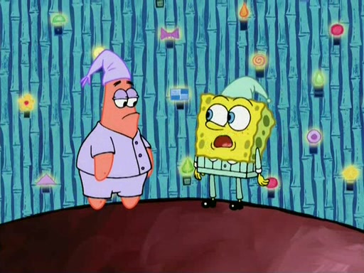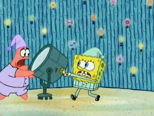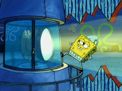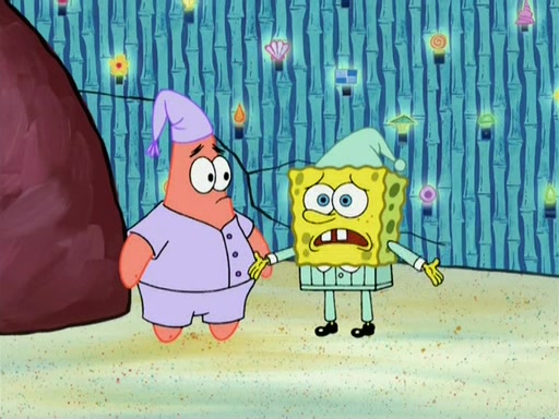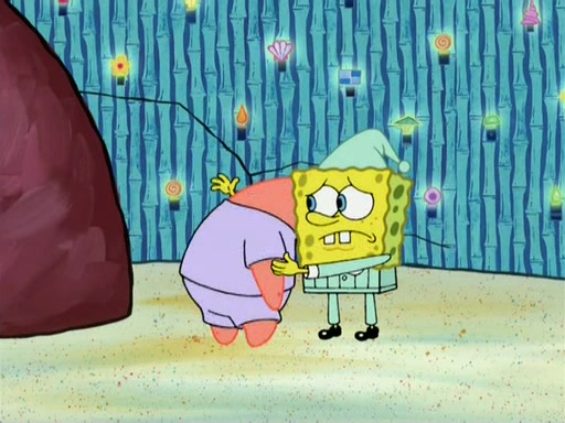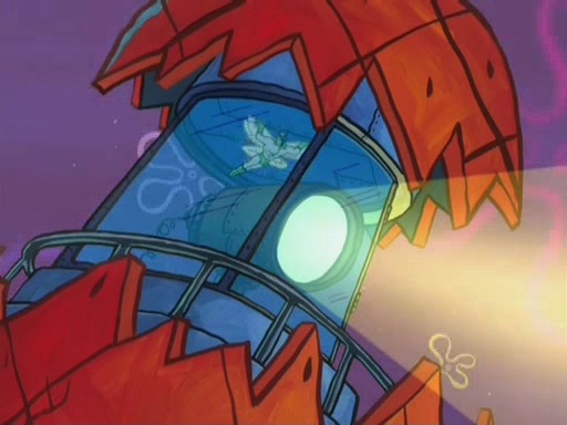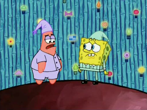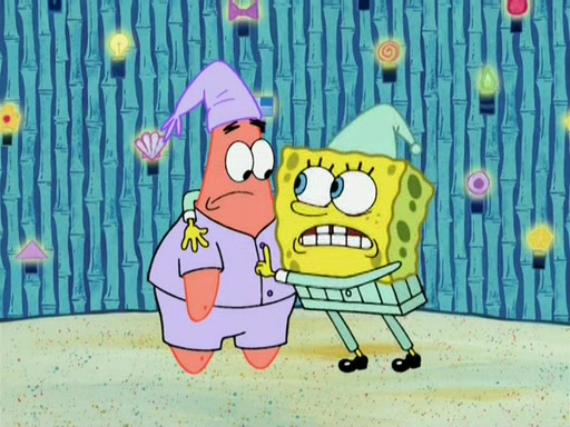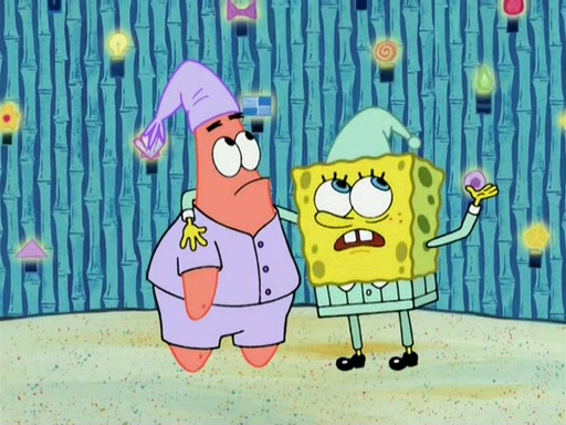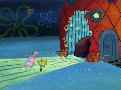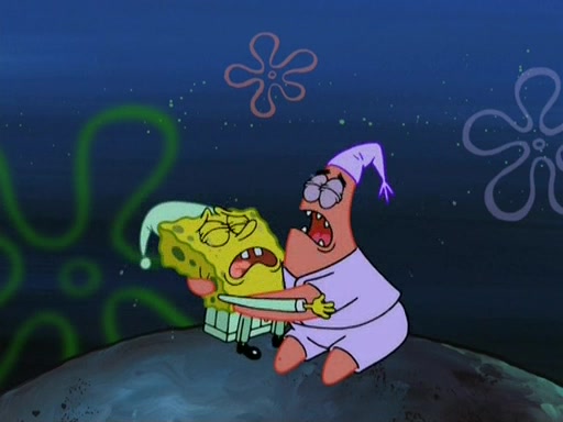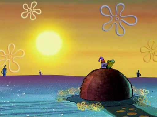 SpongeBob and Patrick are alone in the dark until the sun rises. Patrick goes up to get it, thinking it is a light and SpongeBob falls asleep. Patrick comes down again on fire shouting"Too much light!