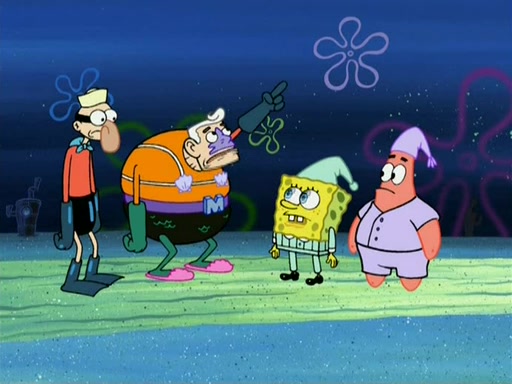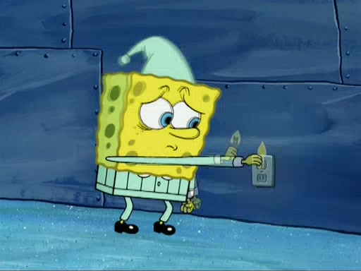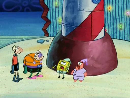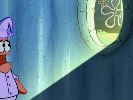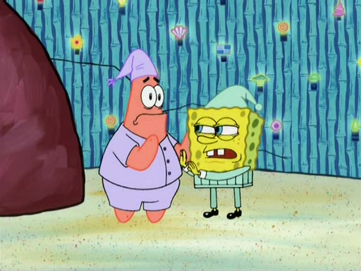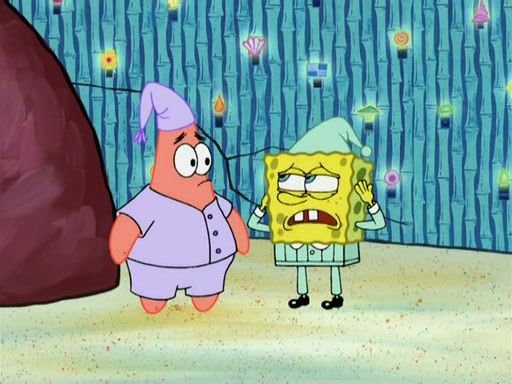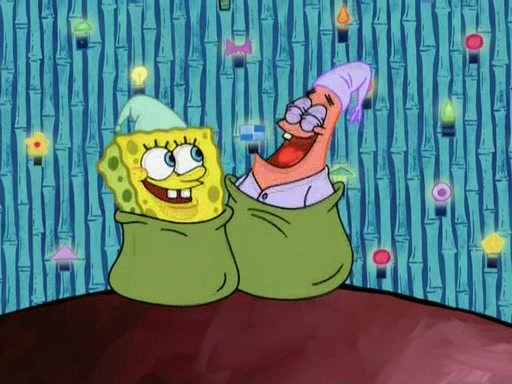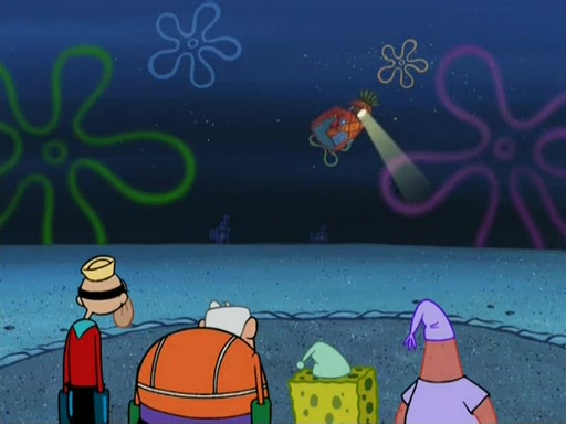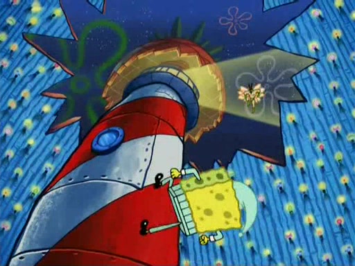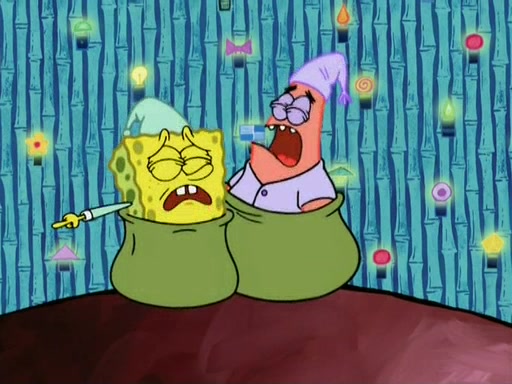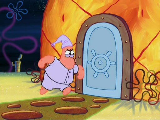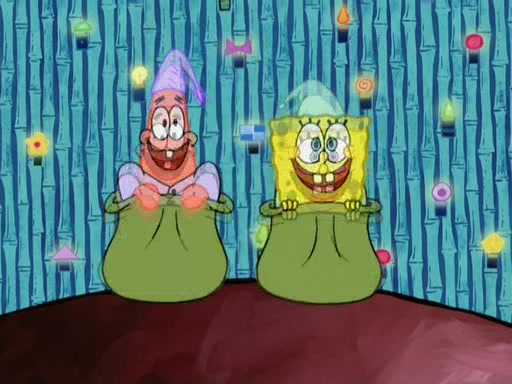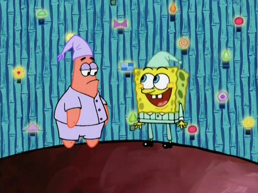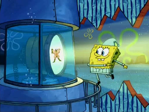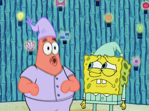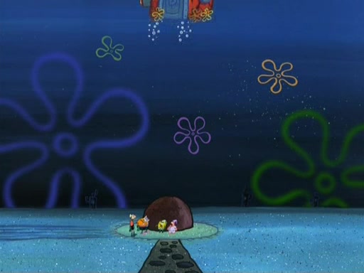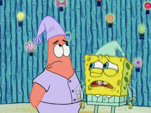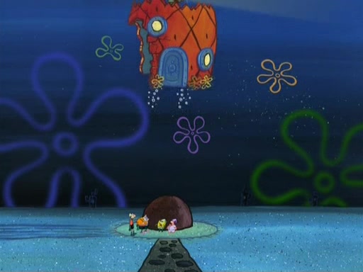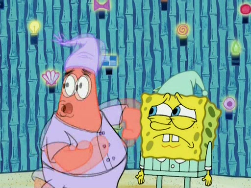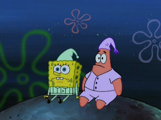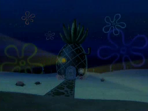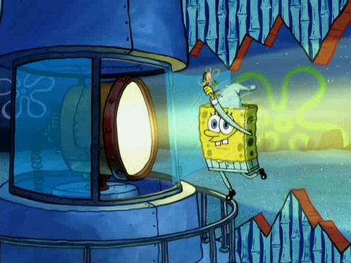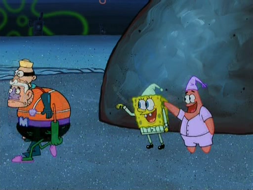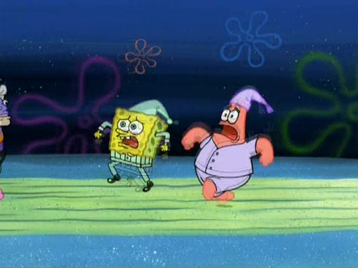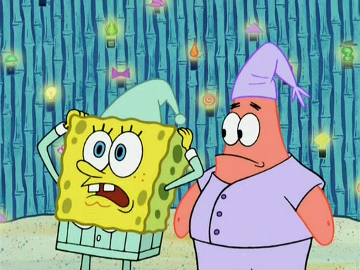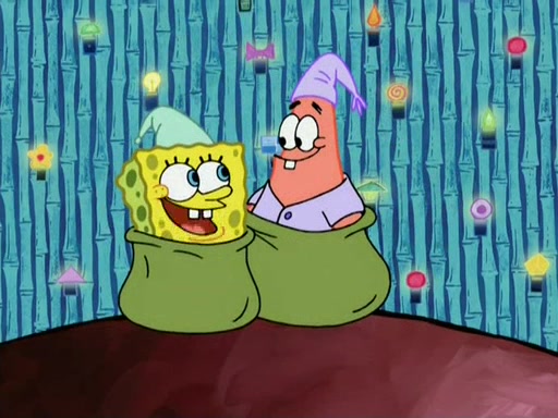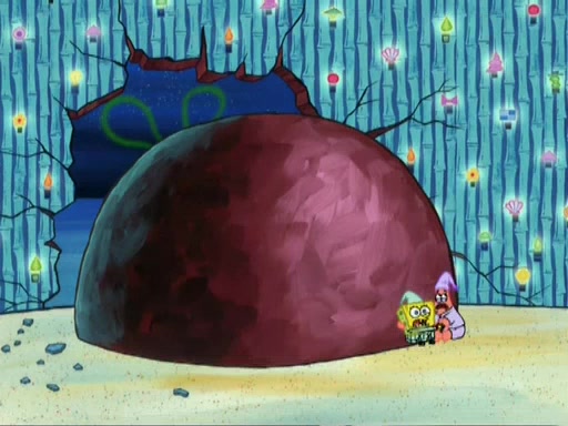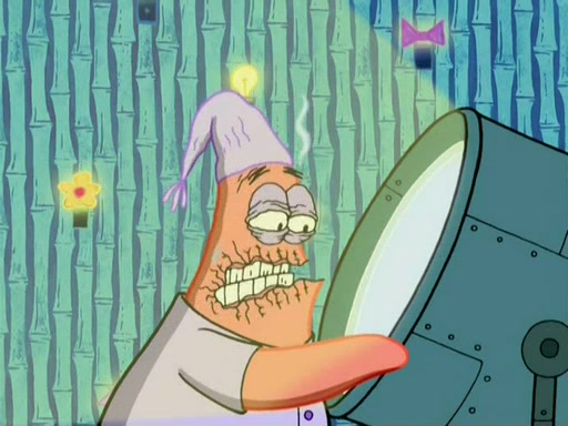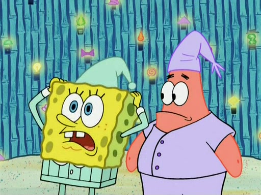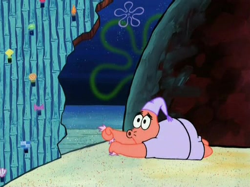 SpongeBob and Patrick are alone in the dark until the sun rises. Patrick goes up to get it, thinking it is a light and SpongeBob falls asleep. Patrick comes down again on fire shouting"Too much light!