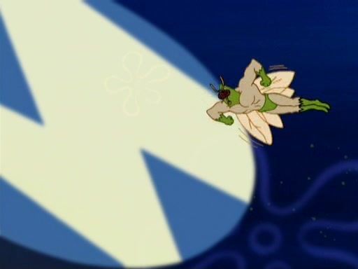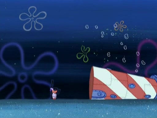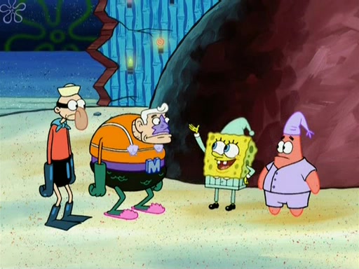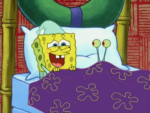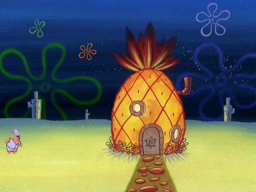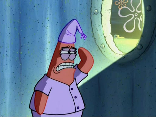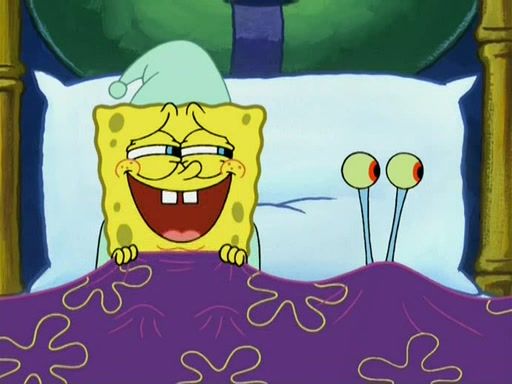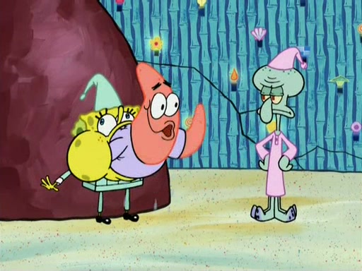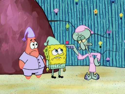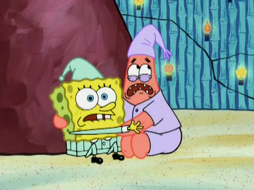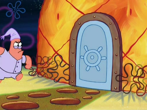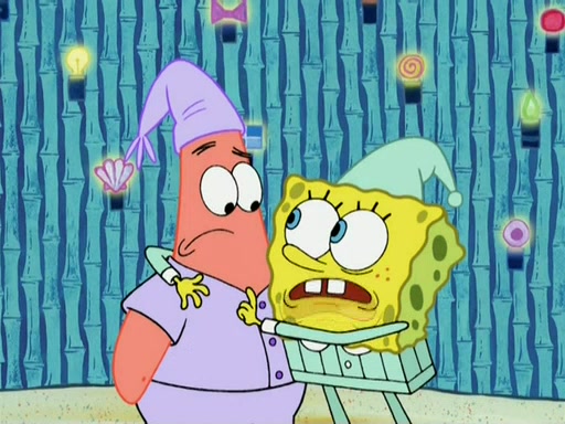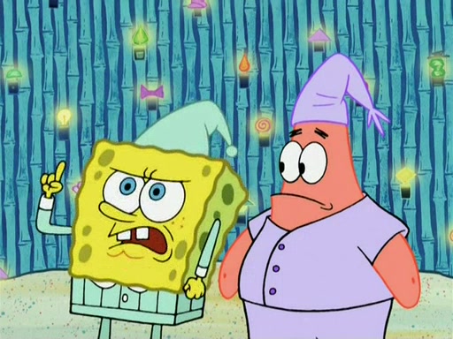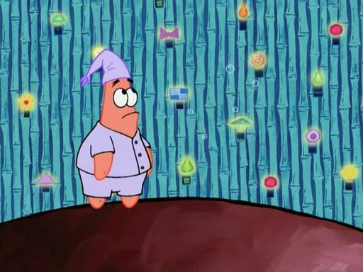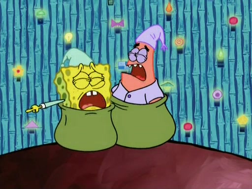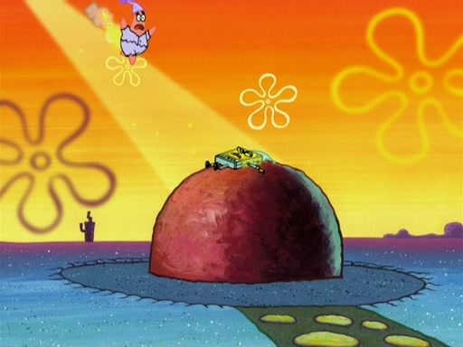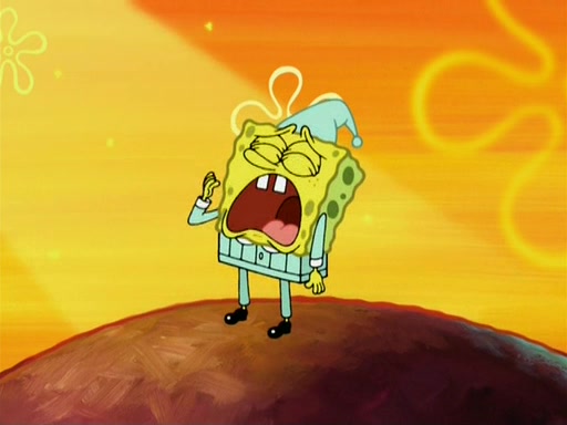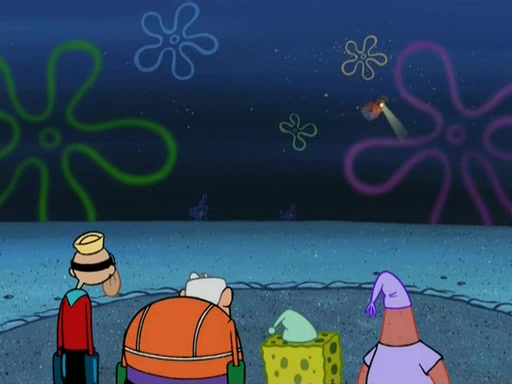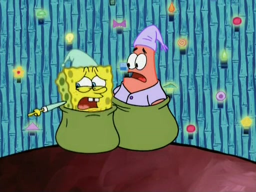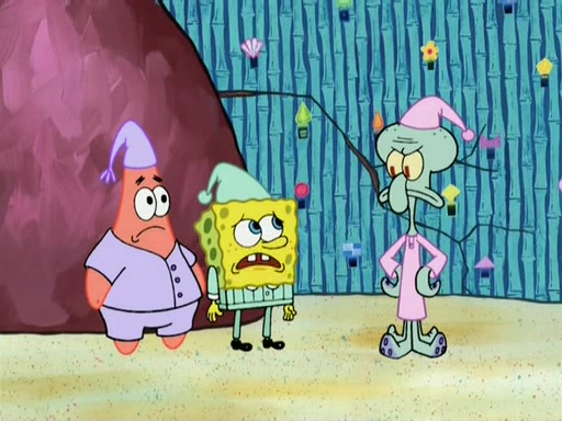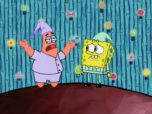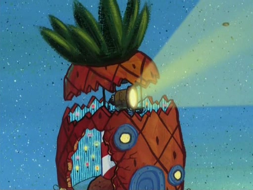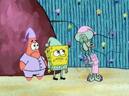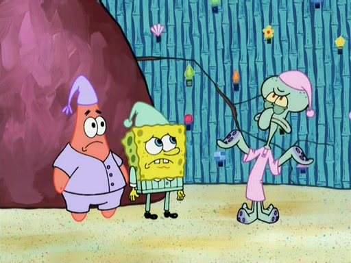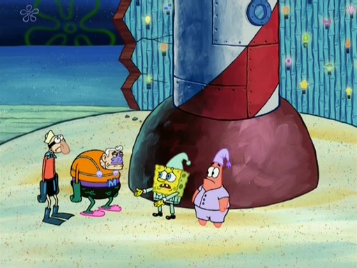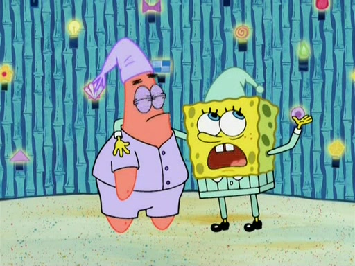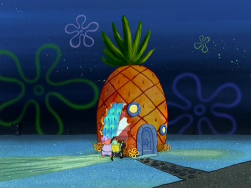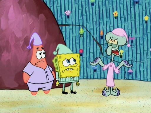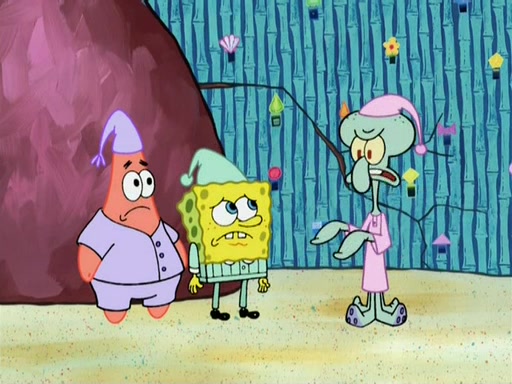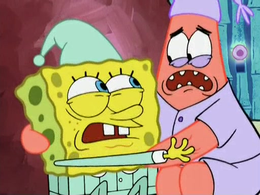 SpongeBob and Patrick are alone in the dark until the sun rises. Patrick goes up to get it, thinking it is a light and SpongeBob falls asleep. Patrick comes down again on fire shouting"Too much light!