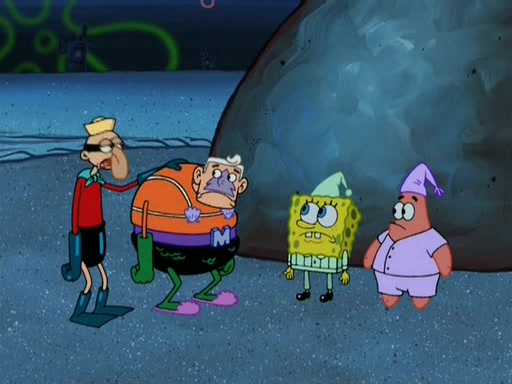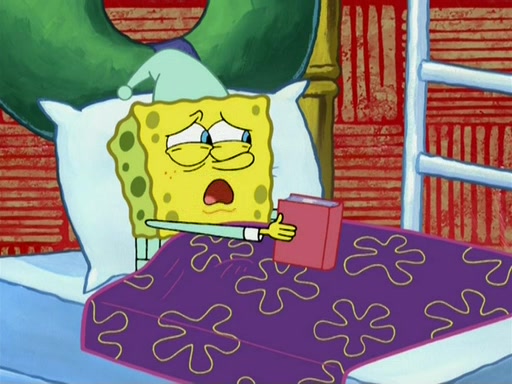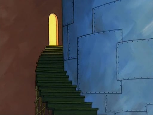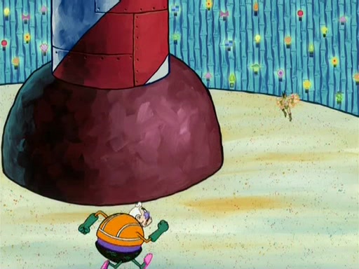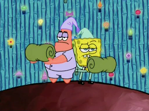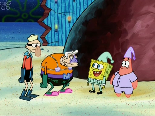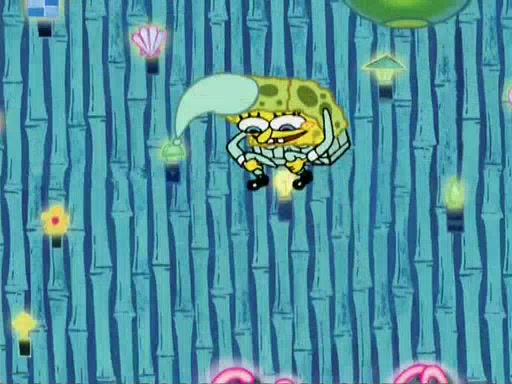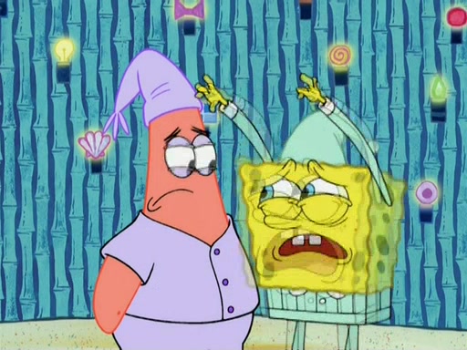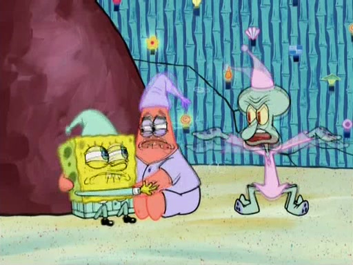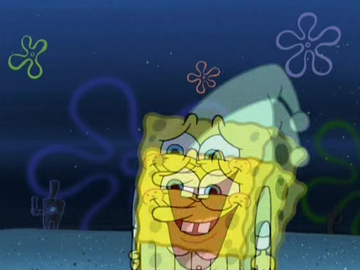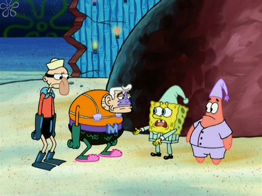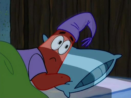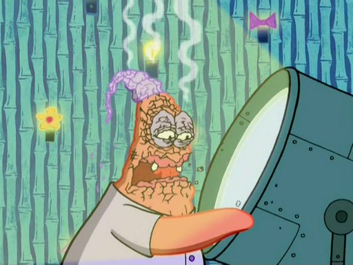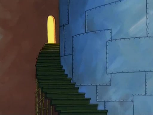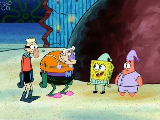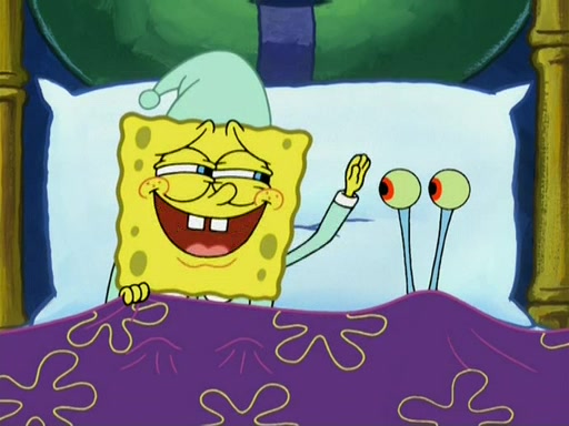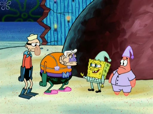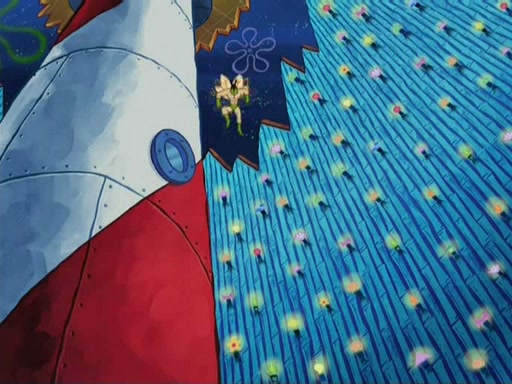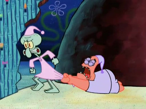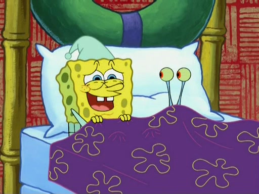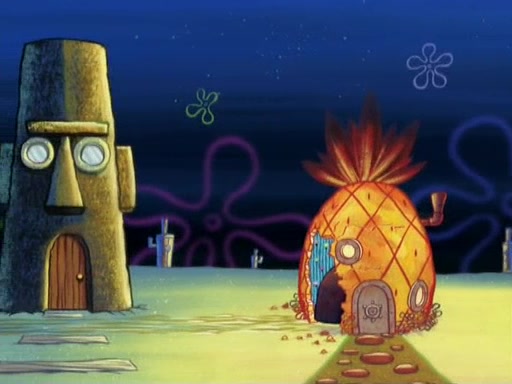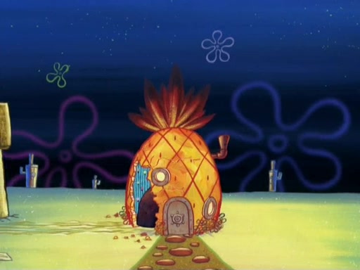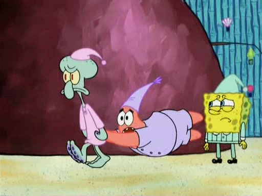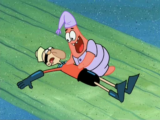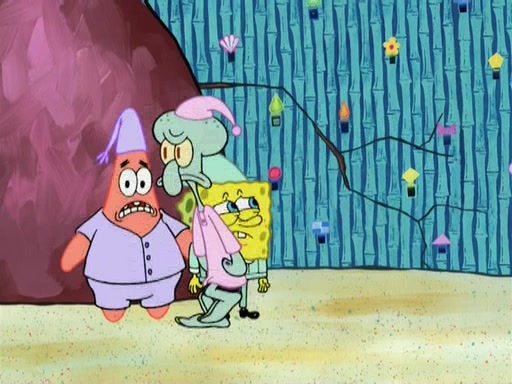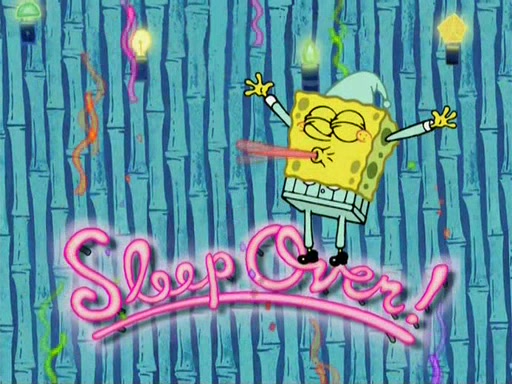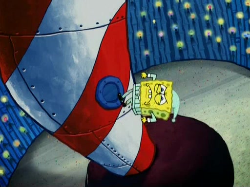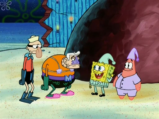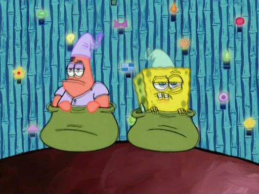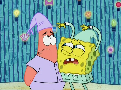 SpongeBob and Patrick are alone in the dark until the sun rises. Patrick goes up to get it, thinking it is a light and SpongeBob falls asleep. Patrick comes down again on fire shouting"Too much light!